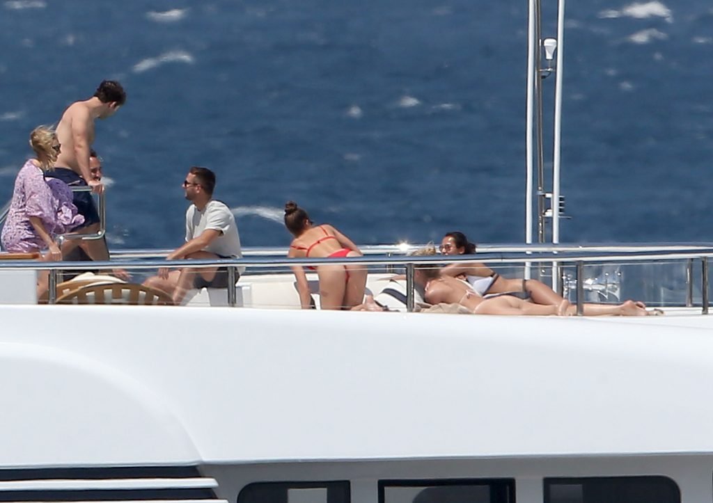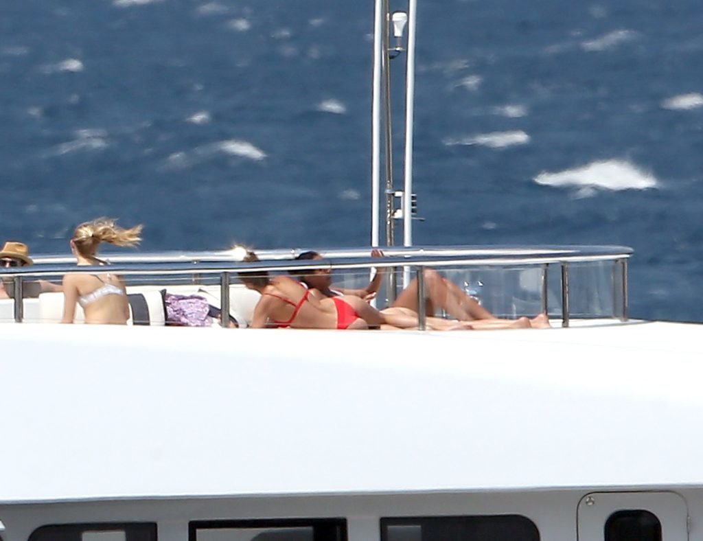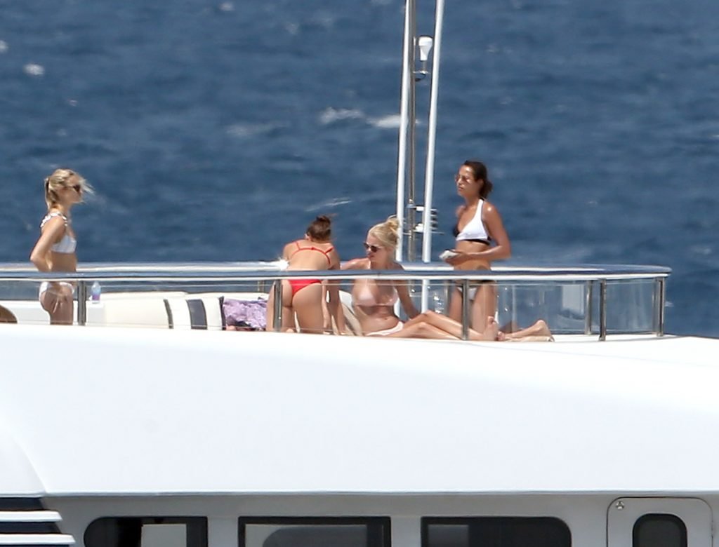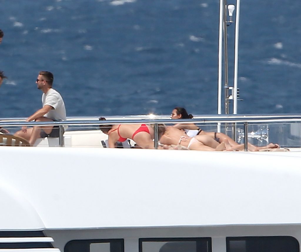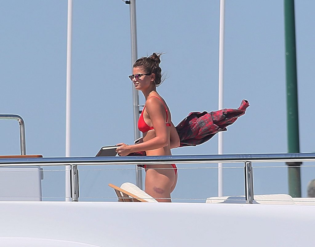Taylor Marie Hill lleva un bikini rojo mientras disfruta con amigos en un mega yate en Saint-Tropez, 24/07/2017. Taylor Hill es una modelo de moda de Palatine (Condado de Cook, Illinois). Edad: 21 años.