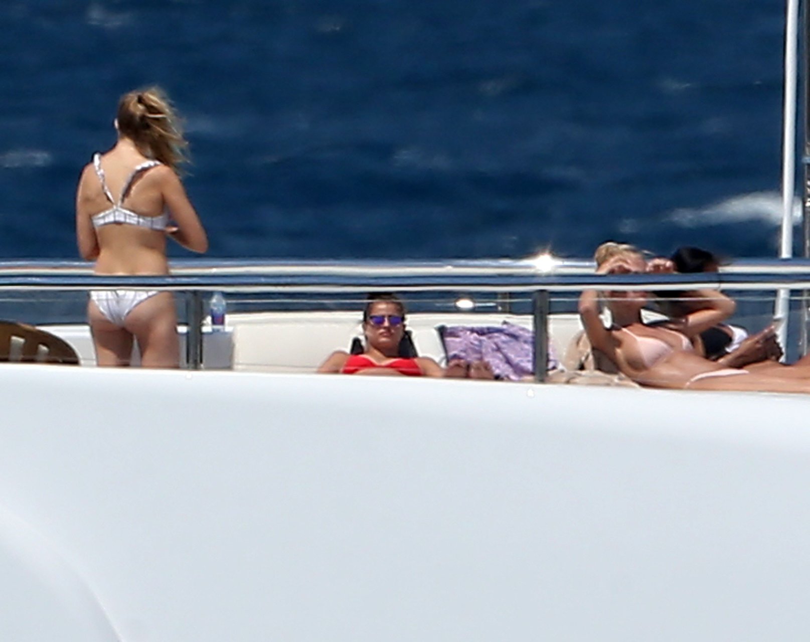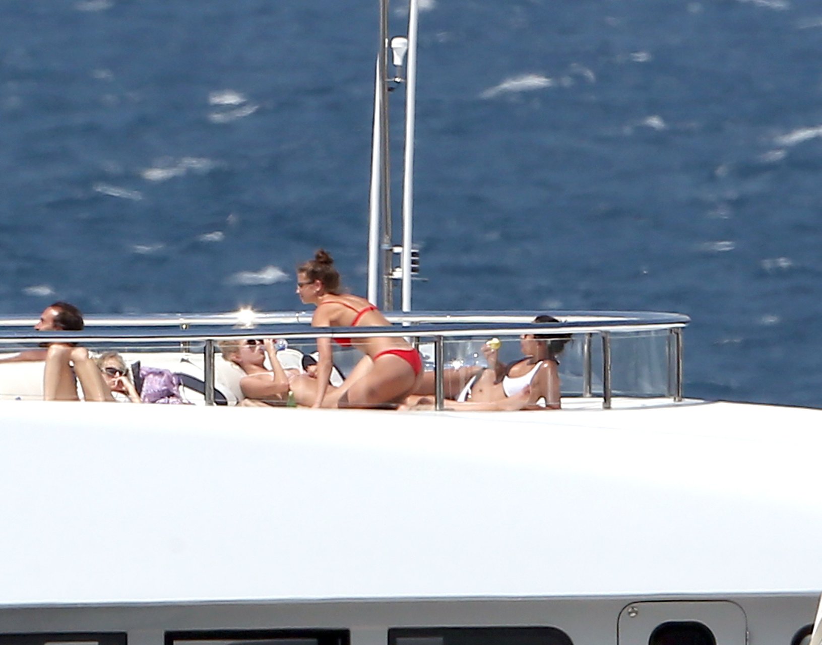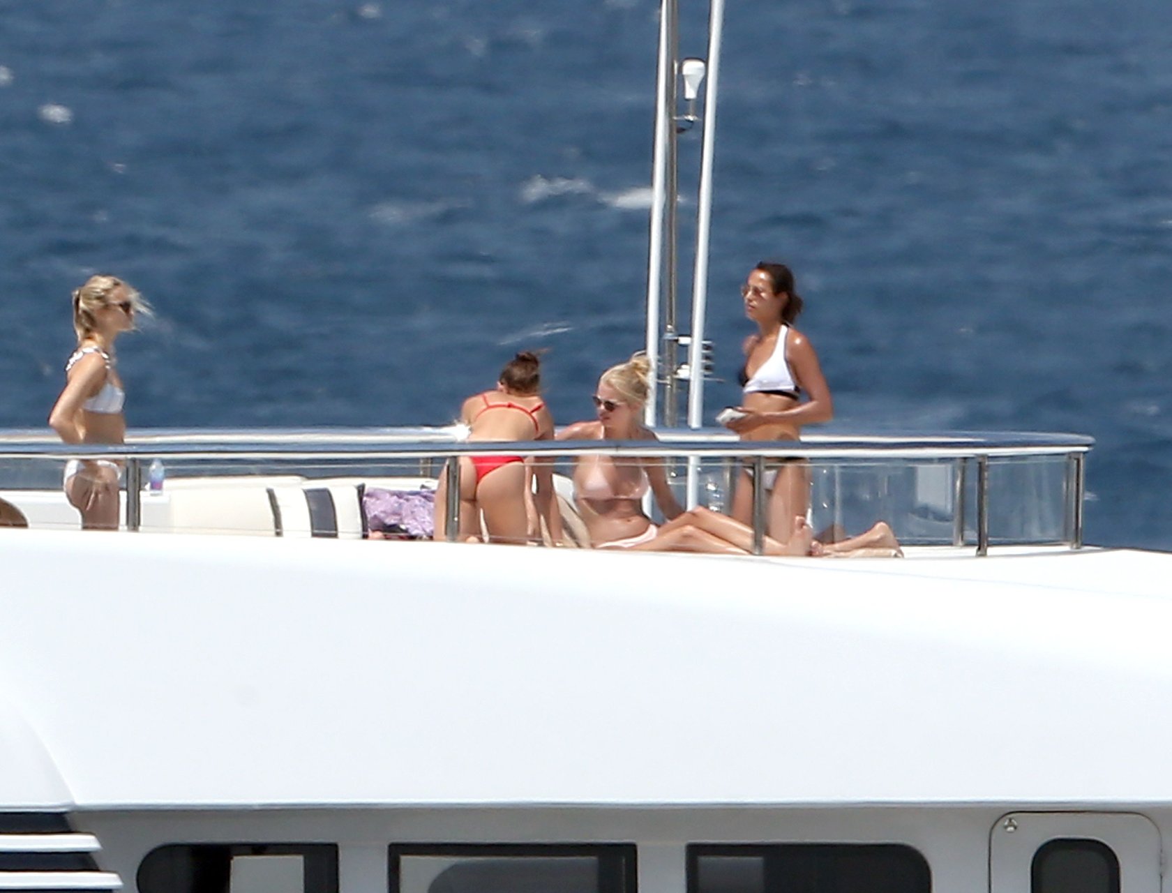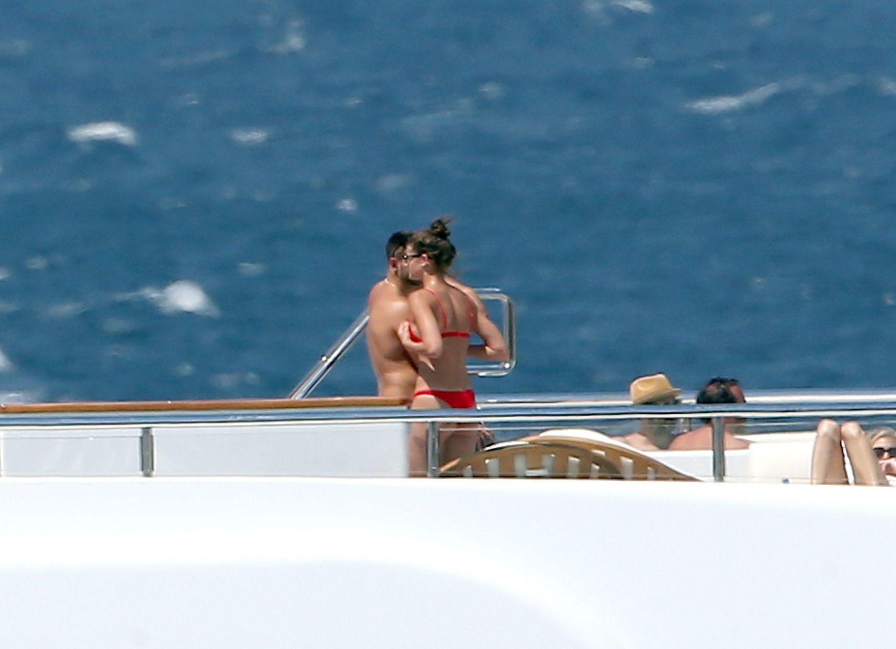 Taylor Marie Hill lleva un bikini rojo mientras disfruta con amigos en un mega yate en Saint-Tropez, 24/07/2017. Taylor Hill es una modelo de moda de Palatine (Condado de Cook, Illinois). Edad: 21 años.