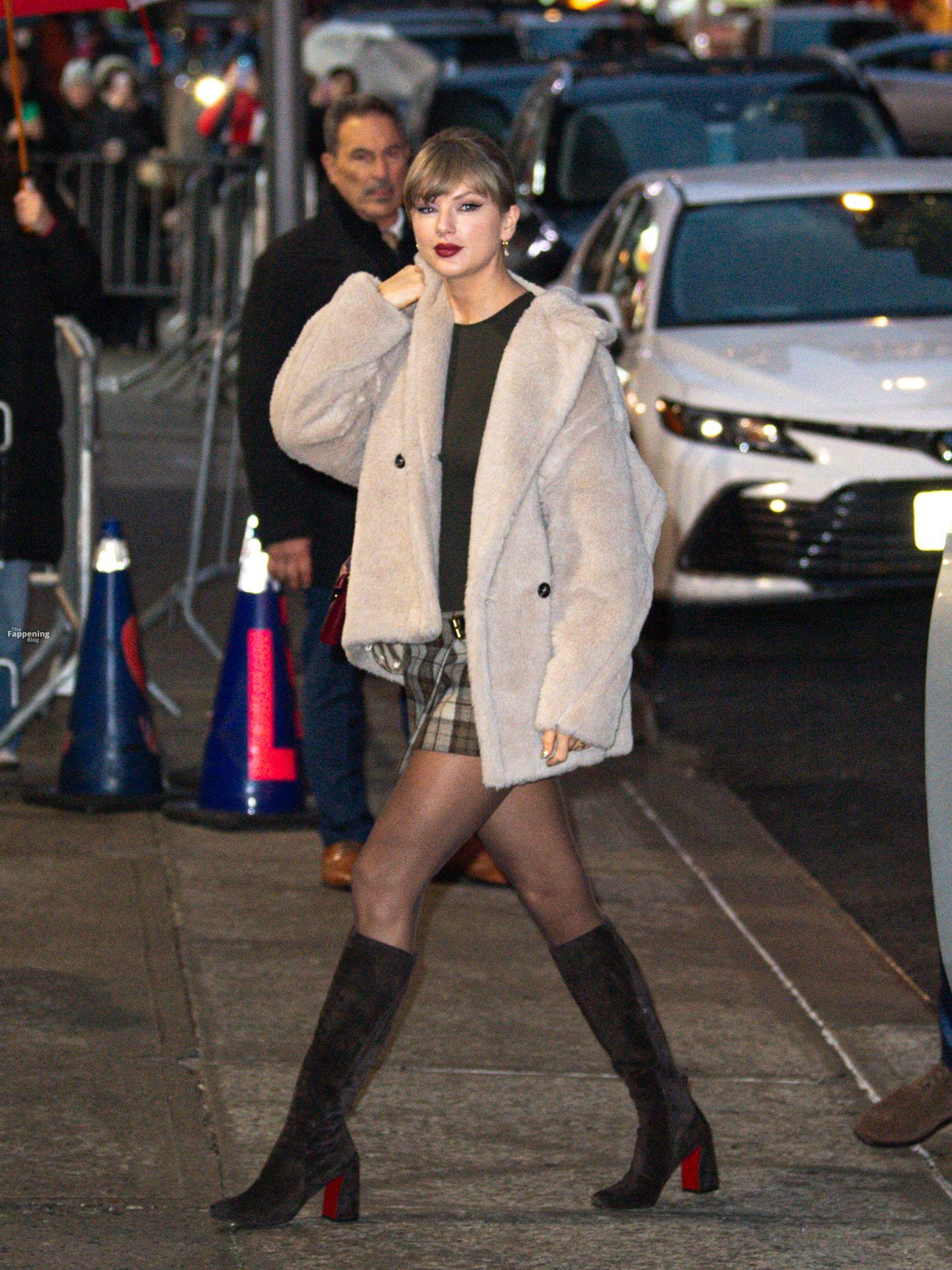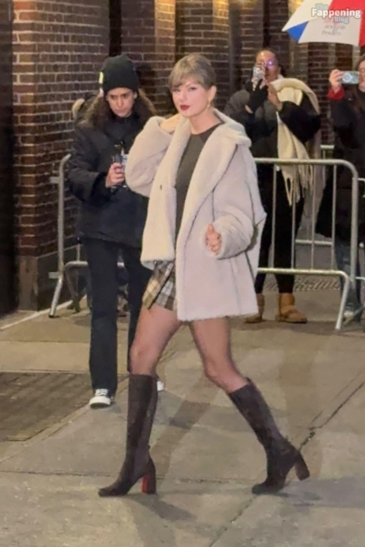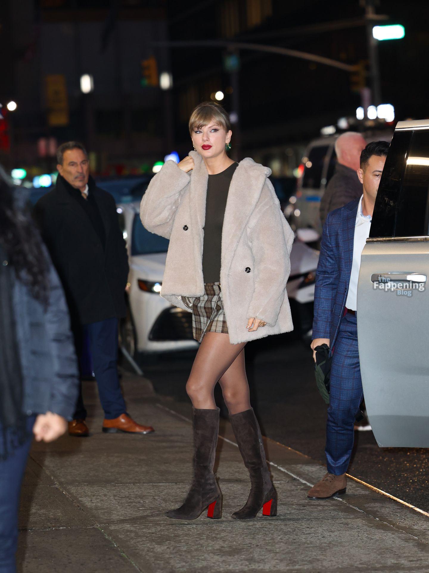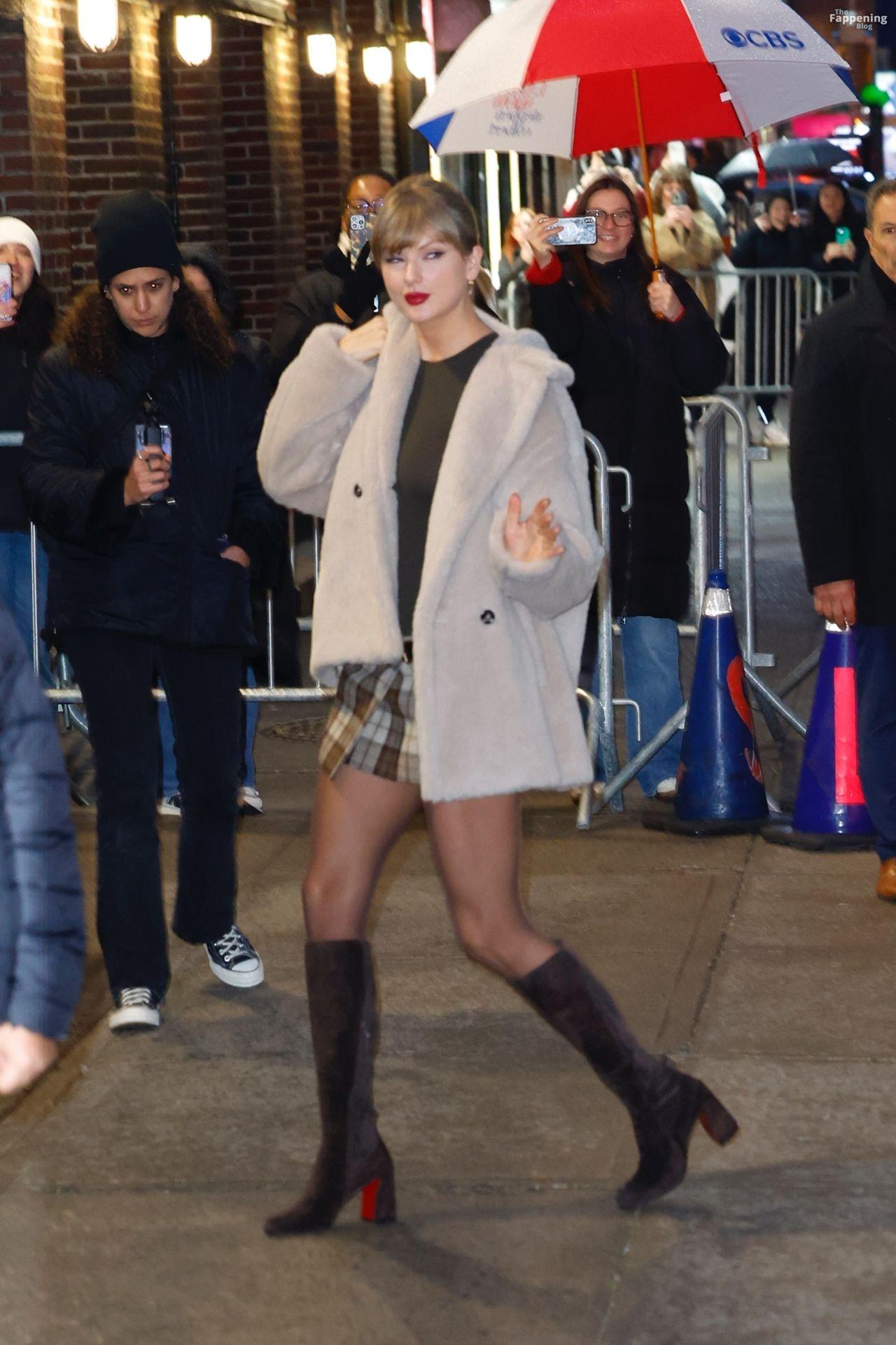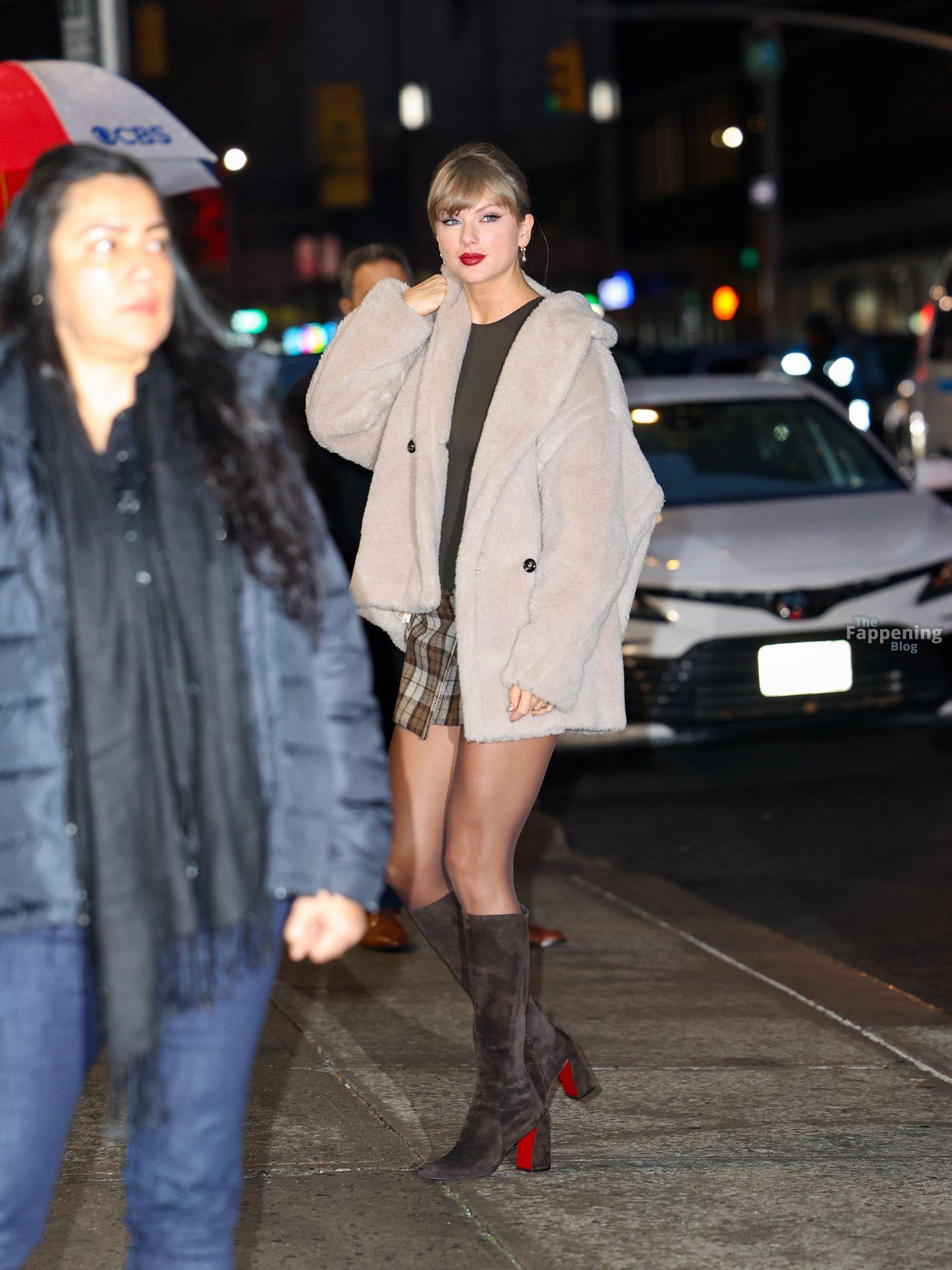 Tay‑Tay estuvo en NYC. Lució un mini vestido de cuadros y sin tirantes en Colbert – piernas y escote a la vista.