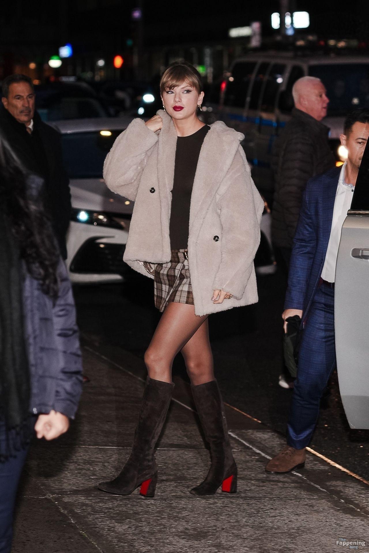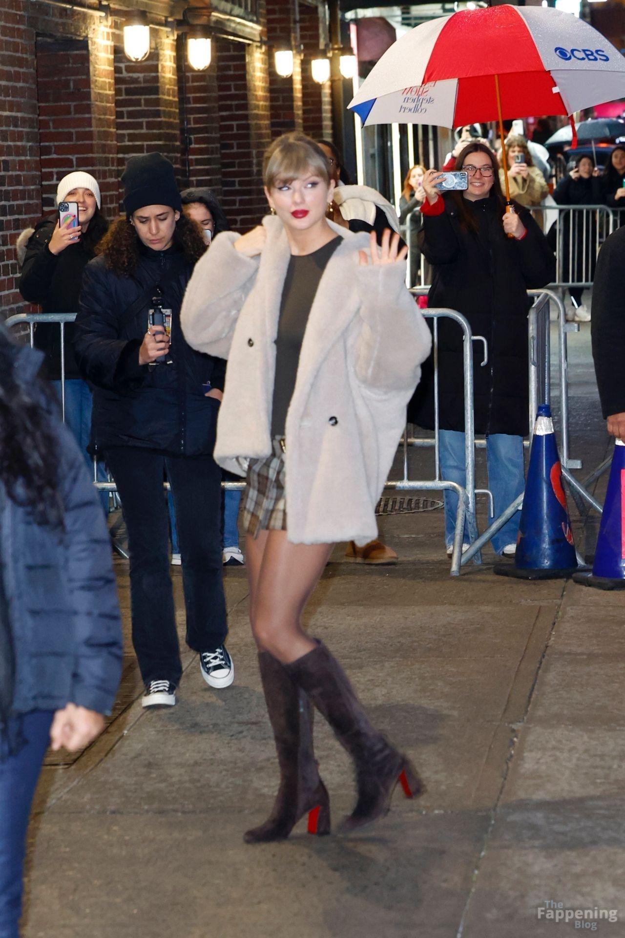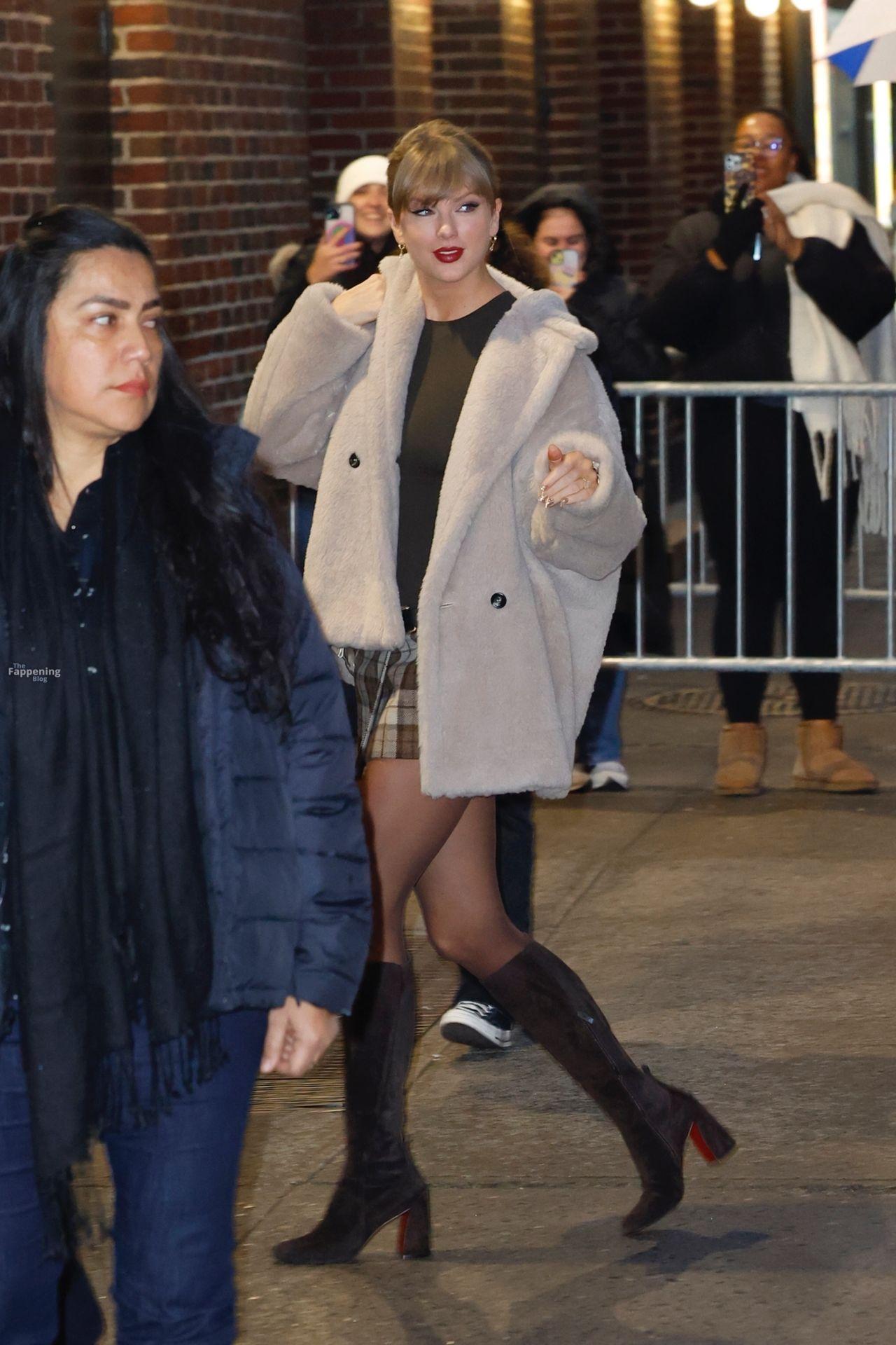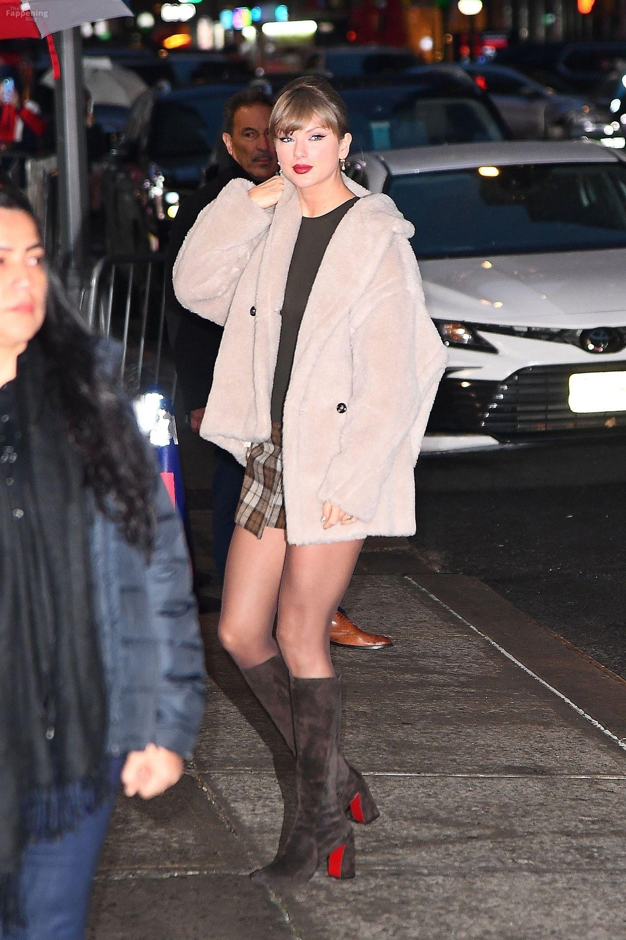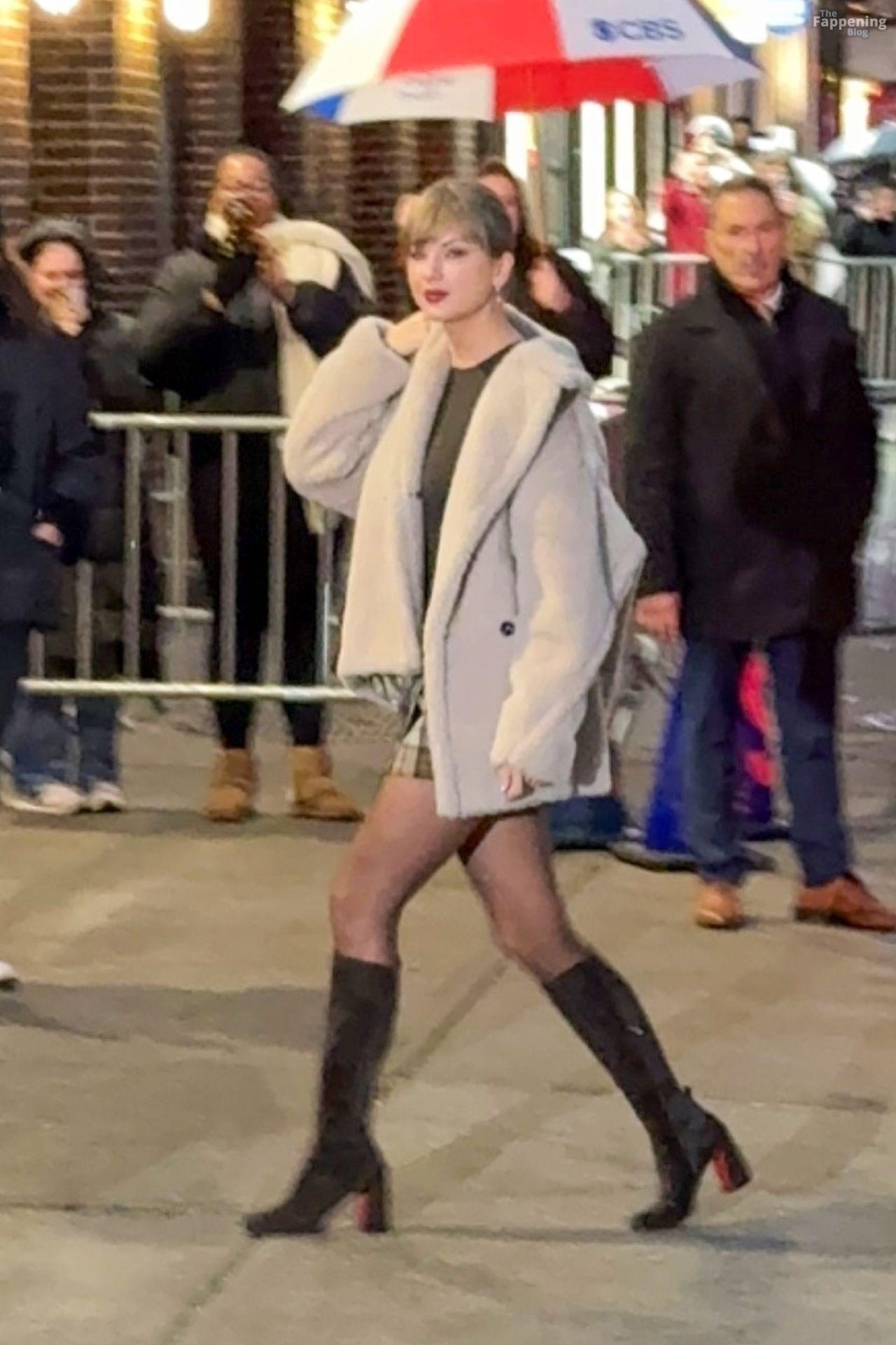 Tay‑Tay estuvo en NYC. Lució un mini vestido de cuadros y sin tirantes en Colbert – piernas y escote a la vista.