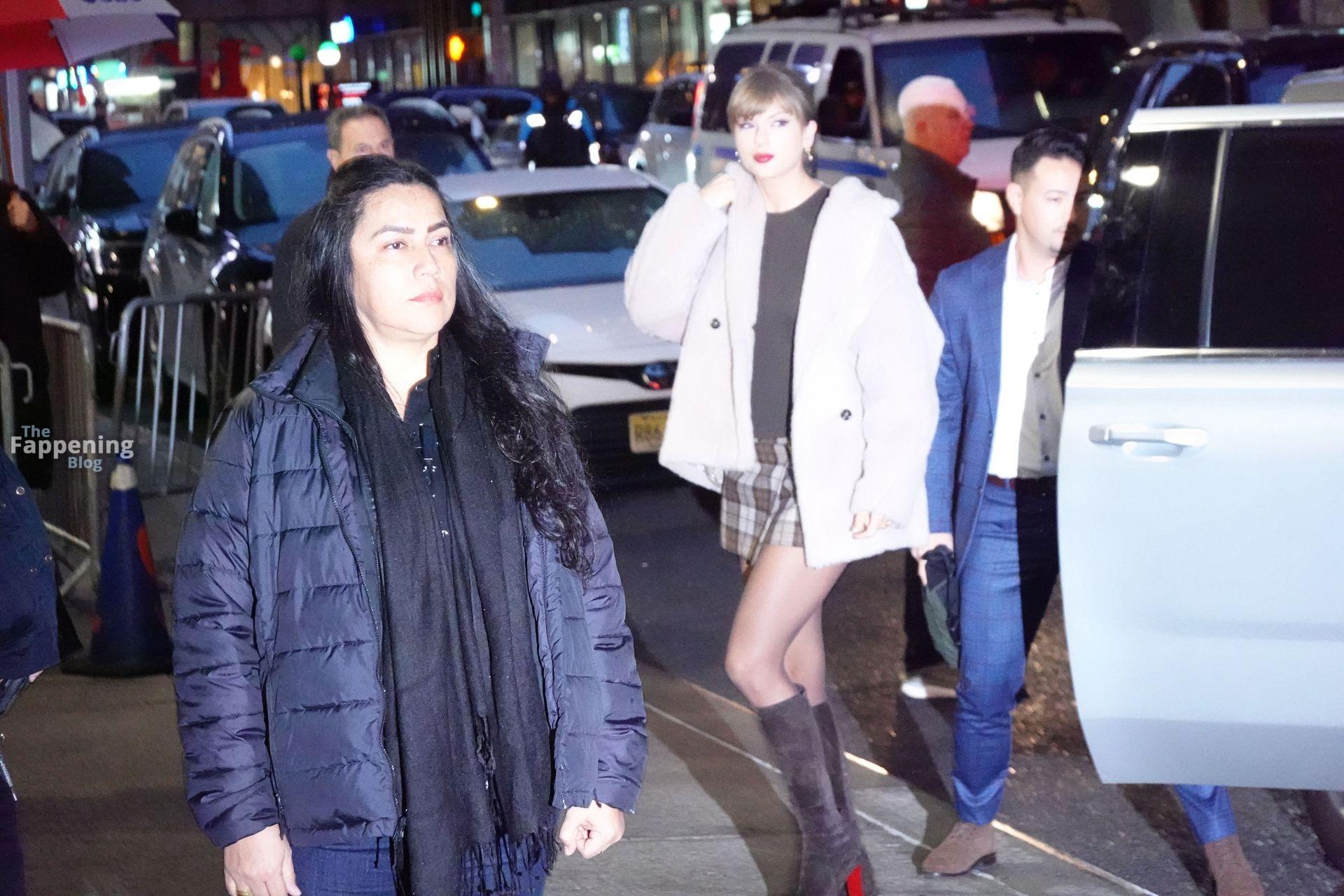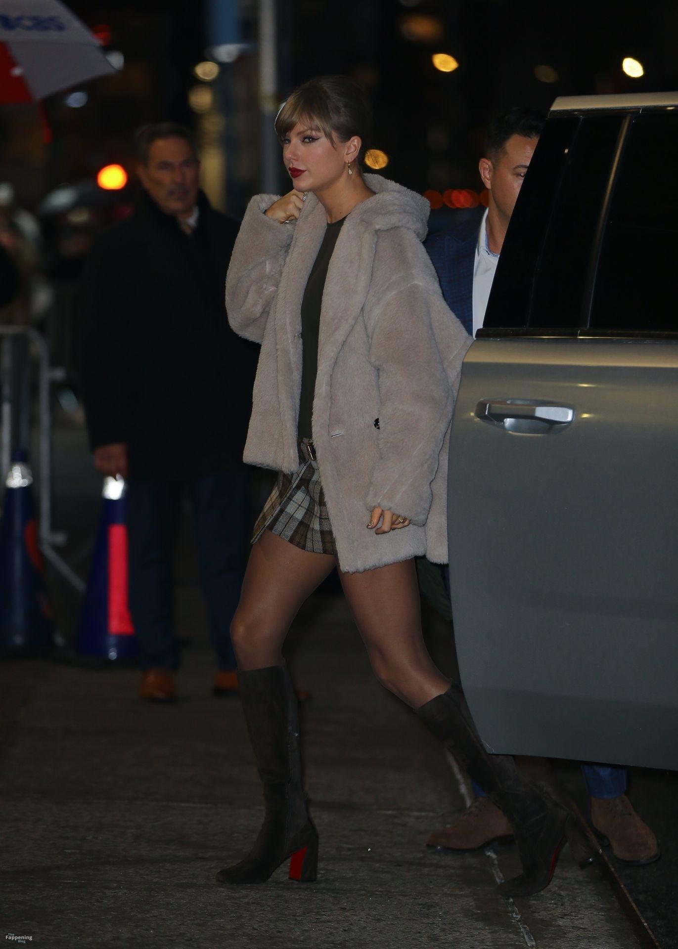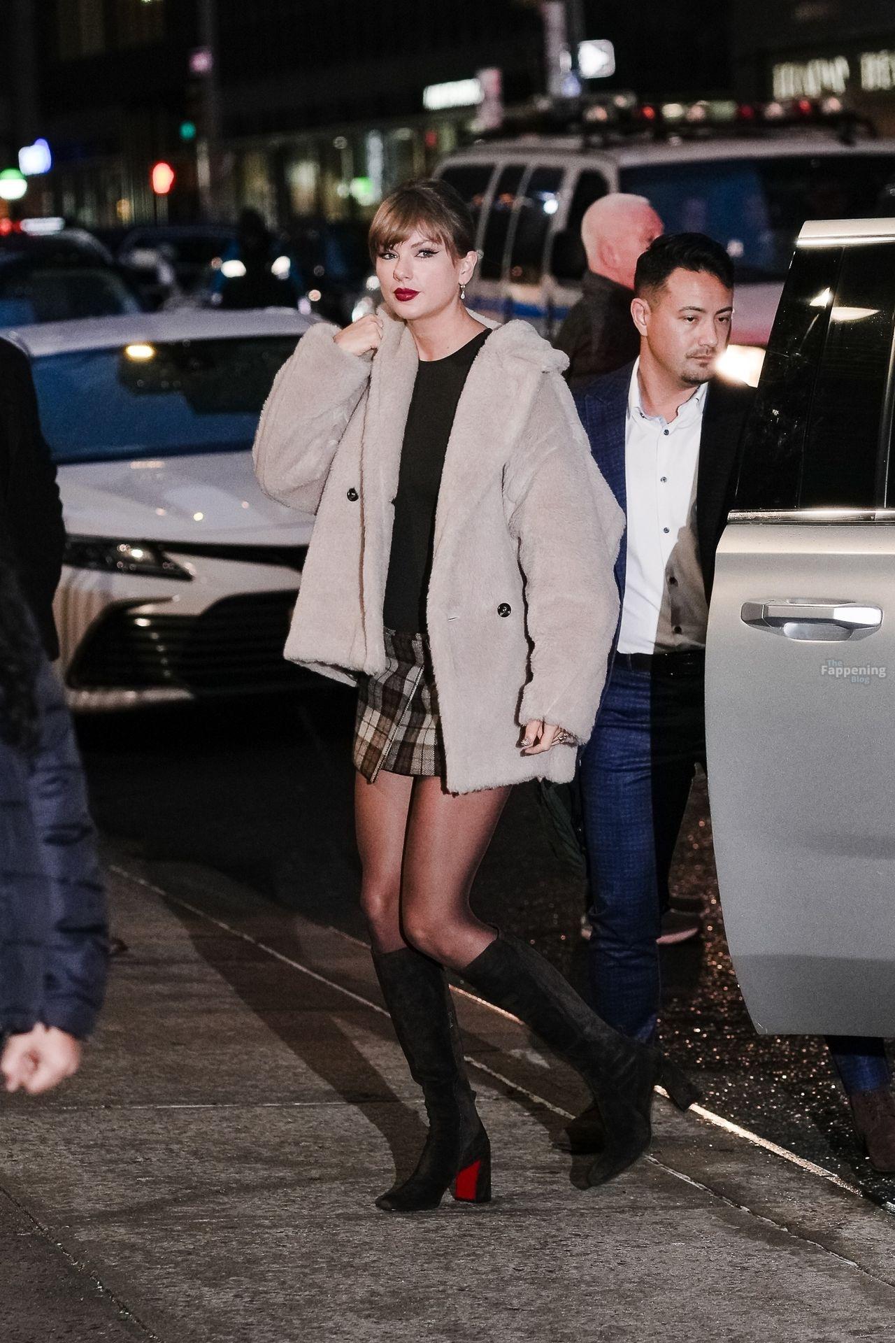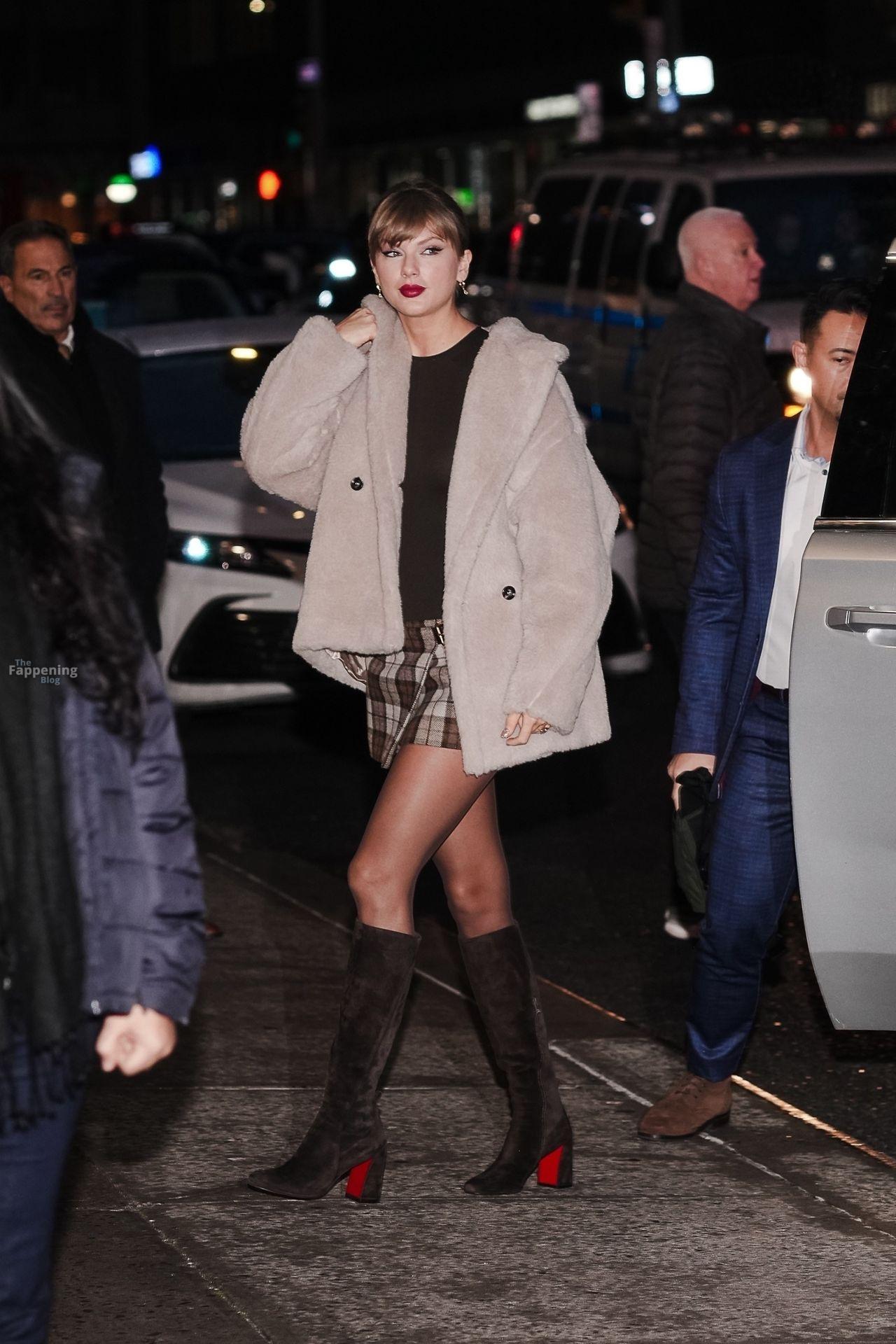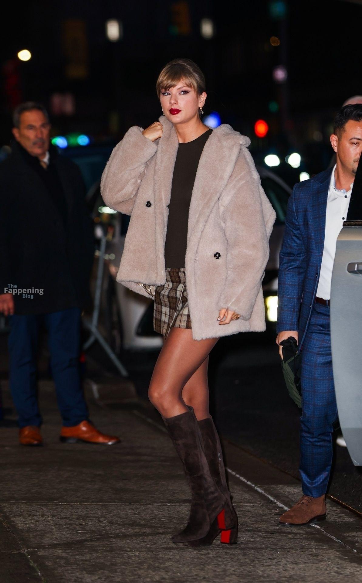 Tay‑Tay estuvo en NYC. Lució un mini vestido de cuadros y sin tirantes en Colbert – piernas y escote a la vista.