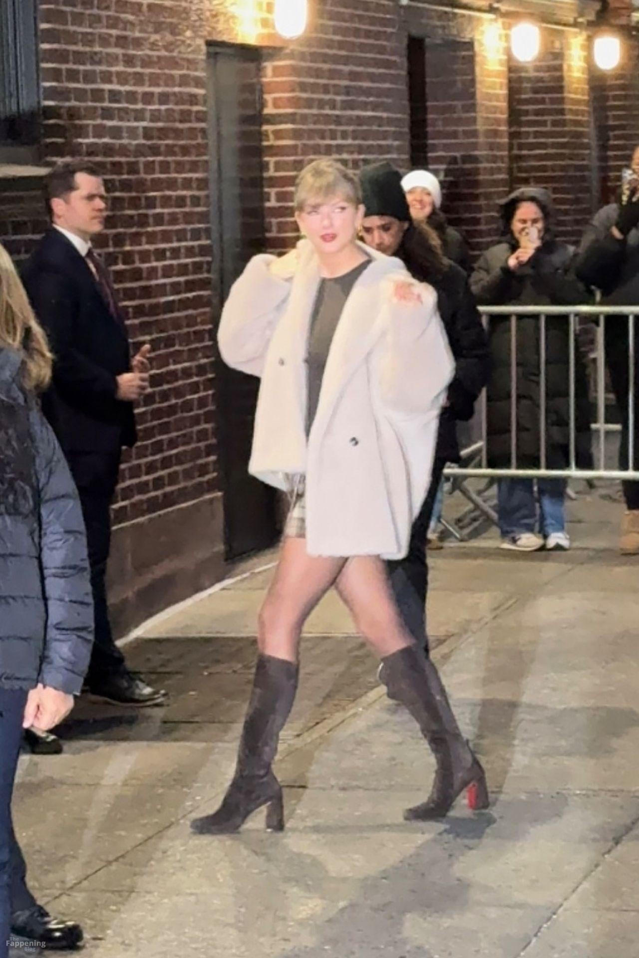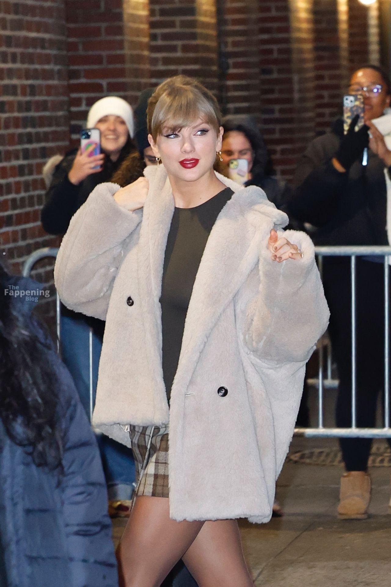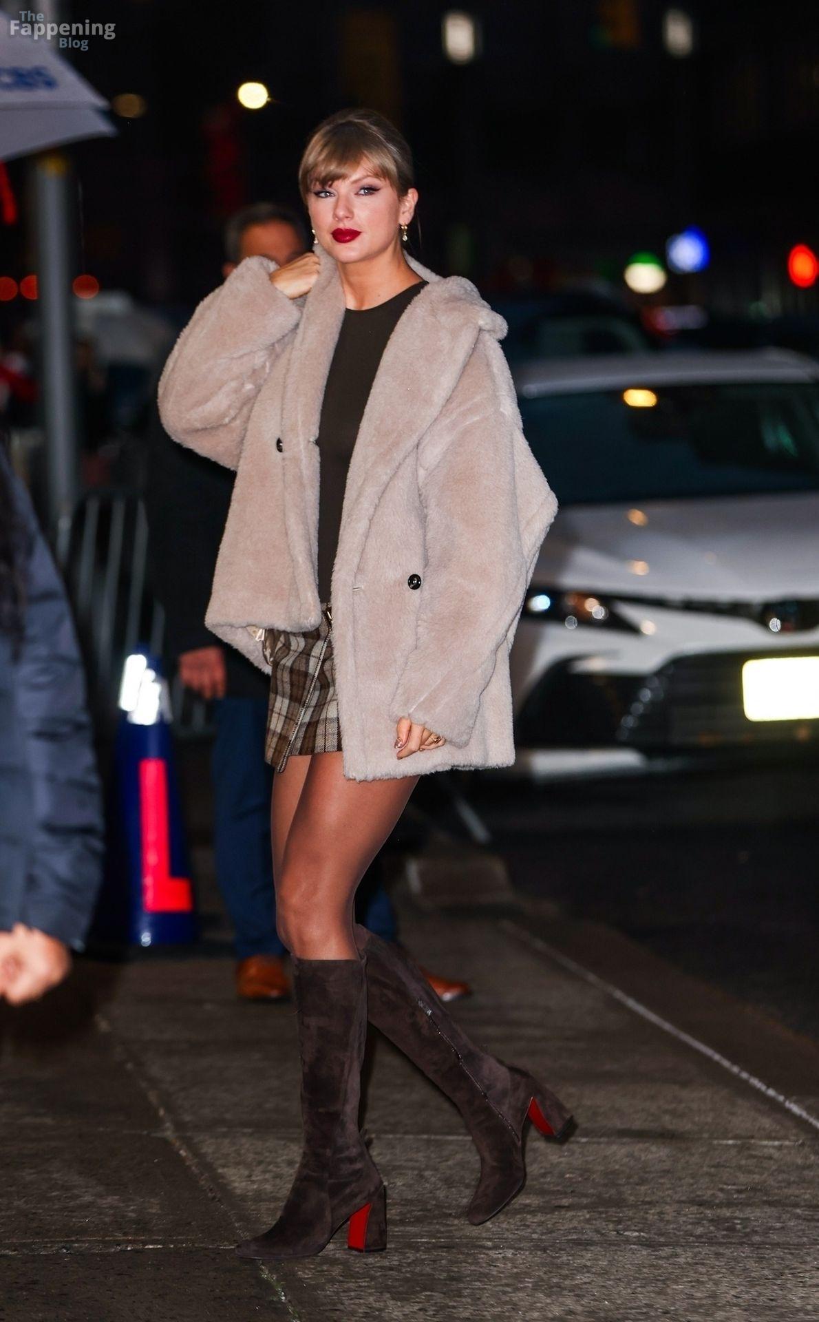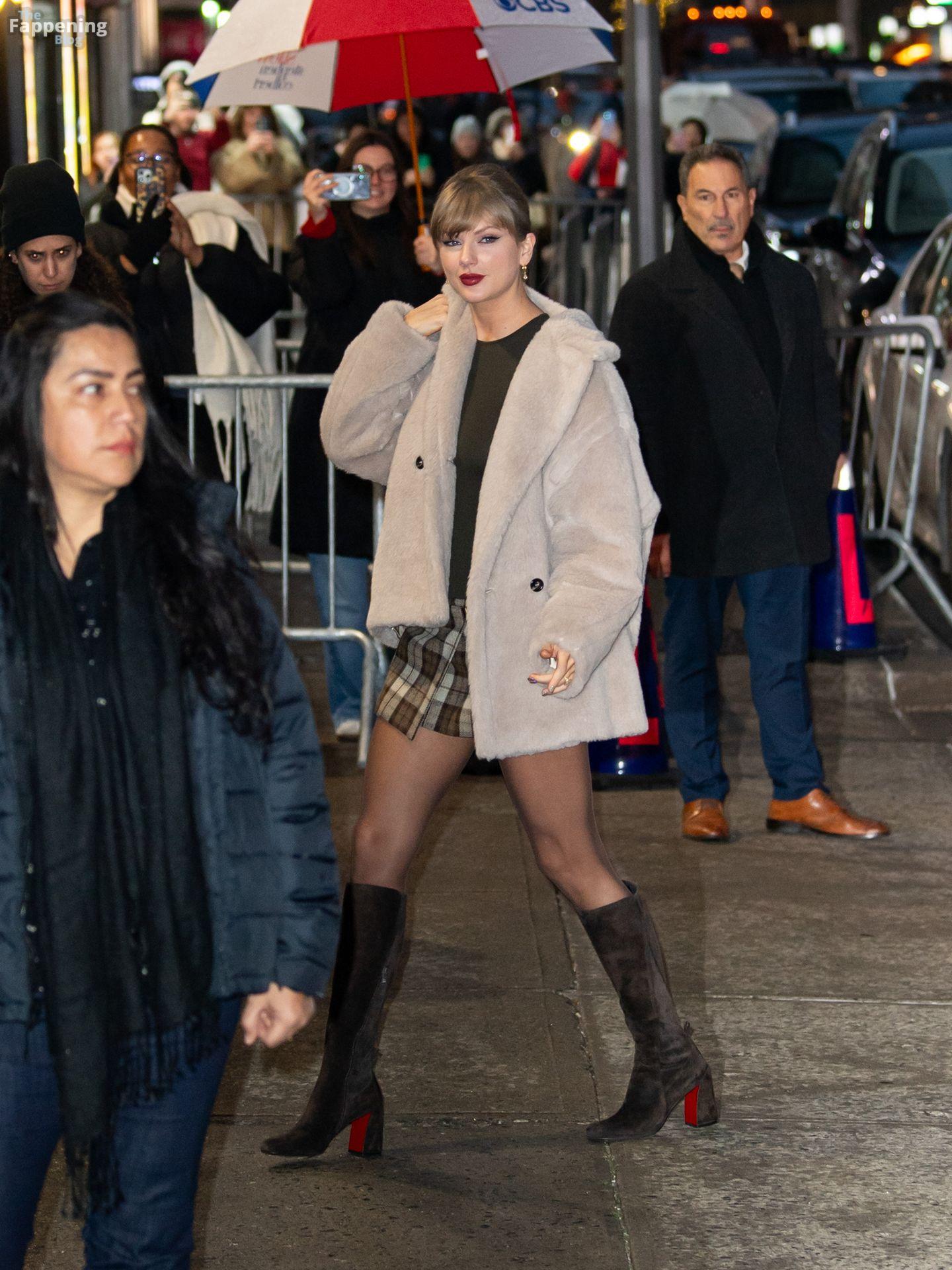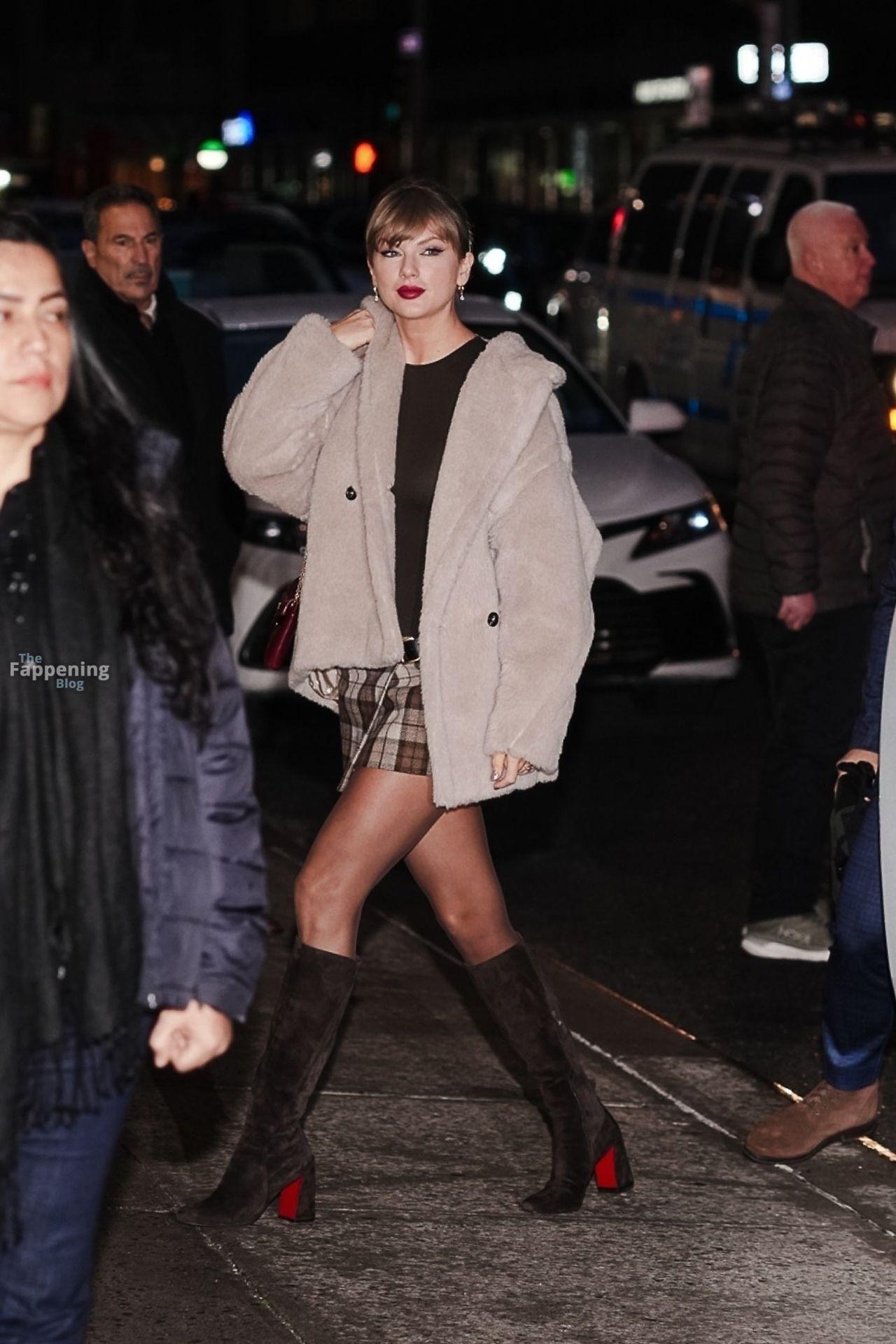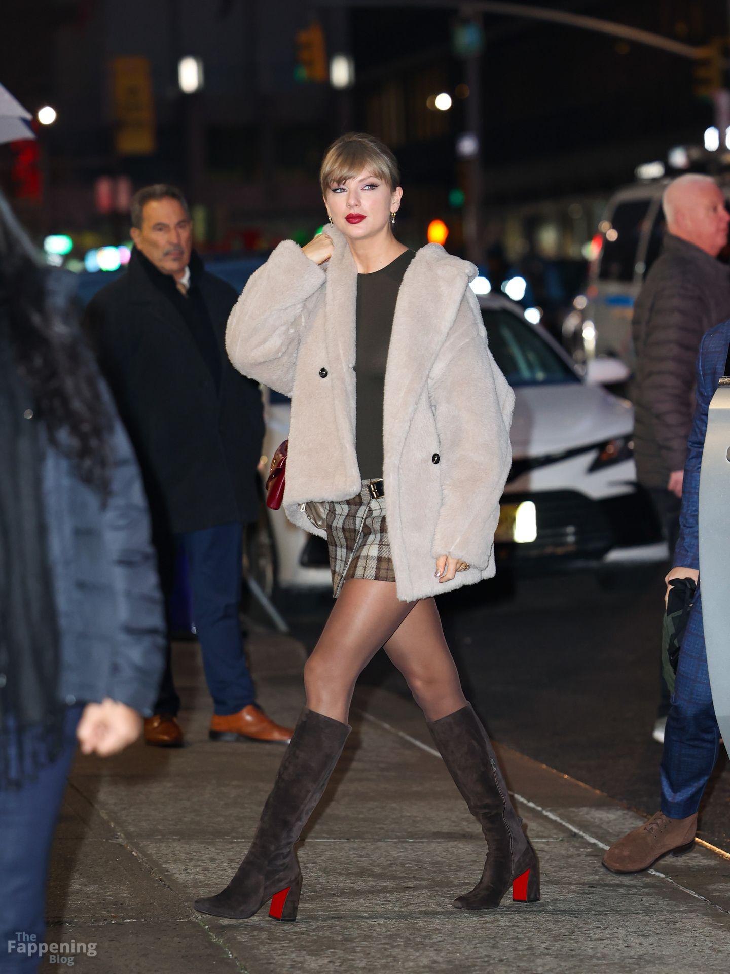 Tay‑Tay estuvo en NYC. Lució un mini vestido de cuadros y sin tirantes en Colbert – piernas y escote a la vista.