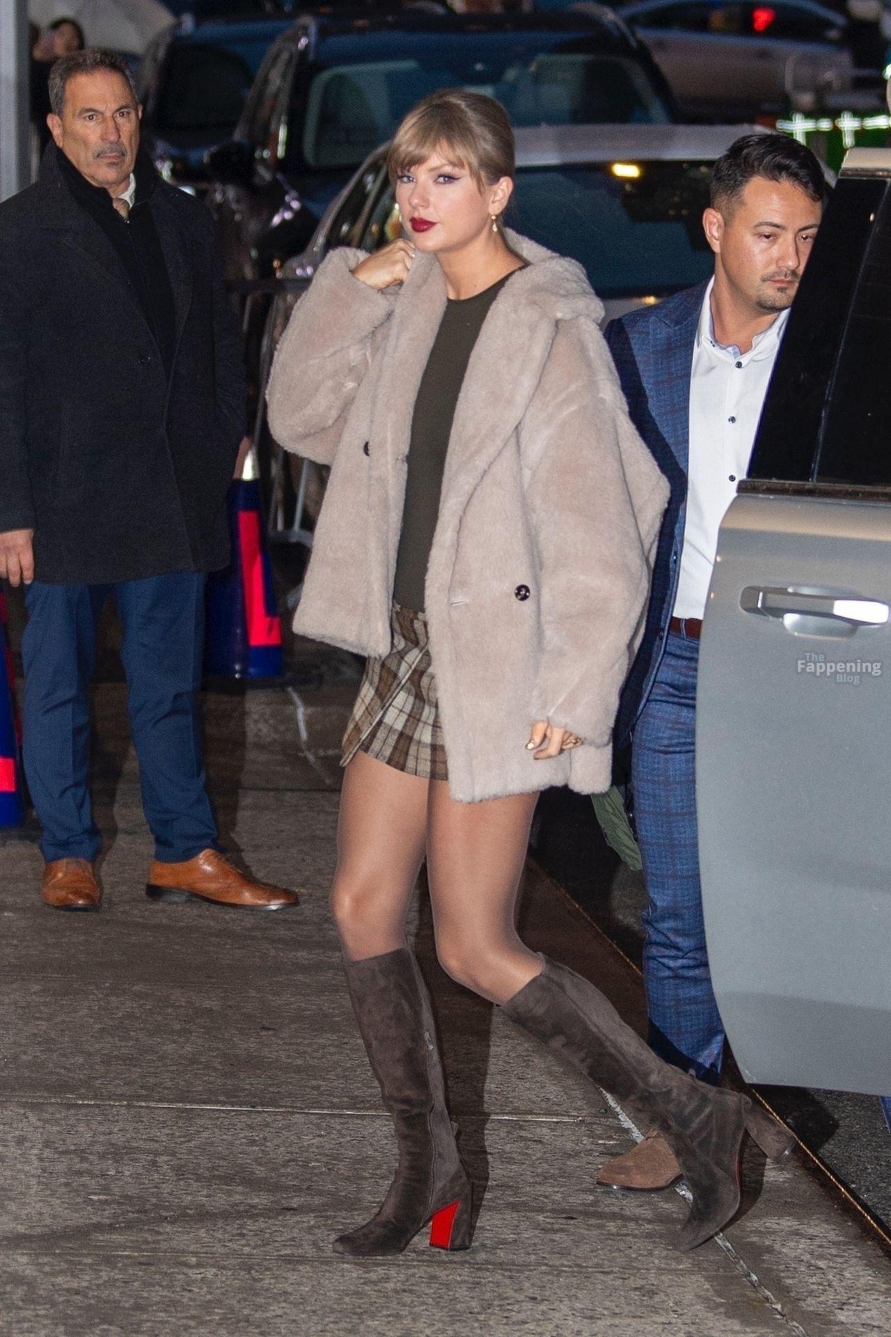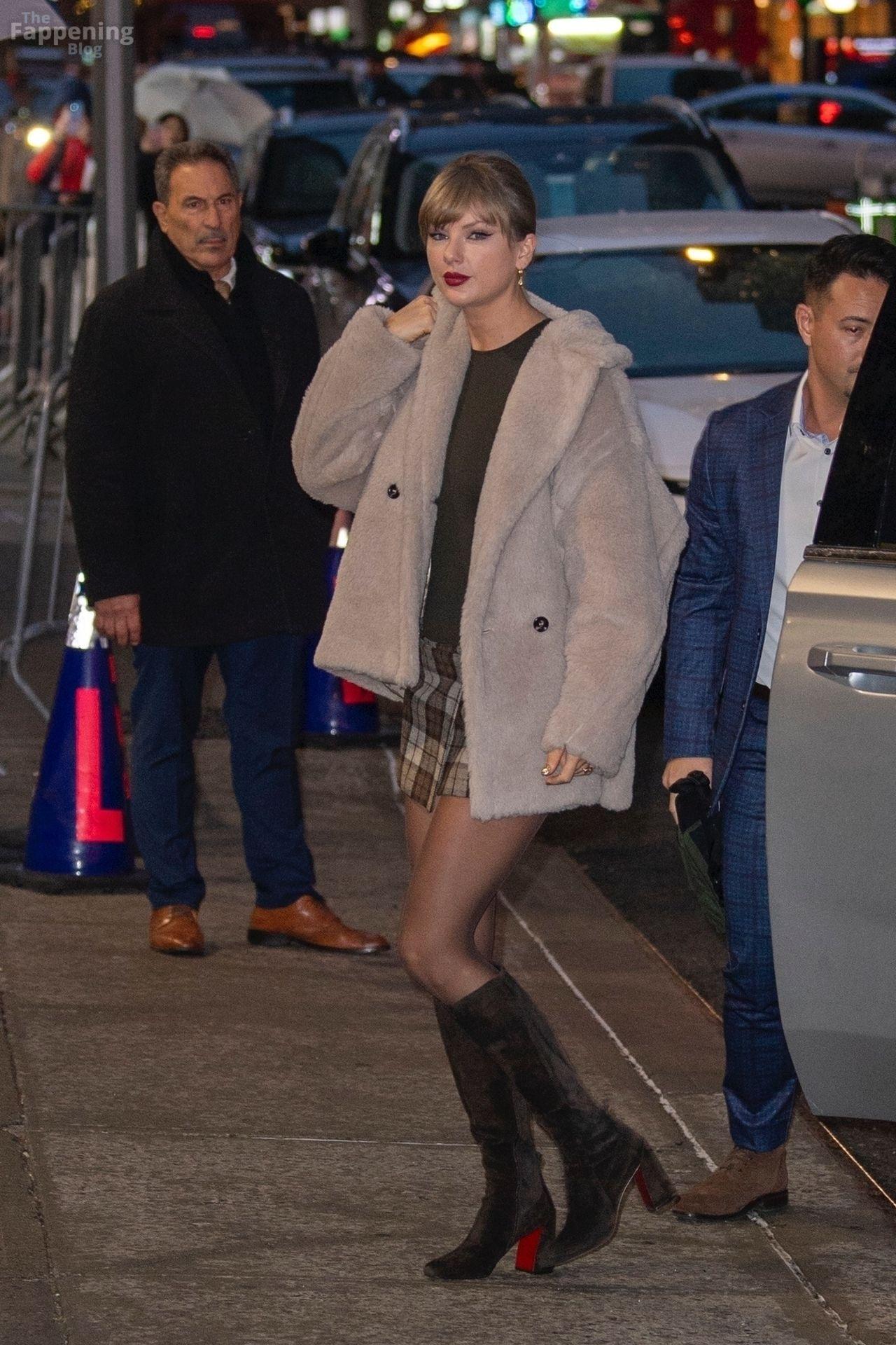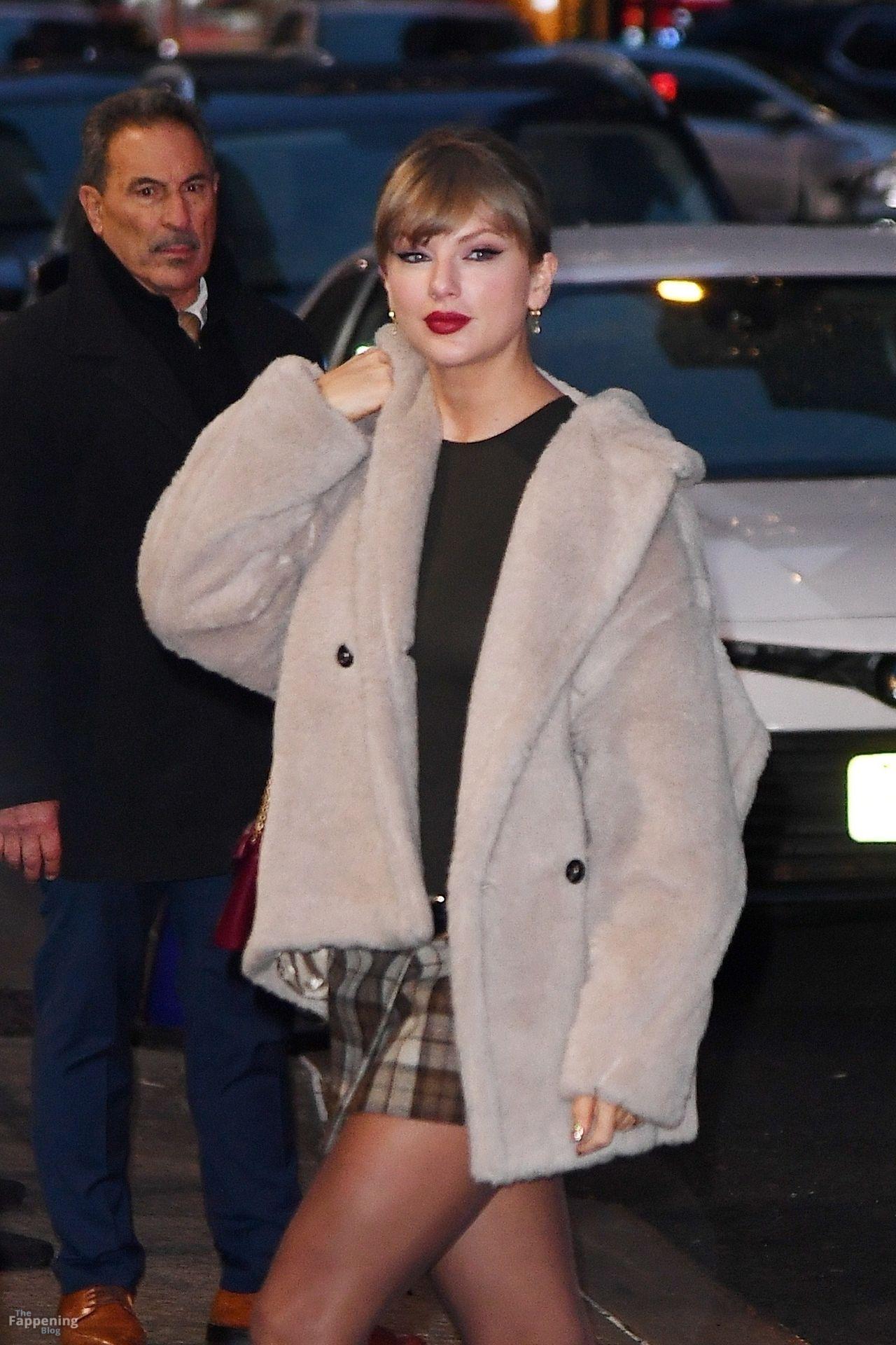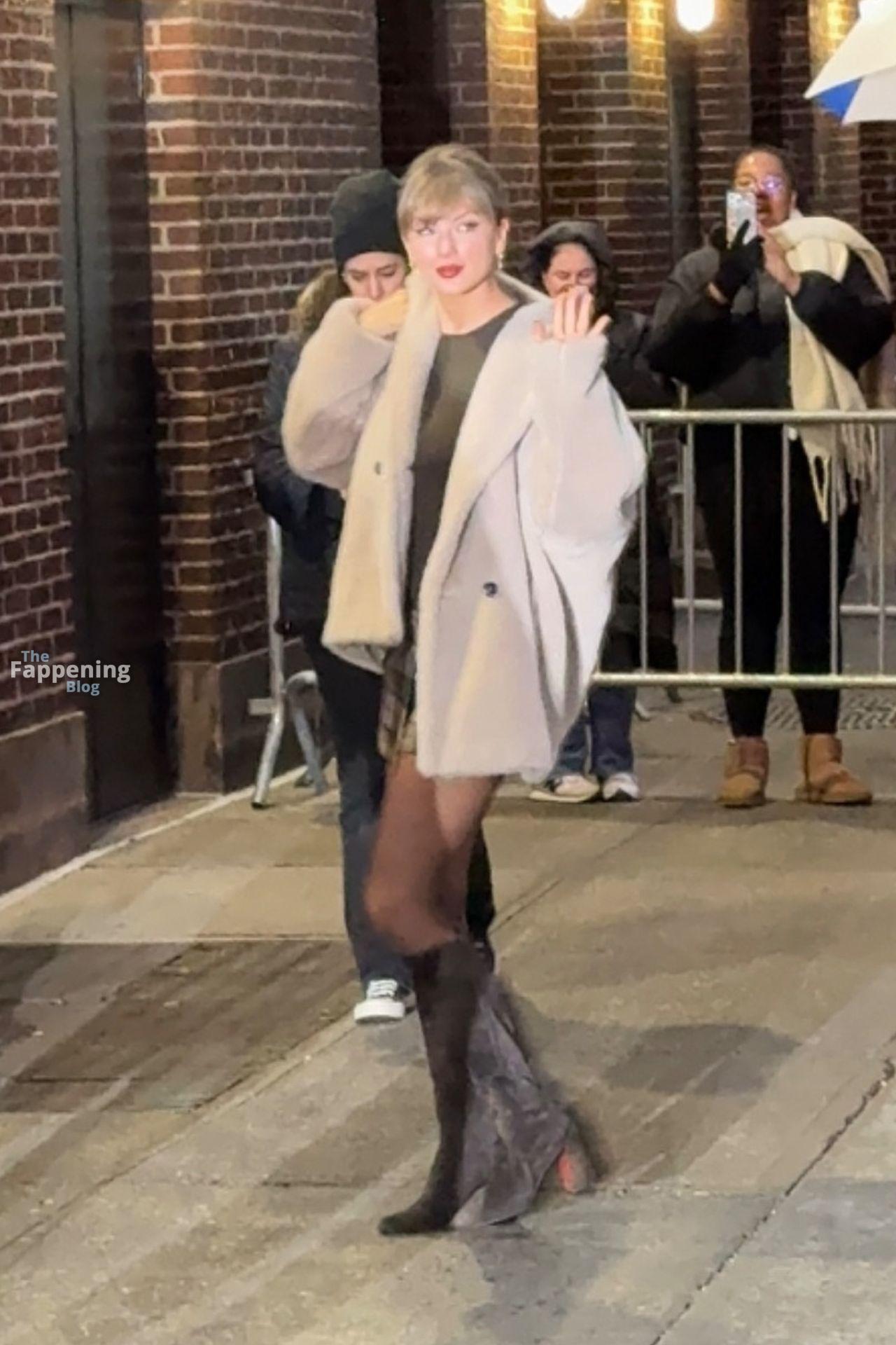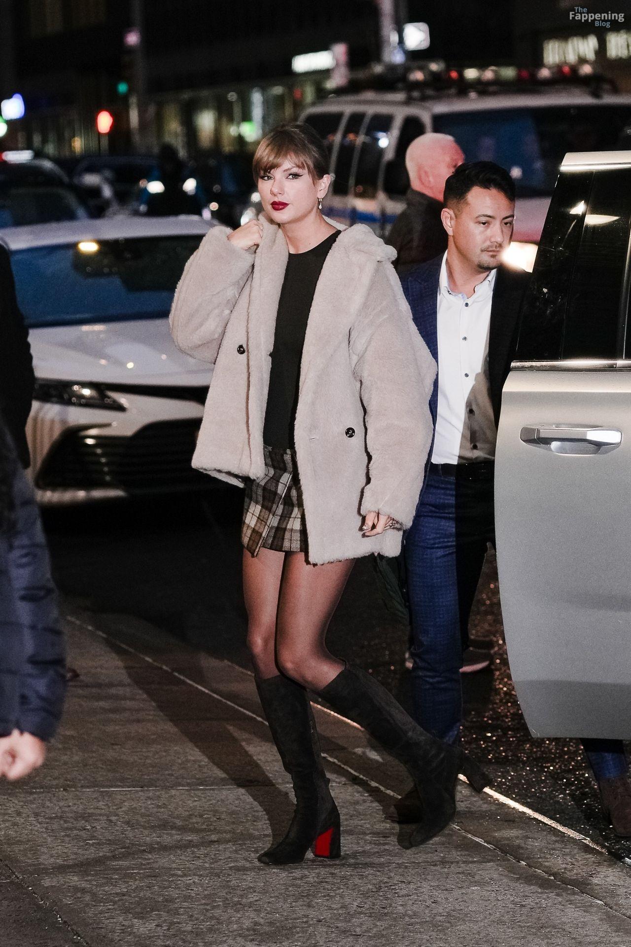 Tay‑Tay estuvo en NYC. Lució un mini vestido de cuadros y sin tirantes en Colbert – piernas y escote a la vista.
