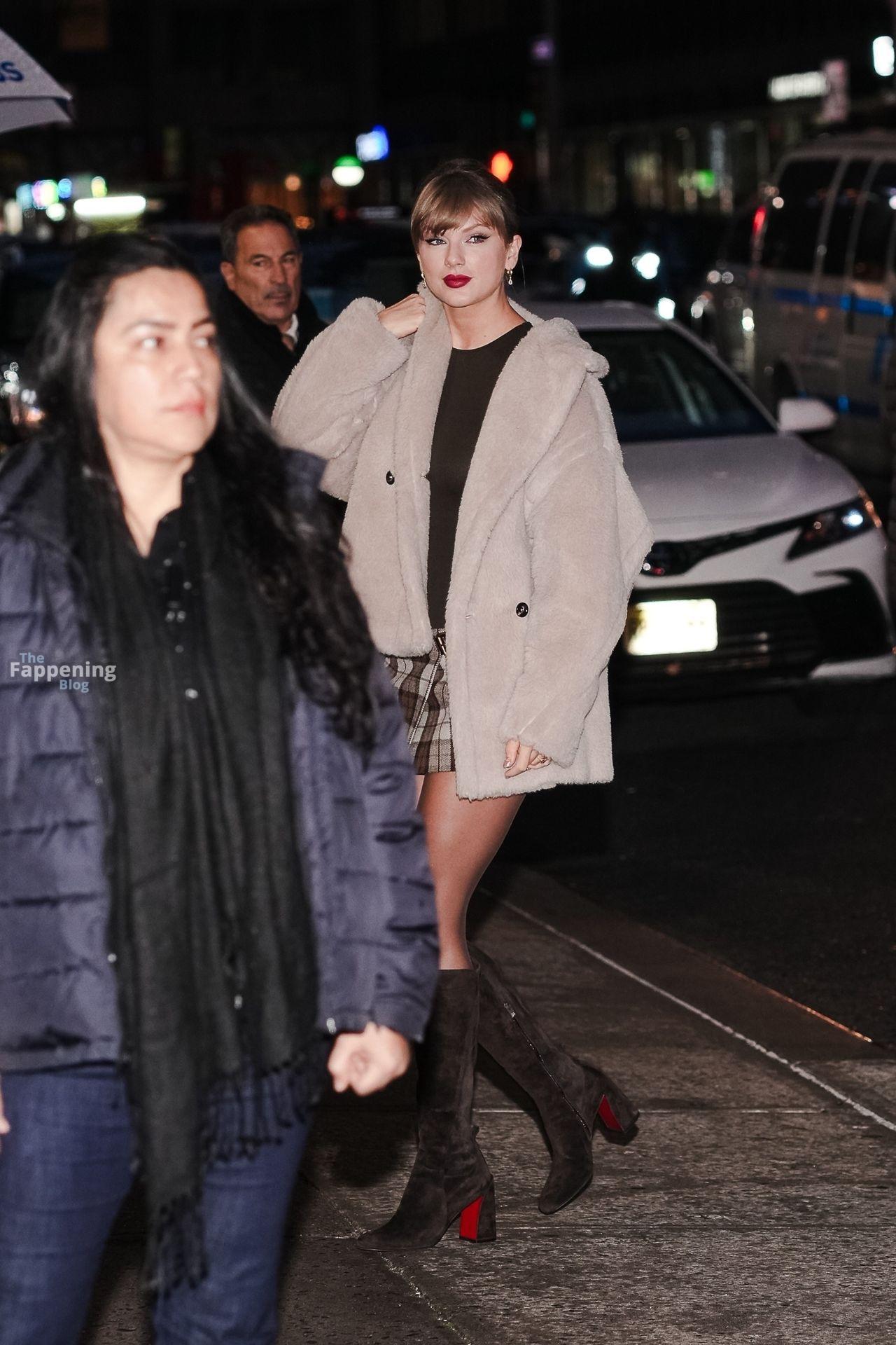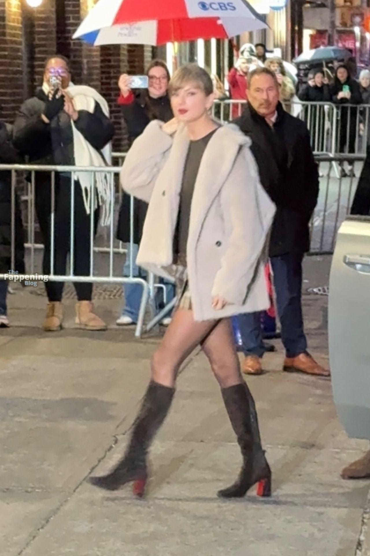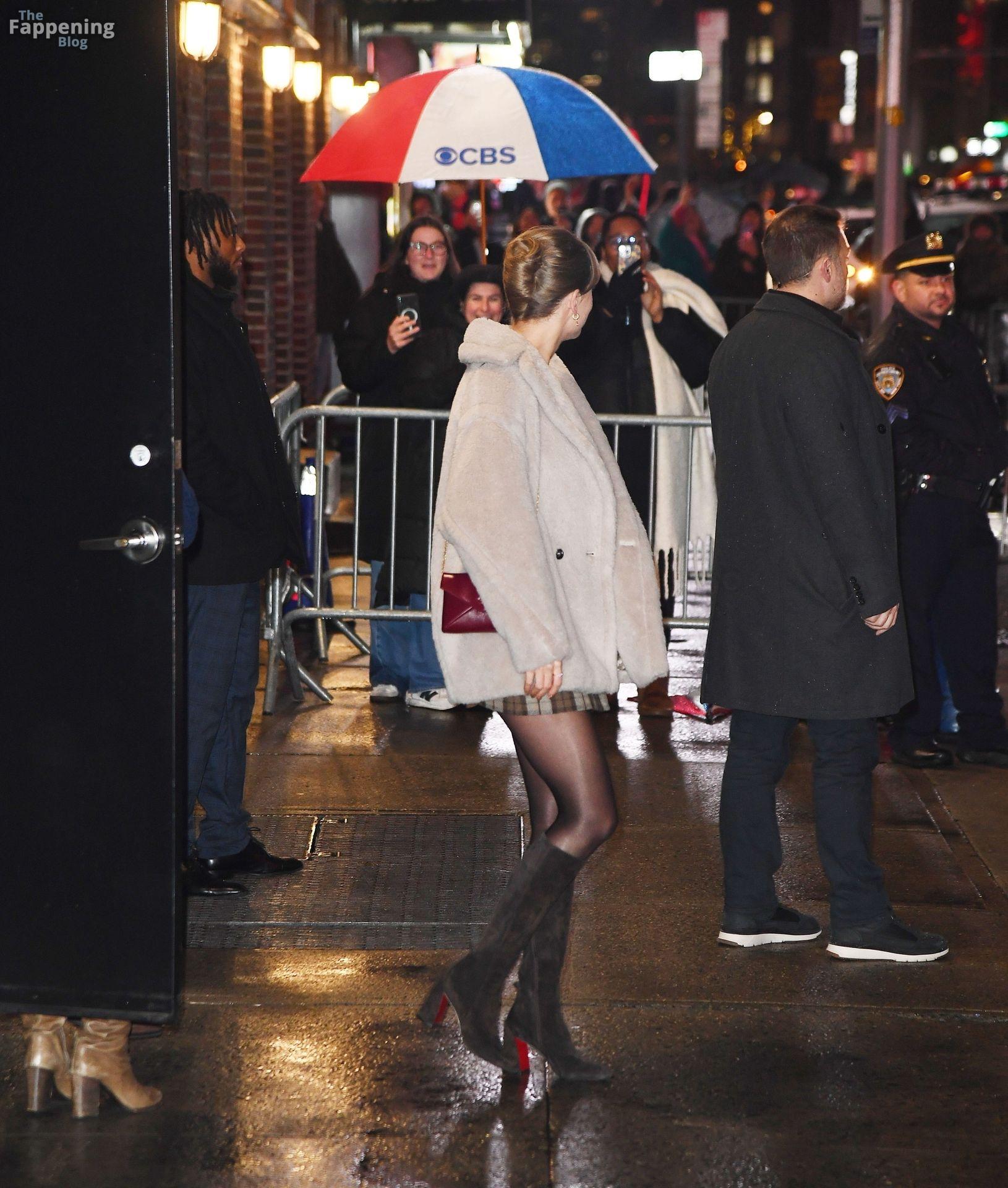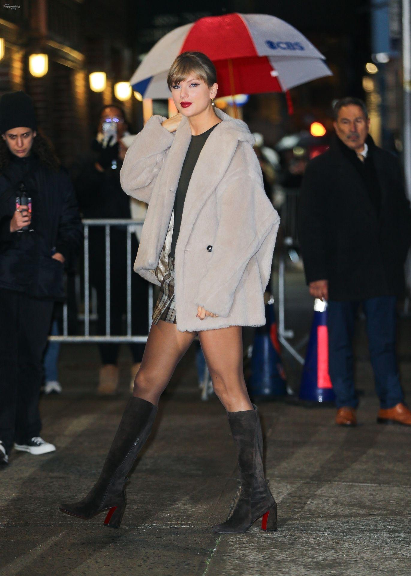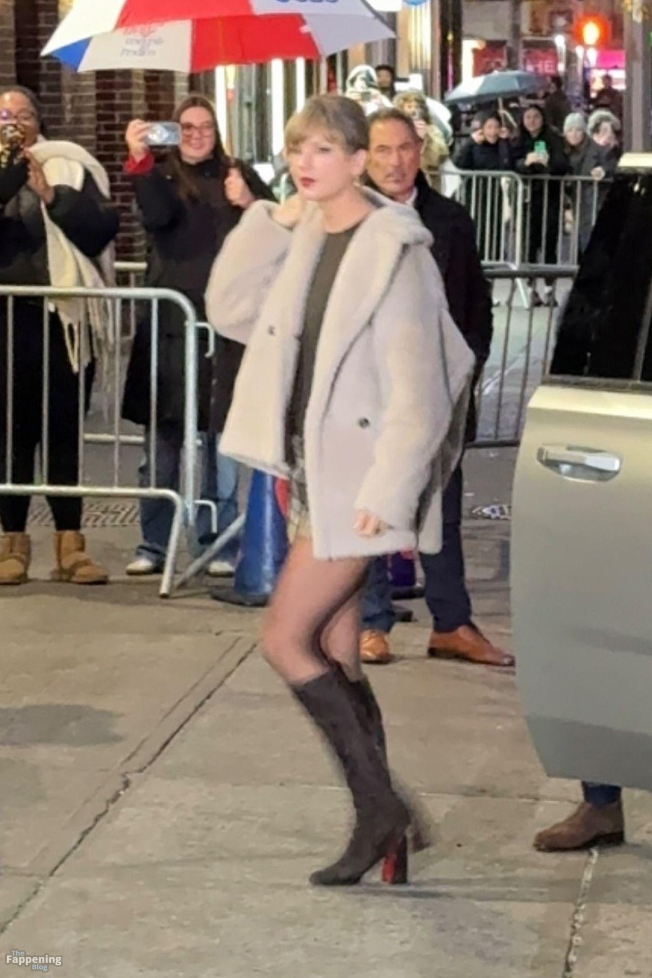 Tay‑Tay estuvo en NYC. Lució un mini vestido de cuadros y sin tirantes en Colbert – piernas y escote a la vista.