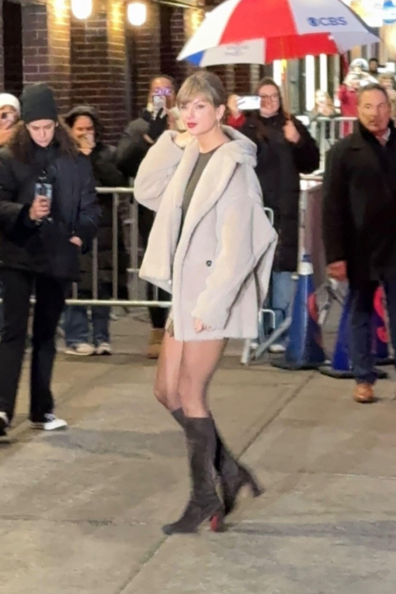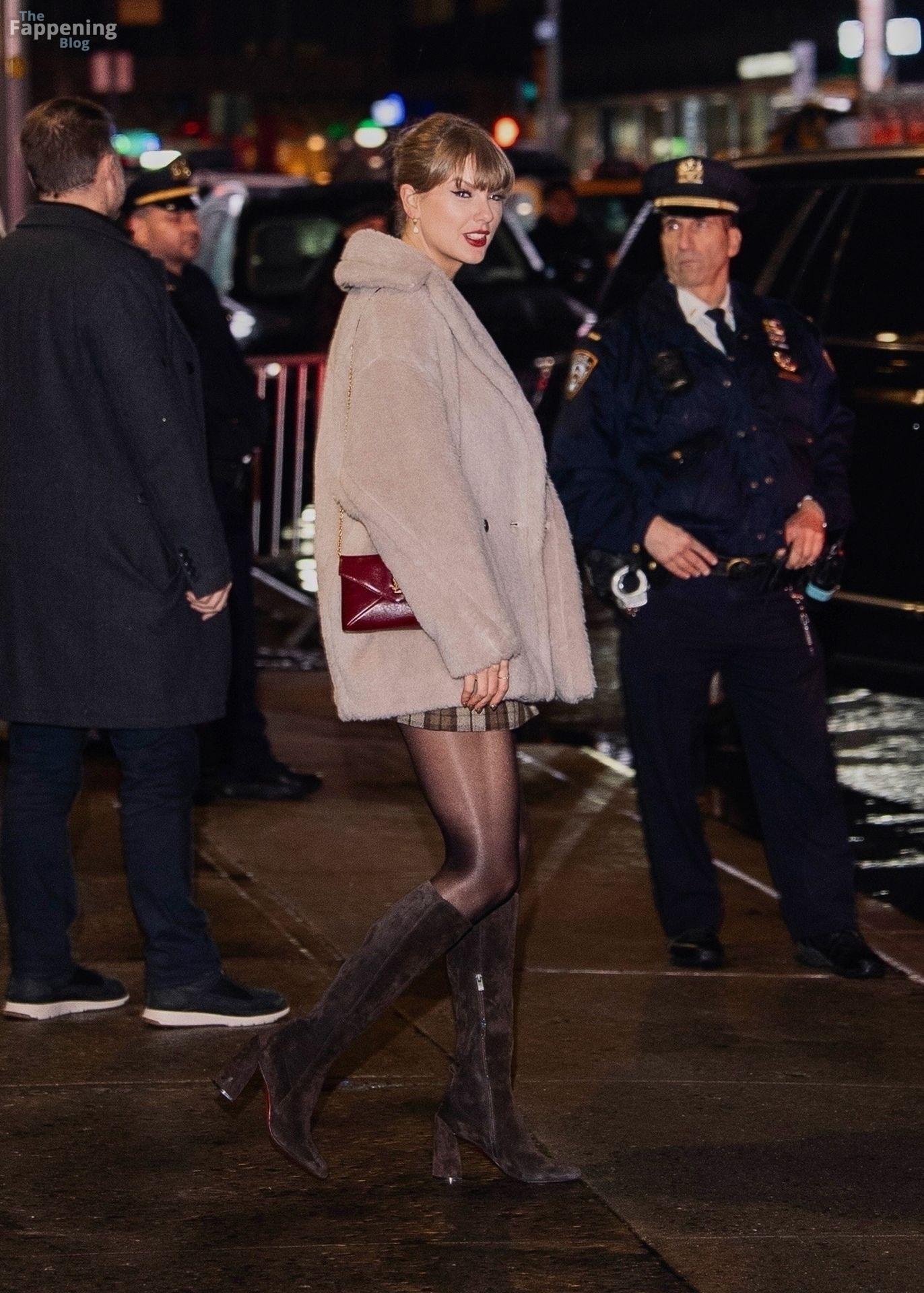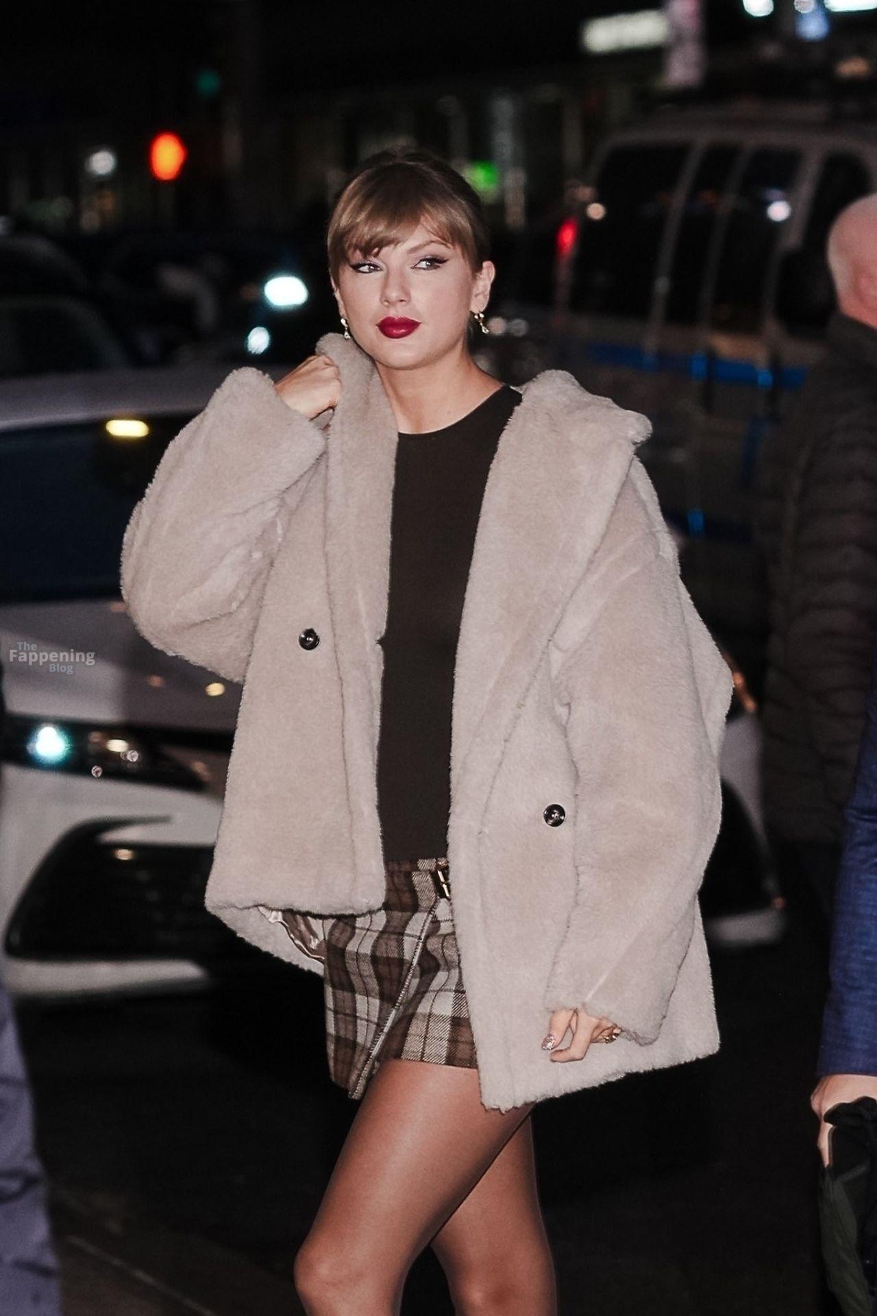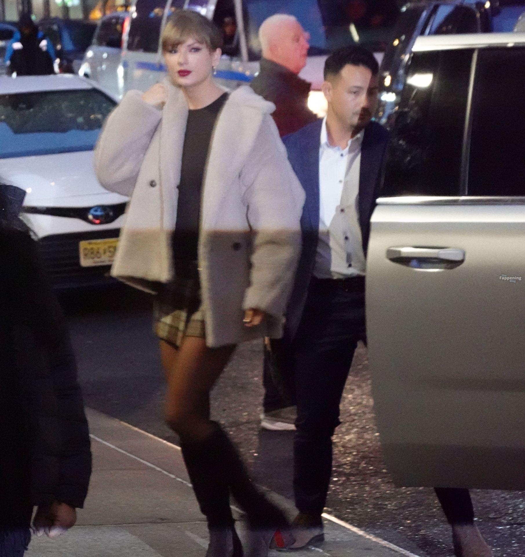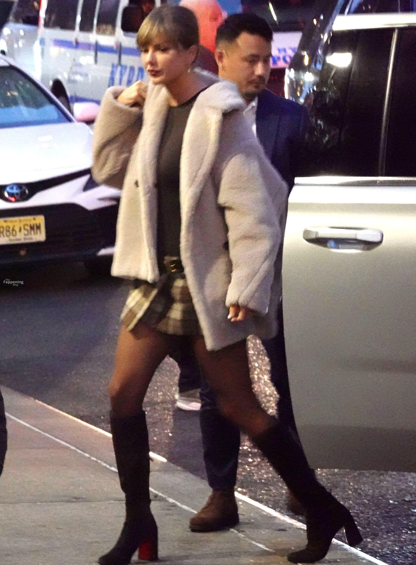 Tay‑Tay estuvo en NYC. Lució un mini vestido de cuadros y sin tirantes en Colbert – piernas y escote a la vista.
