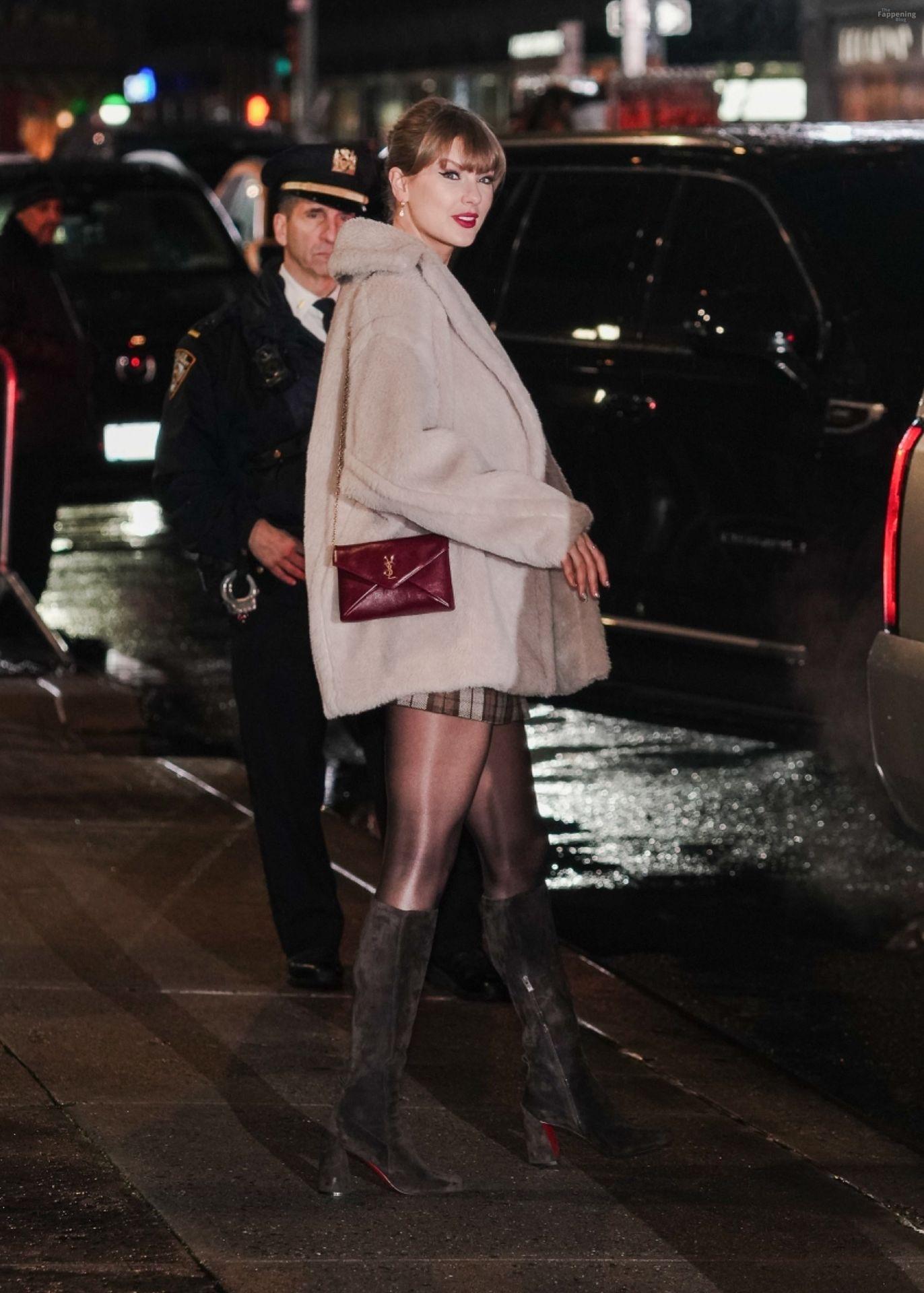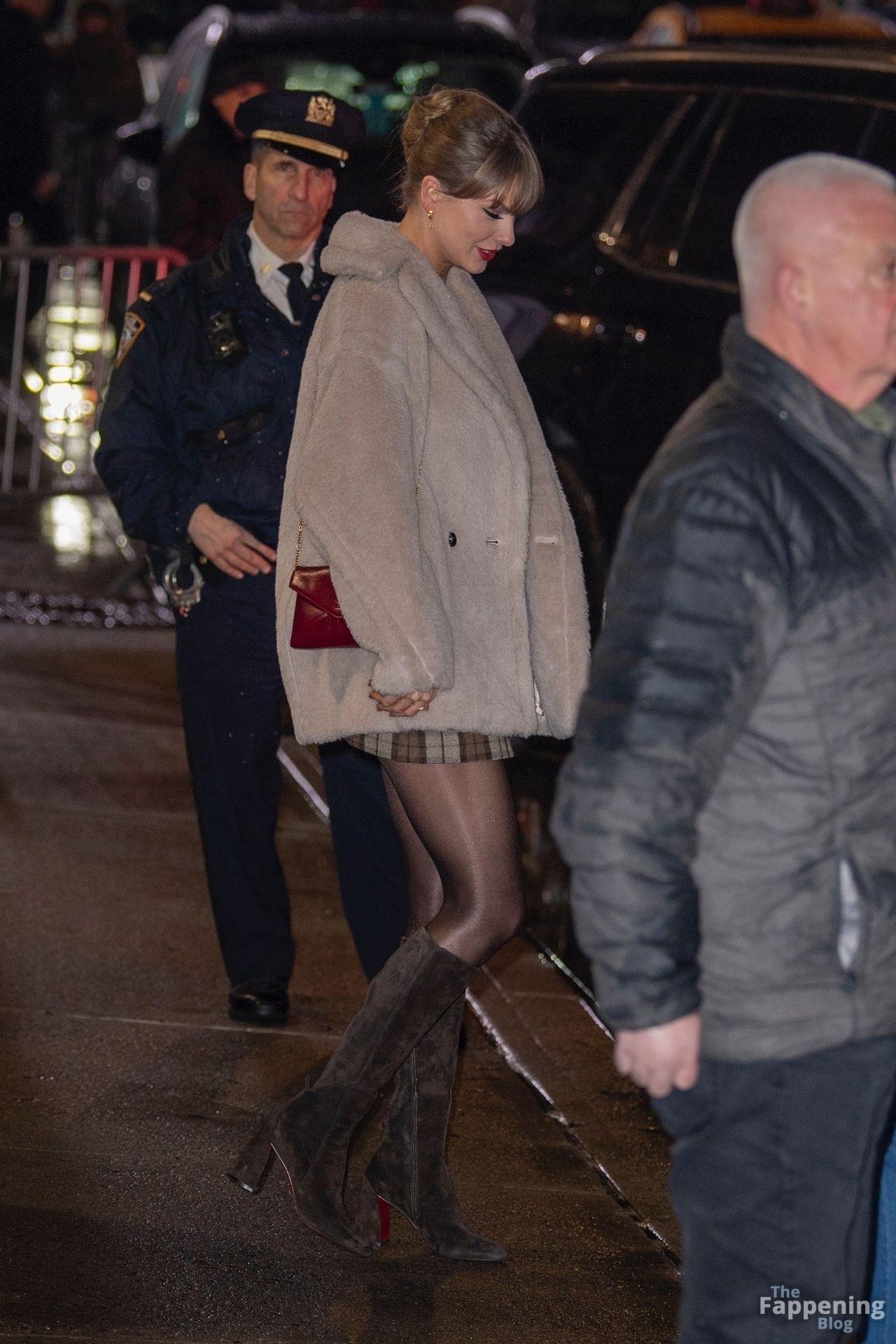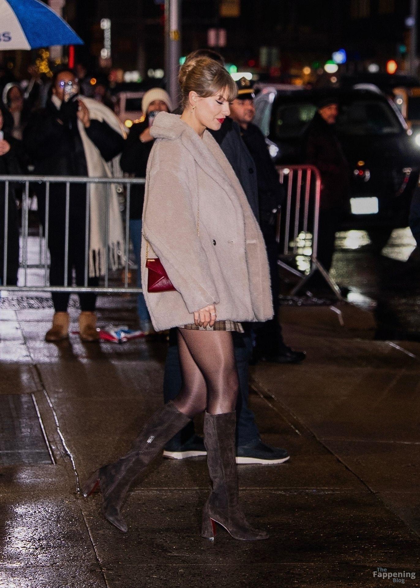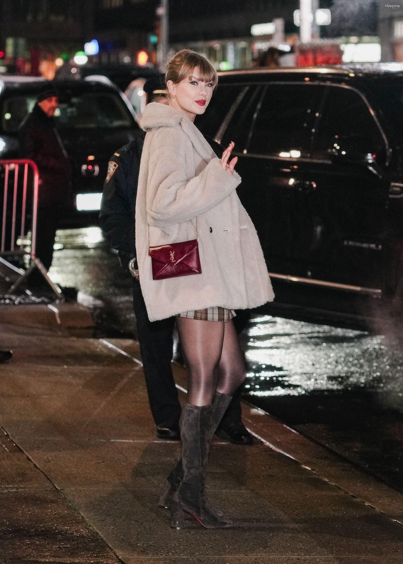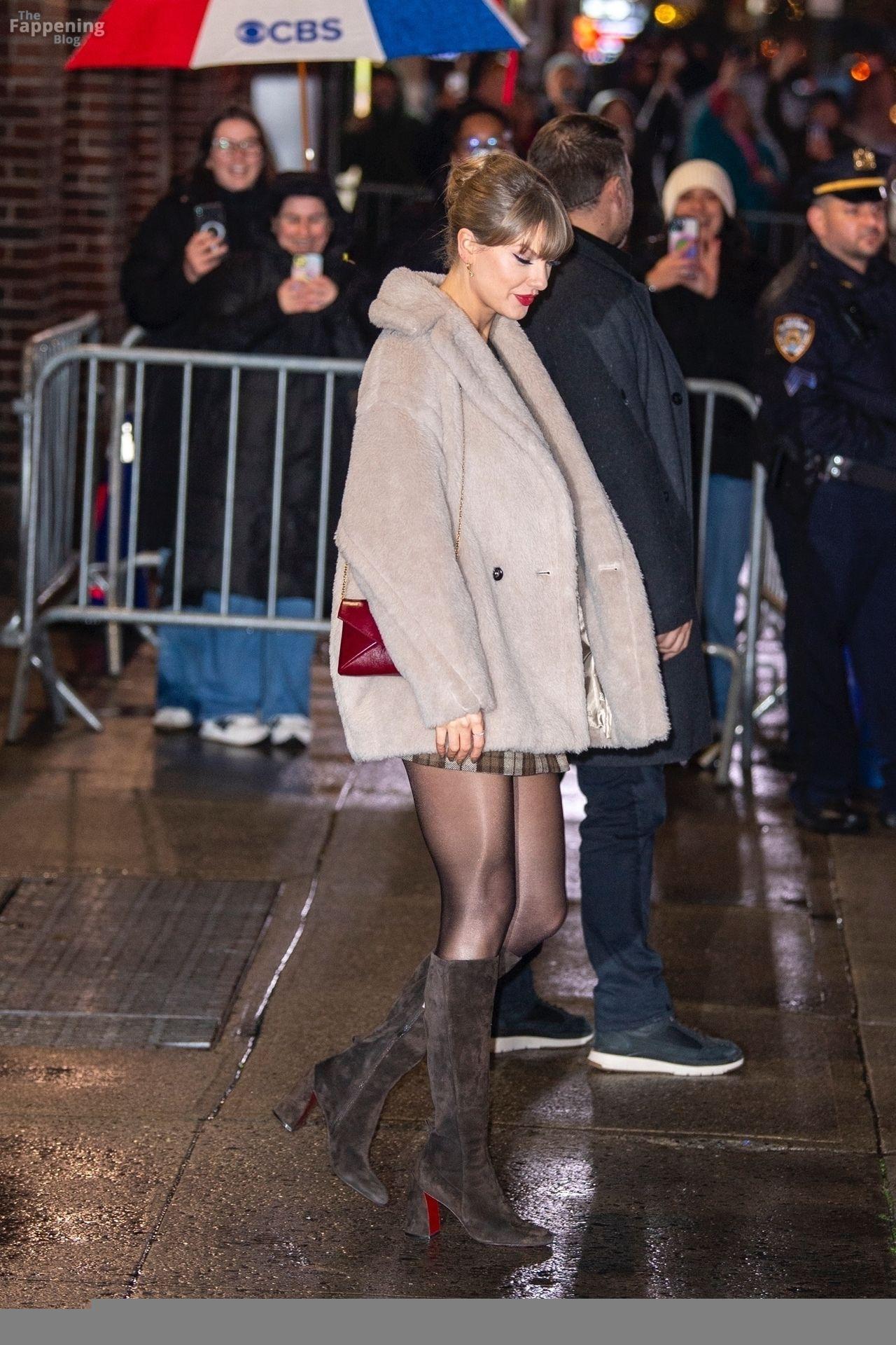 Tay‑Tay estuvo en NYC. Lució un mini vestido de cuadros y sin tirantes en Colbert – piernas y escote a la vista.