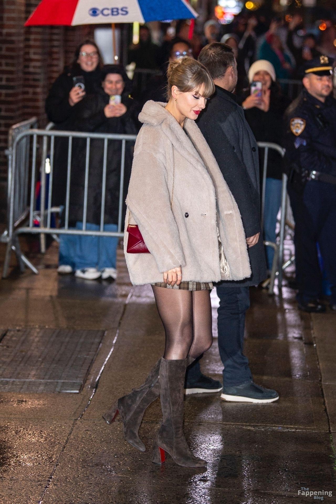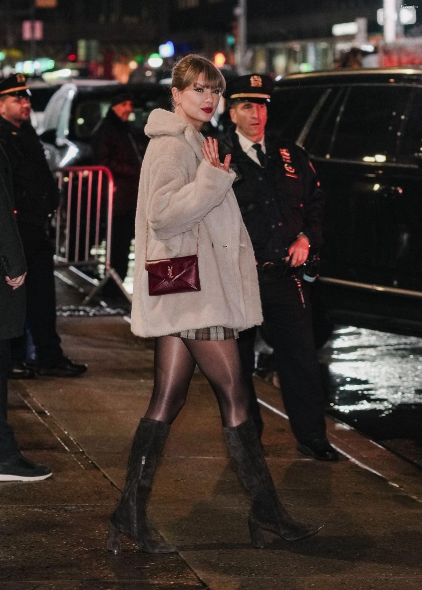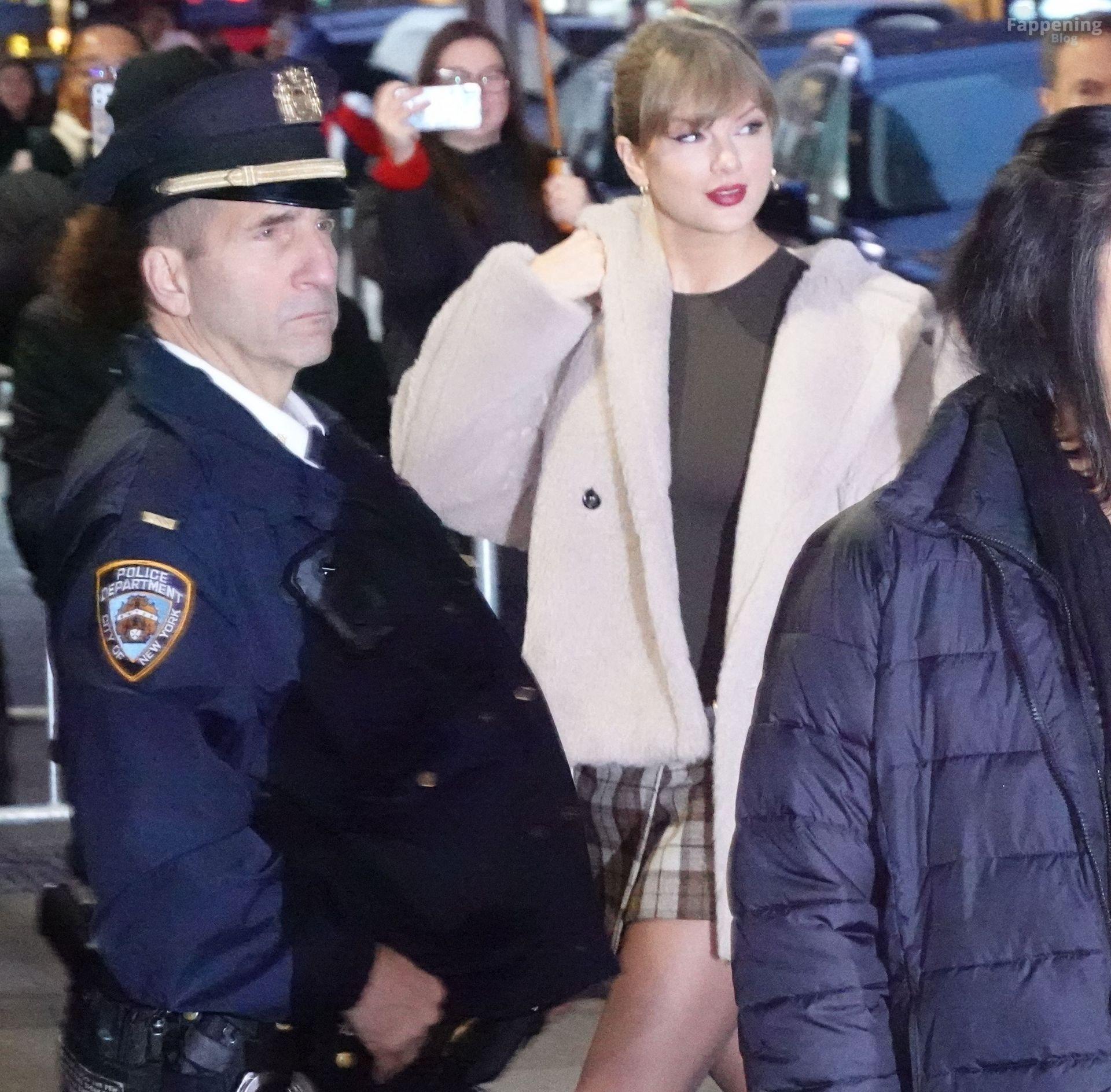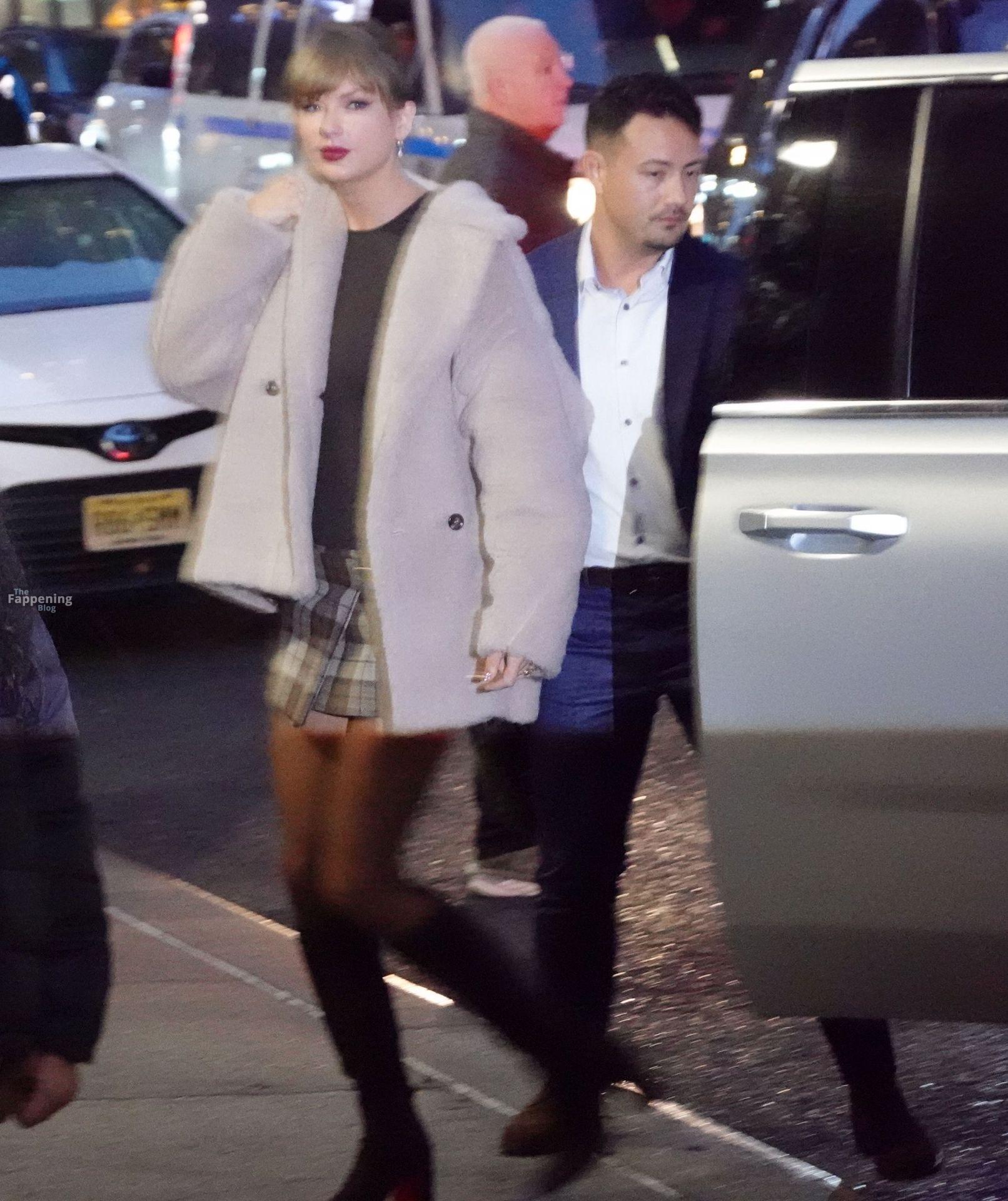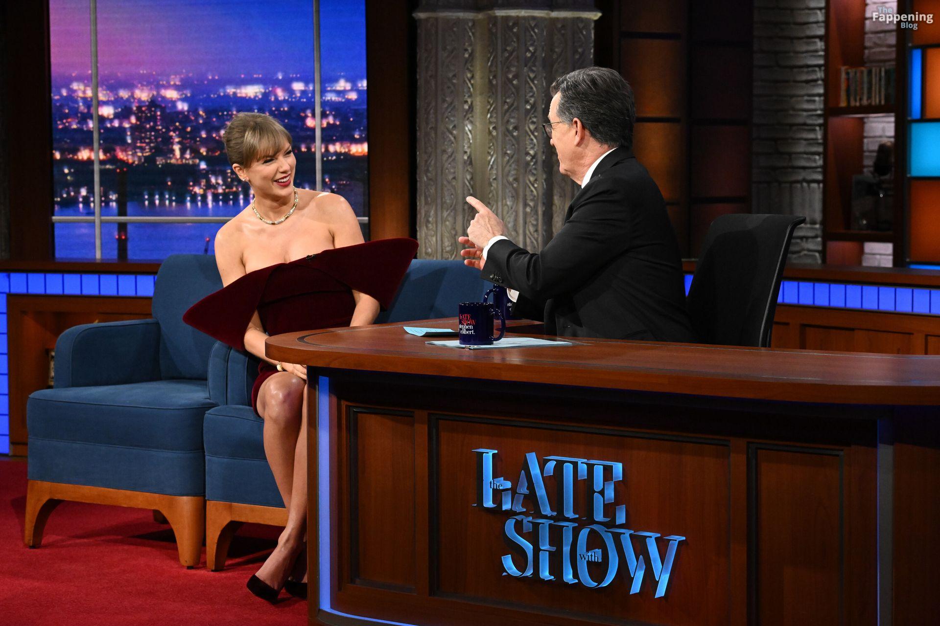 Tay‑Tay estuvo en NYC. Lució un mini vestido de cuadros y sin tirantes en Colbert – piernas y escote a la vista.