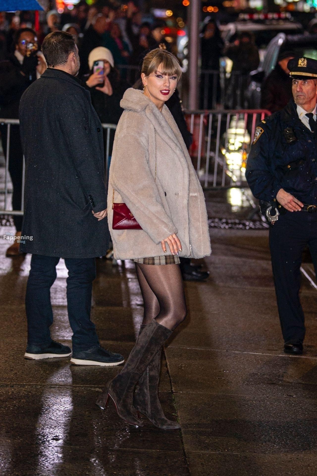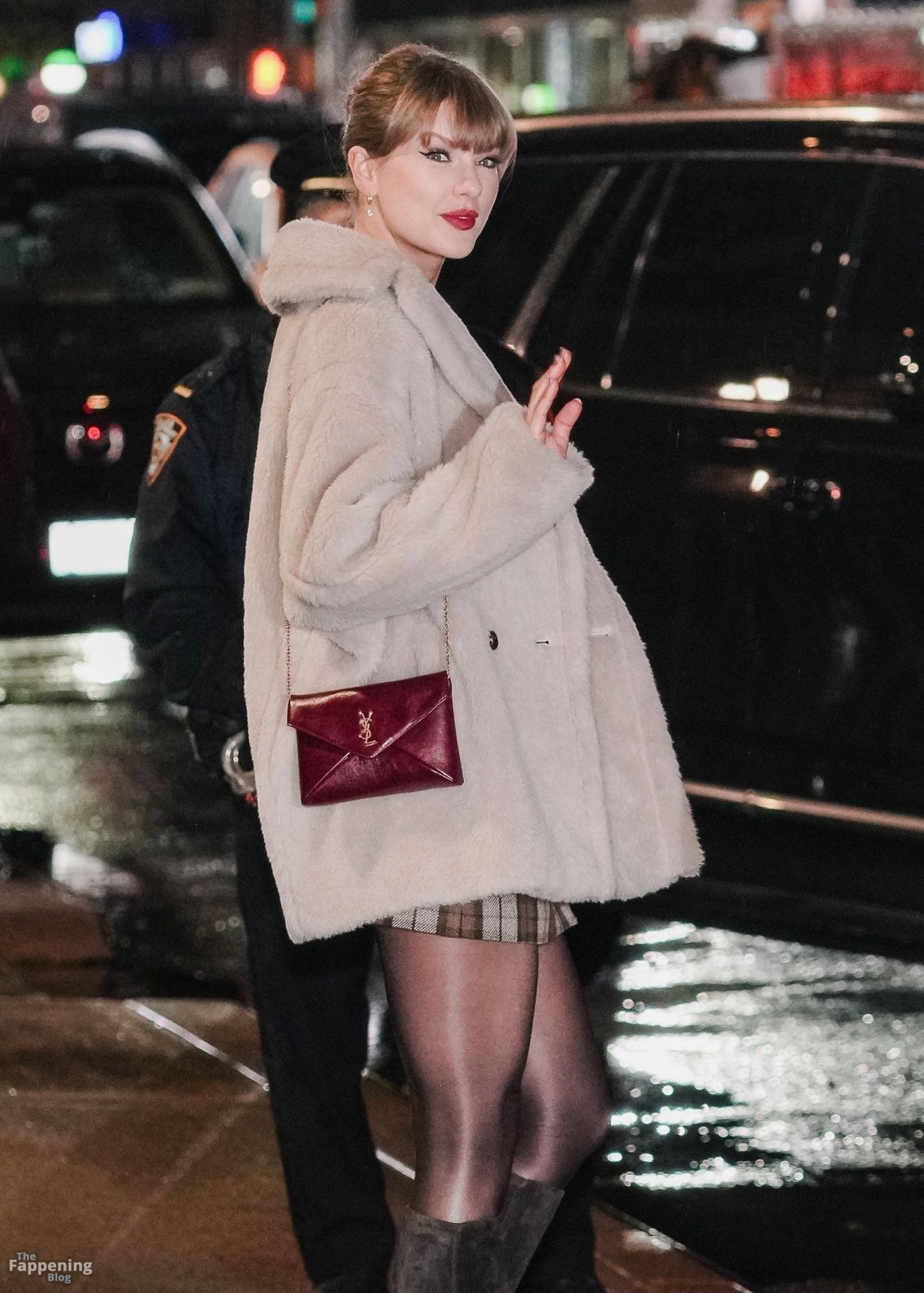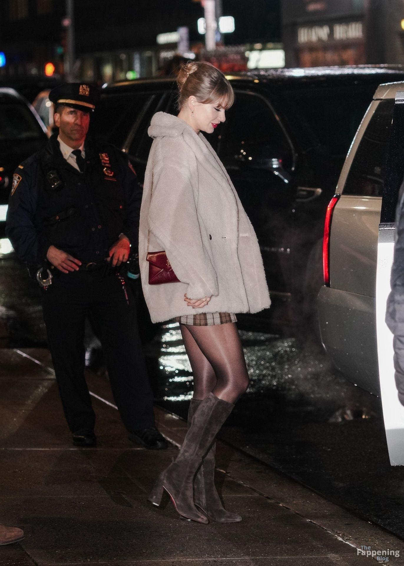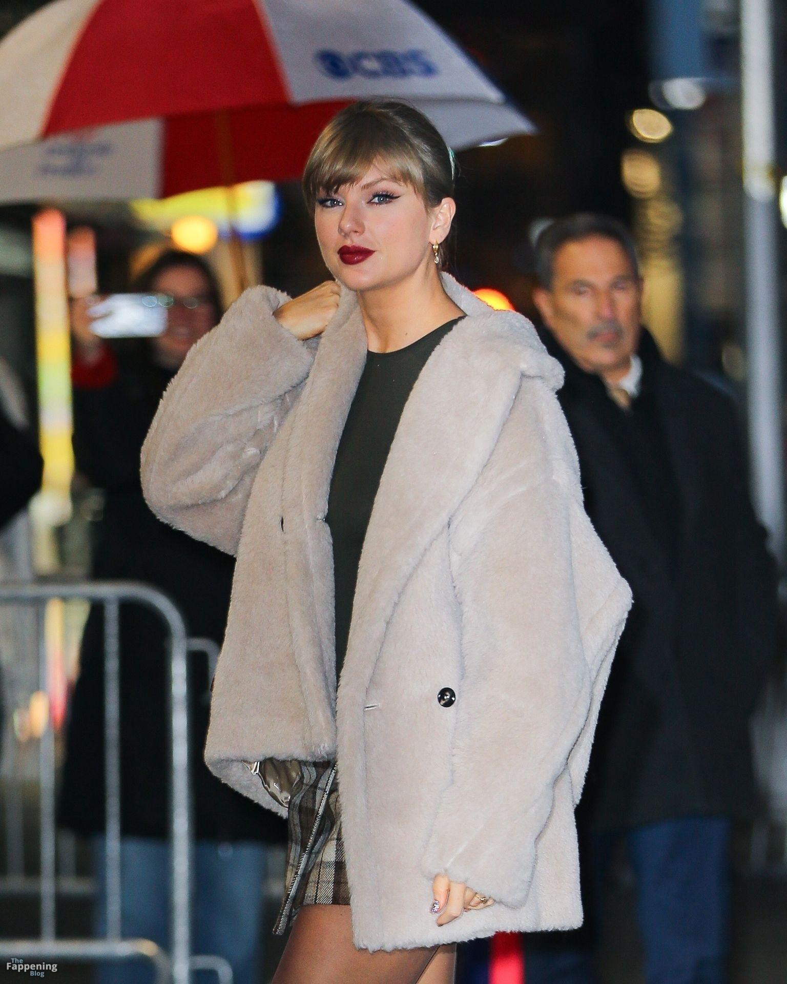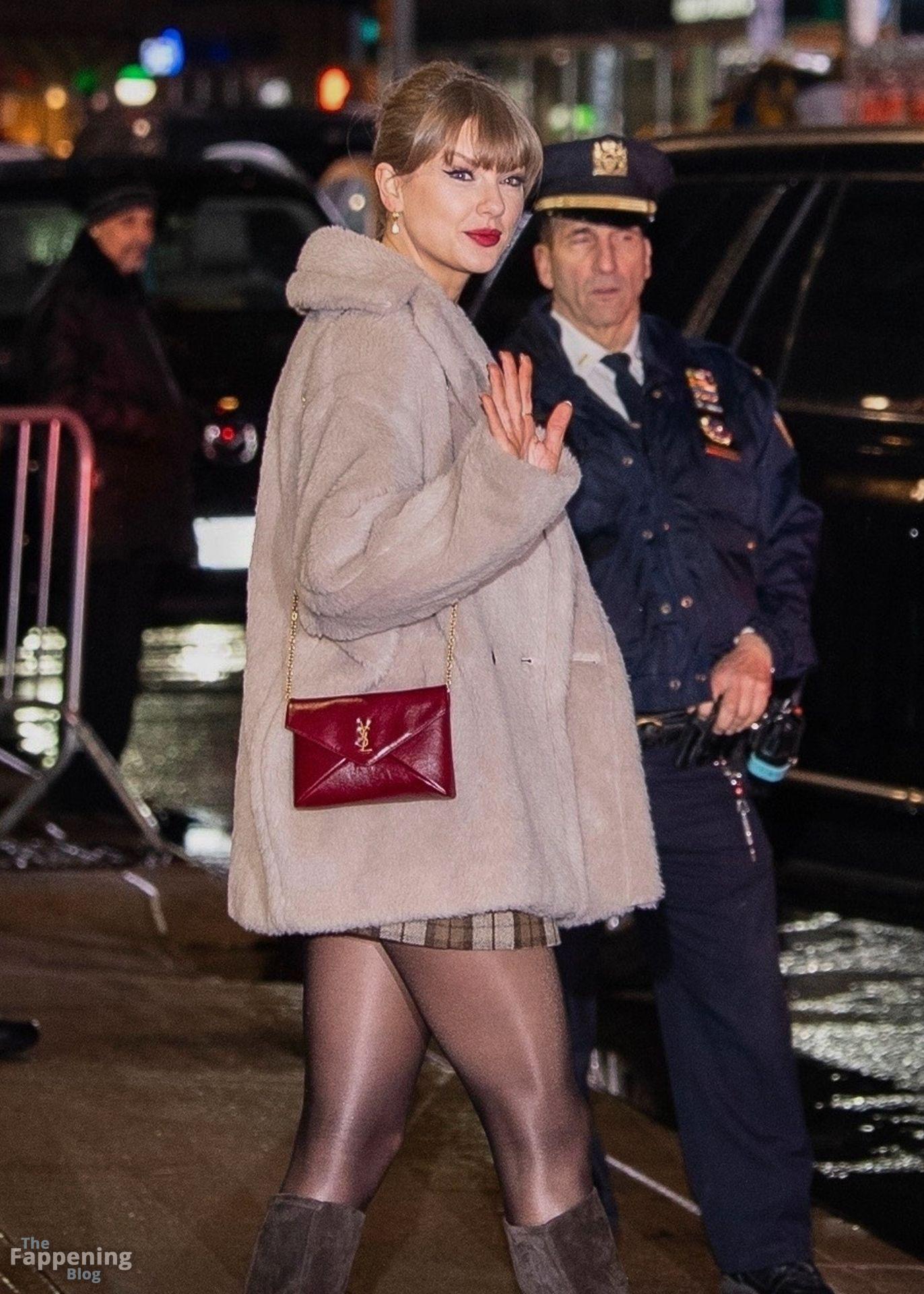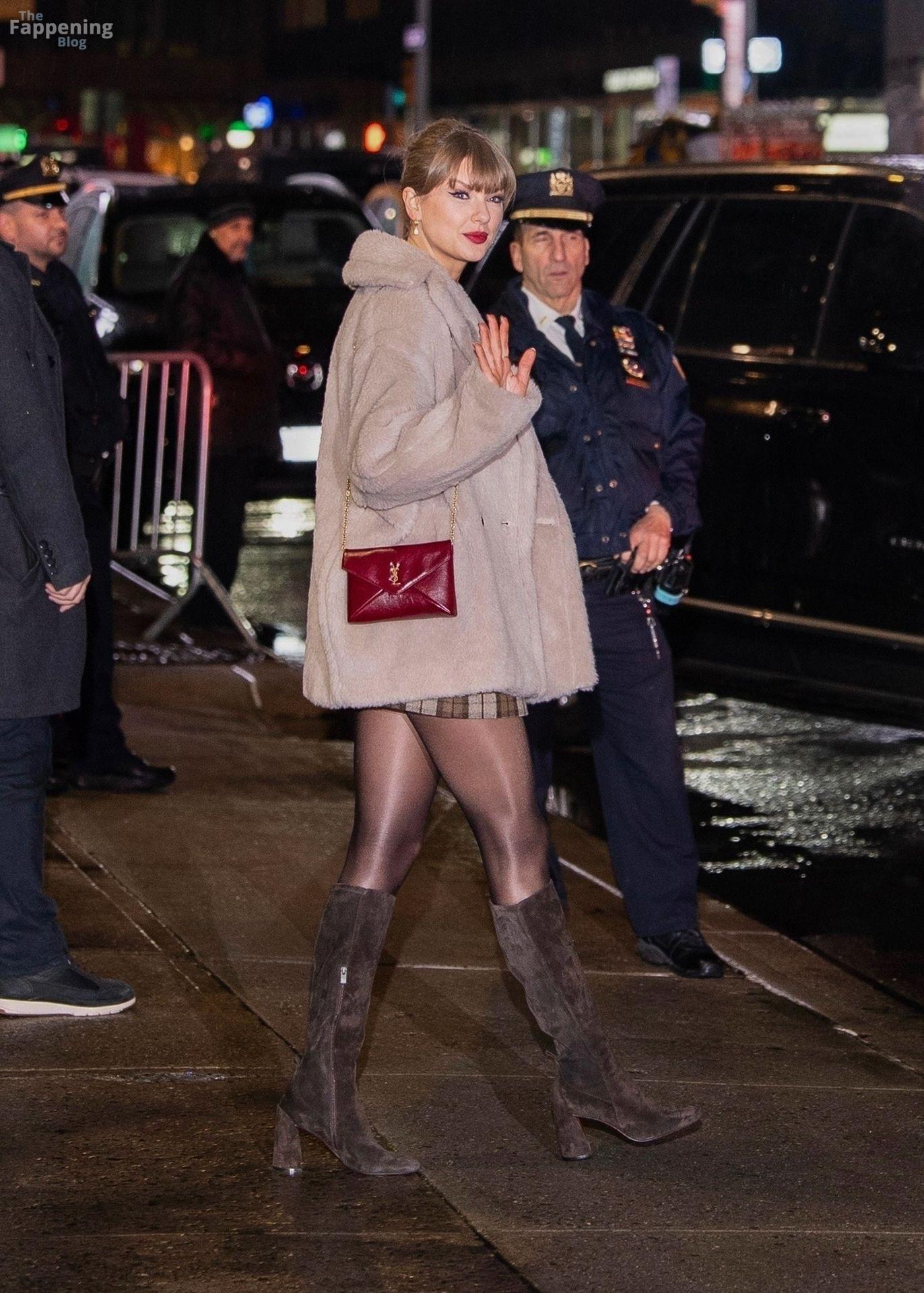 Tay‑Tay estuvo en NYC. Lució un mini vestido de cuadros y sin tirantes en Colbert – piernas y escote a la vista.