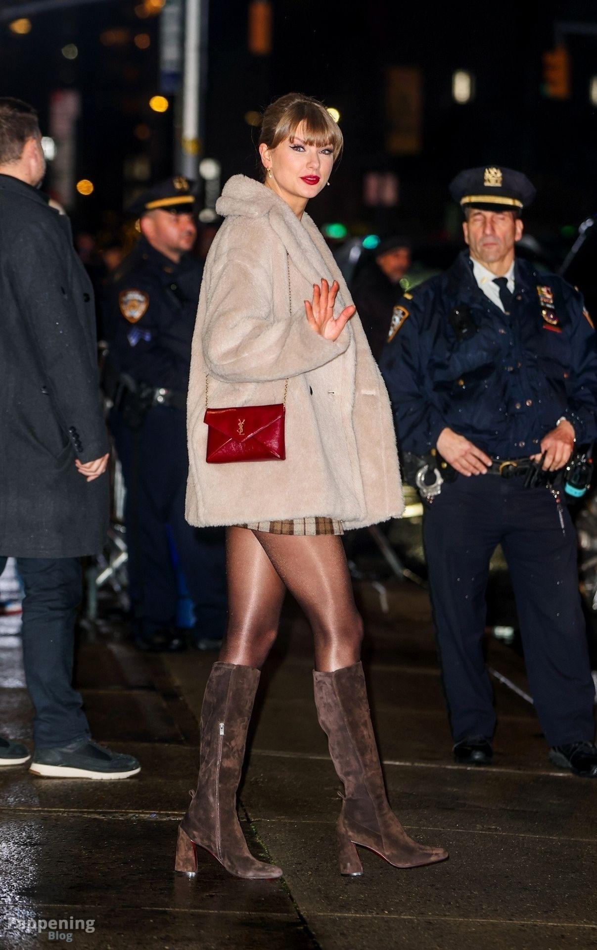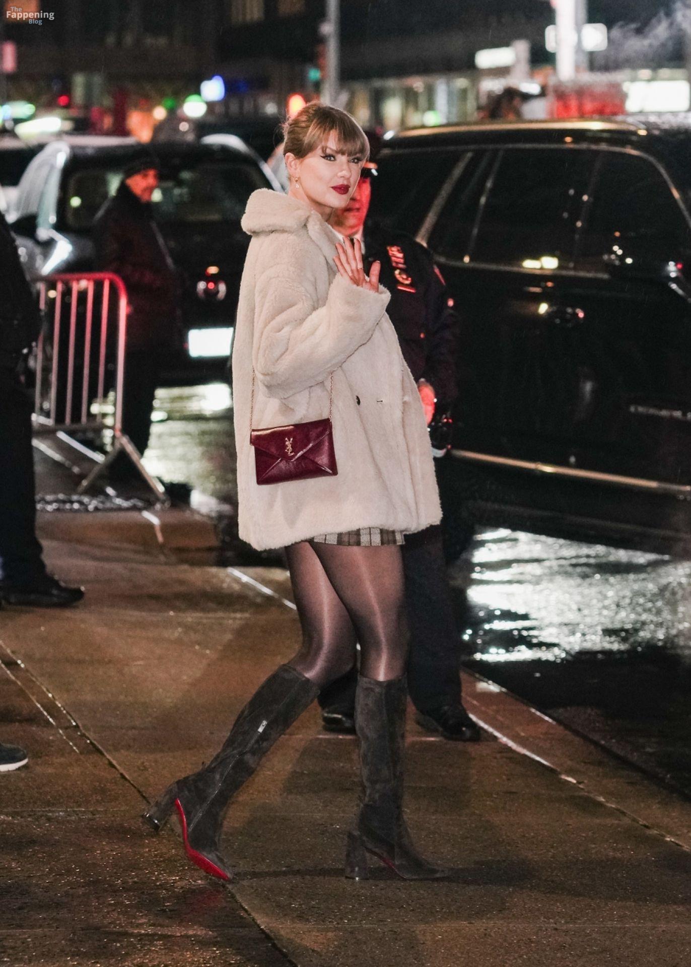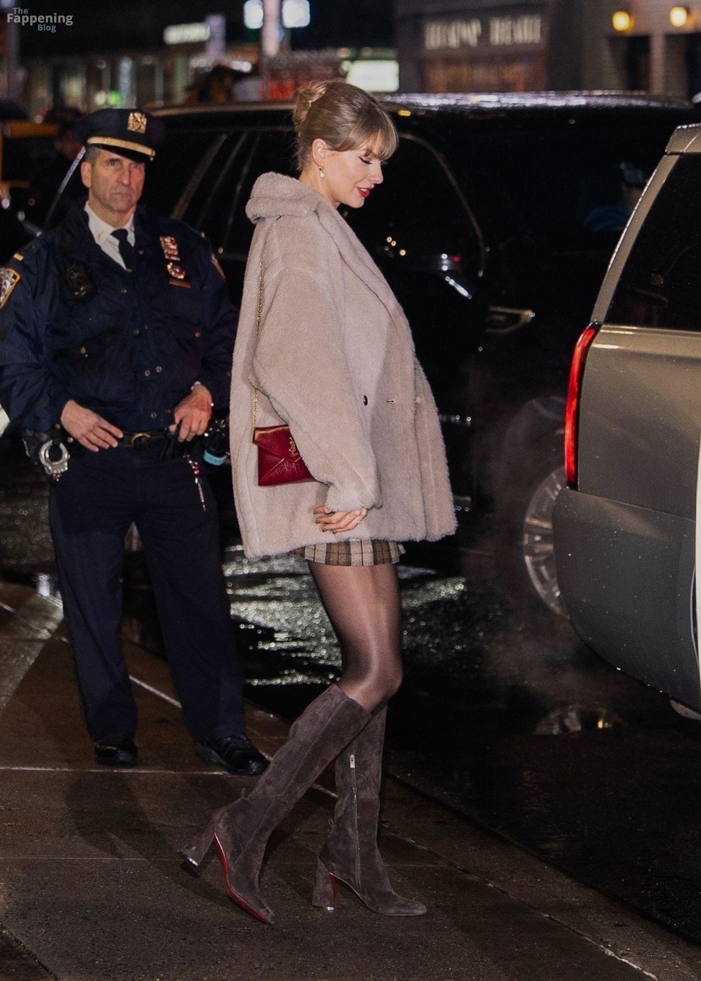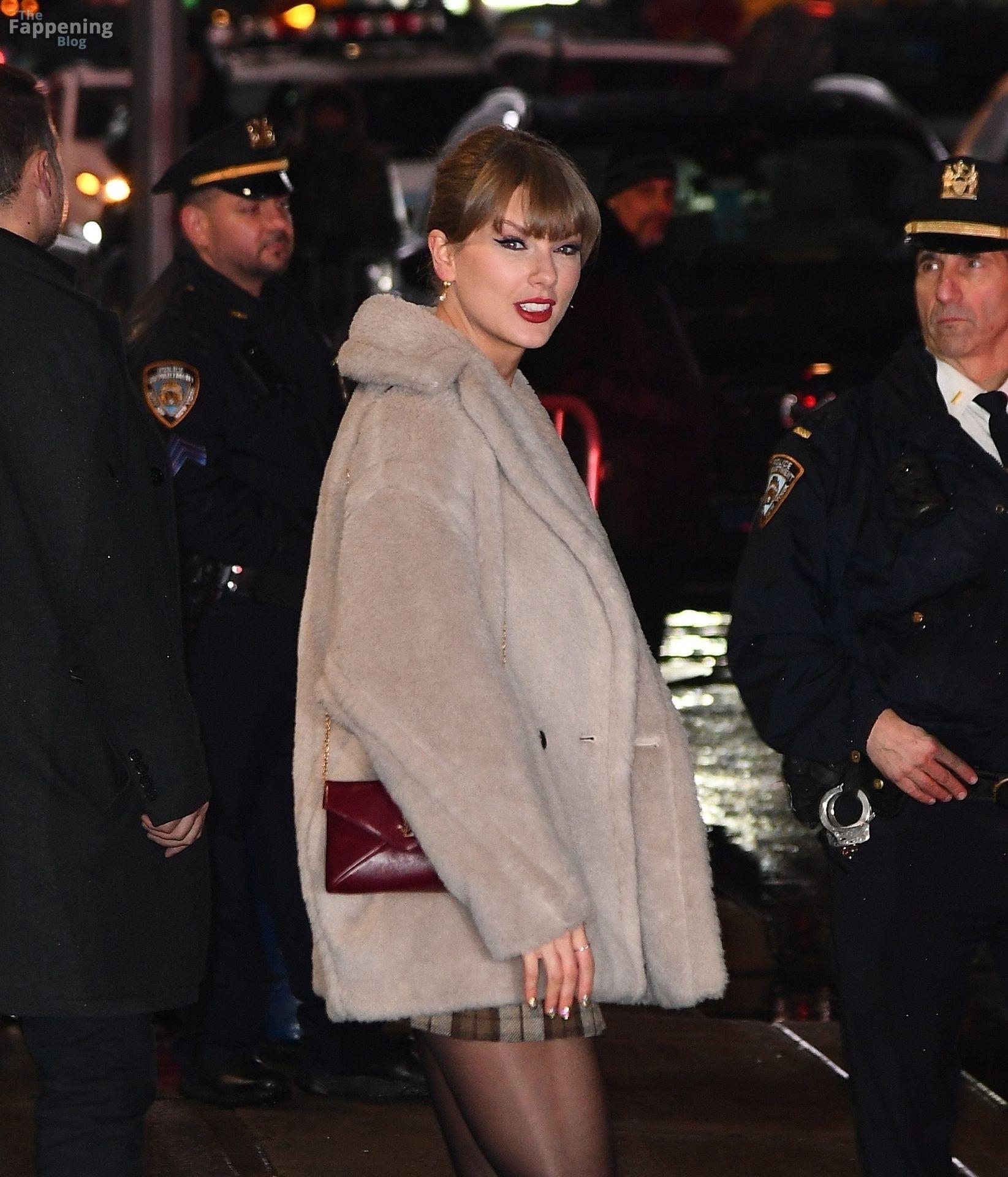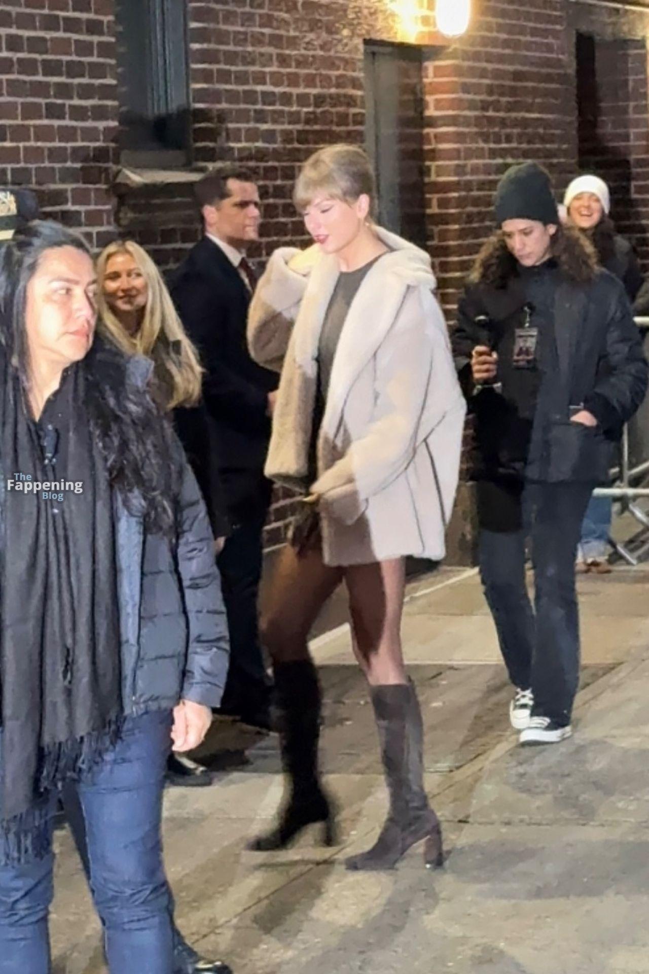 Tay‑Tay estuvo en NYC. Lució un mini vestido de cuadros y sin tirantes en Colbert – piernas y escote a la vista.