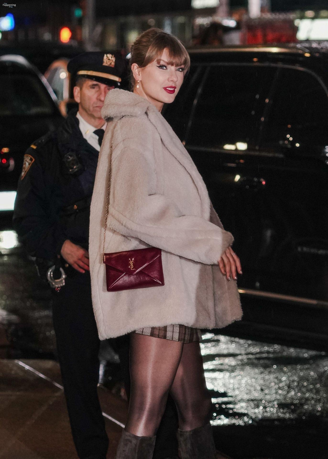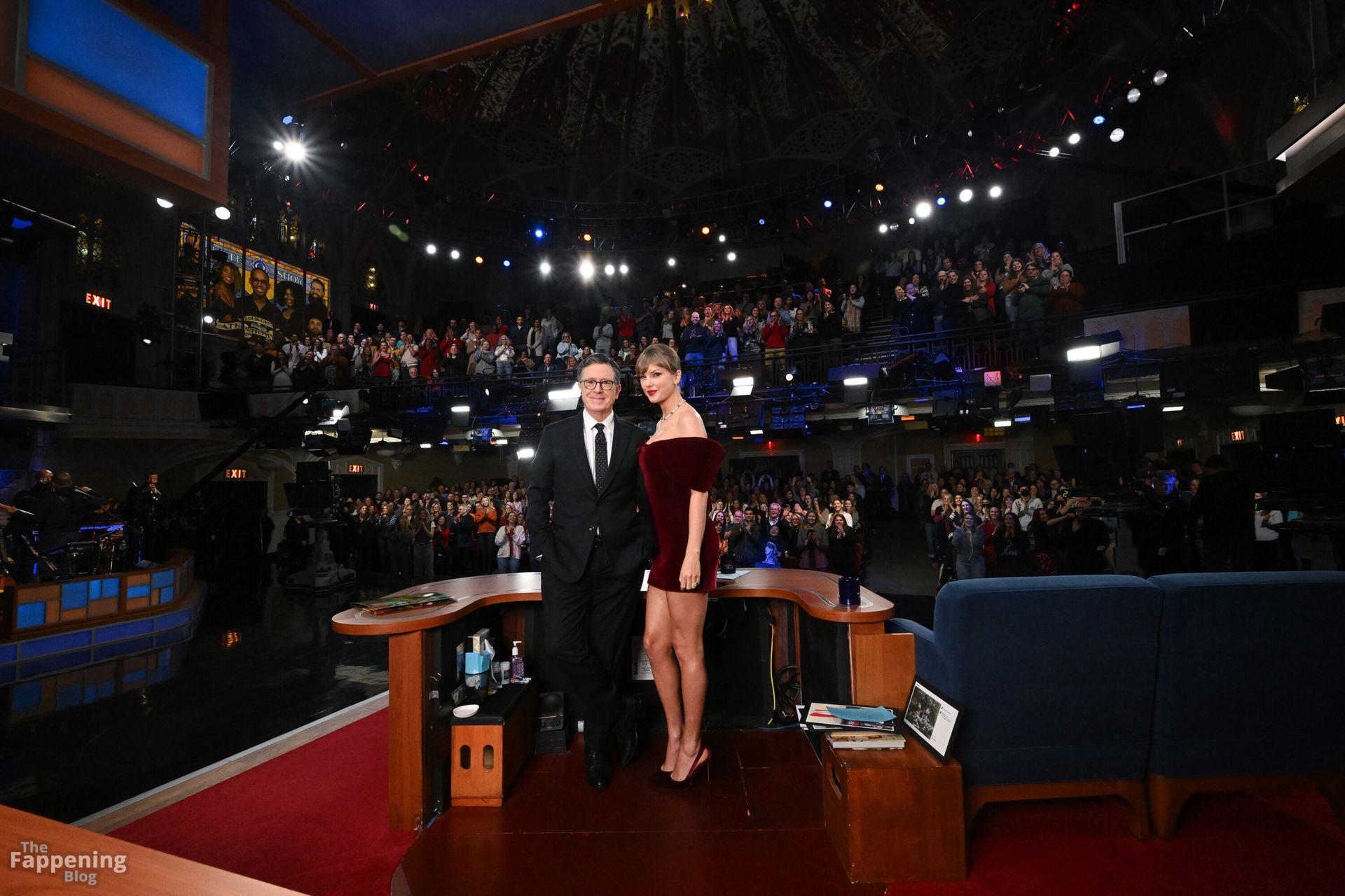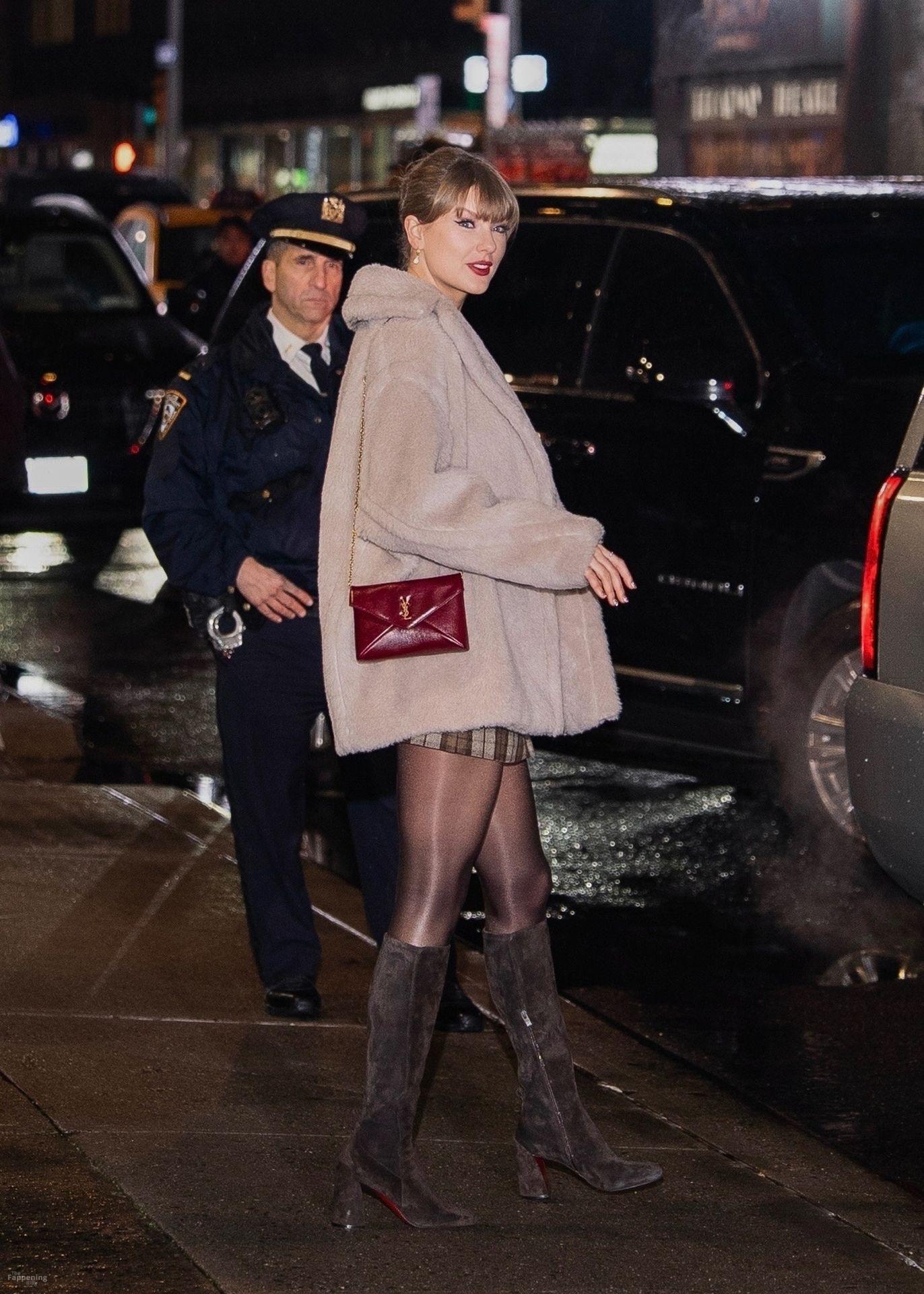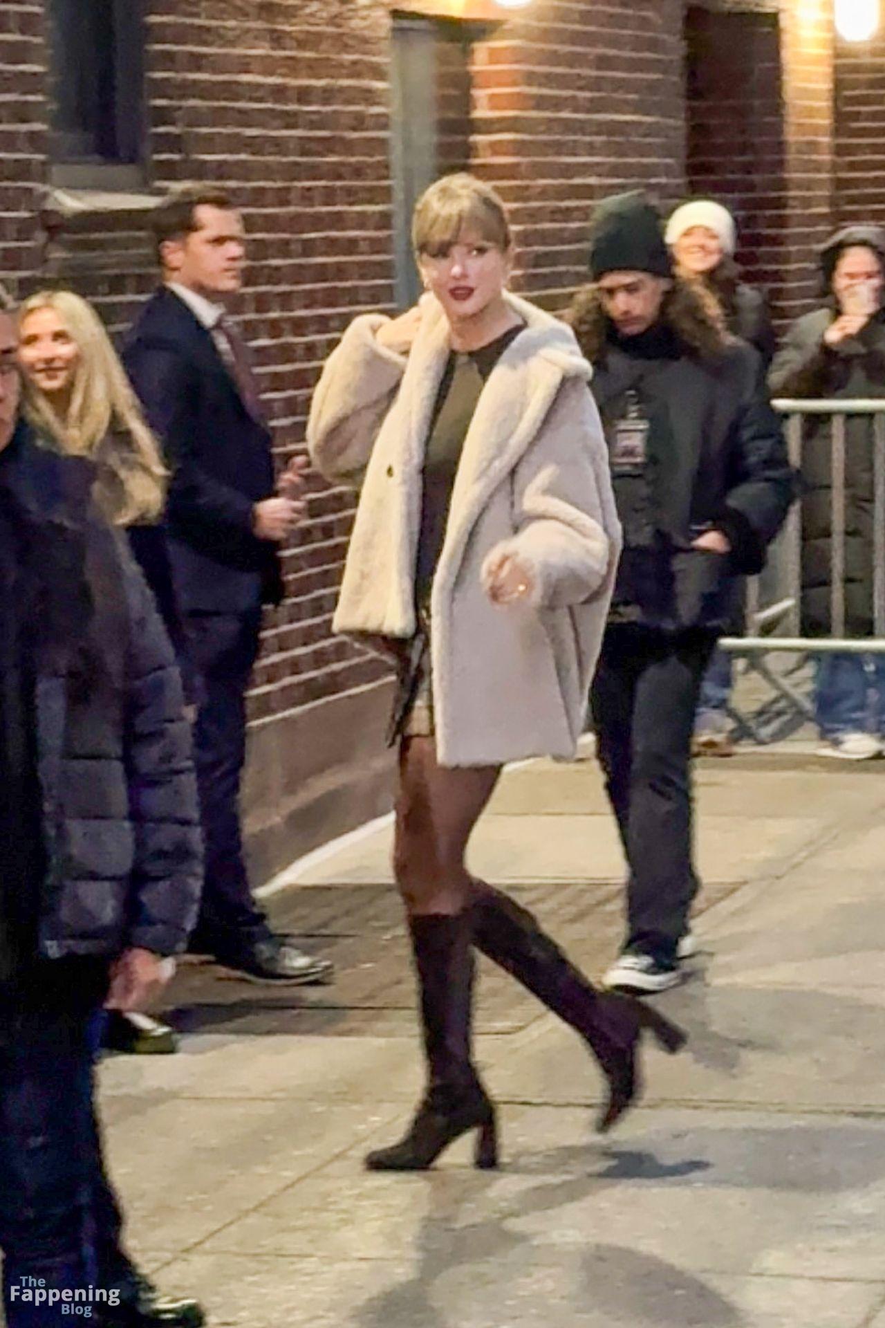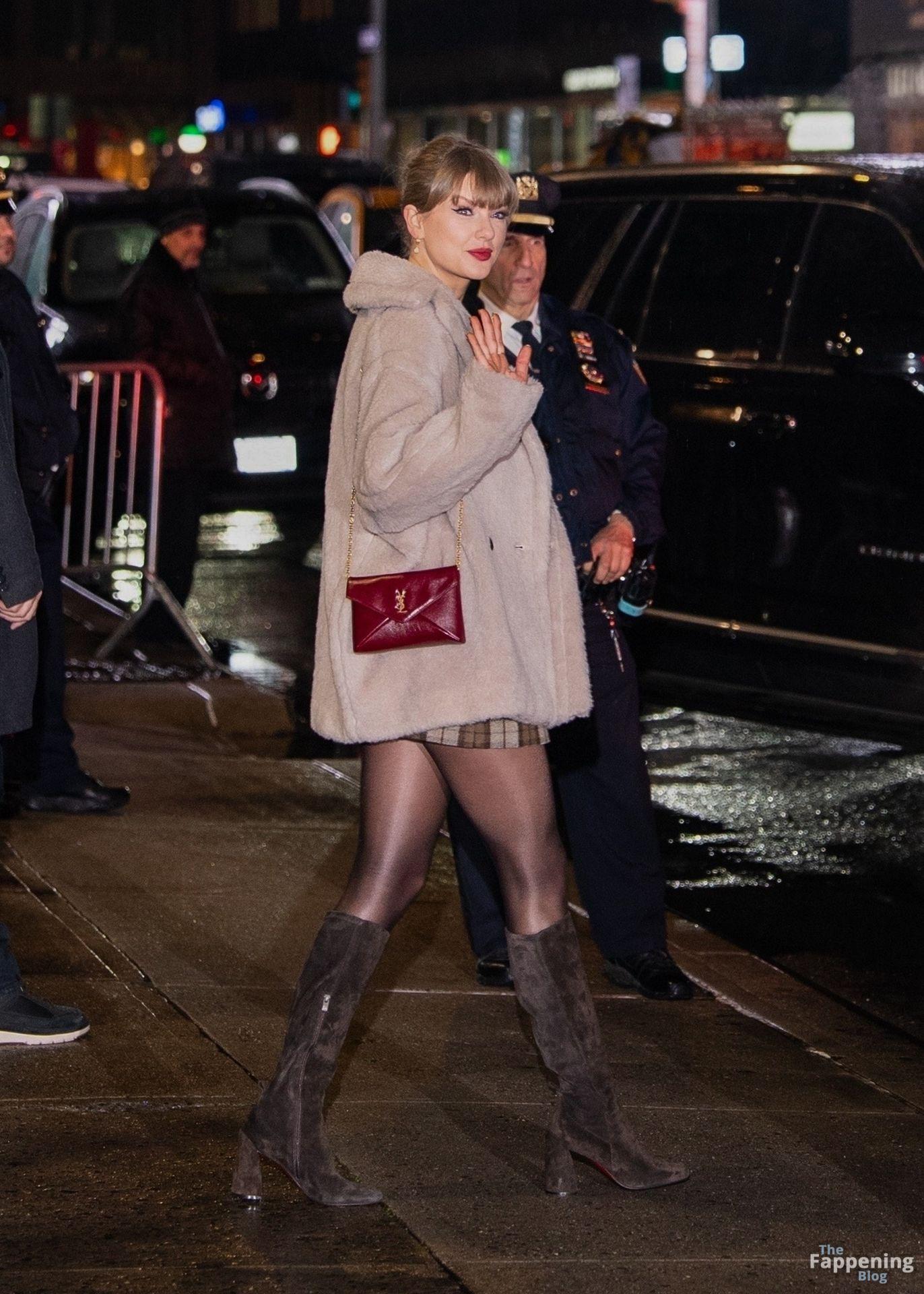 Tay‑Tay estuvo en NYC. Lució un mini vestido de cuadros y sin tirantes en Colbert – piernas y escote a la vista.