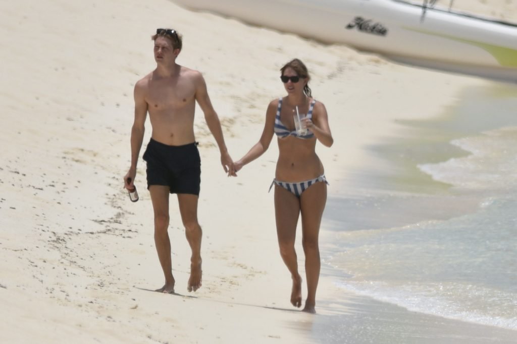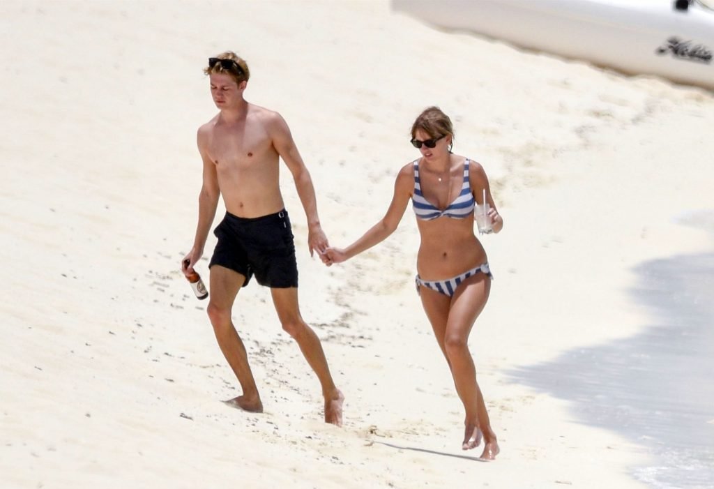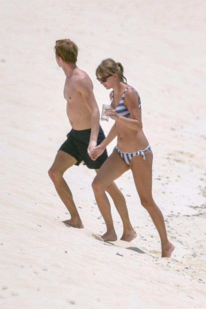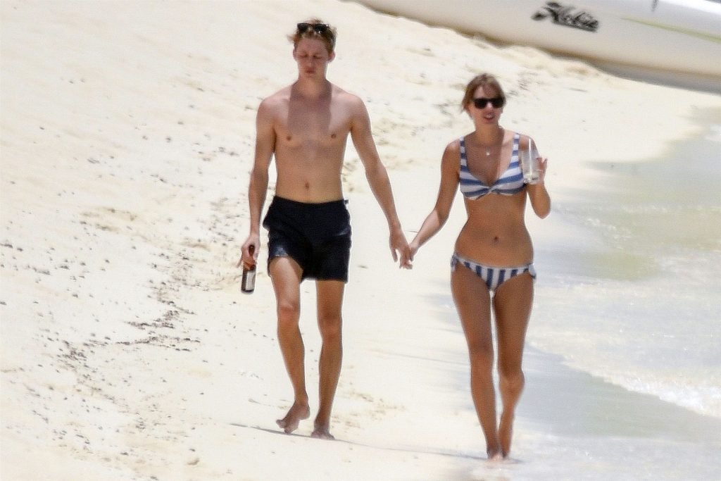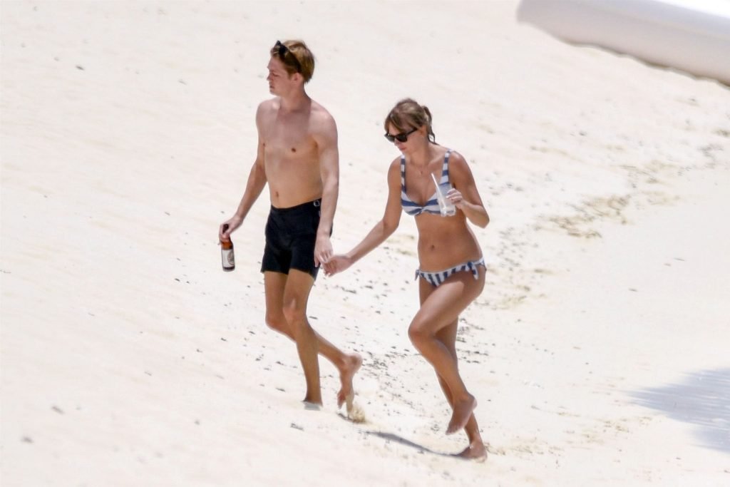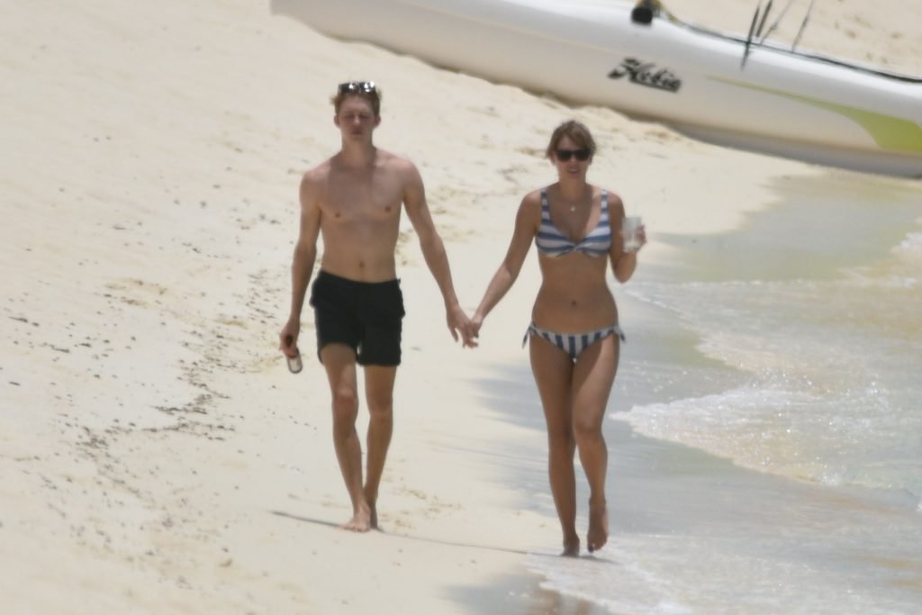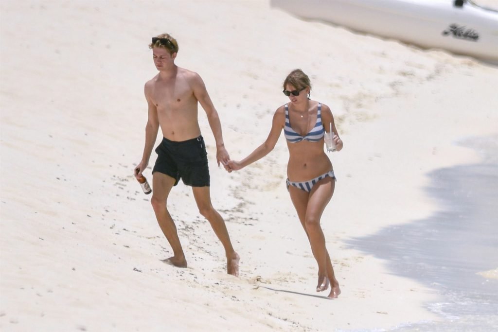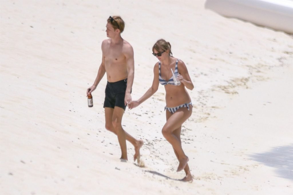 Taylor Swift y su pareja Joe Alwyn continúan su escapada romántica en un resort privado de lujo en Turks y Caicos, 07/05/2018. La pareja disfrutó de algunas bebidas en la playa mientras se tomaban de la mano después de darse un rápido baño en el océano. Taylor mostró su cuerpo tonificado con un bikini a rayas azul y blanco.