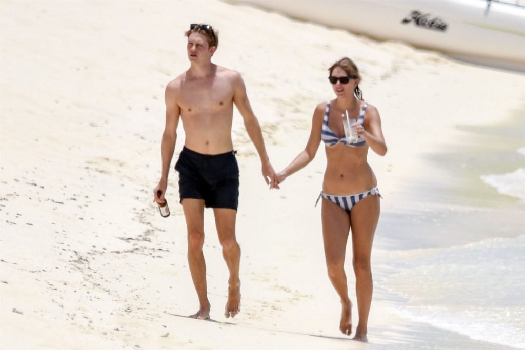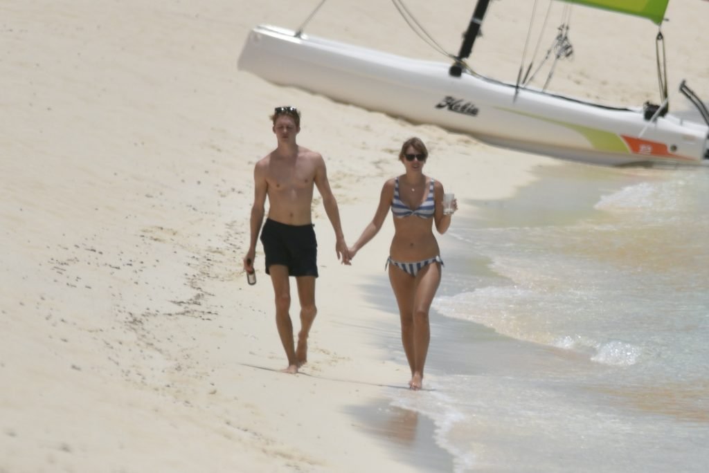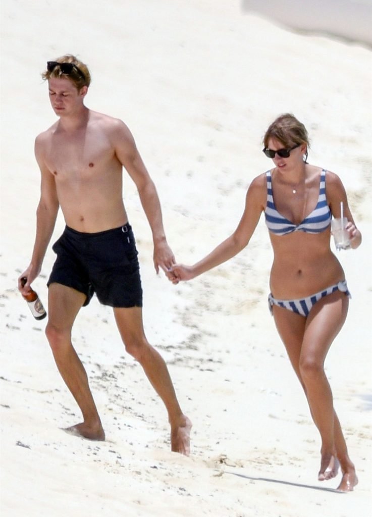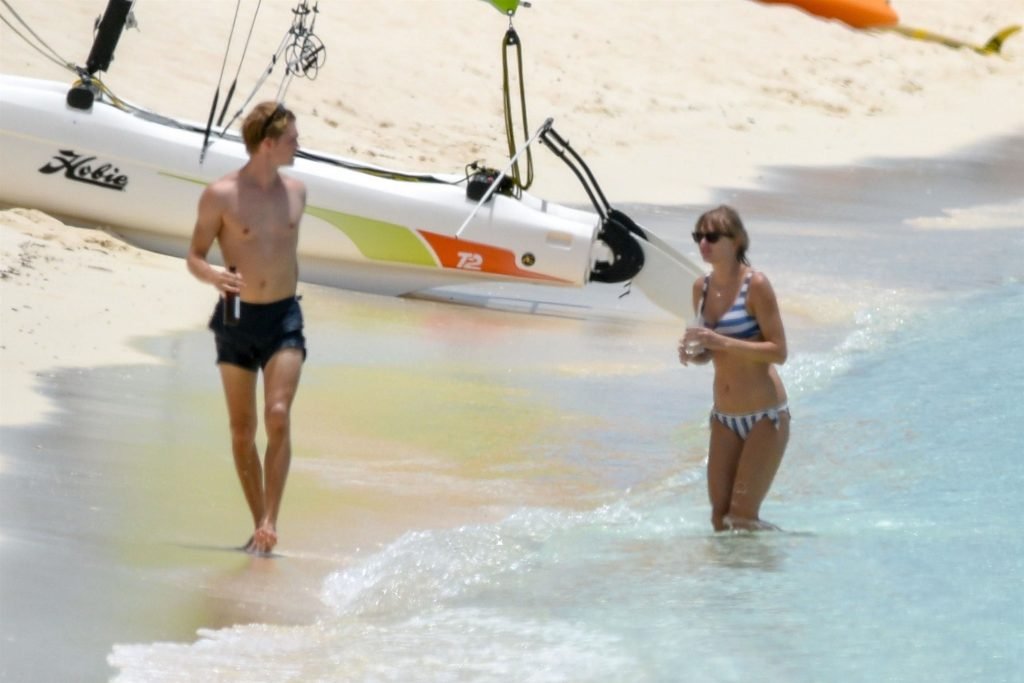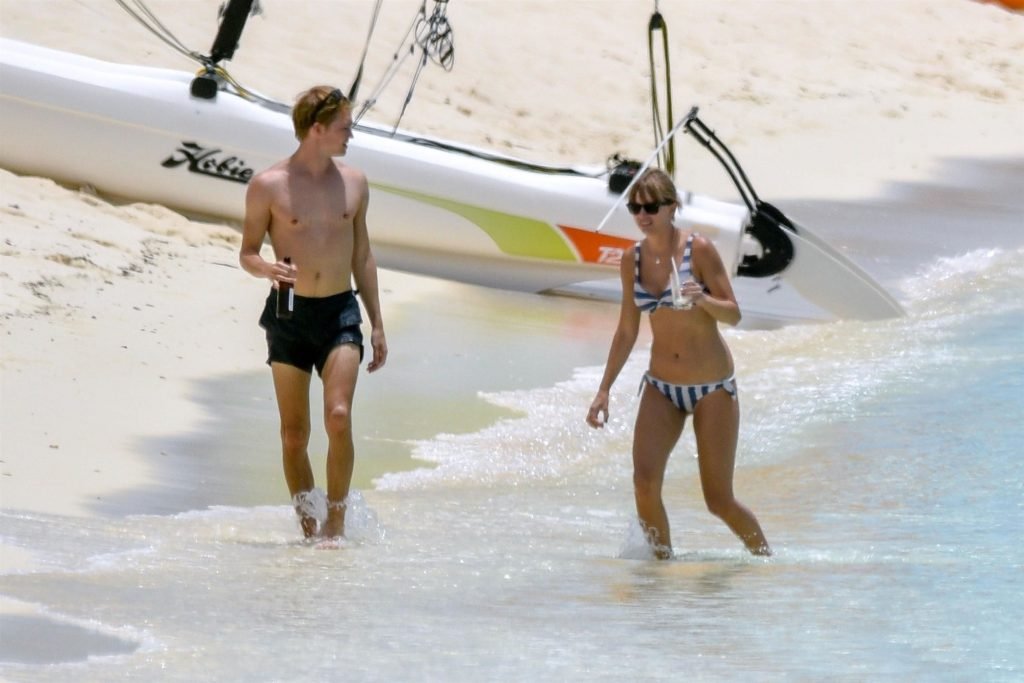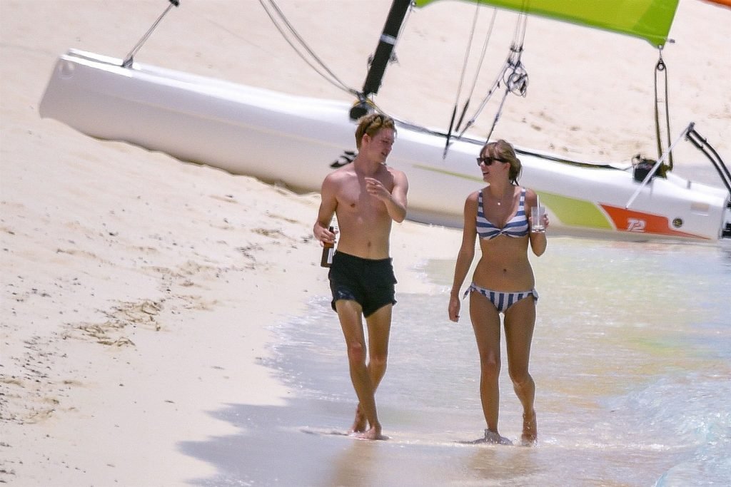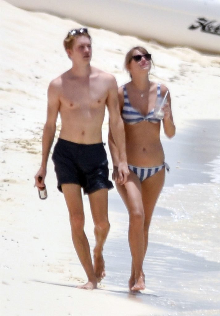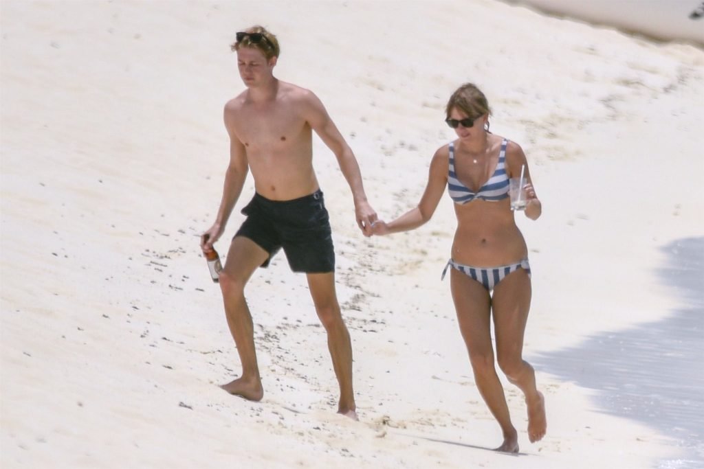 Taylor Swift y su pareja Joe Alwyn continúan su escapada romántica en un resort privado de lujo en Turks y Caicos, 07/05/2018. La pareja disfrutó de algunas bebidas en la playa mientras se tomaban de la mano después de darse un rápido baño en el océano. Taylor mostró su cuerpo tonificado con un bikini a rayas azul y blanco.