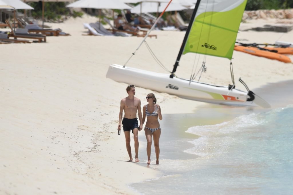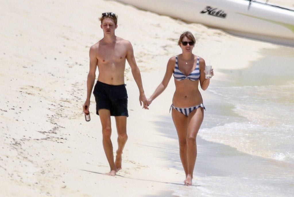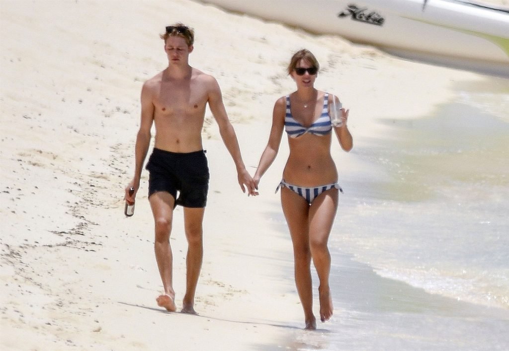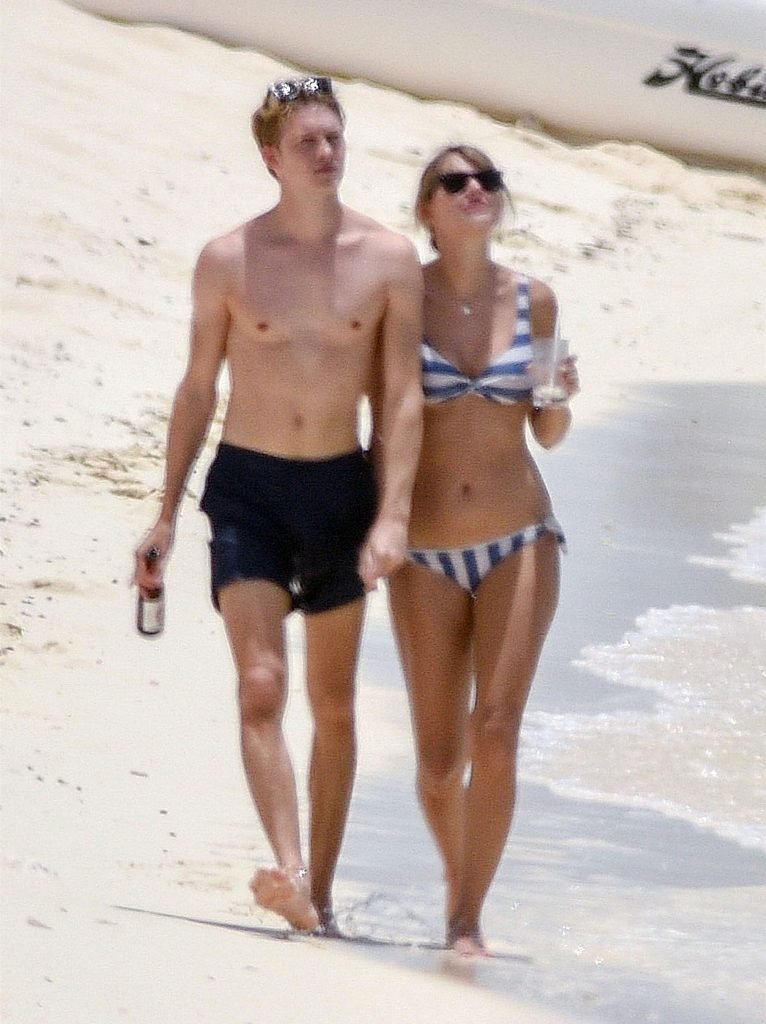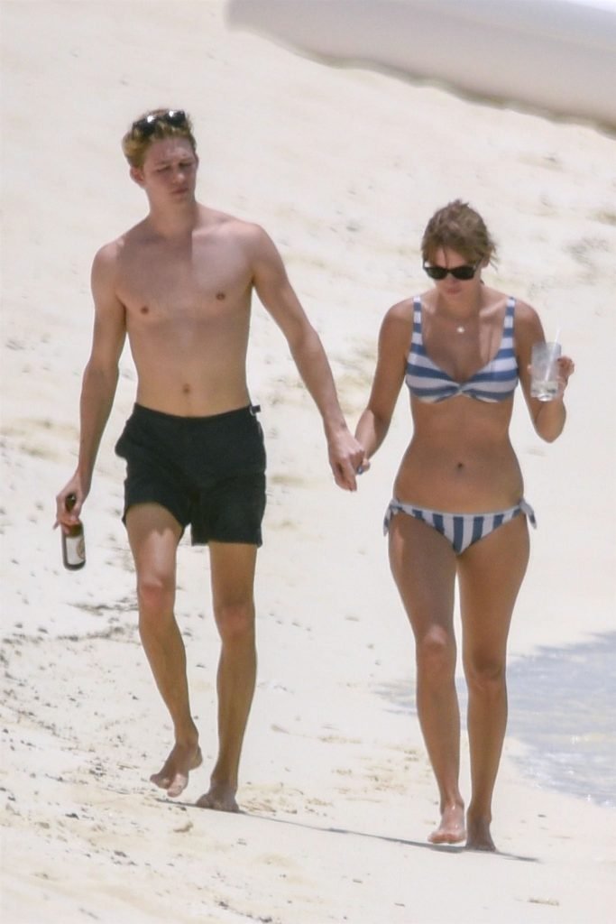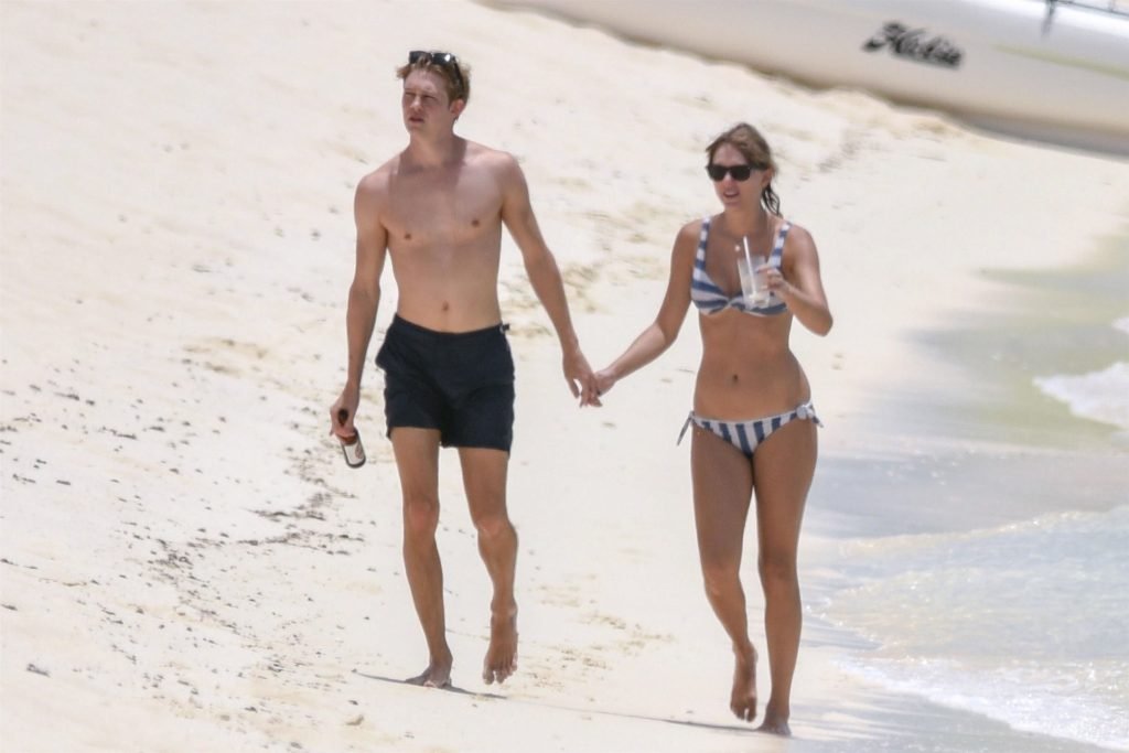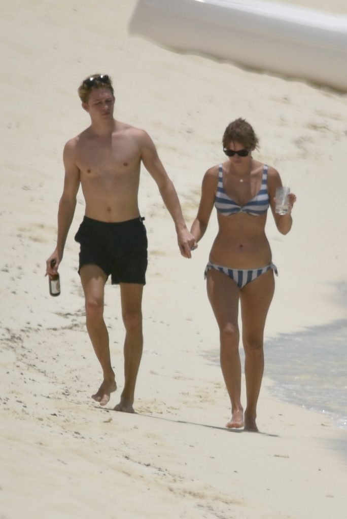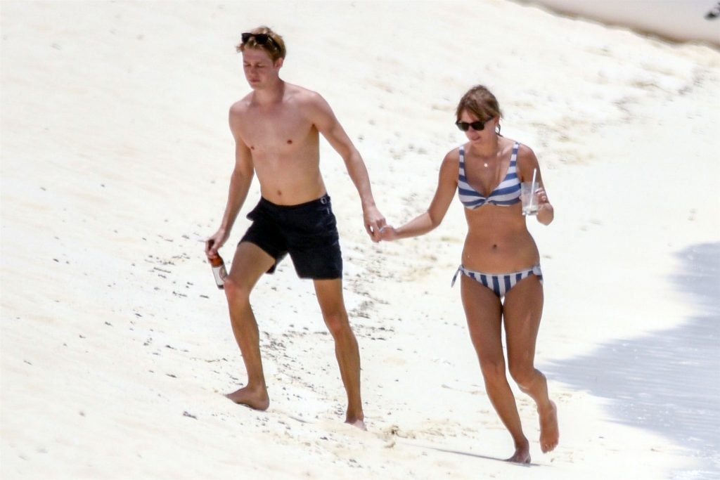 Taylor Swift y su pareja Joe Alwyn continúan su escapada romántica en un resort privado de lujo en Turks y Caicos, 07/05/2018. La pareja disfrutó de algunas bebidas en la playa mientras se tomaban de la mano después de darse un rápido baño en el océano. Taylor mostró su cuerpo tonificado con un bikini a rayas azul y blanco.