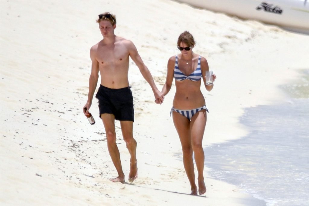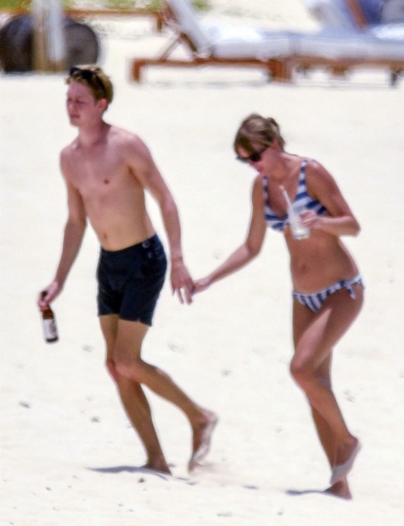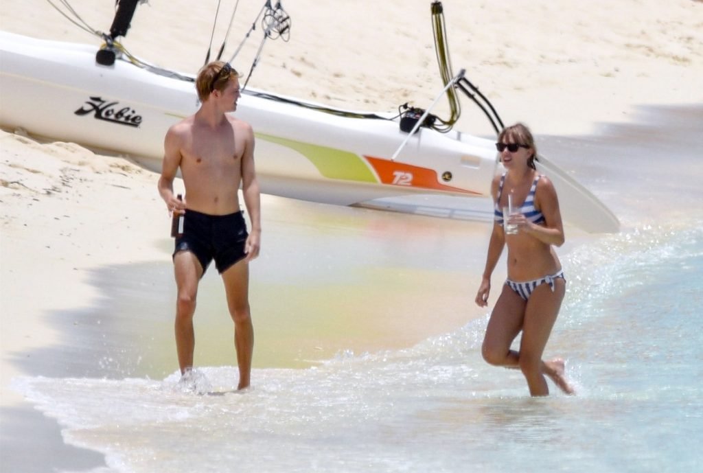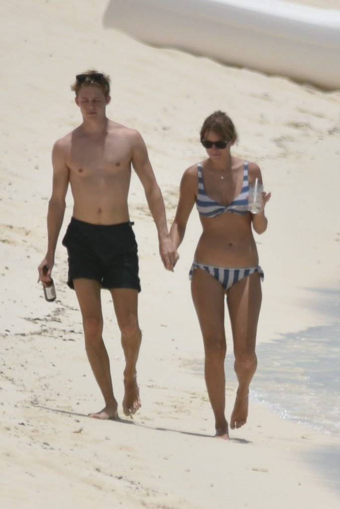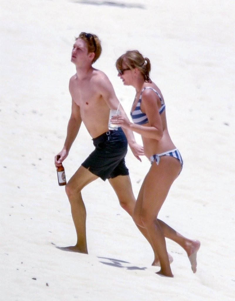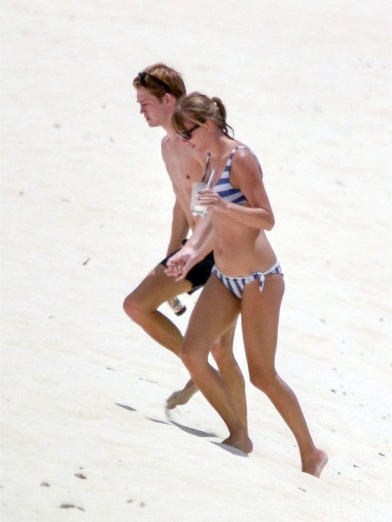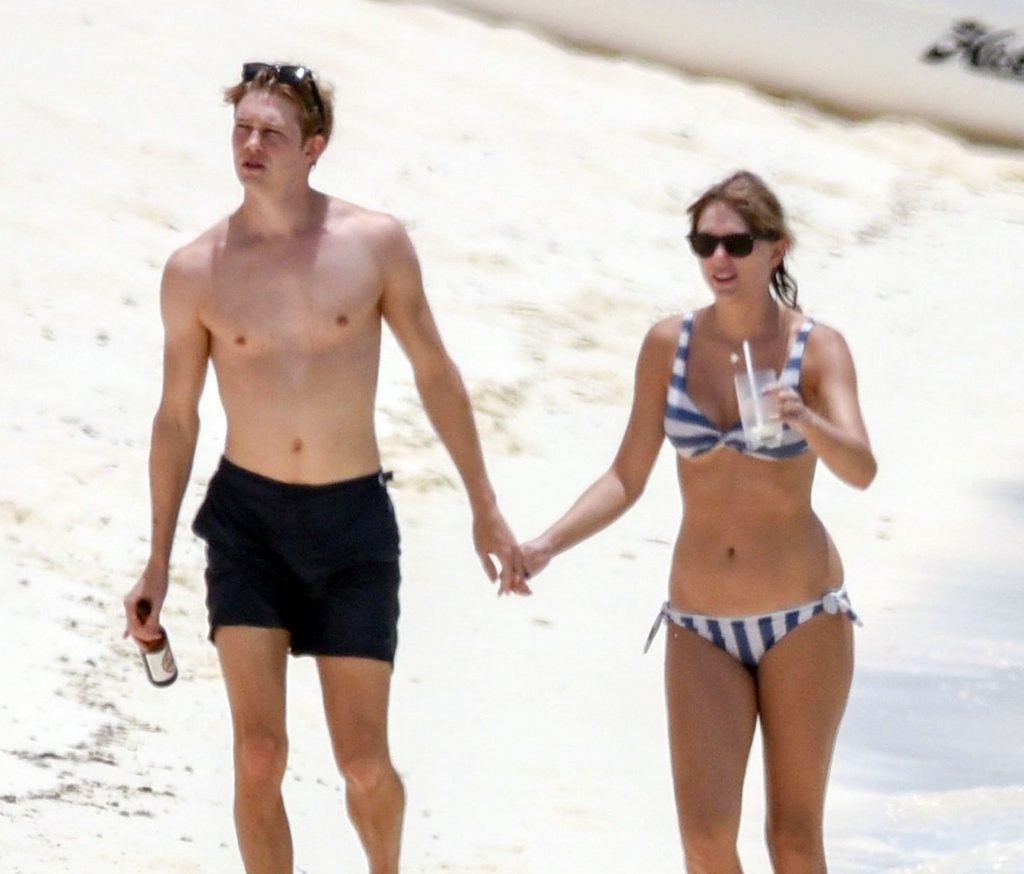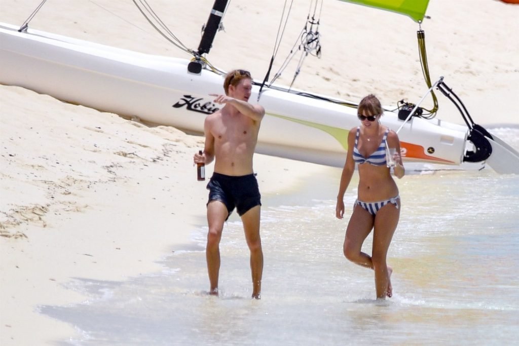 Taylor Swift y su pareja Joe Alwyn continúan su escapada romántica en un resort privado de lujo en Turks y Caicos, 07/05/2018. La pareja disfrutó de algunas bebidas en la playa mientras se tomaban de la mano después de darse un rápido baño en el océano. Taylor mostró su cuerpo tonificado con un bikini a rayas azul y blanco.