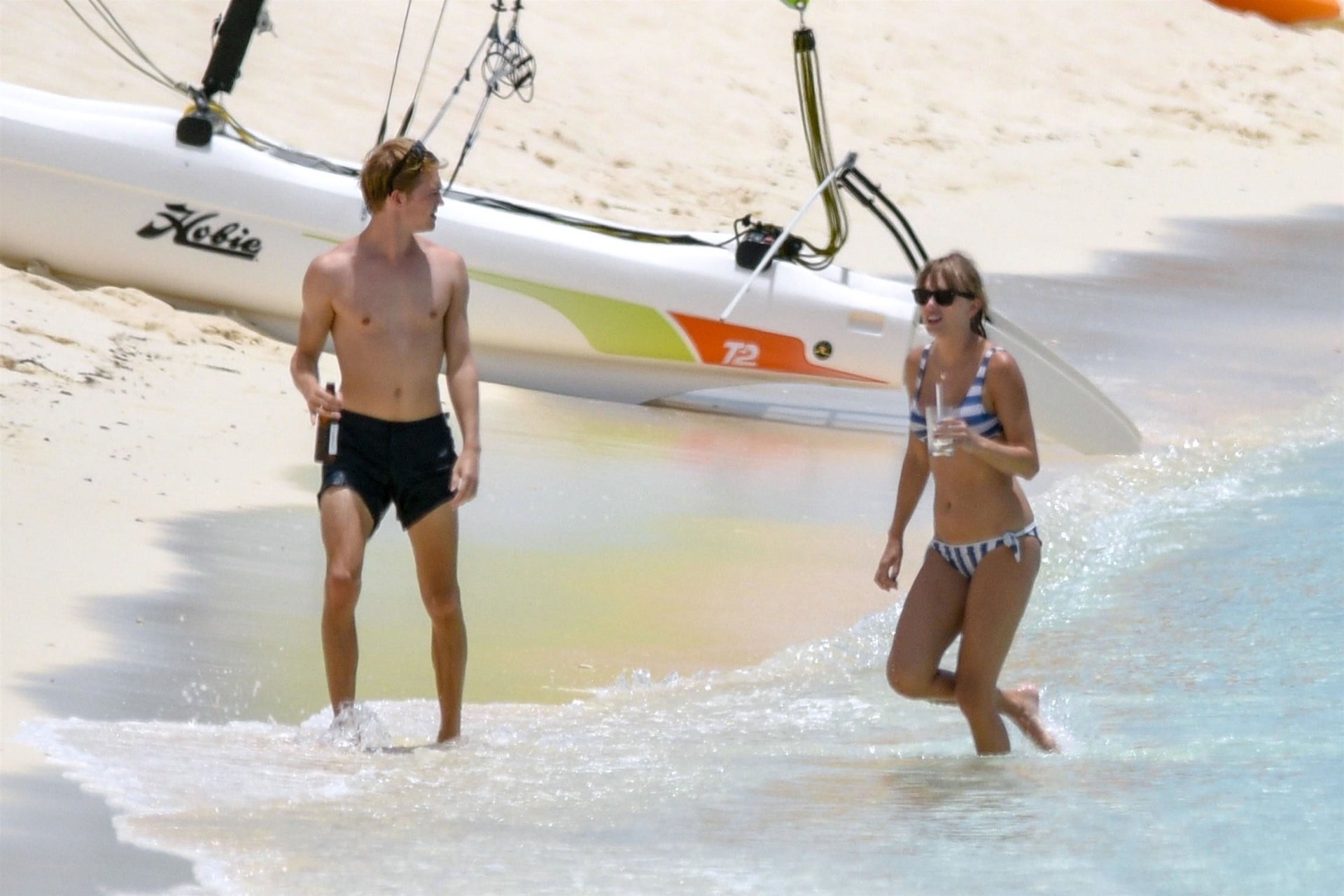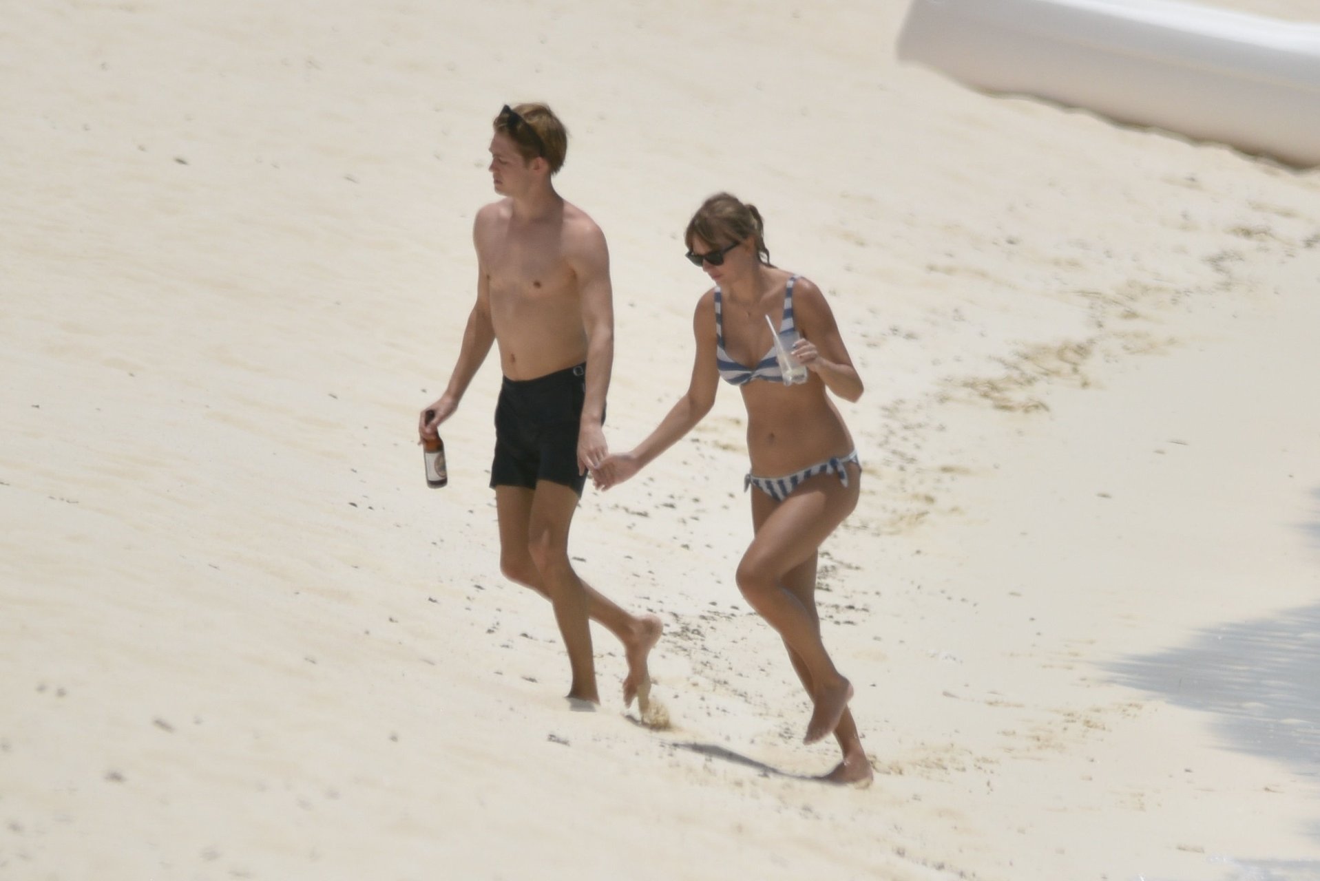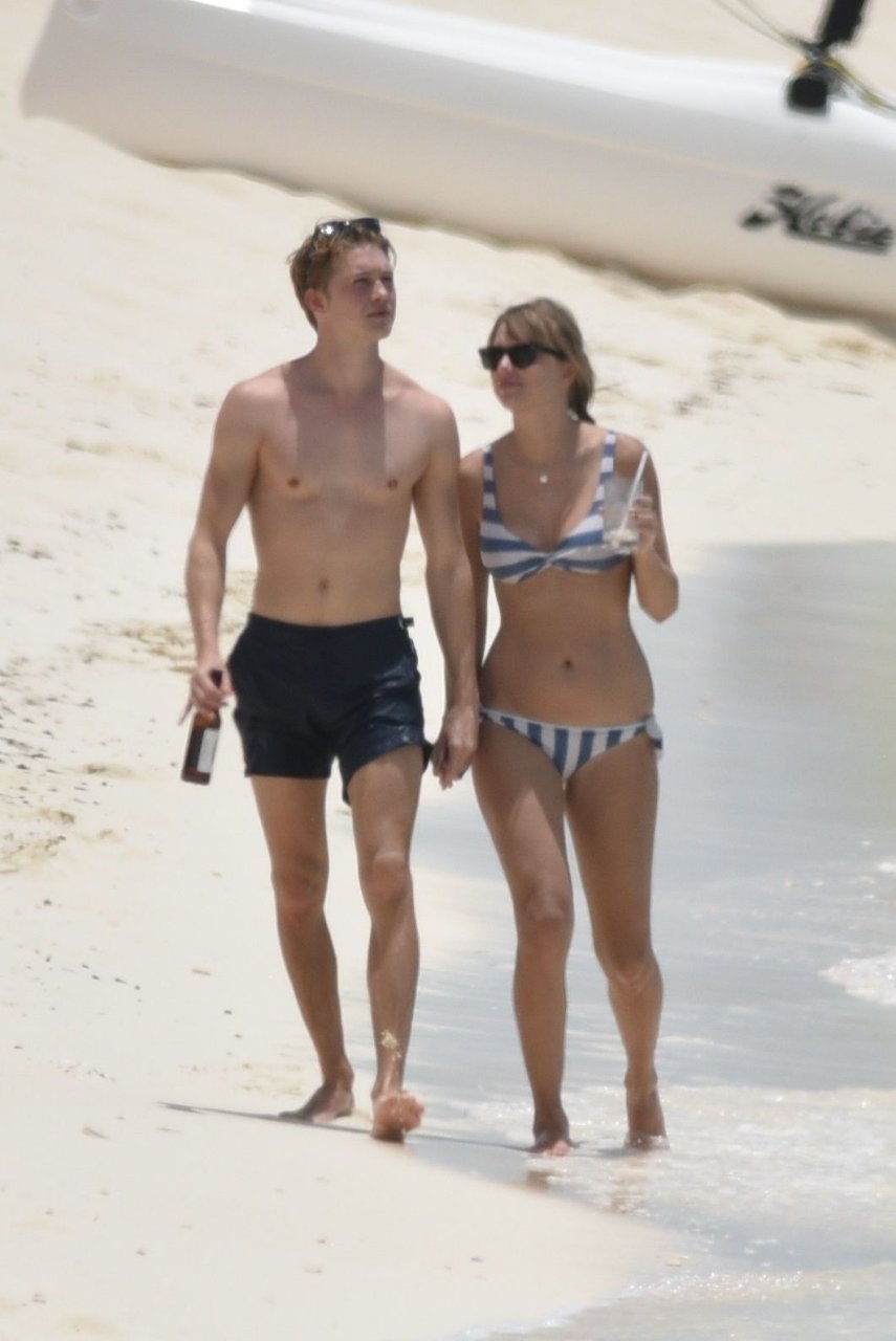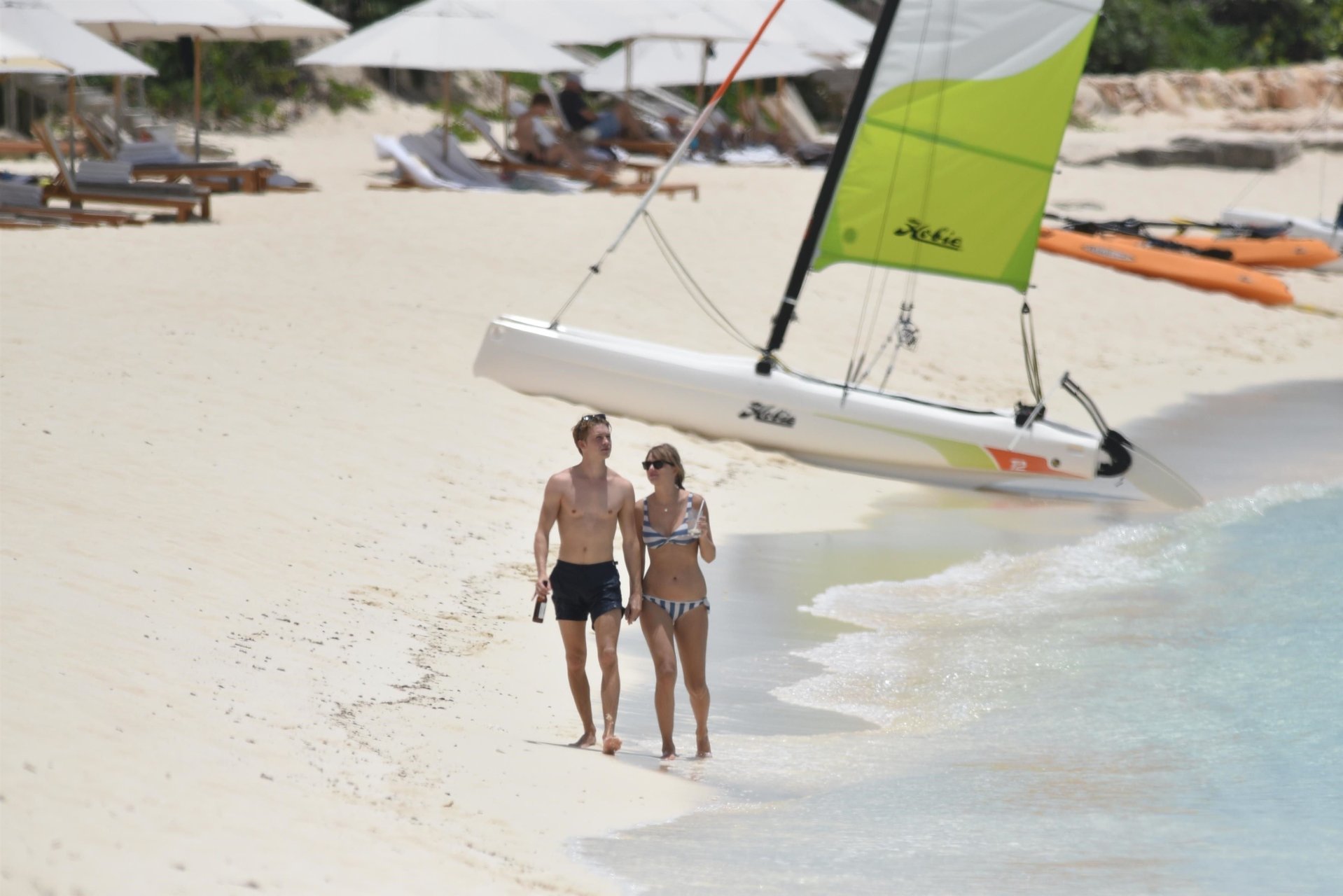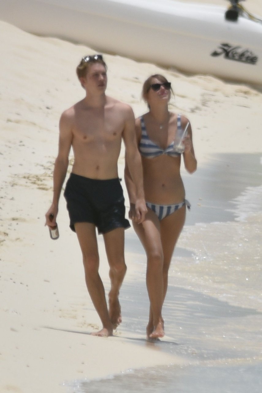 Taylor Swift y su pareja Joe Alwyn continúan su escapada romántica en un resort privado de lujo en Turks y Caicos, 07/05/2018. La pareja disfrutó de algunas bebidas en la playa mientras se tomaban de la mano después de darse un rápido baño en el océano. Taylor mostró su cuerpo tonificado con un bikini a rayas azul y blanco.