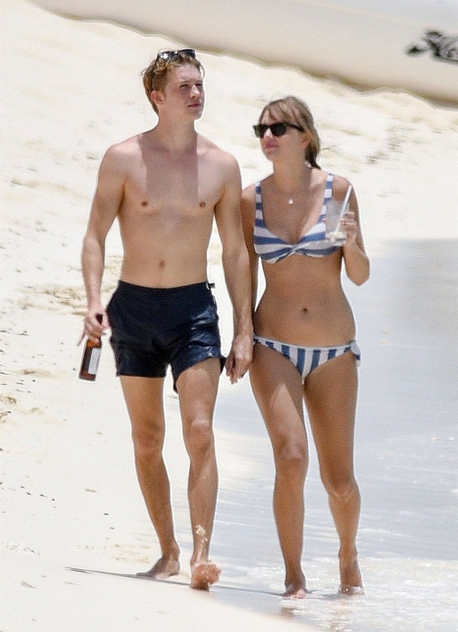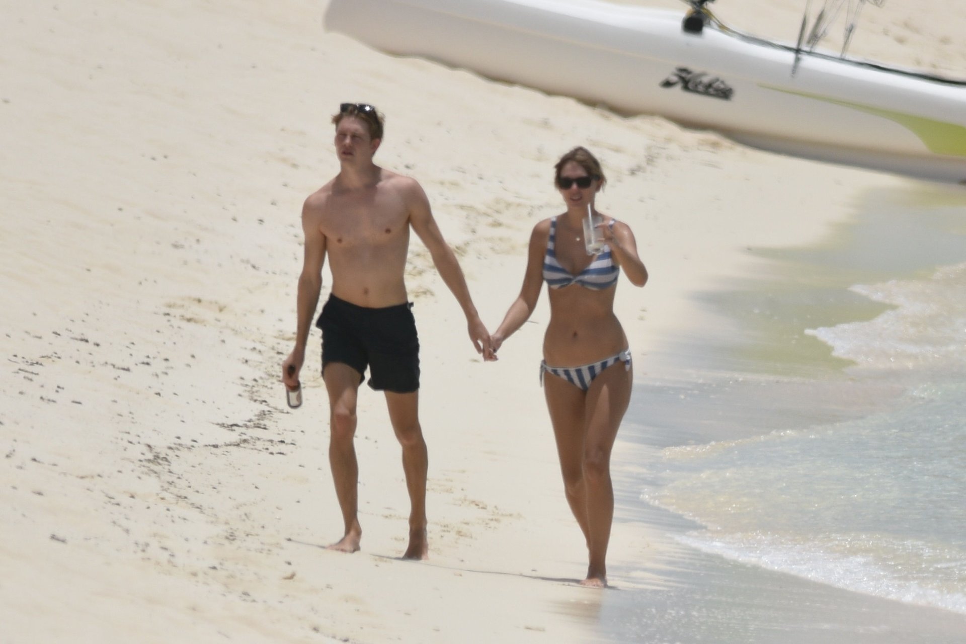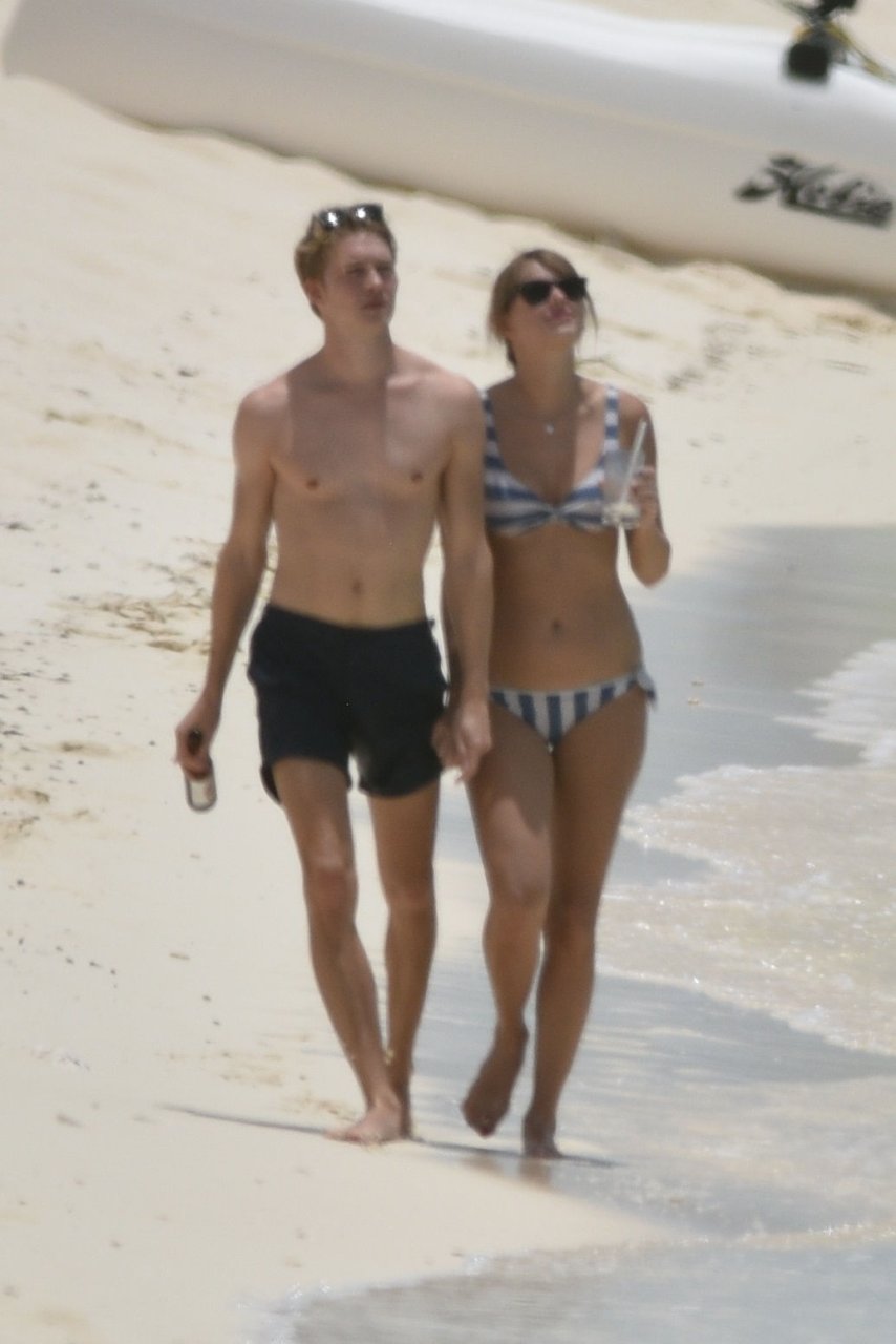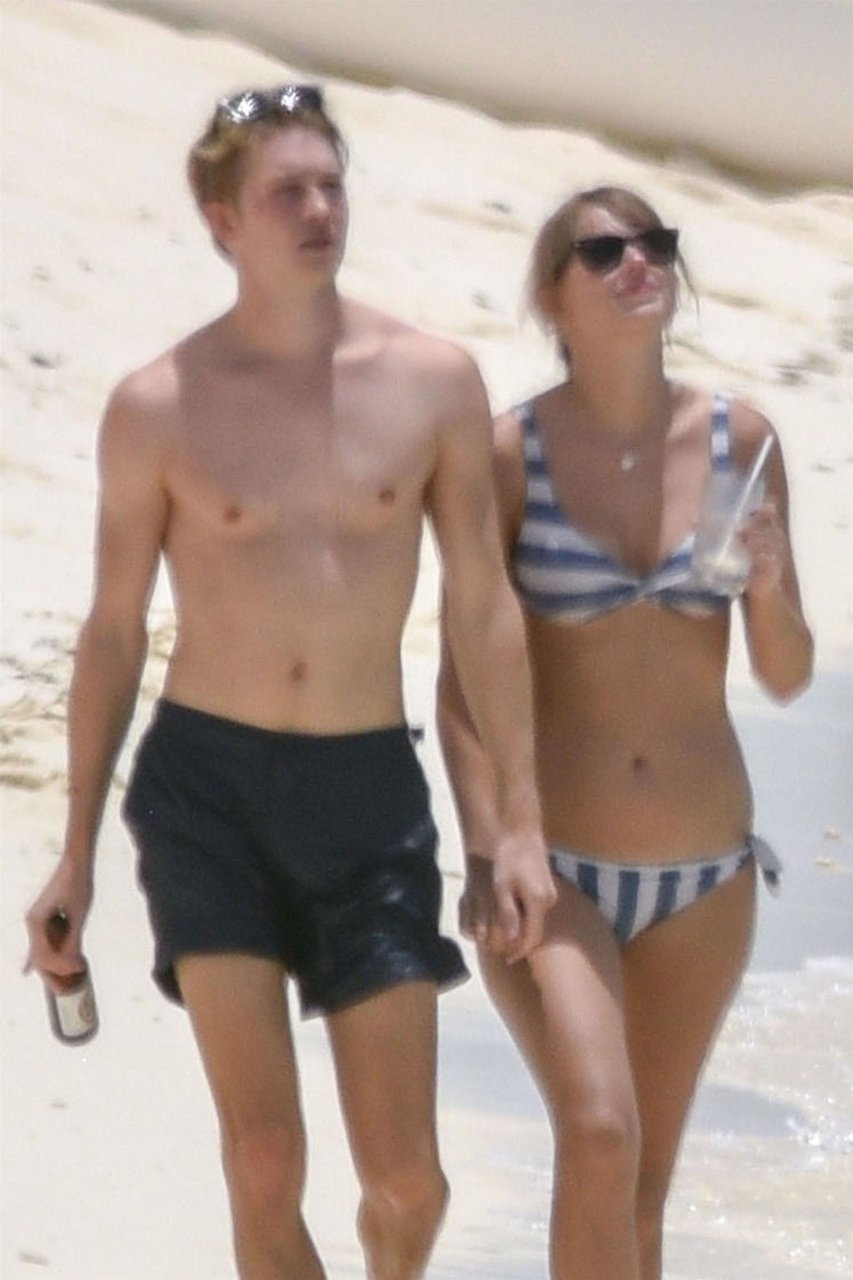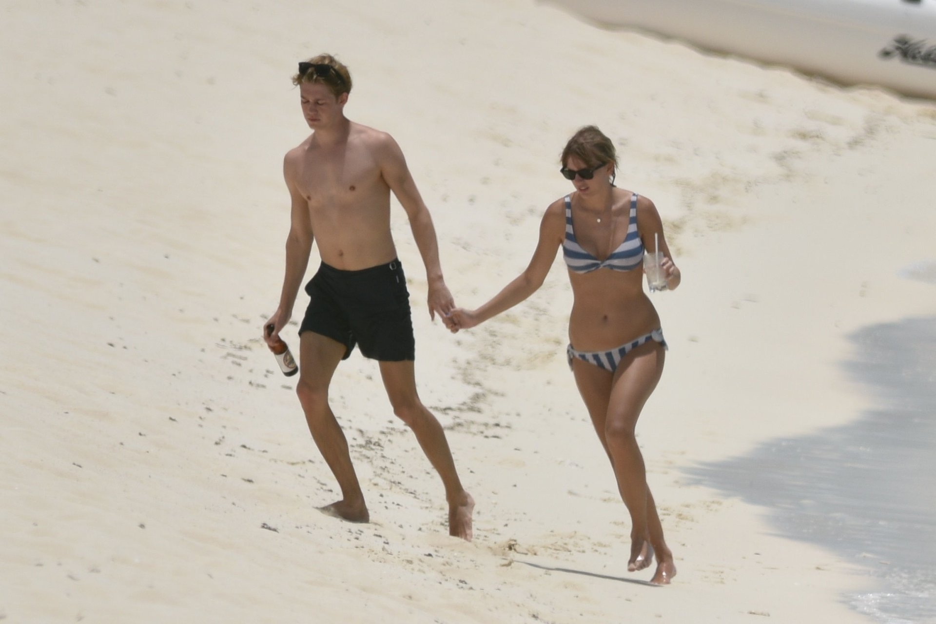 Taylor Swift y su pareja Joe Alwyn continúan su escapada romántica en un resort privado de lujo en Turks y Caicos, 07/05/2018. La pareja disfrutó de algunas bebidas en la playa mientras se tomaban de la mano después de darse un rápido baño en el océano. Taylor mostró su cuerpo tonificado con un bikini a rayas azul y blanco.