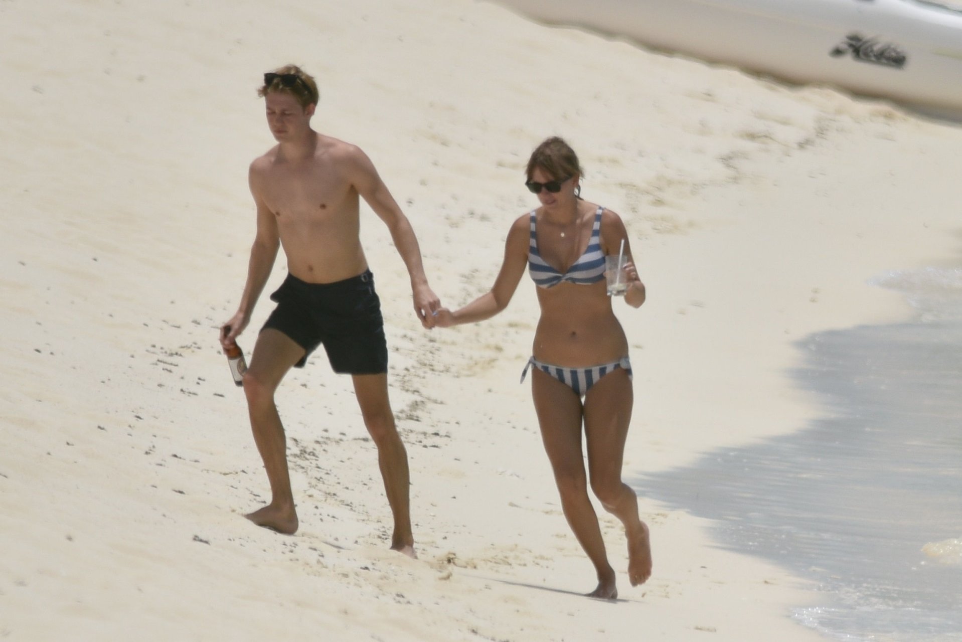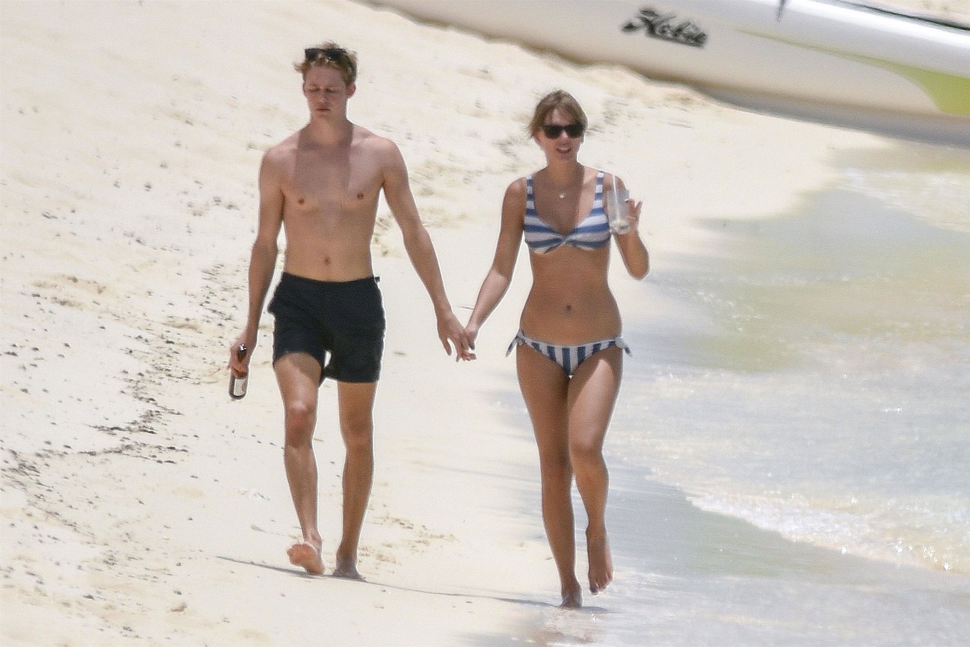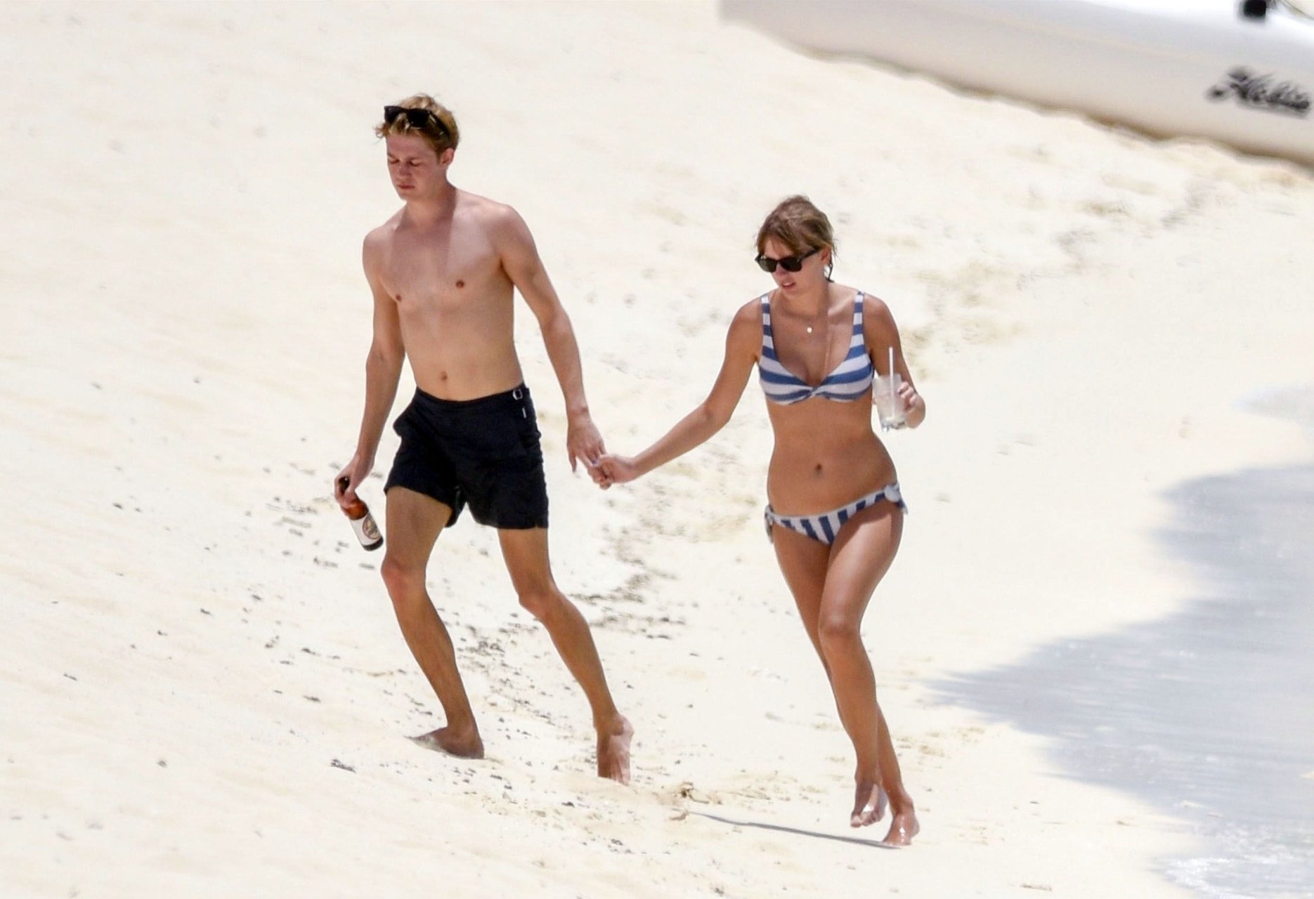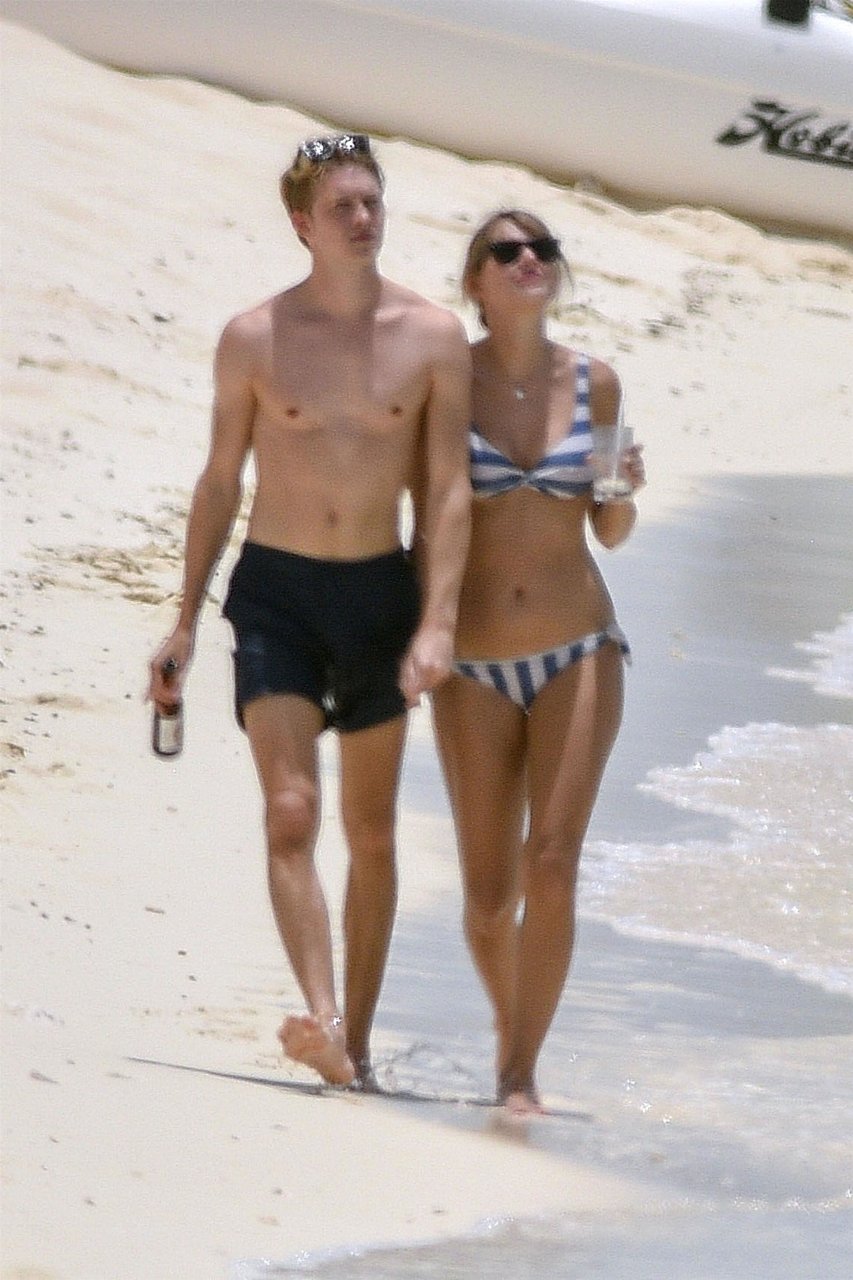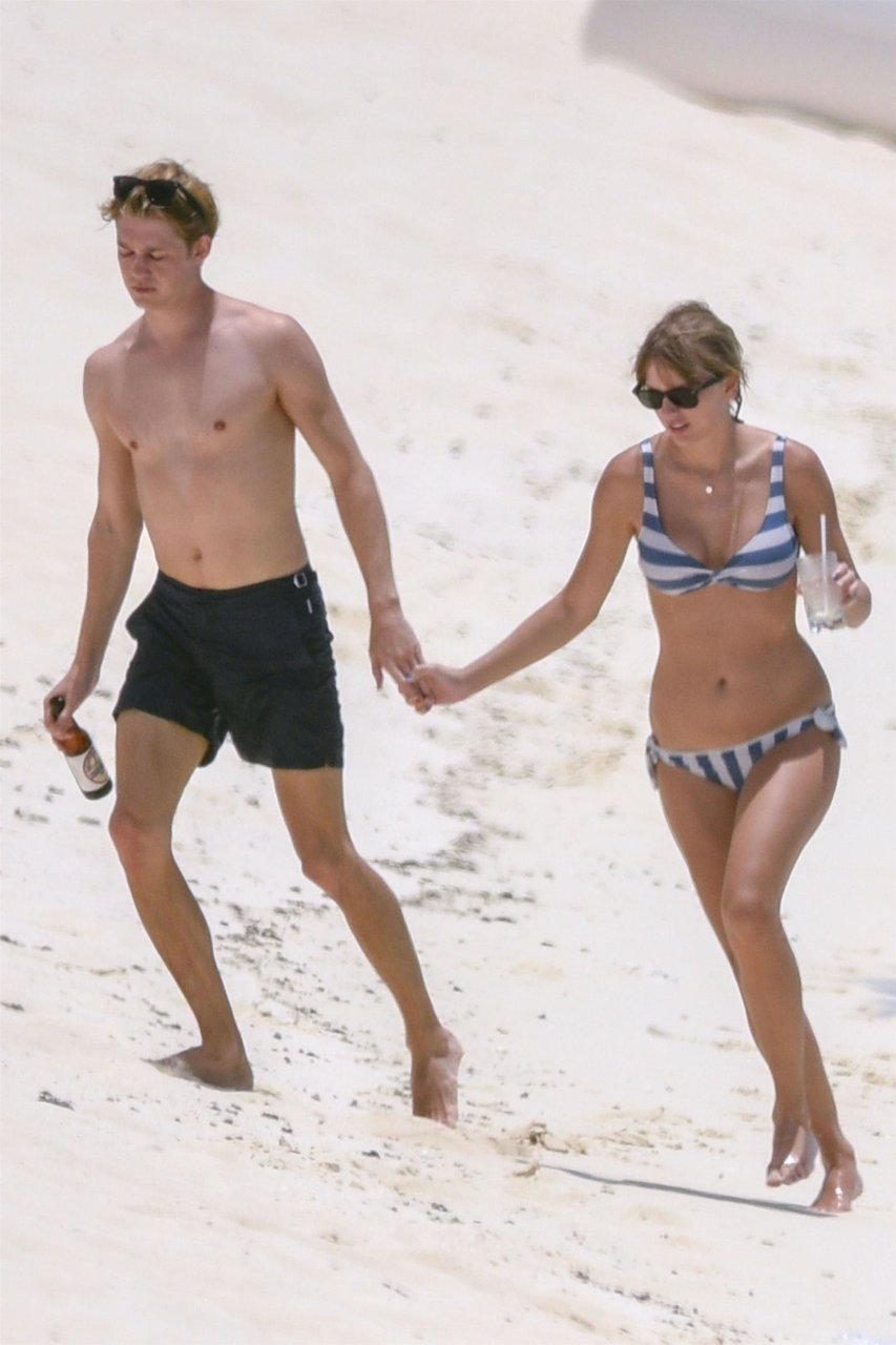 Taylor Swift y su pareja Joe Alwyn continúan su escapada romántica en un resort privado de lujo en Turks y Caicos, 07/05/2018. La pareja disfrutó de algunas bebidas en la playa mientras se tomaban de la mano después de darse un rápido baño en el océano. Taylor mostró su cuerpo tonificado con un bikini a rayas azul y blanco.
