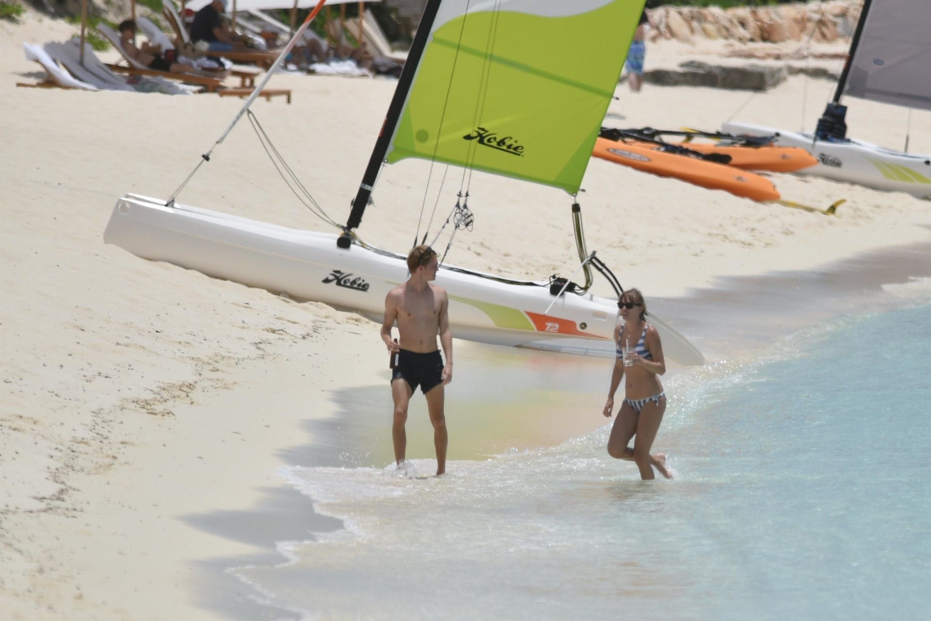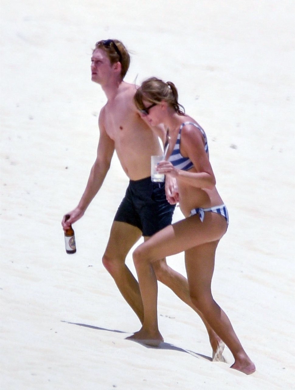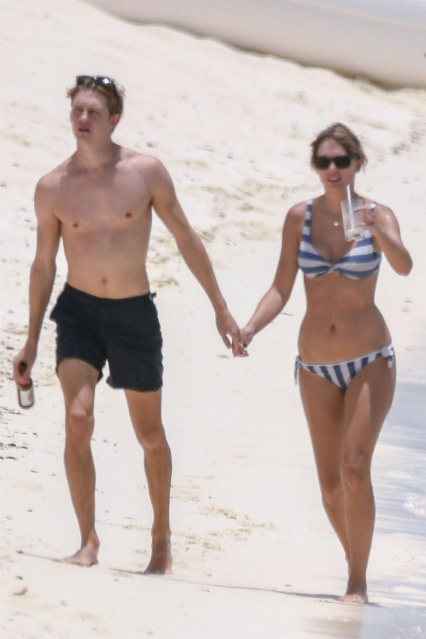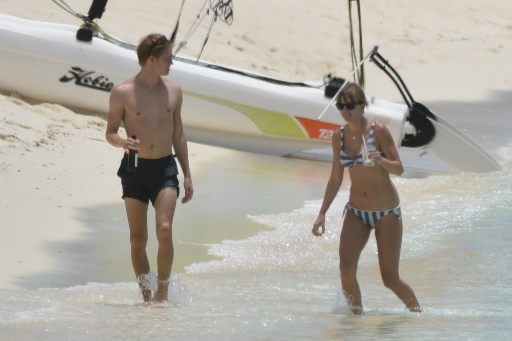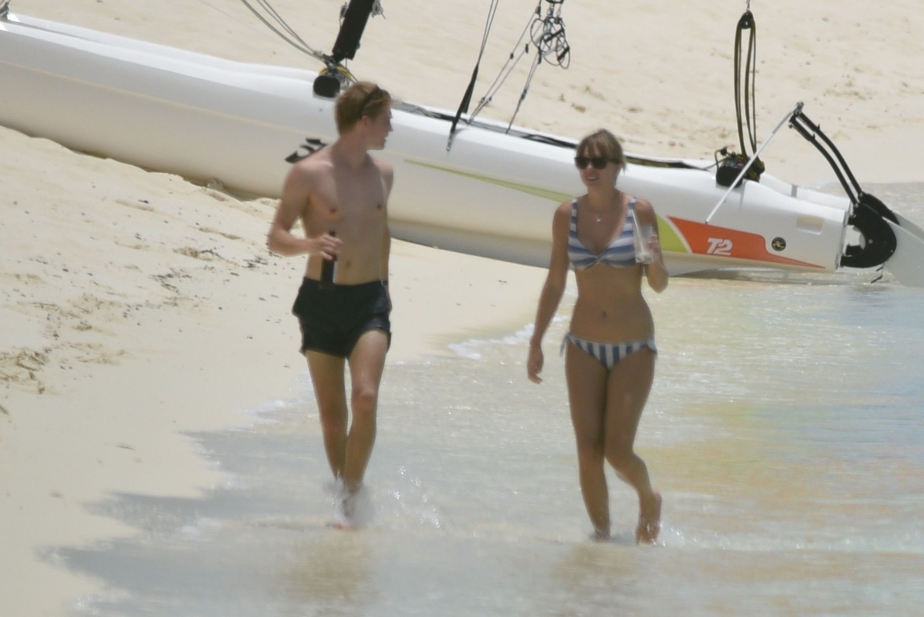 Taylor Swift y su pareja Joe Alwyn continúan su escapada romántica en un resort privado de lujo en Turks y Caicos, 07/05/2018. La pareja disfrutó de algunas bebidas en la playa mientras se tomaban de la mano después de darse un rápido baño en el océano. Taylor mostró su cuerpo tonificado con un bikini a rayas azul y blanco.