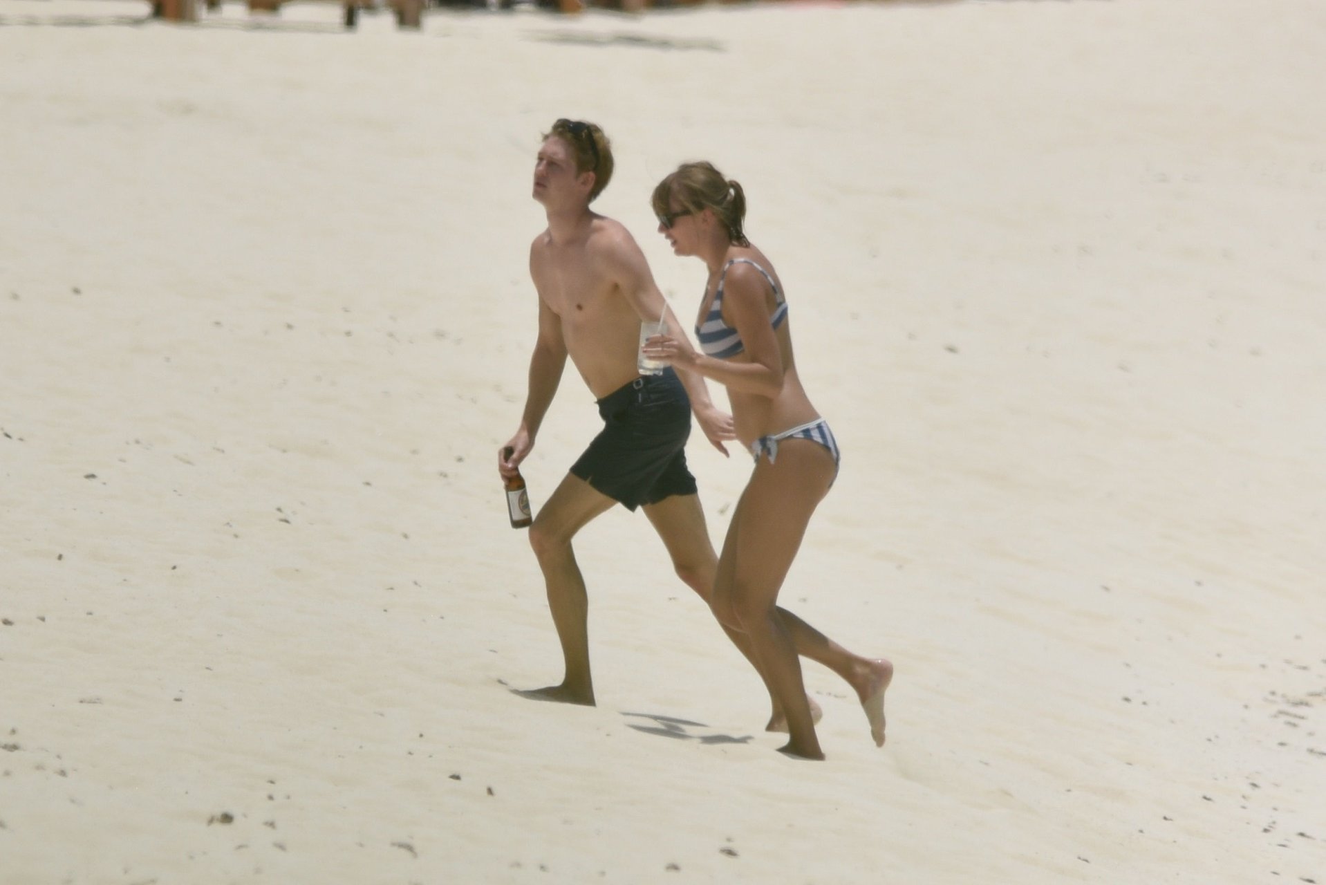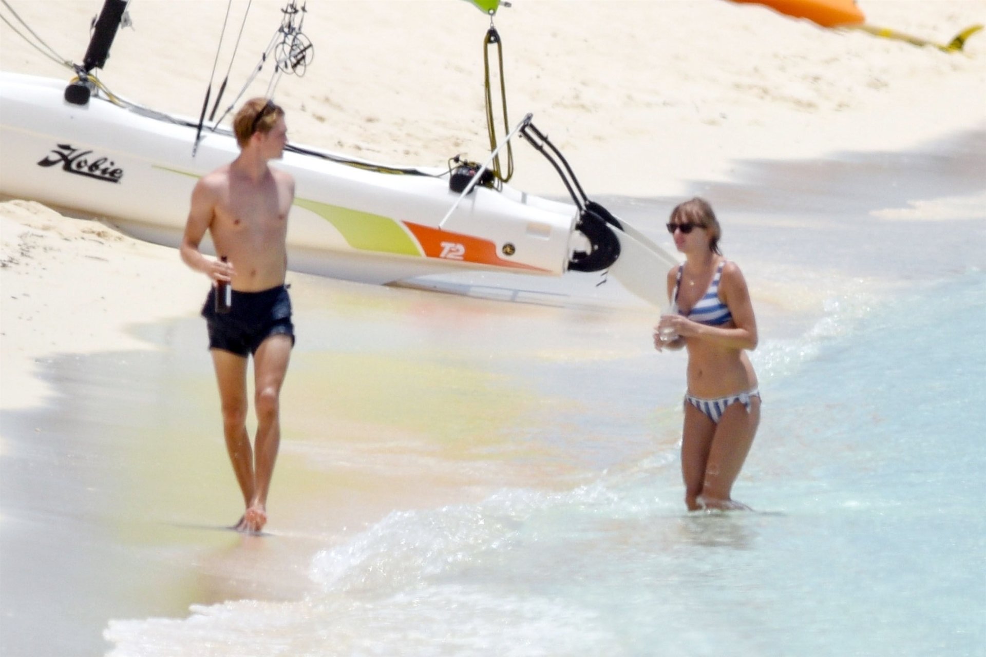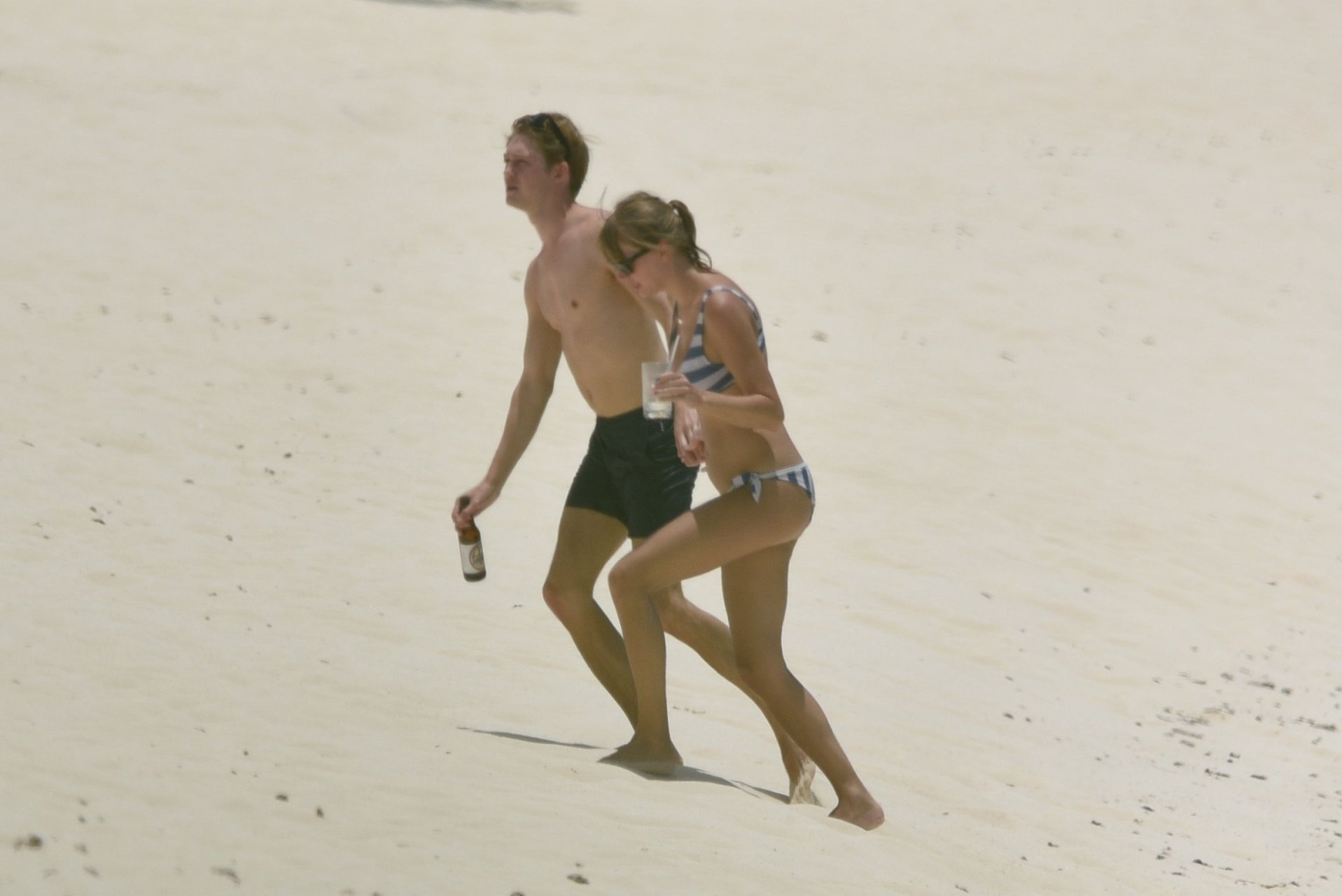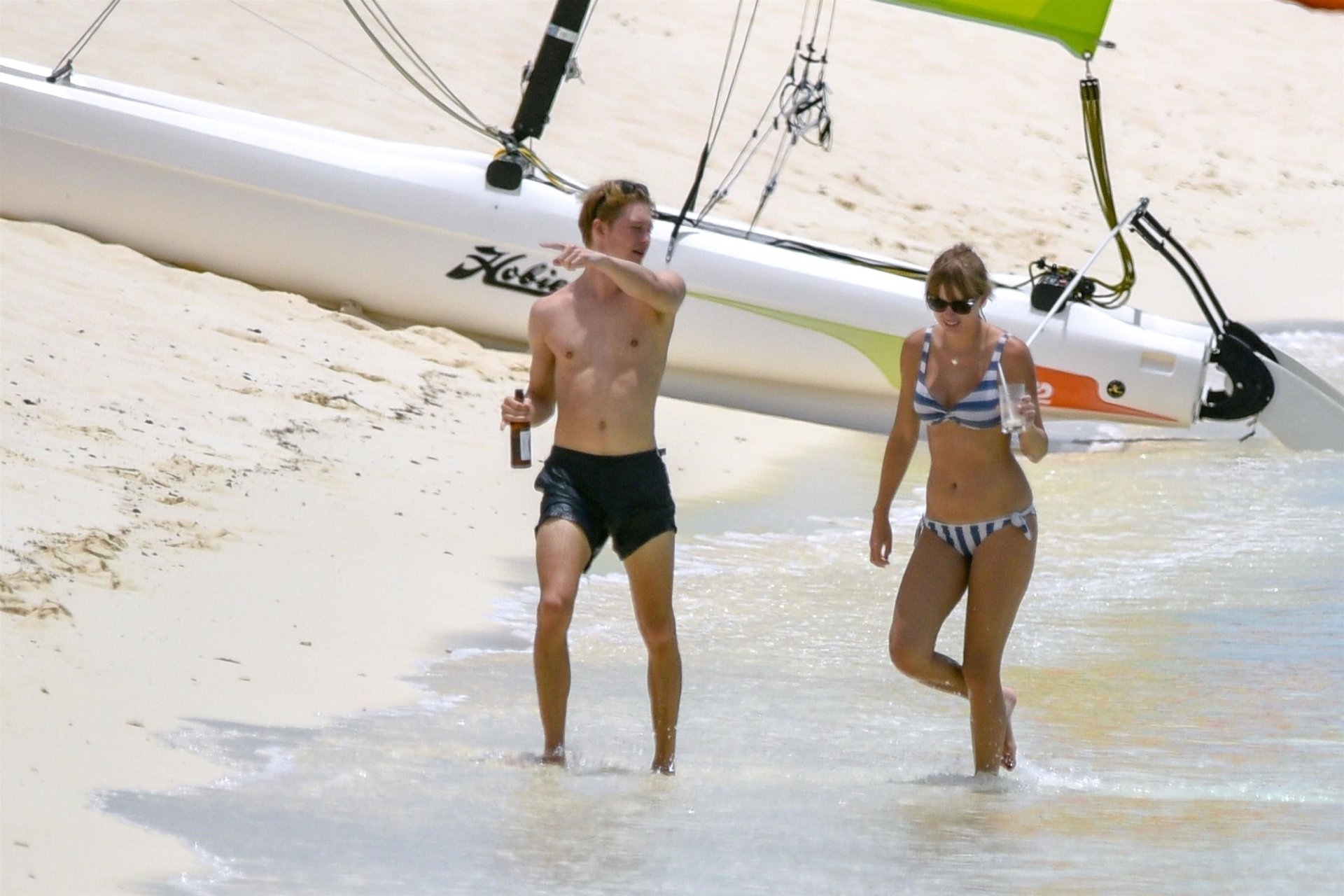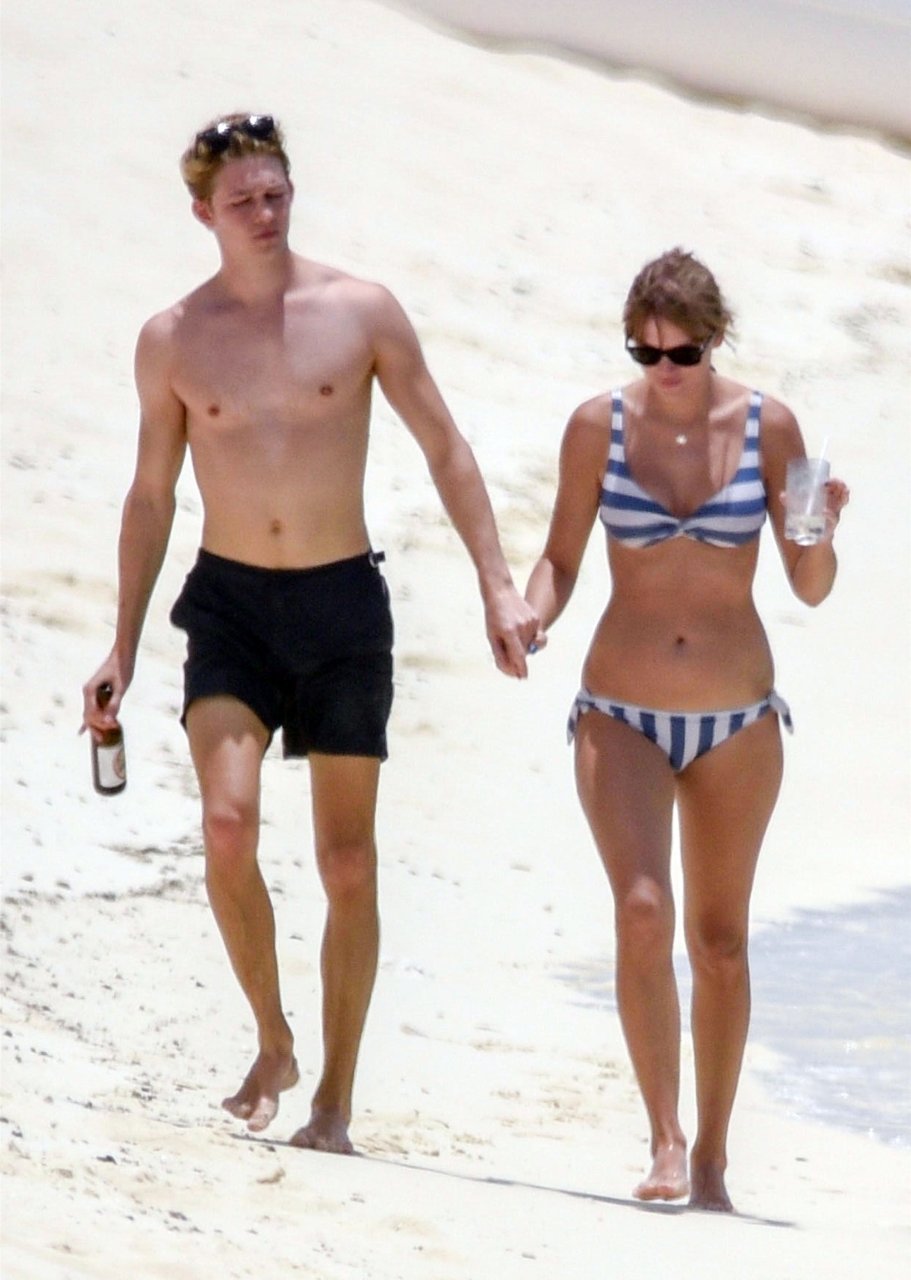 Taylor Swift y su pareja Joe Alwyn continúan su escapada romántica en un resort privado de lujo en Turks y Caicos, 07/05/2018. La pareja disfrutó de algunas bebidas en la playa mientras se tomaban de la mano después de darse un rápido baño en el océano. Taylor mostró su cuerpo tonificado con un bikini a rayas azul y blanco.