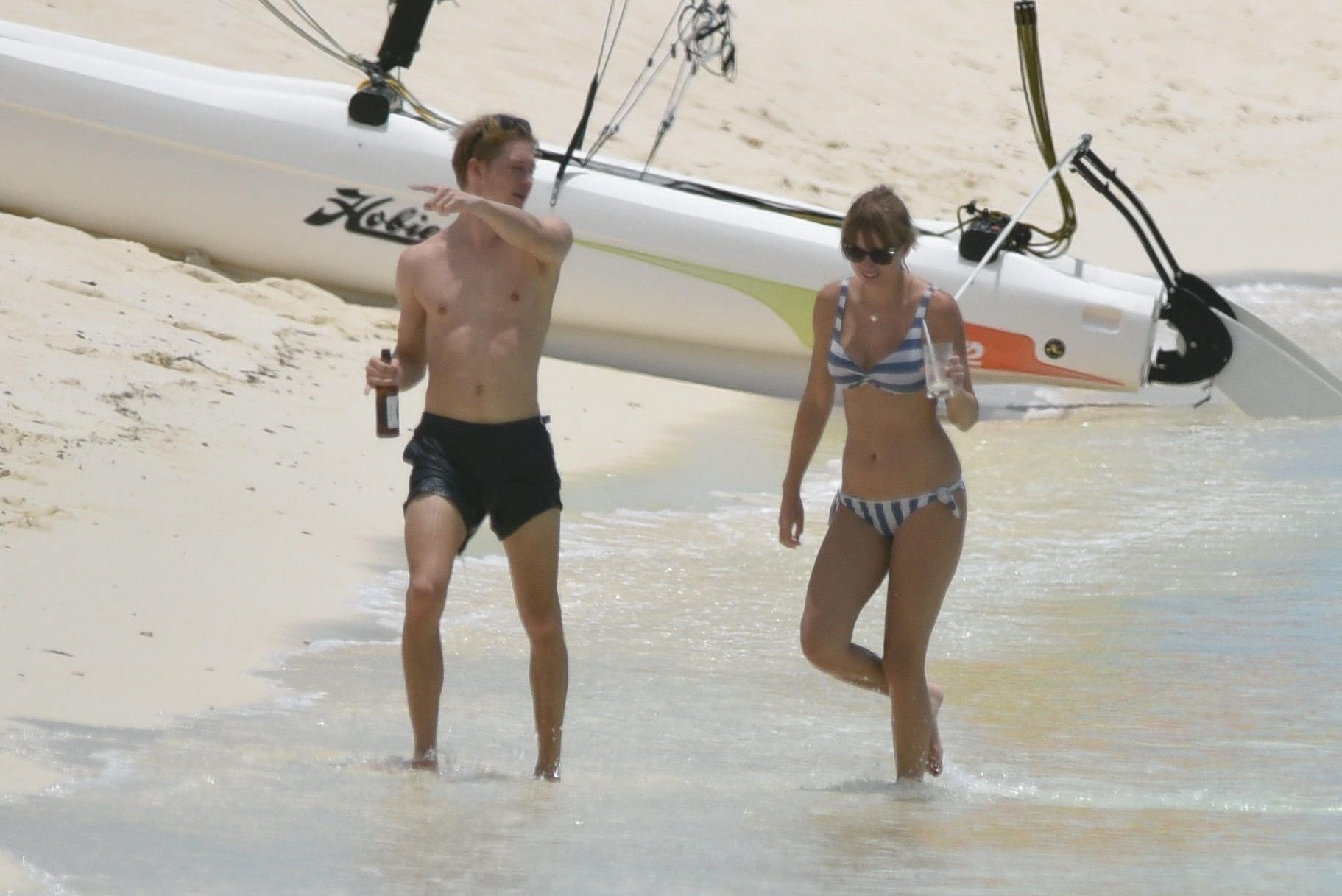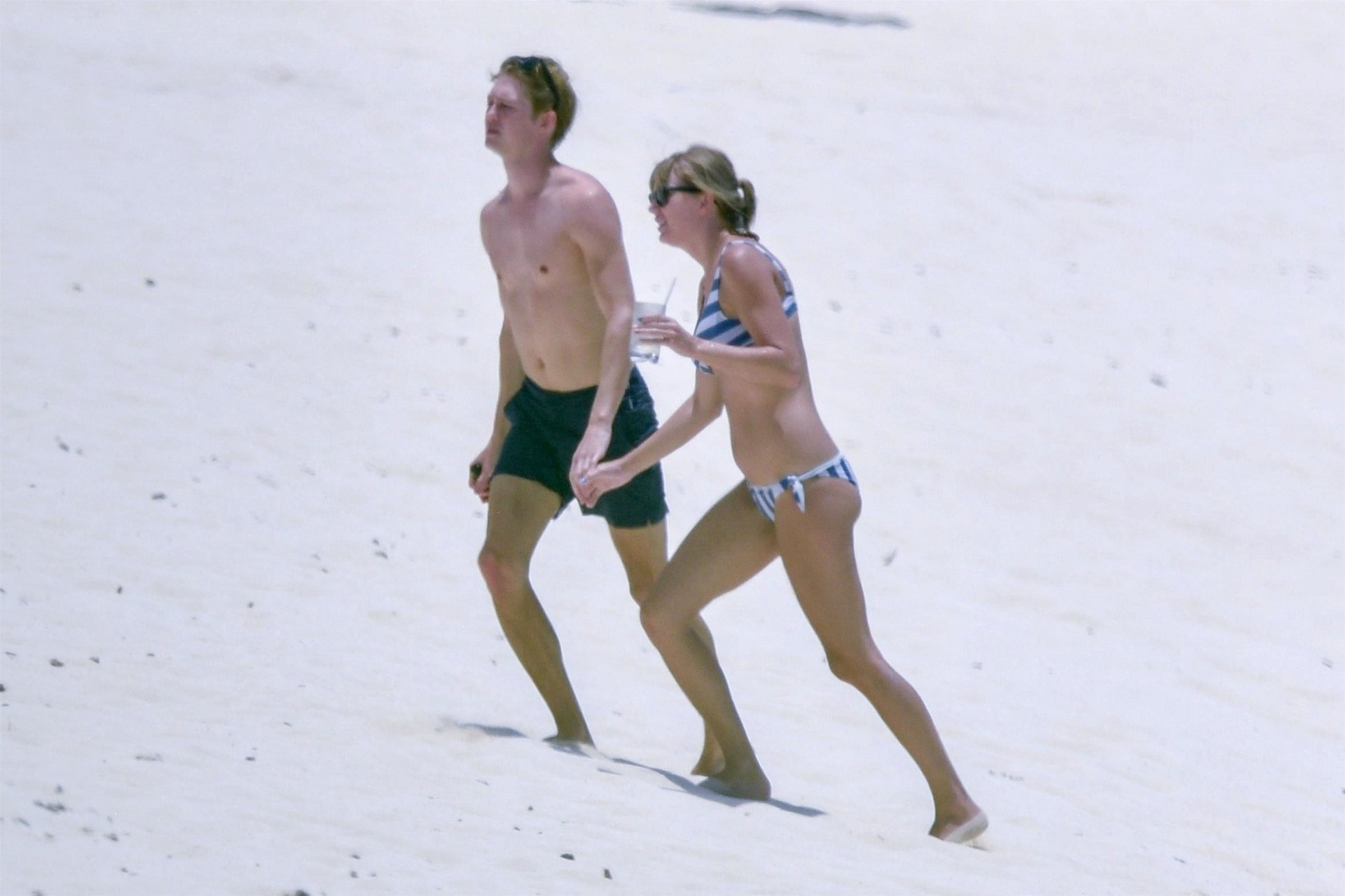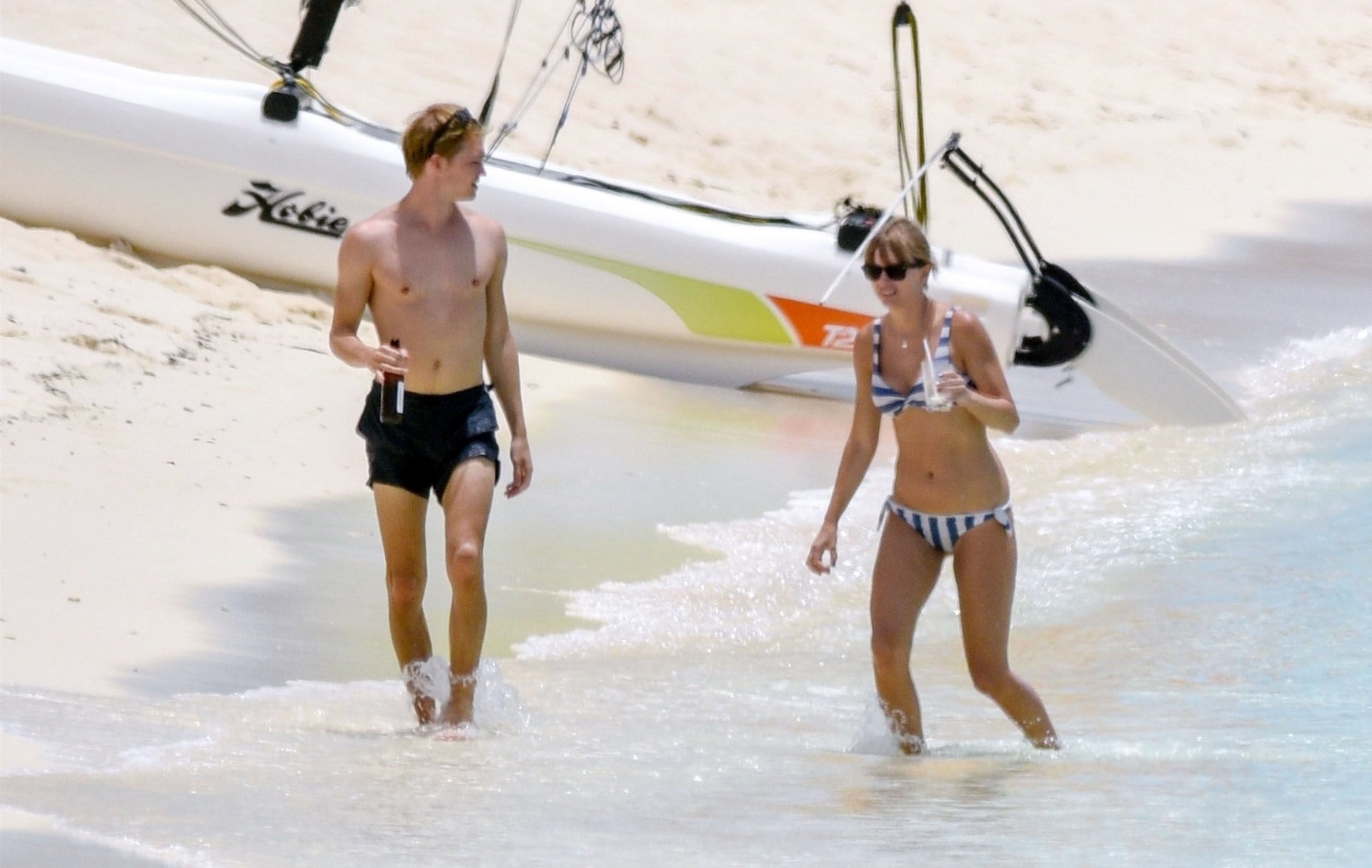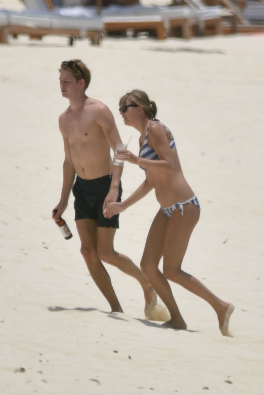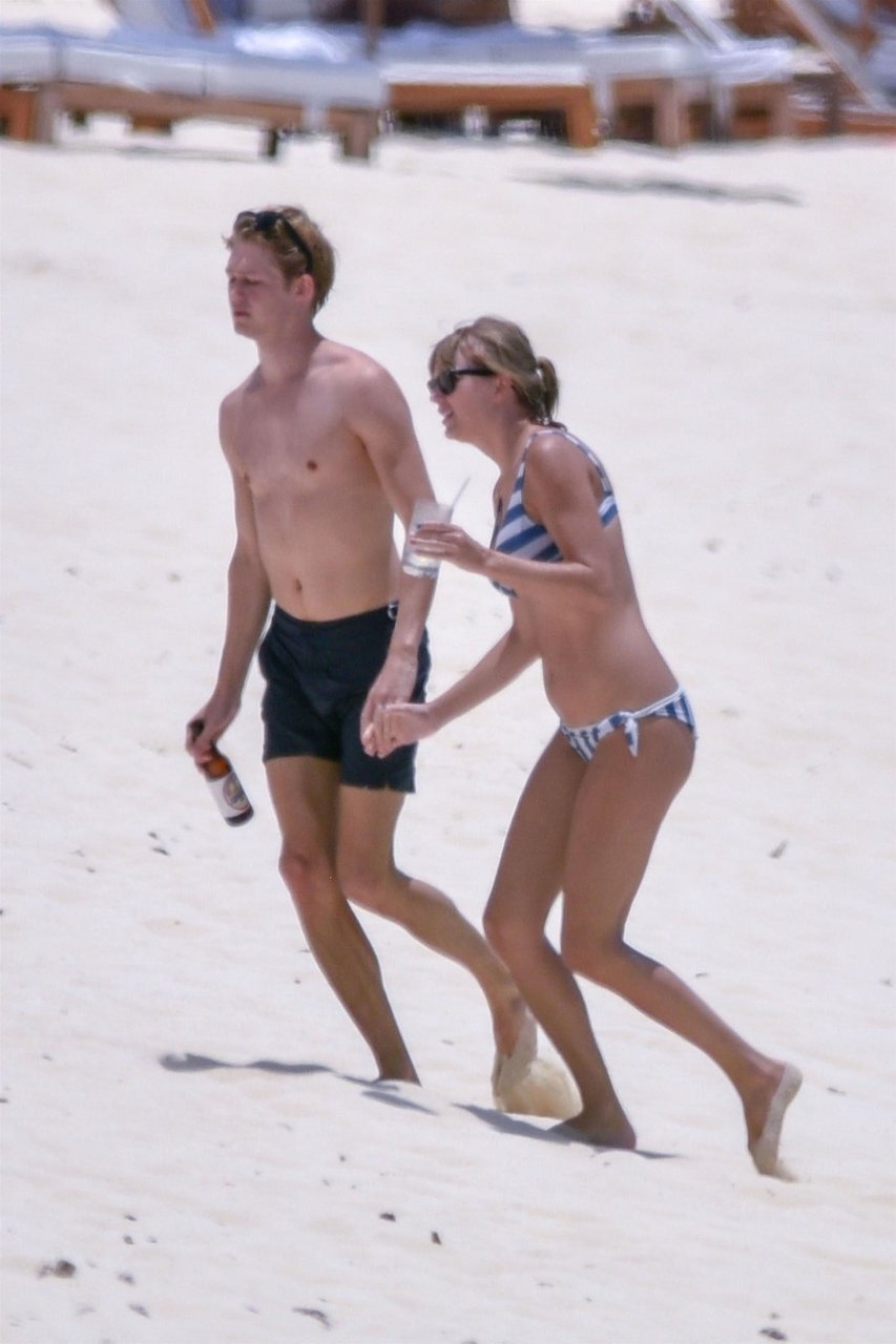 Taylor Swift y su pareja Joe Alwyn continúan su escapada romántica en un resort privado de lujo en Turks y Caicos, 07/05/2018. La pareja disfrutó de algunas bebidas en la playa mientras se tomaban de la mano después de darse un rápido baño en el océano. Taylor mostró su cuerpo tonificado con un bikini a rayas azul y blanco.