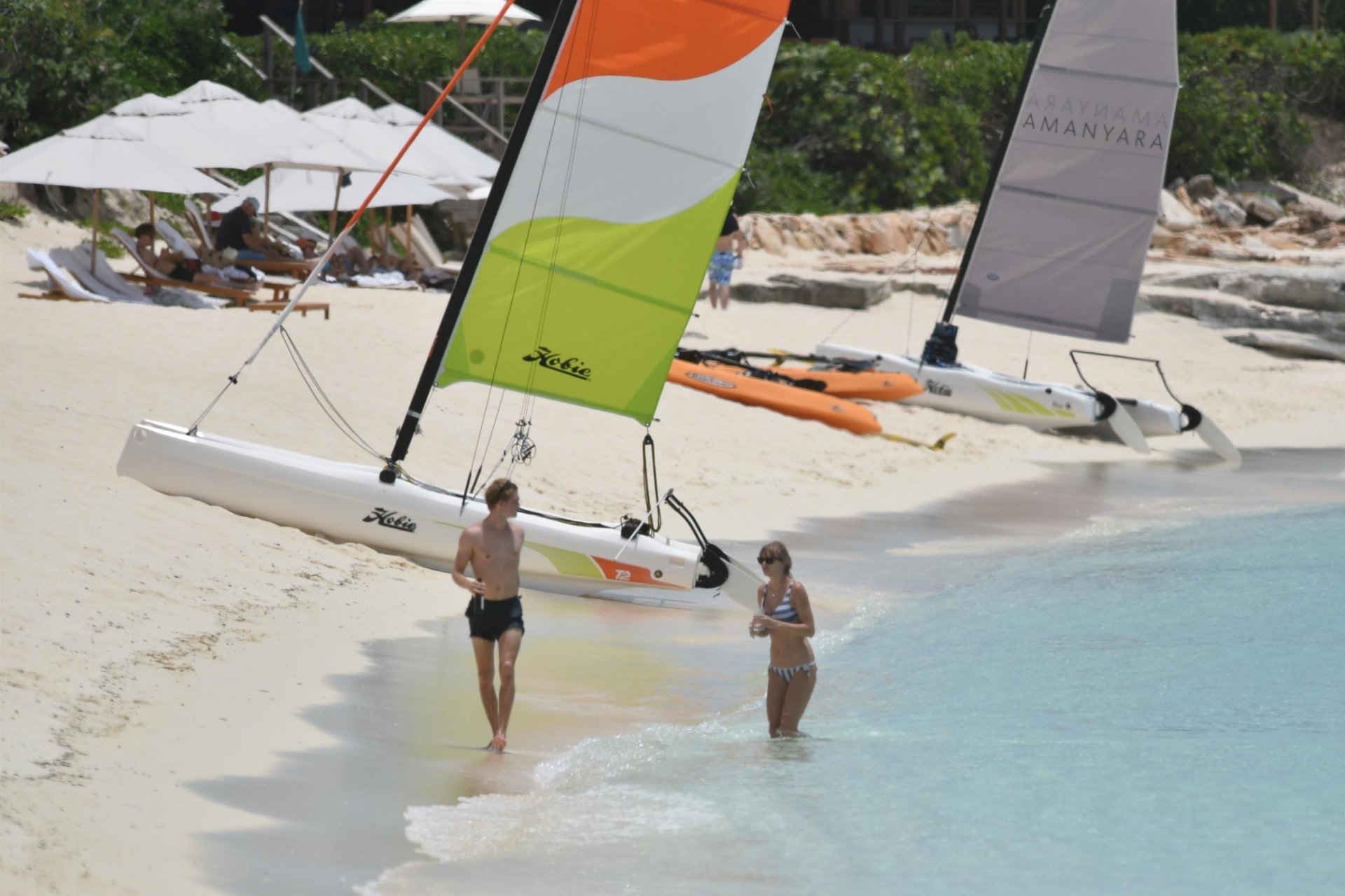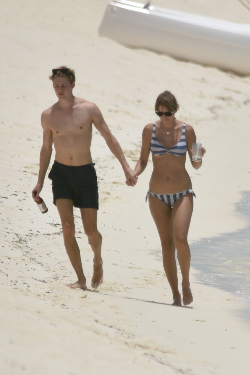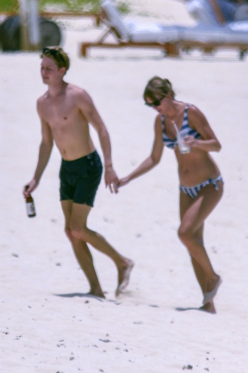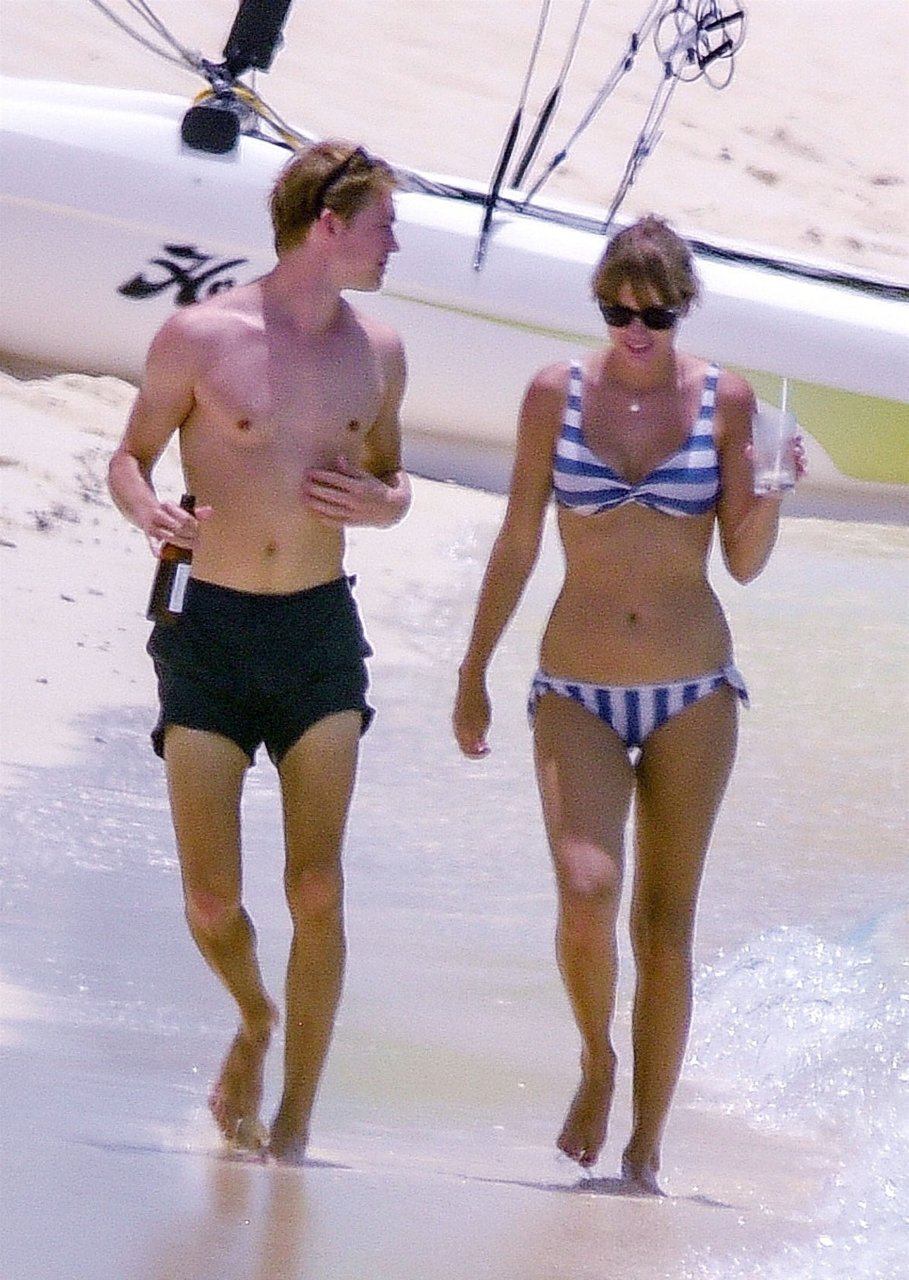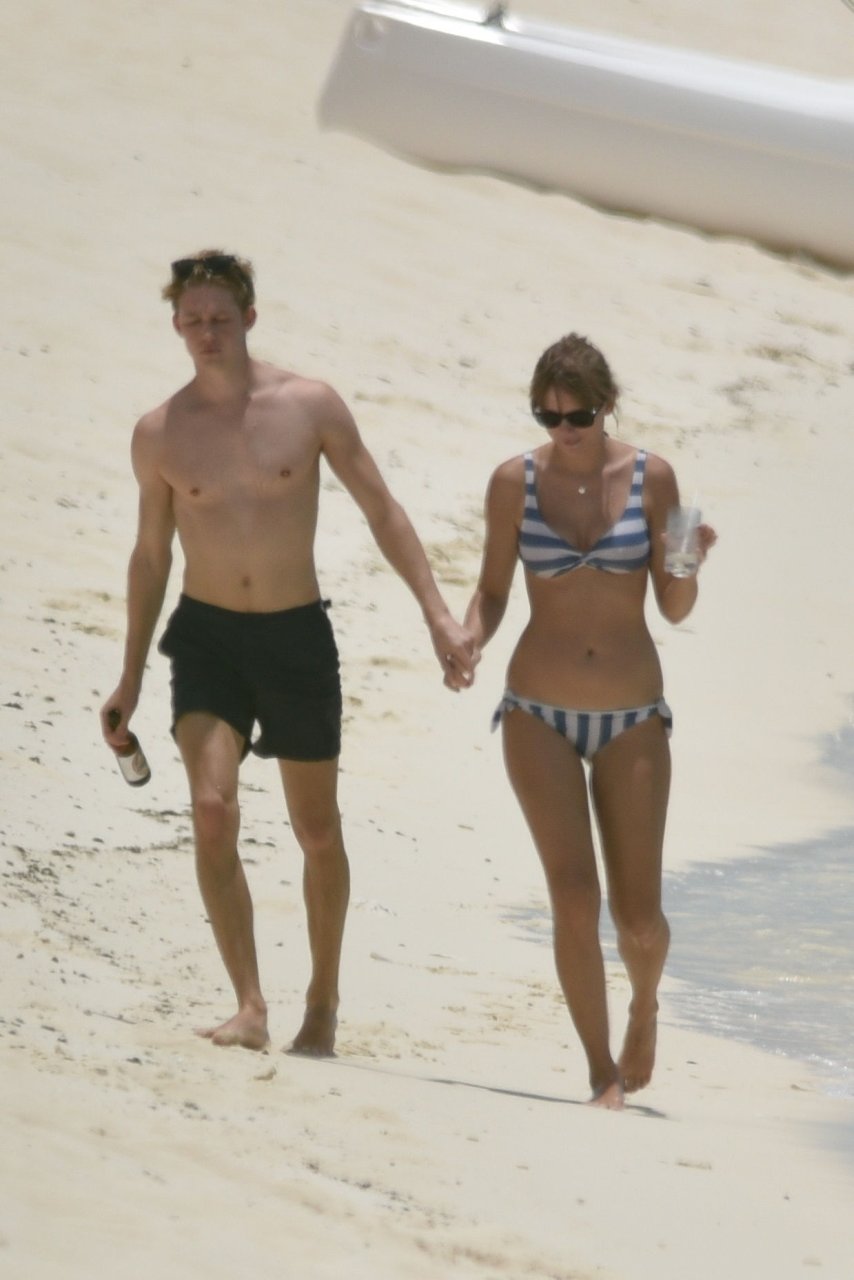 Taylor Swift y su pareja Joe Alwyn continúan su escapada romántica en un resort privado de lujo en Turks y Caicos, 07/05/2018. La pareja disfrutó de algunas bebidas en la playa mientras se tomaban de la mano después de darse un rápido baño en el océano. Taylor mostró su cuerpo tonificado con un bikini a rayas azul y blanco.