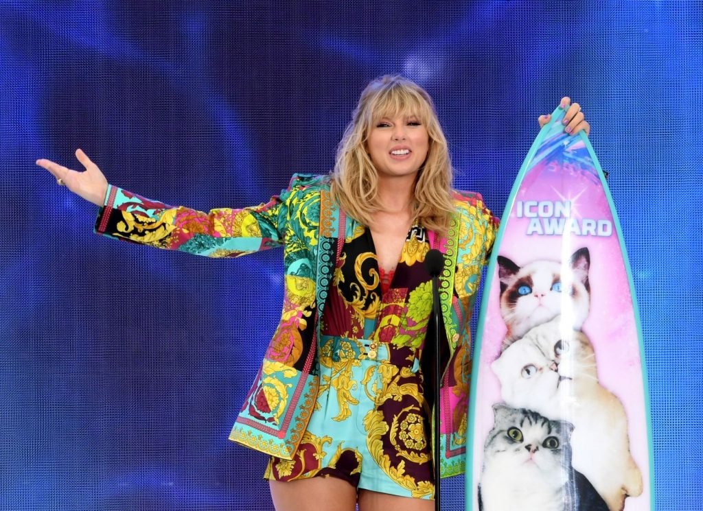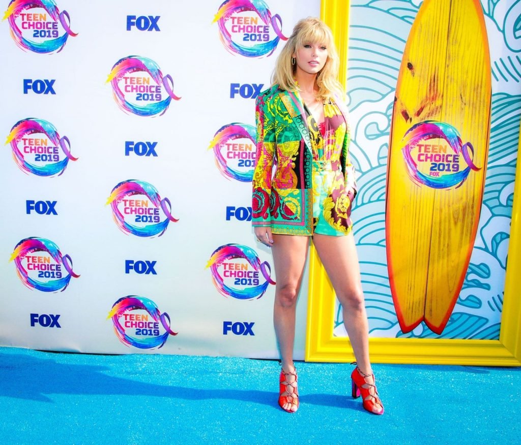 La cantante de piernas largas Taylor Swift llevaba un body de Versace, shorts y blazer con zapatos Kat Maconie, pendientes Misahara y anillos de Irene Neuwirth, VRAM y Emily P Wheeler, y llega a los Teen Choice Awards 2019 de FOX celebrados en Hermosa Beach Pier Plaza en Hermosa Beach, 11/08/2019.