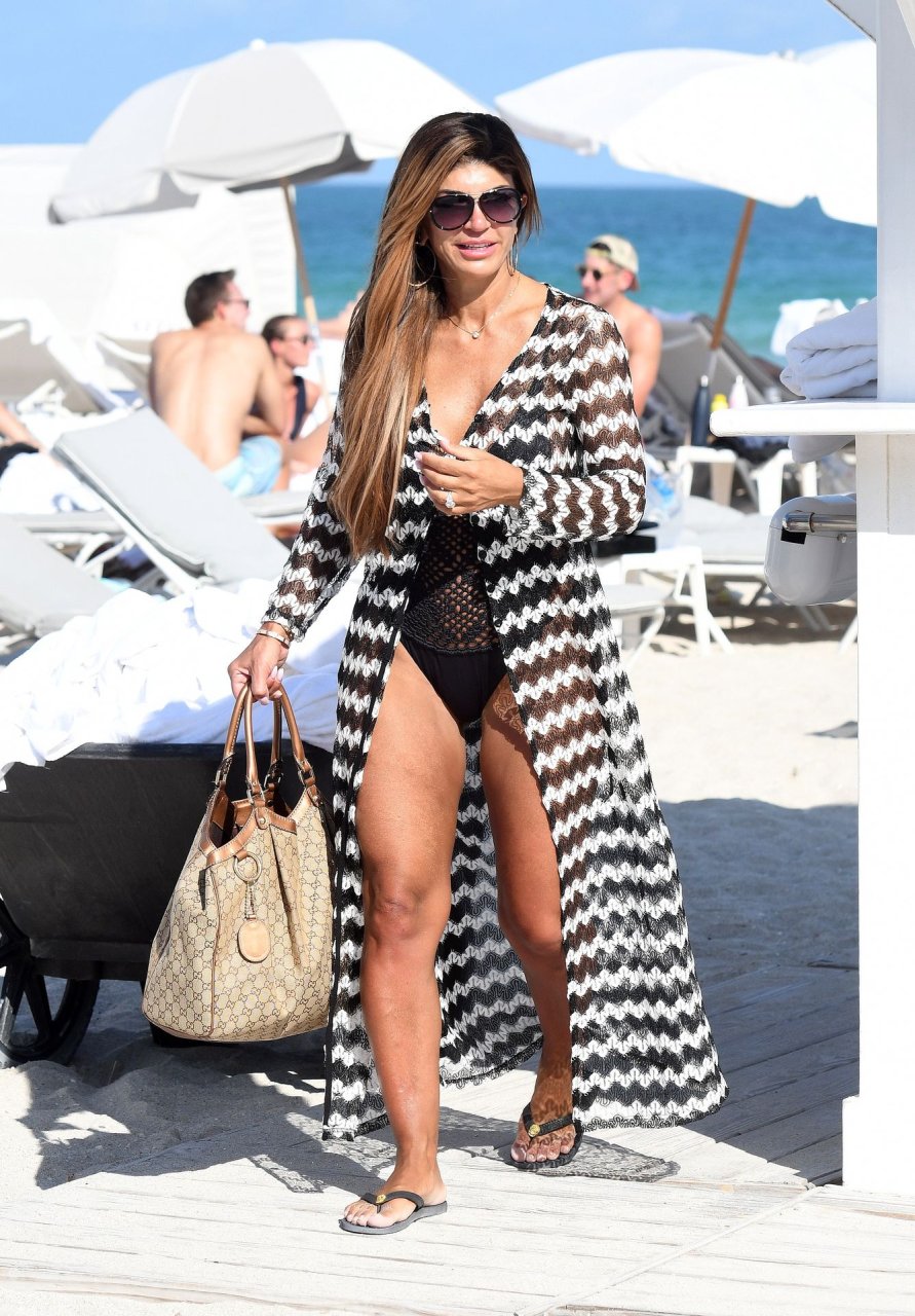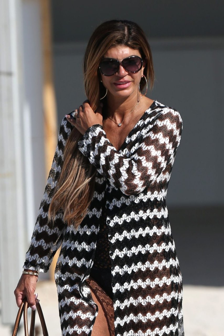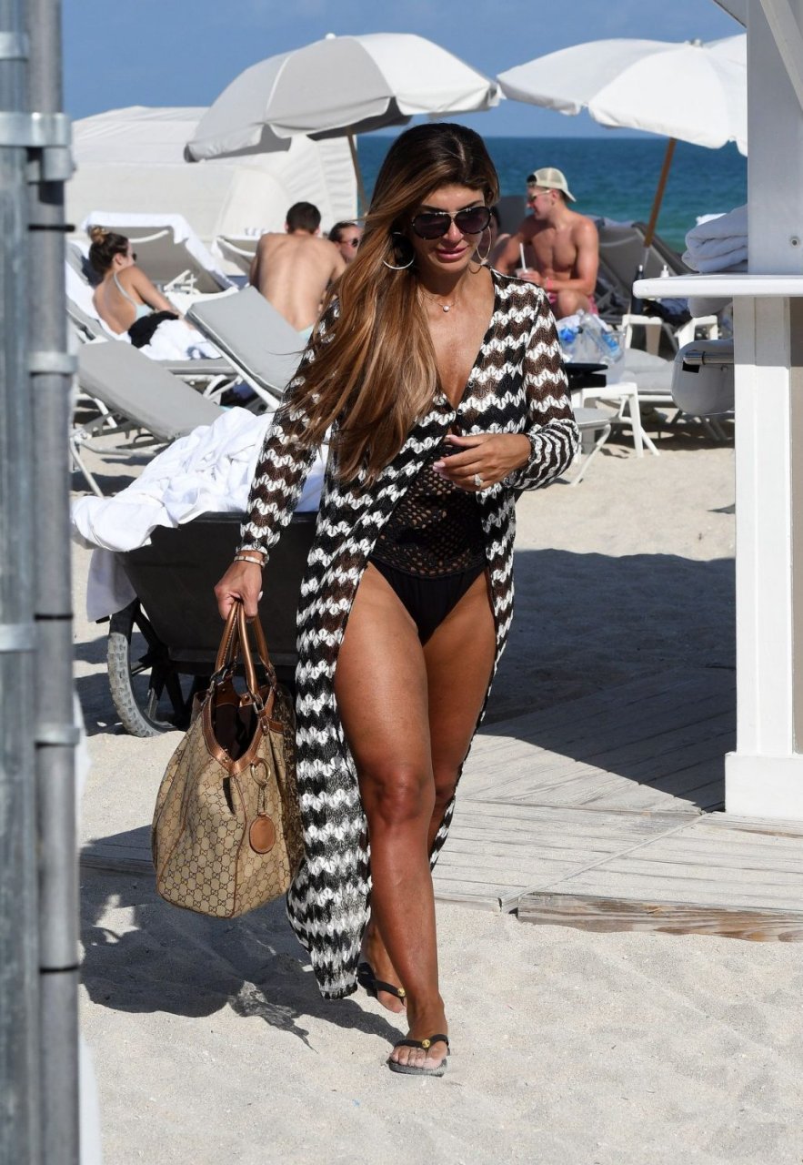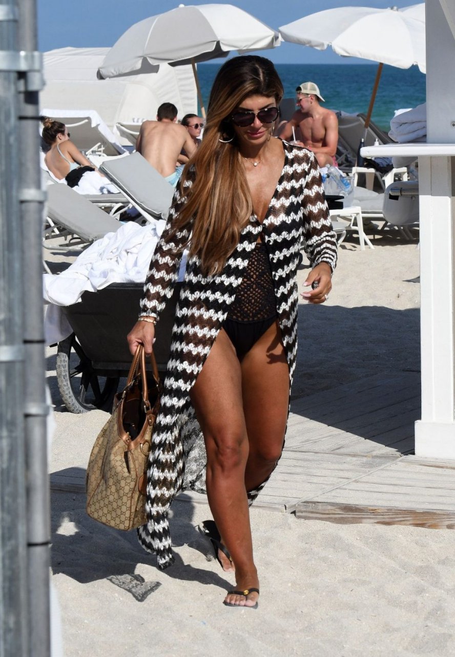 Teresa Giudice muestra sus curvas y un gran diamante en el centro mientras lleva un atrevido traje de baño en la playa de Miami, 18/02/2019.