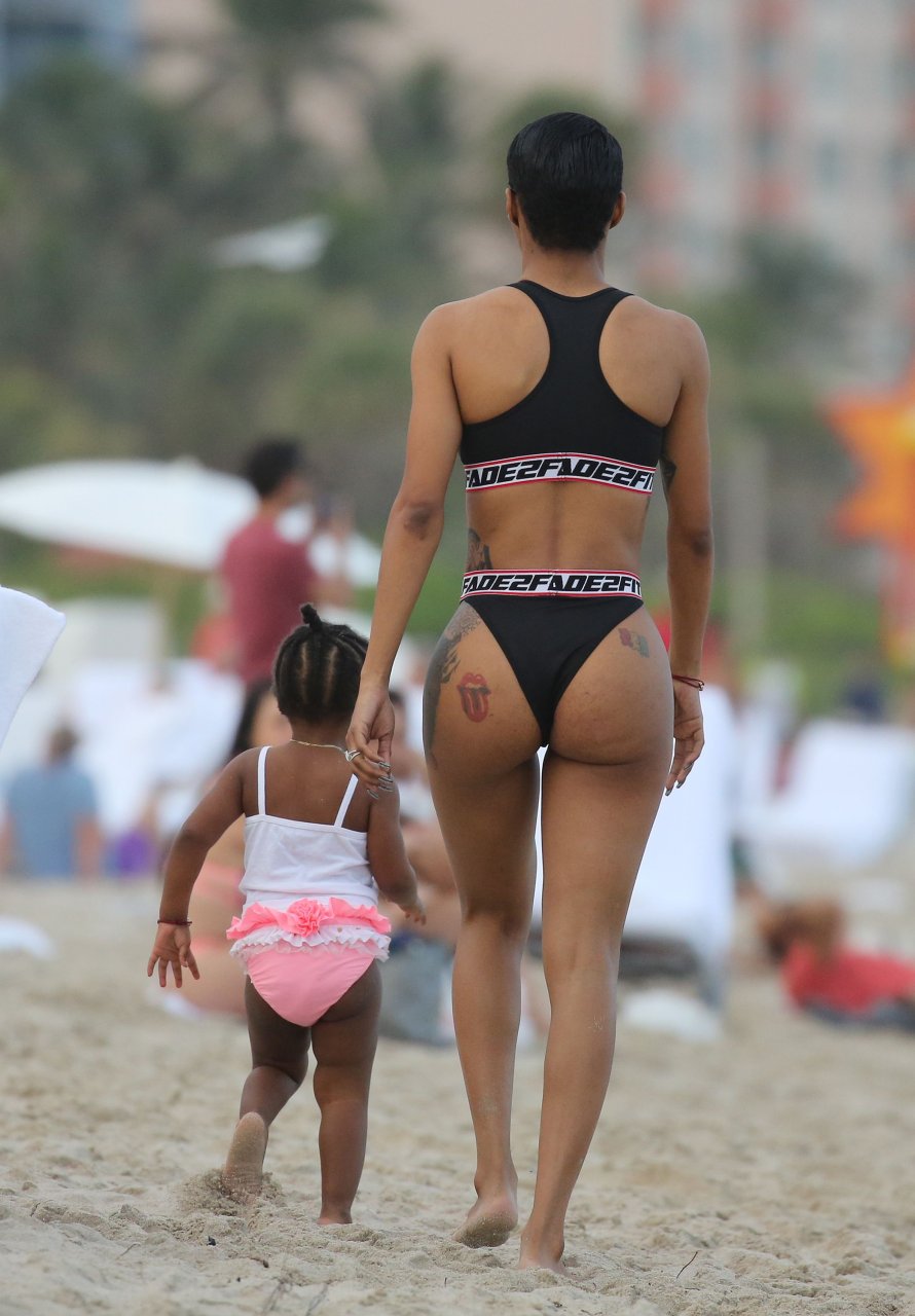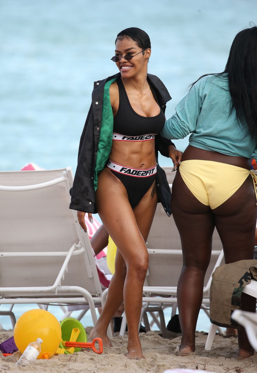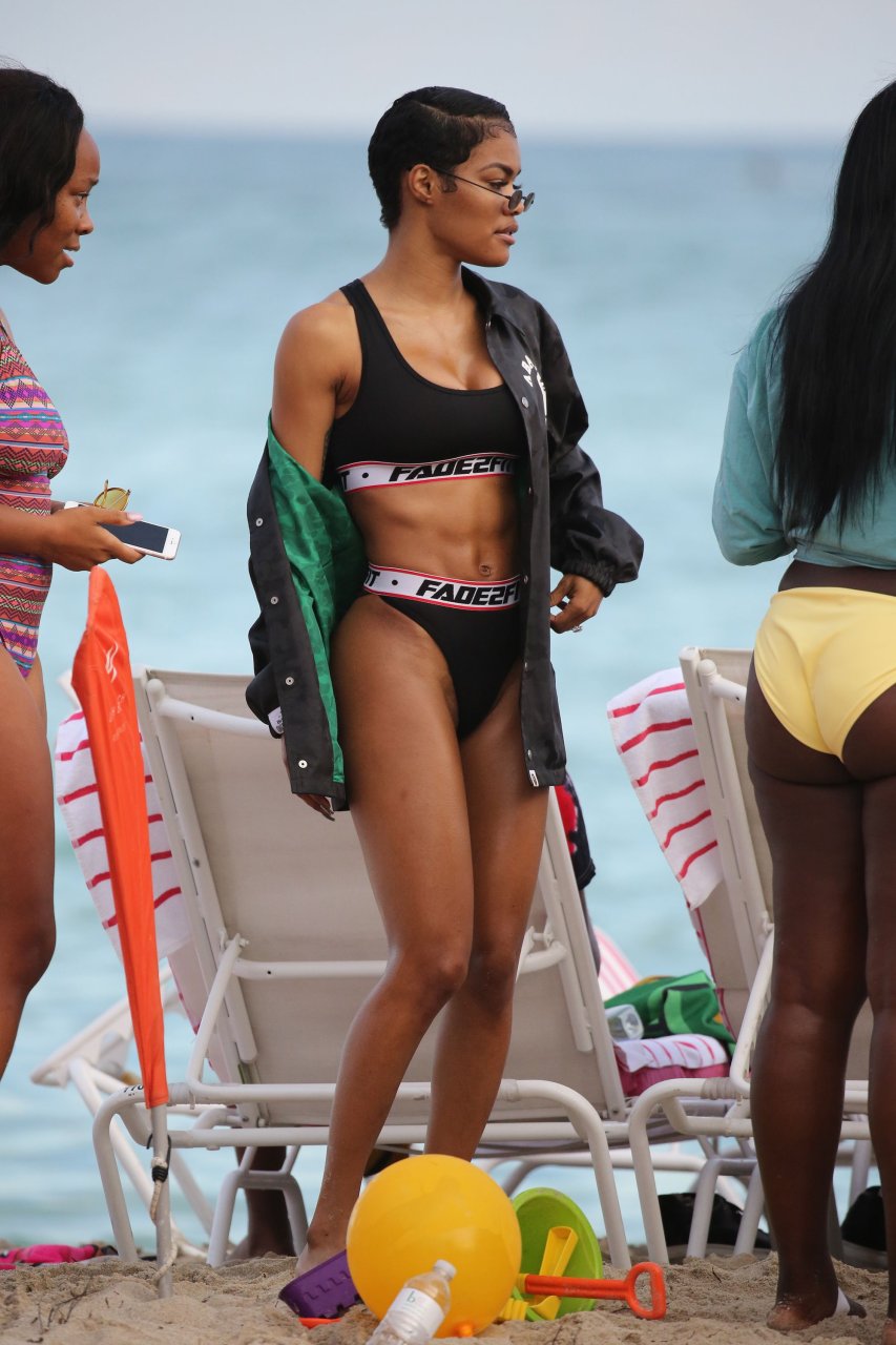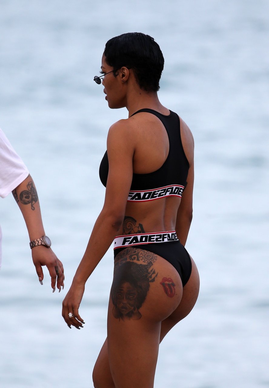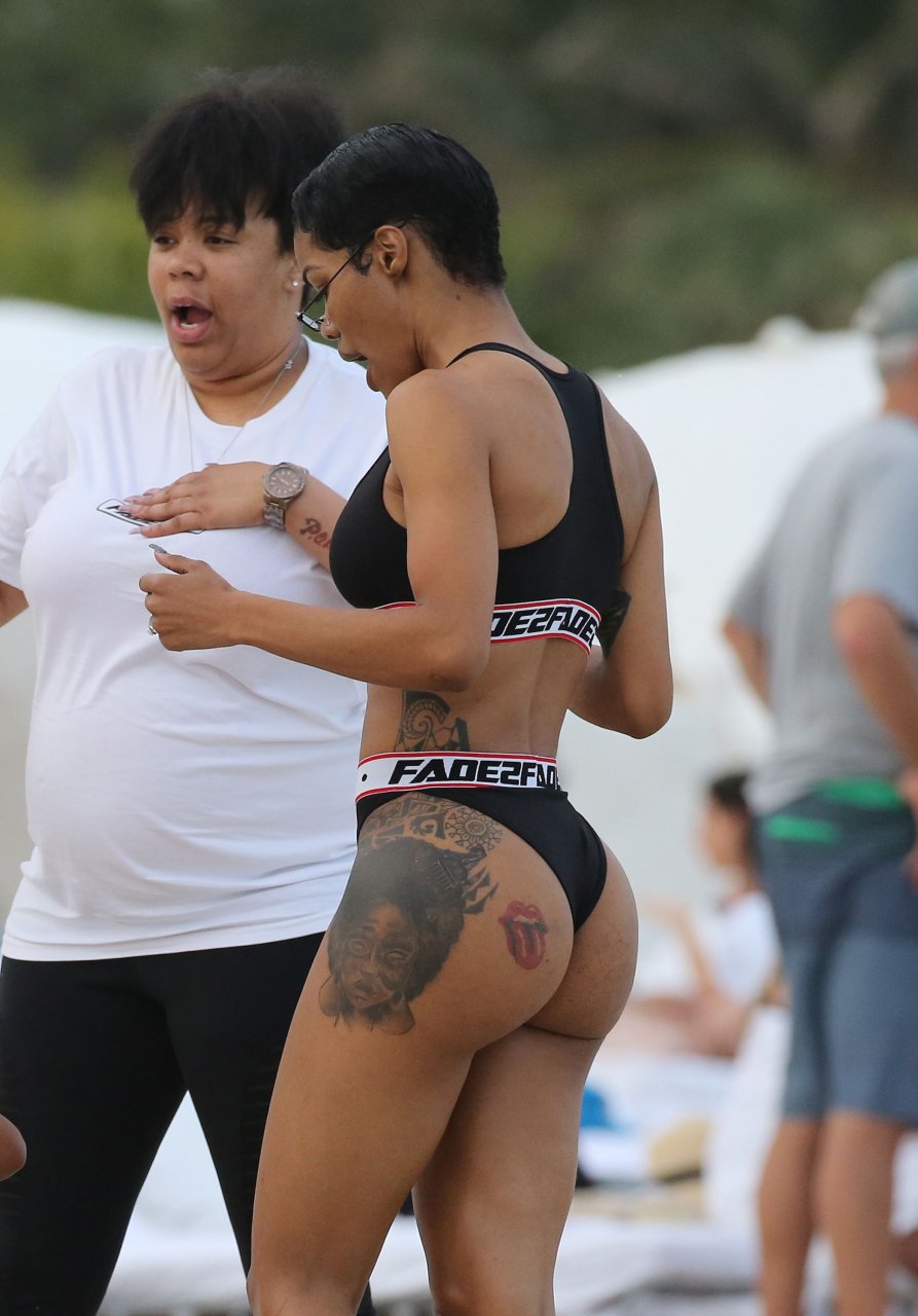 Teyana Taylor muestra sus abdominales marcados y sus curvas mientras disfruta de la playa con un bikini negro en Miami, 01/01/2018. Teyana Taylor es cantante y actriz (Honey 4). Edad: 27.