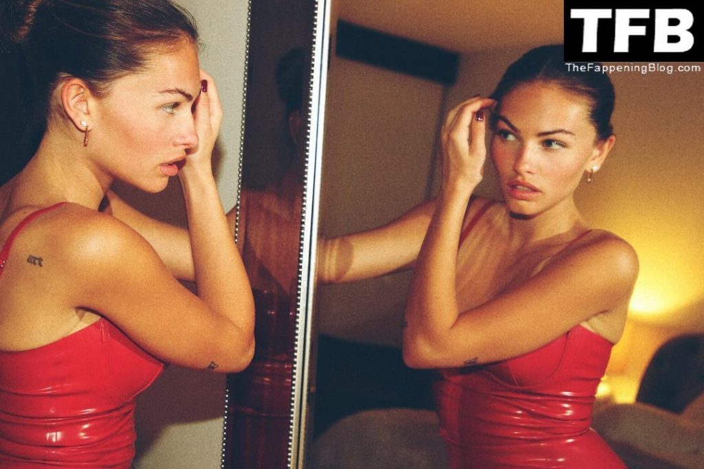 Thylane Blondeau muestra sus pechos sexys mientras posa con un vestido de látex rojo en una sesión de fotos de Allison Elalouf (2022).
