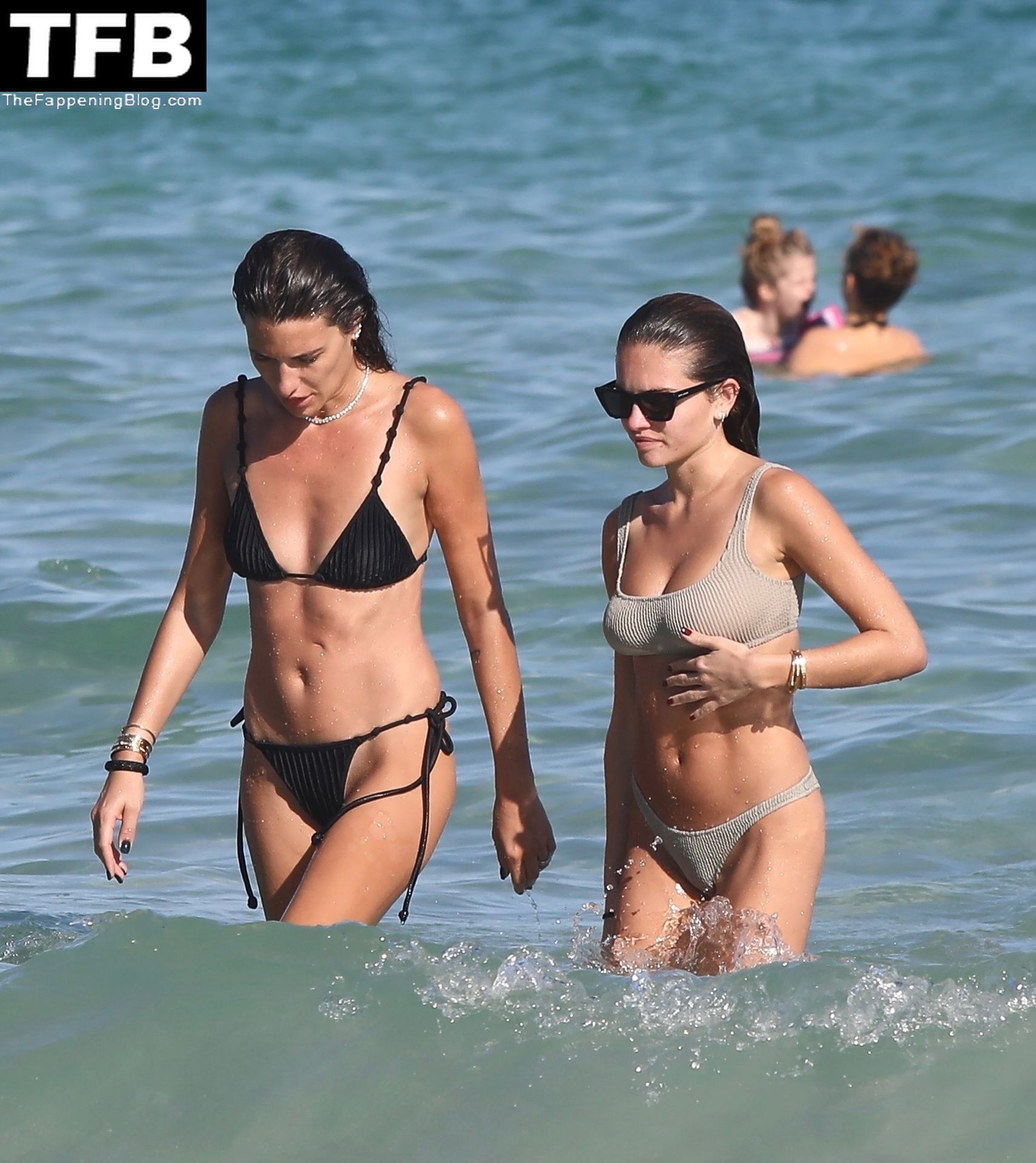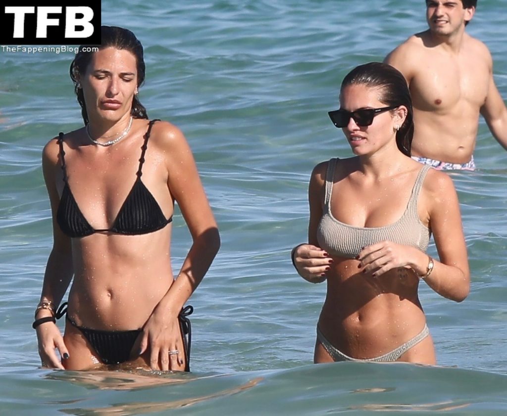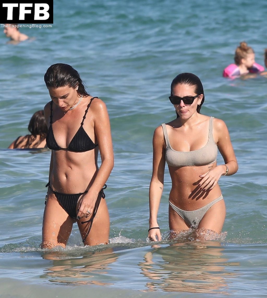 La modelo francesa Thylane Blondeau está acompañada por una amiga para un baño en Miami Beach, 30/12/2021. La ex “Chica Más Bella del Mundo” lleva un bikini de dos piezas de color natural y gafas de sol oscuras durante la diversión junto a la playa.
