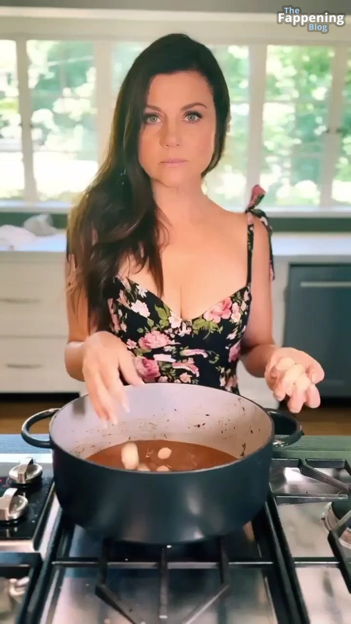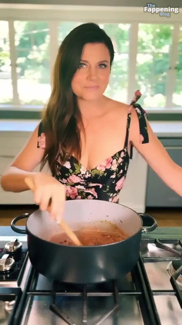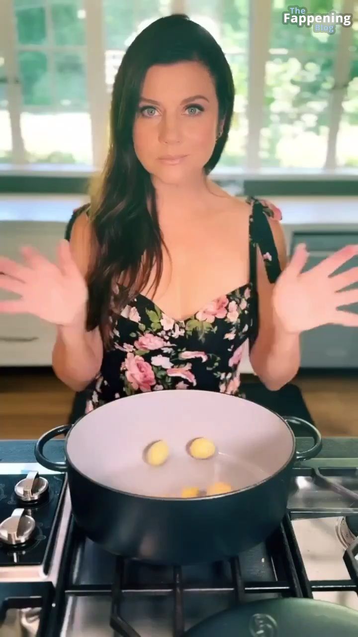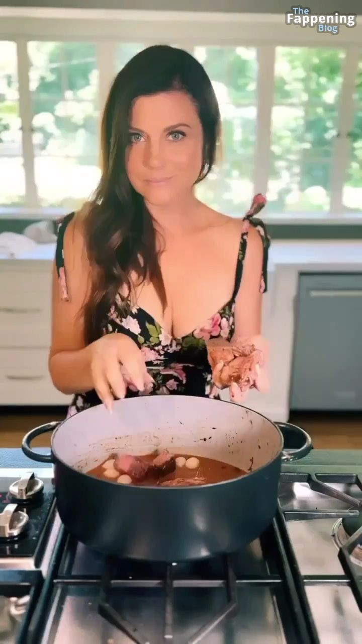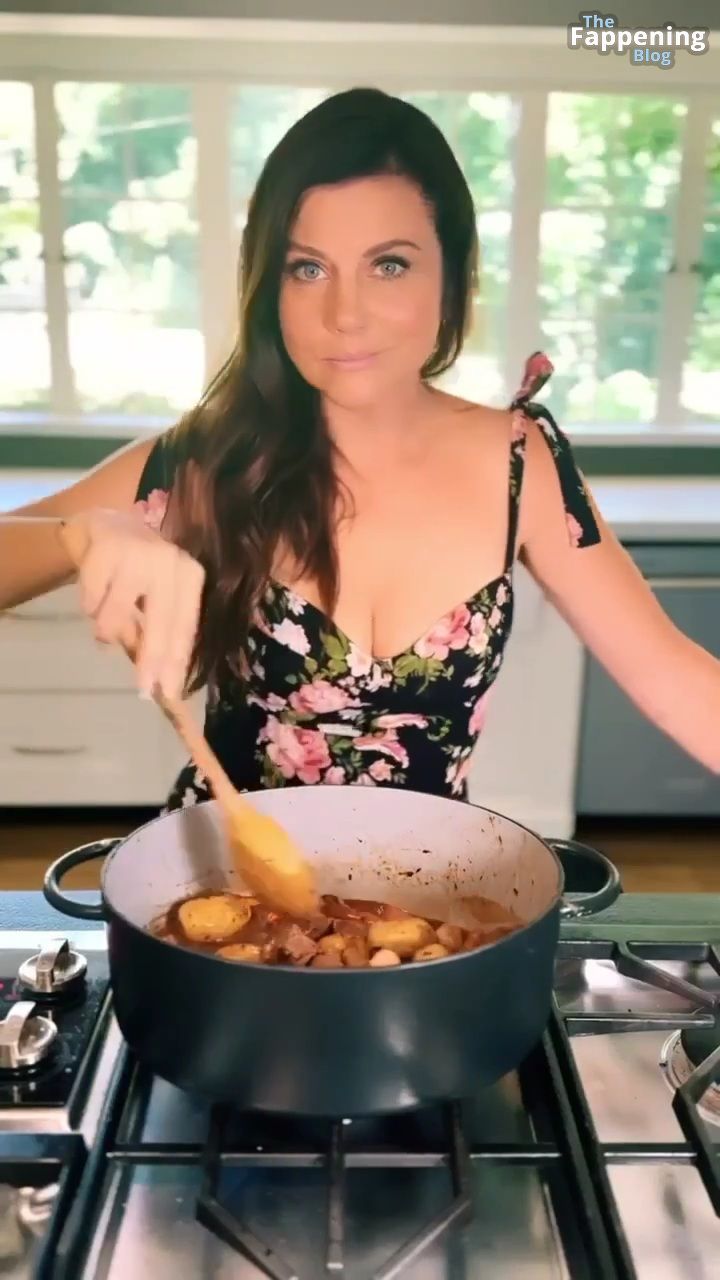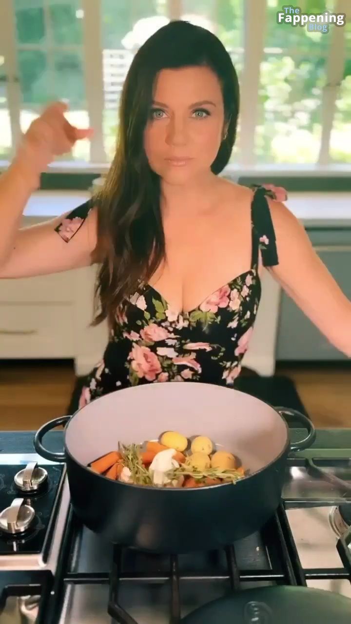 Las fotos y un video de Tiffani Thiessen se tratan de mostrar un escote impresionante con su generoso busto en un vestido muy escotado mientras se ensucia en su cocina, mostrando sus habilidades culinarias.