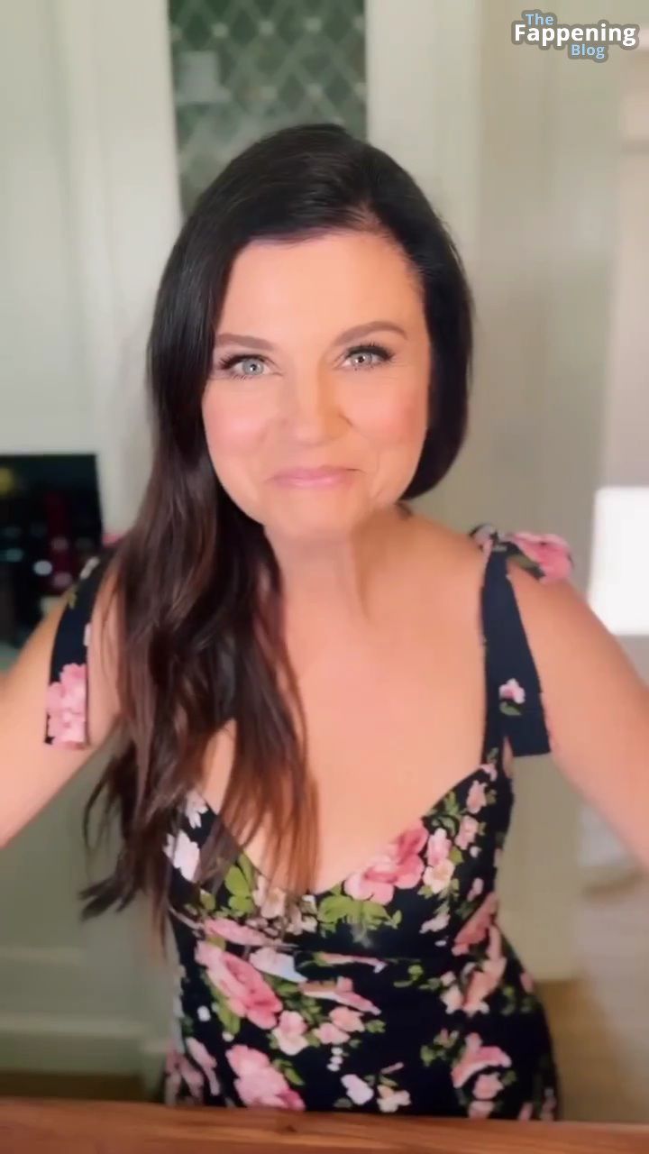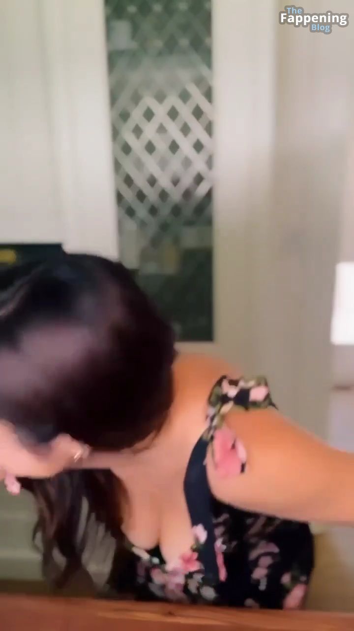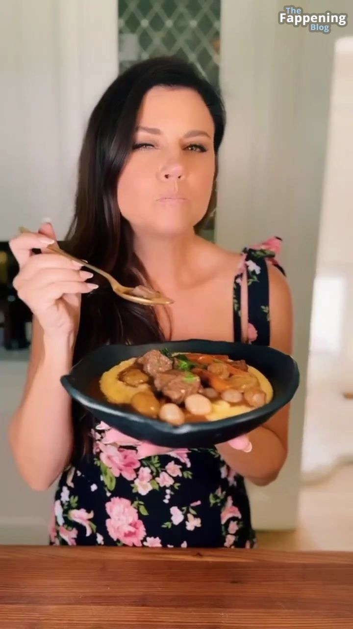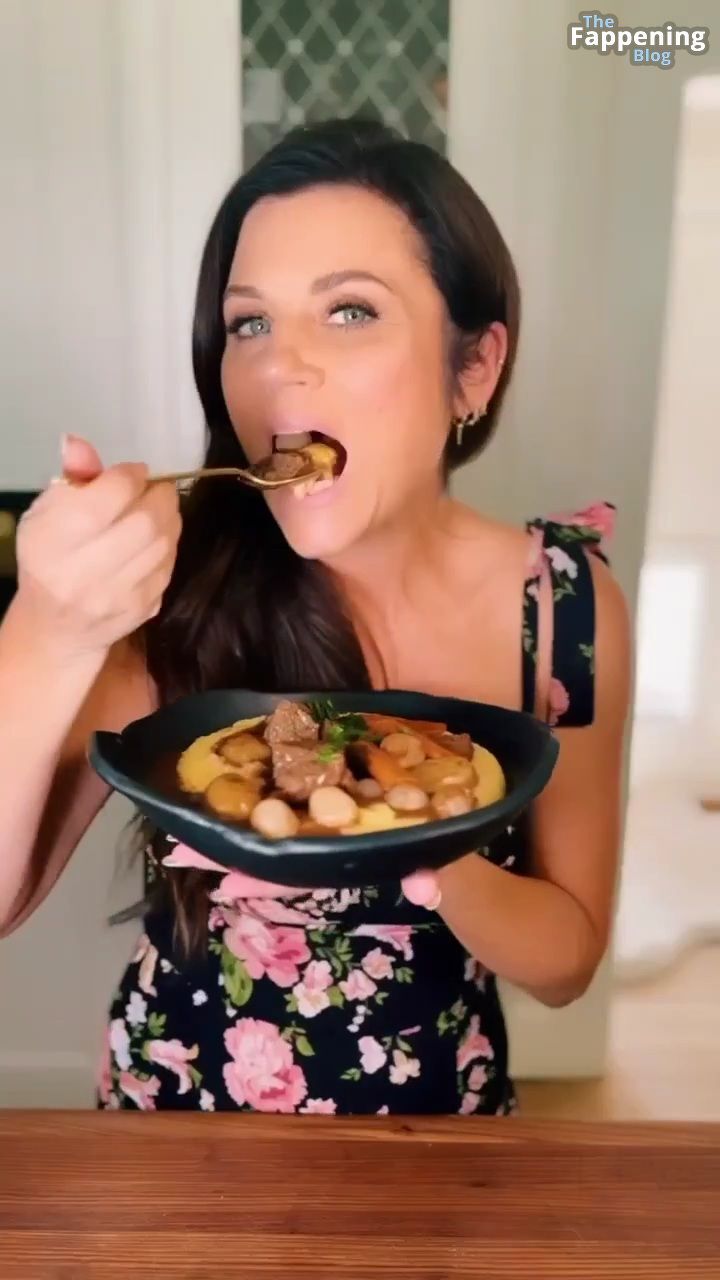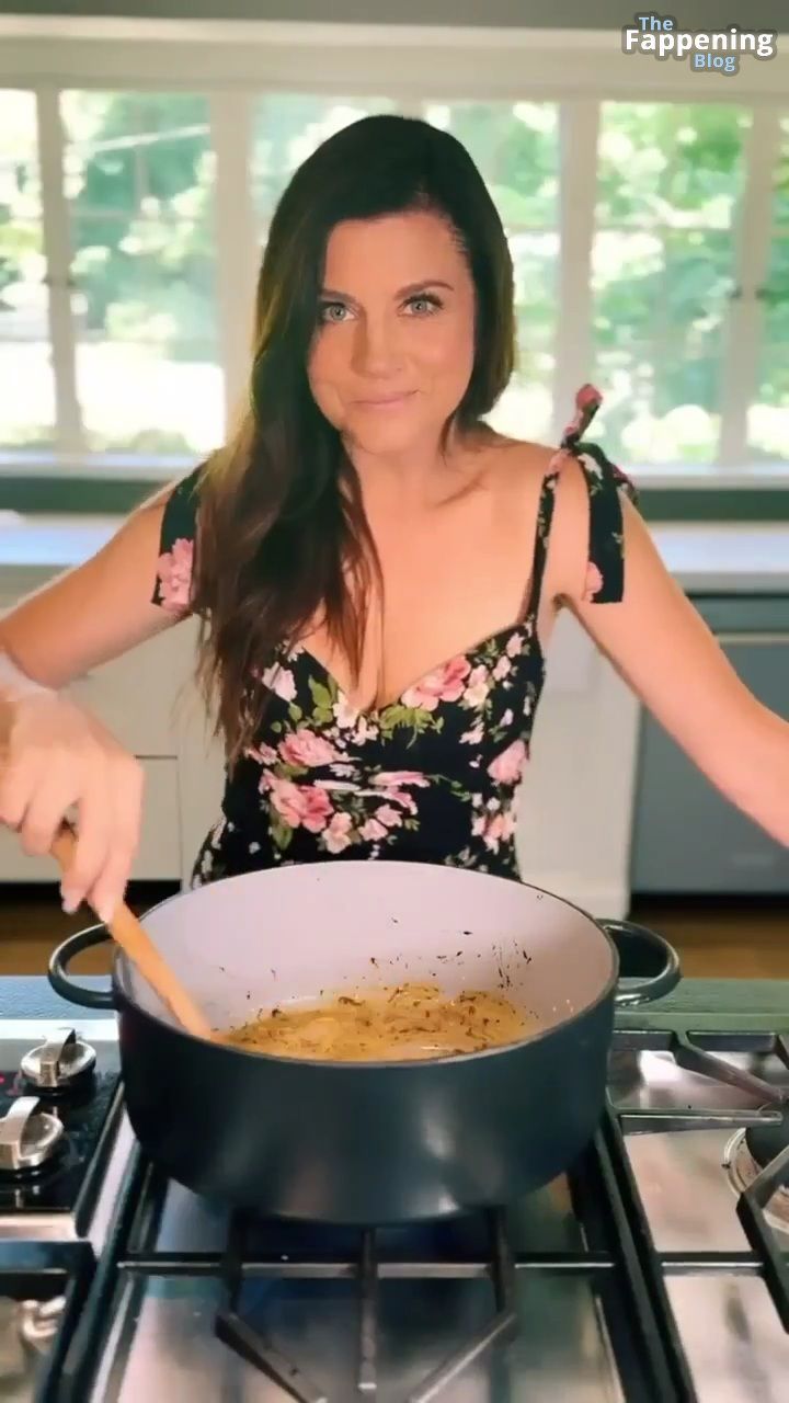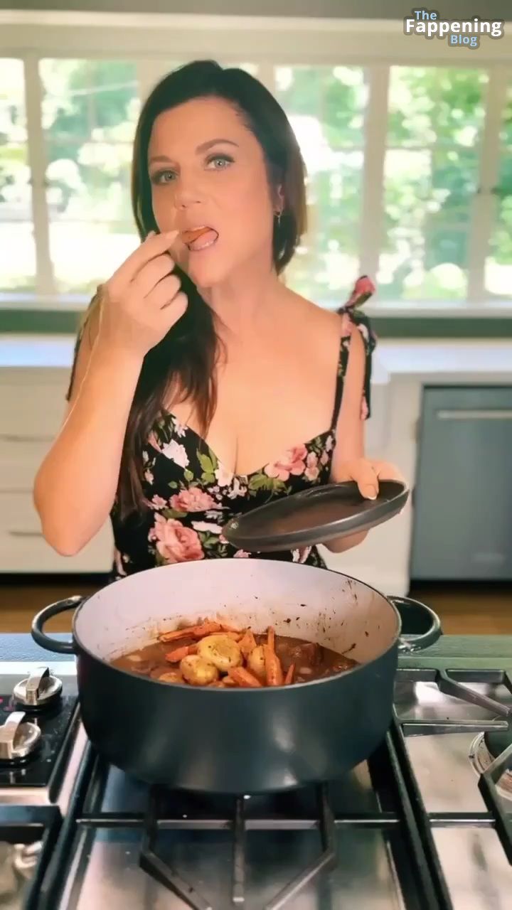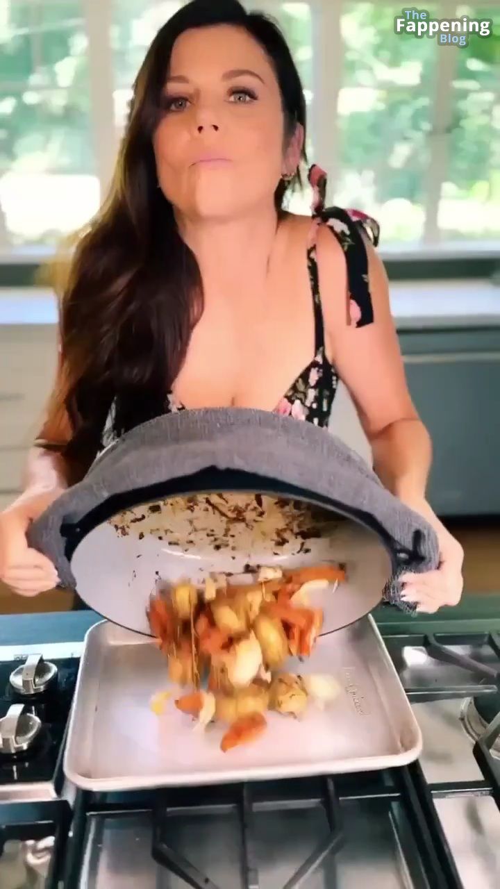 Las fotos y un video de Tiffani Thiessen se tratan de mostrar un escote impresionante con su generoso busto en un vestido muy escotado mientras se ensucia en su cocina, mostrando sus habilidades culinarias.