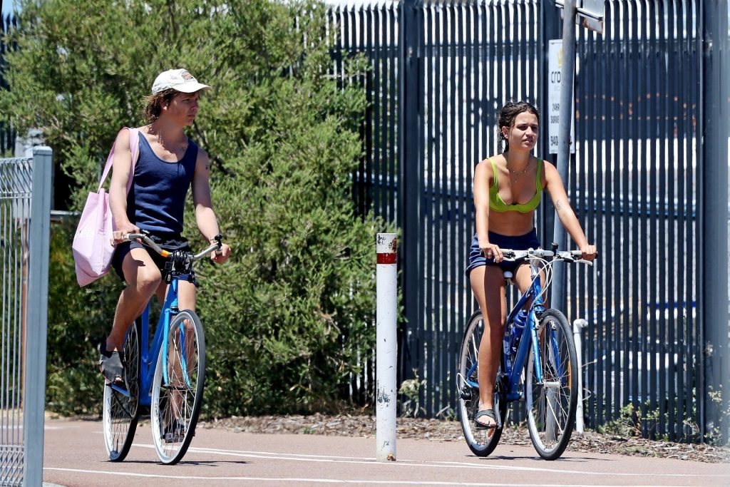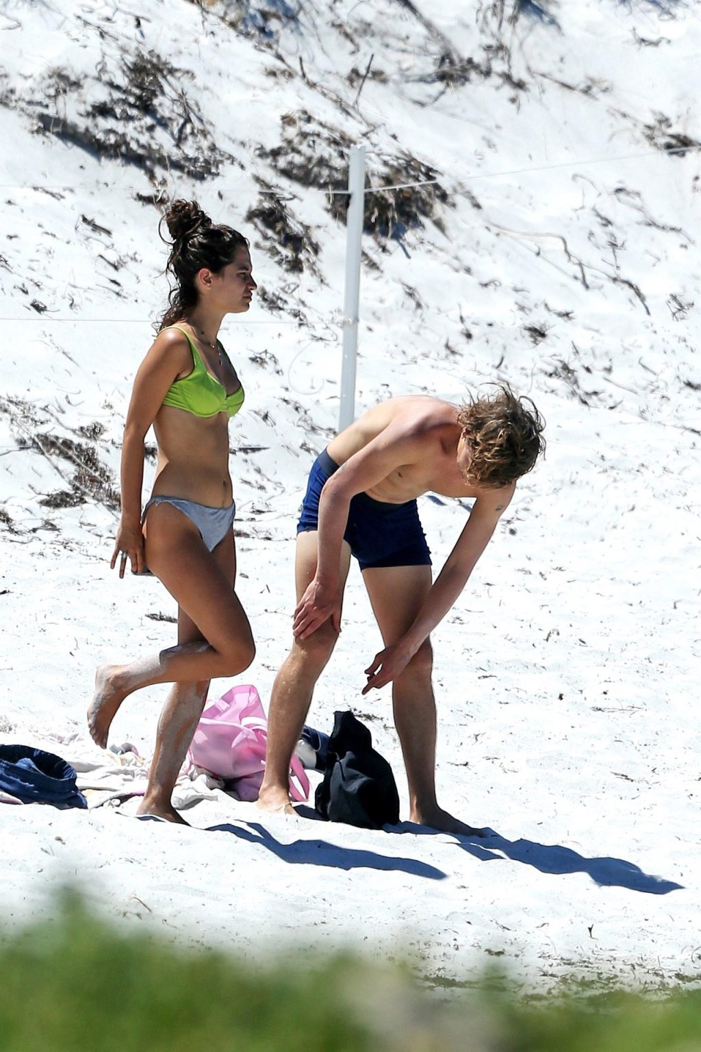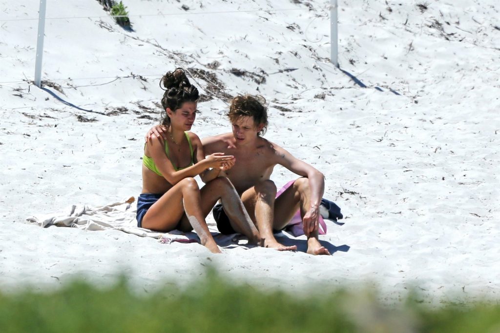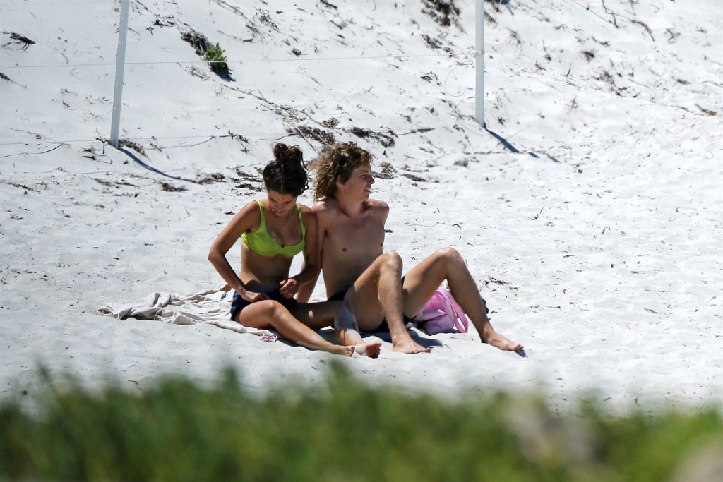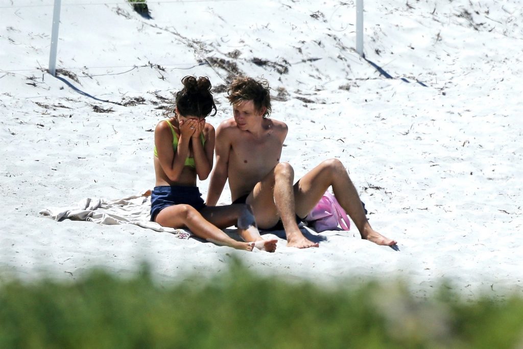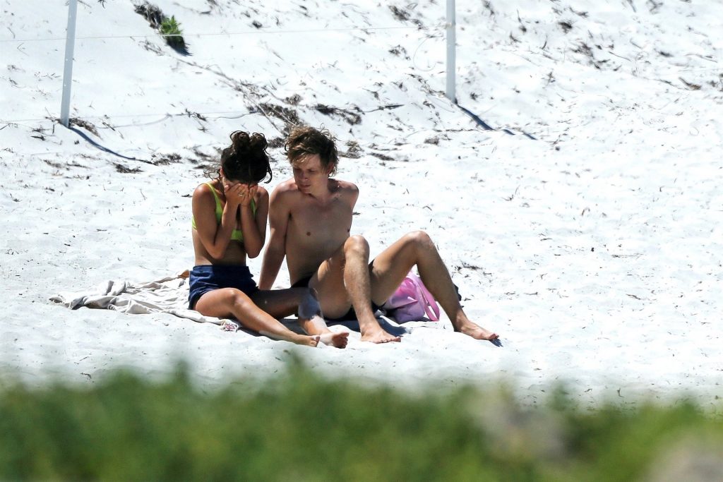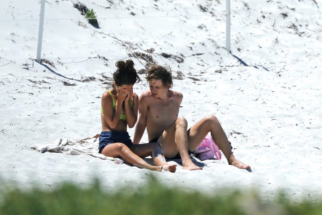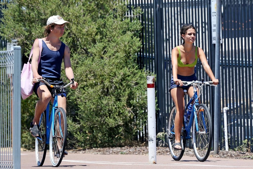 Tiger Lily Hutchence (23) está completamente enamorada del líder de Pond, Nick Allbrook, en la playa de Perth, Australia, 30/11/2019. La pareja se desnudó hasta la ropa interior. Tiger Lily parecía estar llorando cuando llegó a la playa antes de que su novio Nick la consolara. La joven pareja jugó en el agua juntos, luciendo muy enamorados antes de subirse a sus bicicletas.