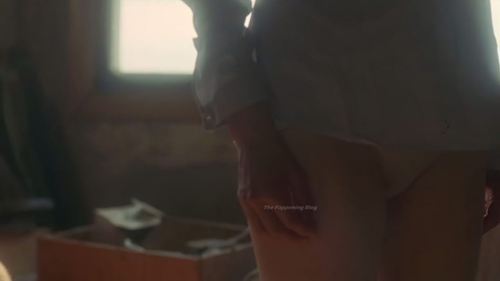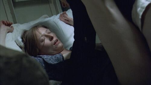Tilda Swinton sin camiseta está acostada de espaldas en la cama mientras un hombre observa una mosca en su pecho mientras ella duerme. Luego se sienta y mete la mano debajo de las sábanas para empezar a masturbar al hombre. El hombre es Young Adam!