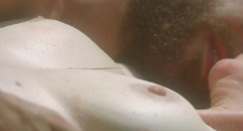 Tilda Swinton is lying fully nude on her back beside a swimming pool, holding a book above her head as she reads while sunbathing. We then see Tilda and a guy having sex in the water, Tilda showing her breasts again as she leans against the side of the pool with the guy in front of her.