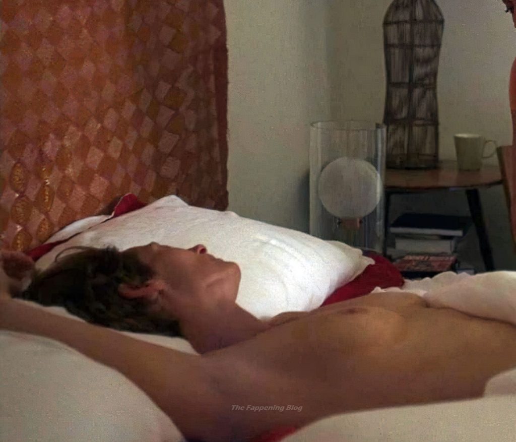 Tilda Swinton is lying naked in bed as a guy runs his hand over her legs, giving us a glimpse of bush and then a good view of her right breast as he moves up next to her.