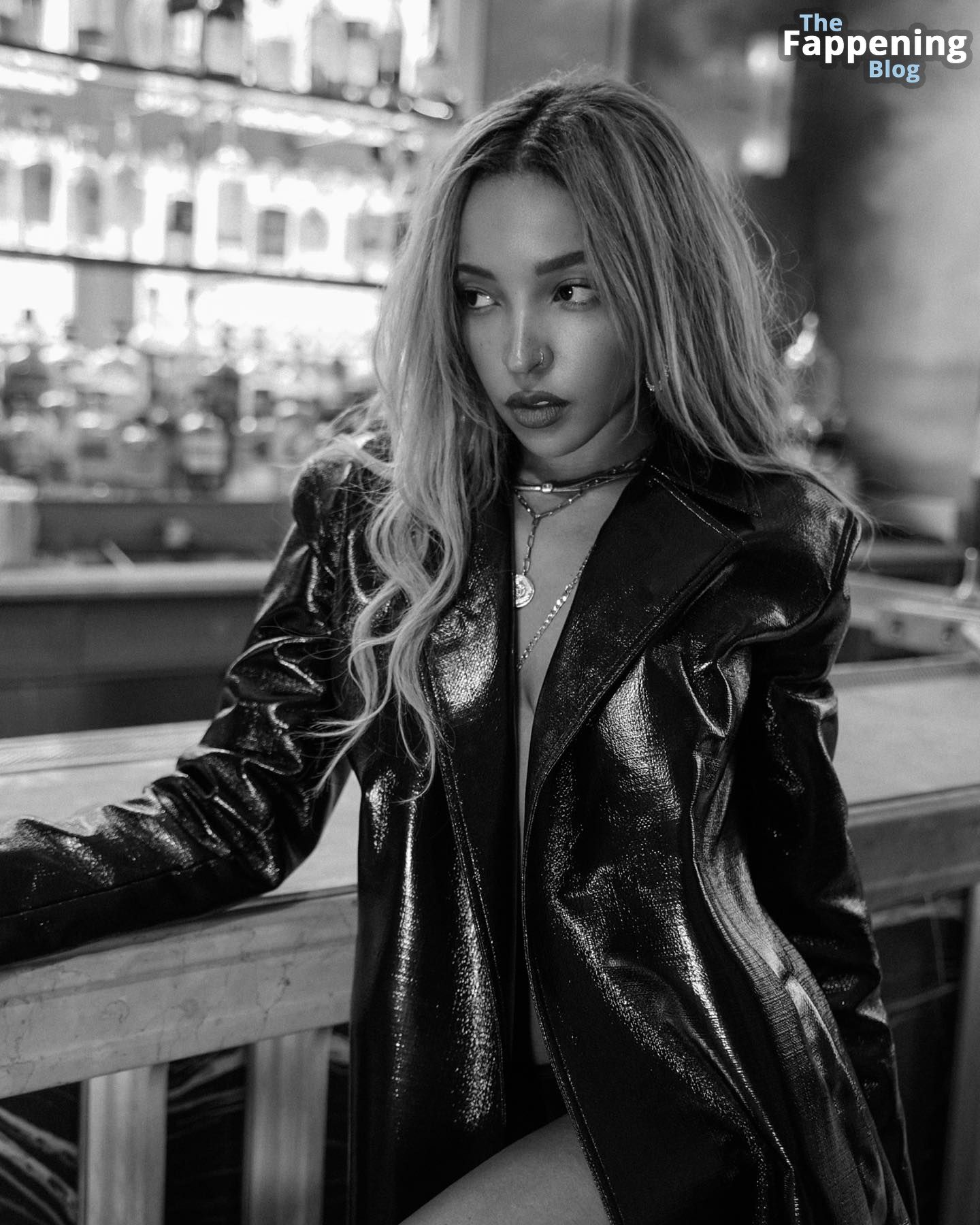 Tinashe está dominando el juego, luciendo un escote feroz, agarrándose esas tetas, mostrando sus piernas asesinas y luciendo ese cuerpo de bailarina ajustado con unas sensuales tangas y una chaqueta abierta.