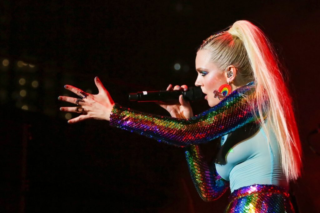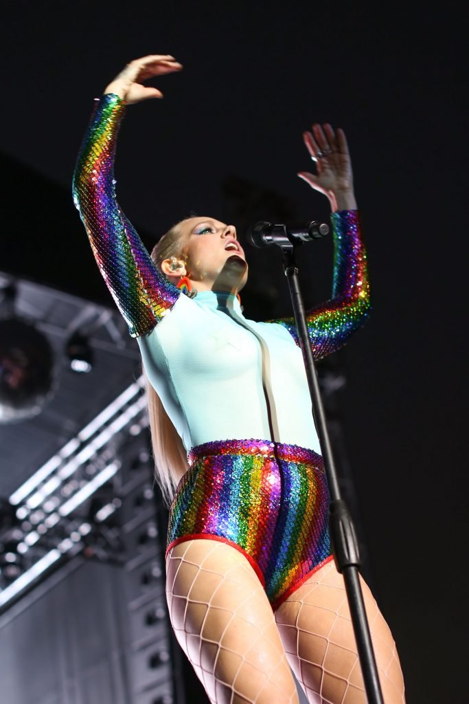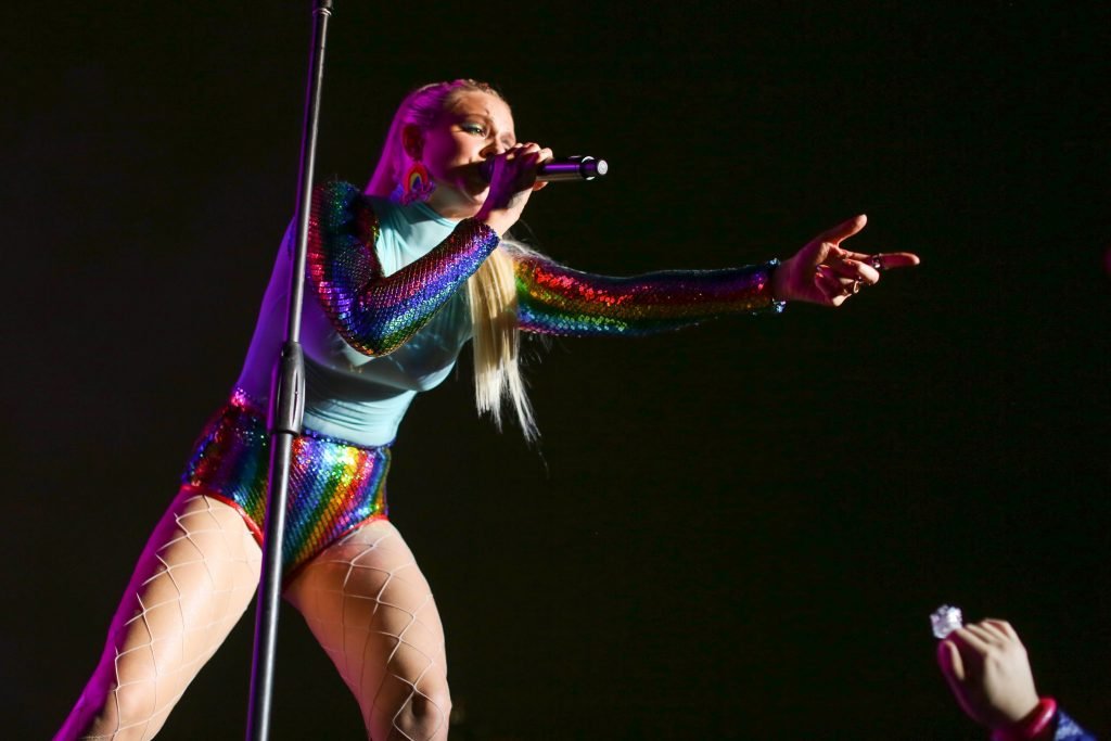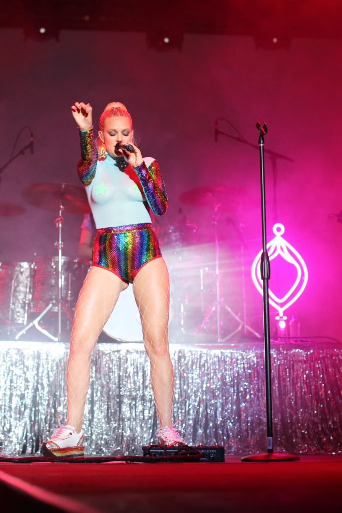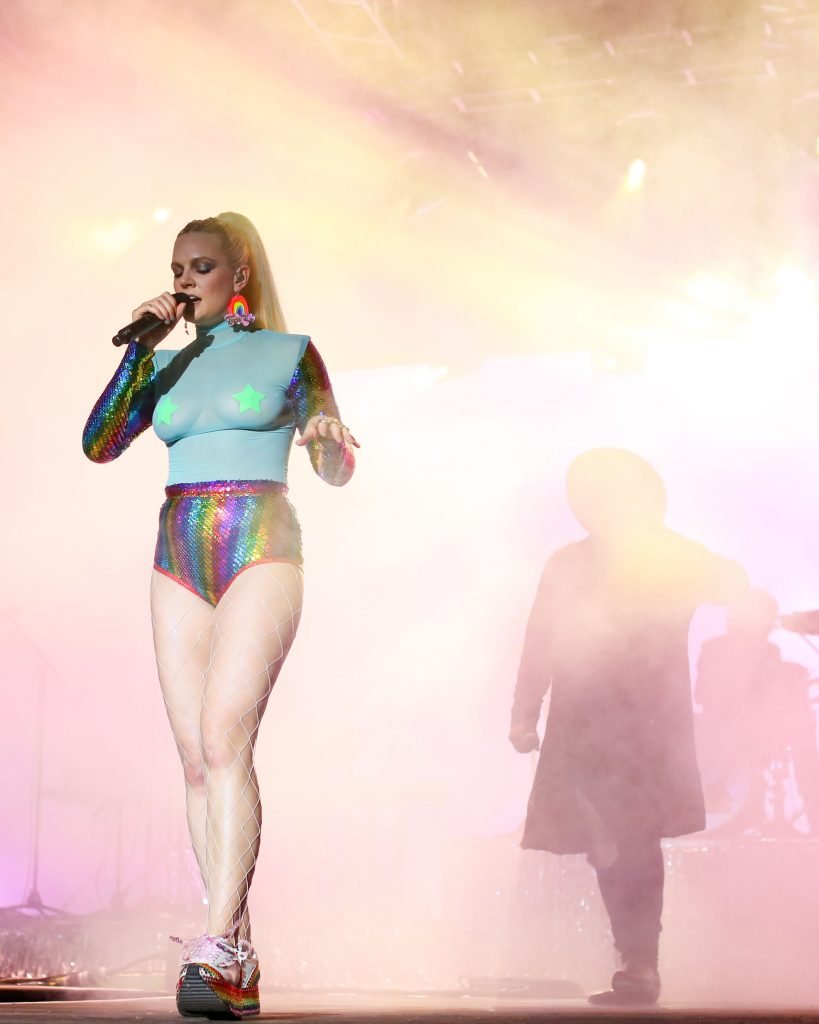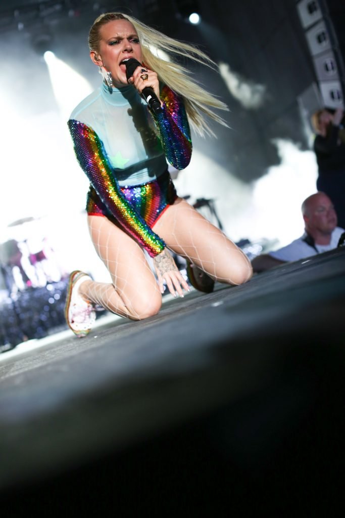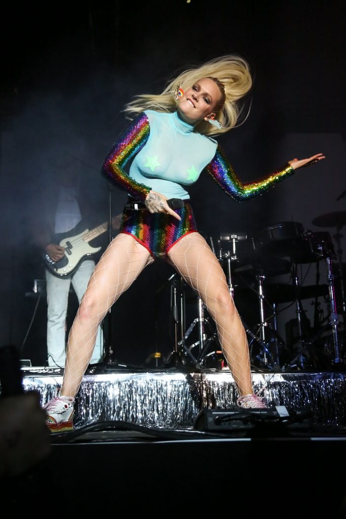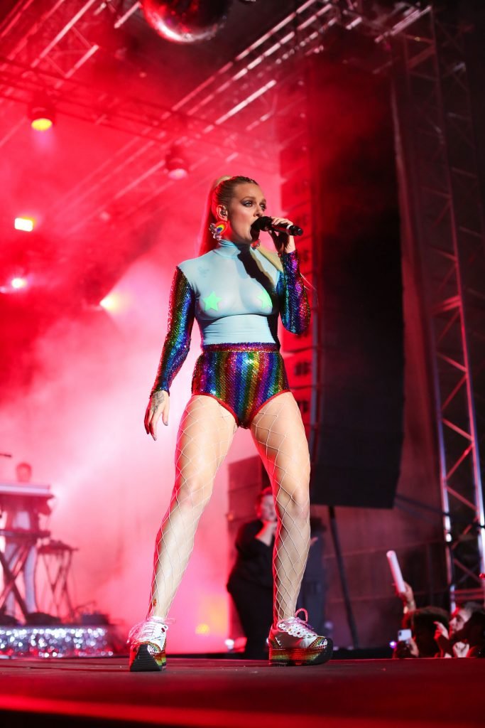 Tove Lo actúa en el escenario en Pride Island en Nueva York, 23/06/2018. La cantante sueca de 30 años llevaba una blusa de malla azul con pasties, a veces mostrando su delgado trasero.