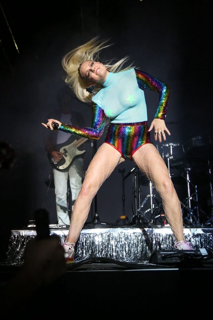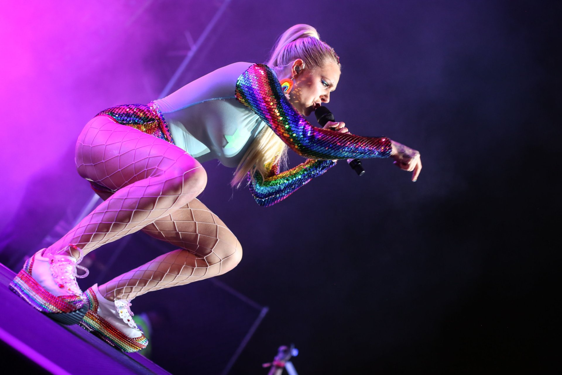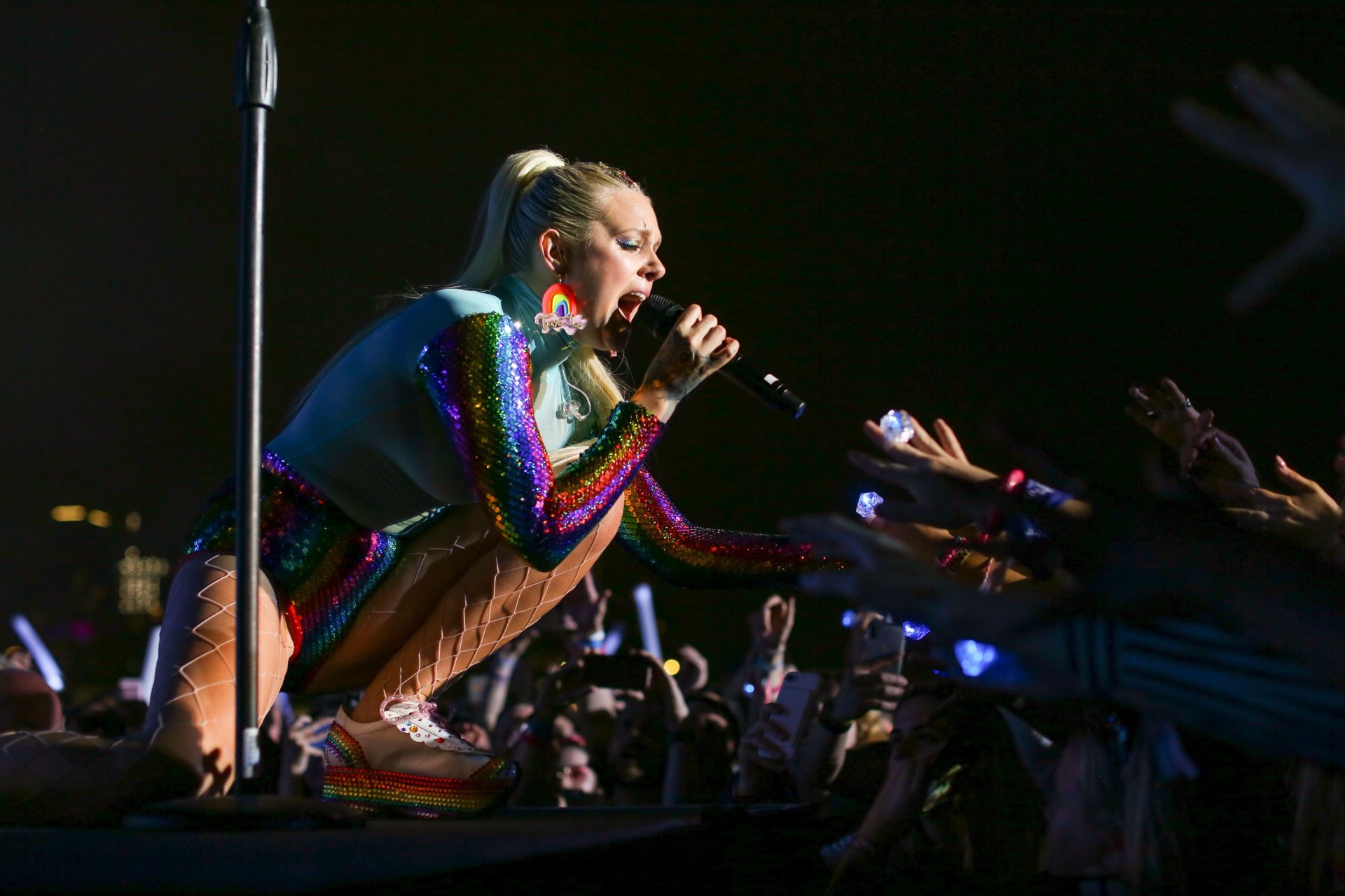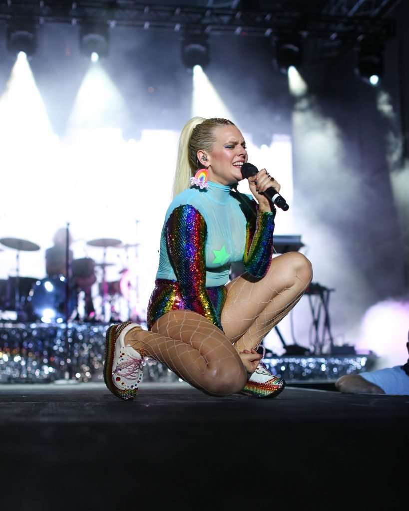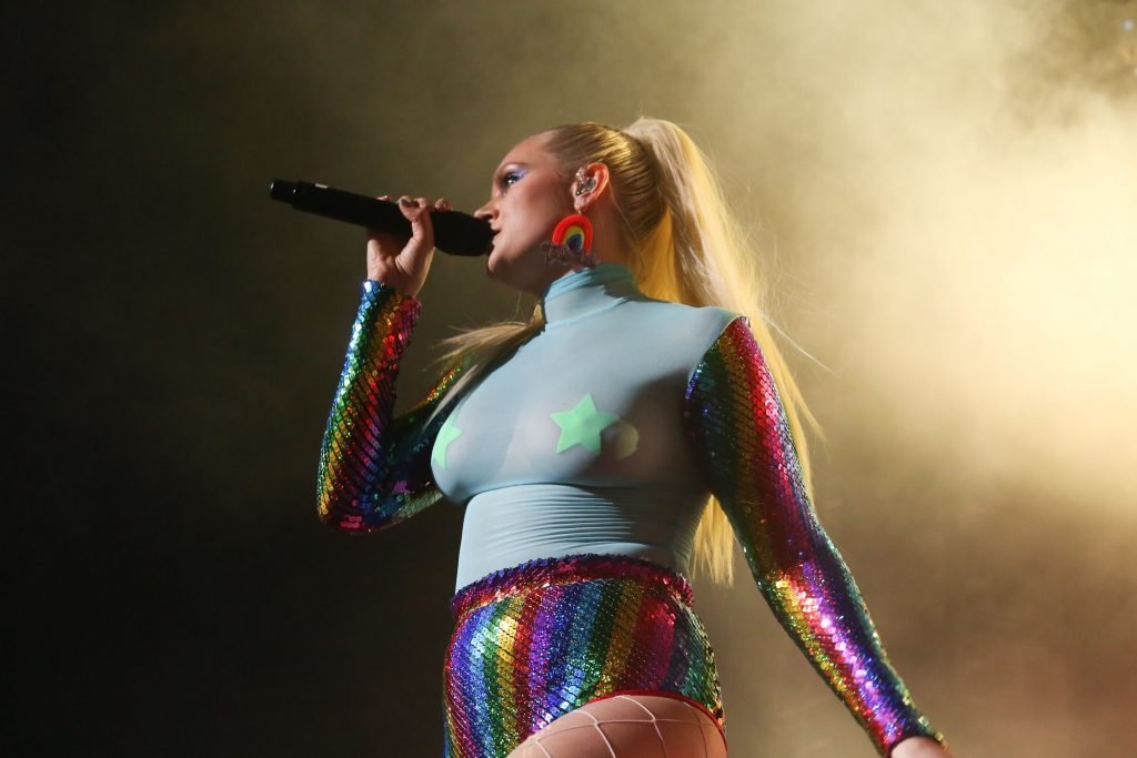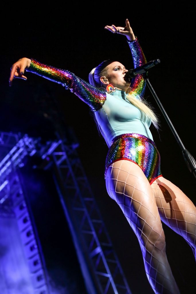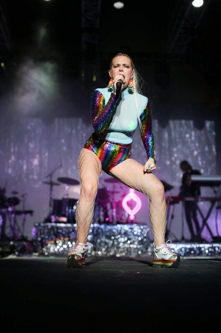 Tove Lo actúa en el escenario en Pride Island en Nueva York, 23/06/2018. La cantante sueca de 30 años llevaba una blusa de malla azul con pasties, a veces mostrando su delgado trasero.