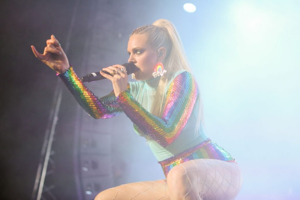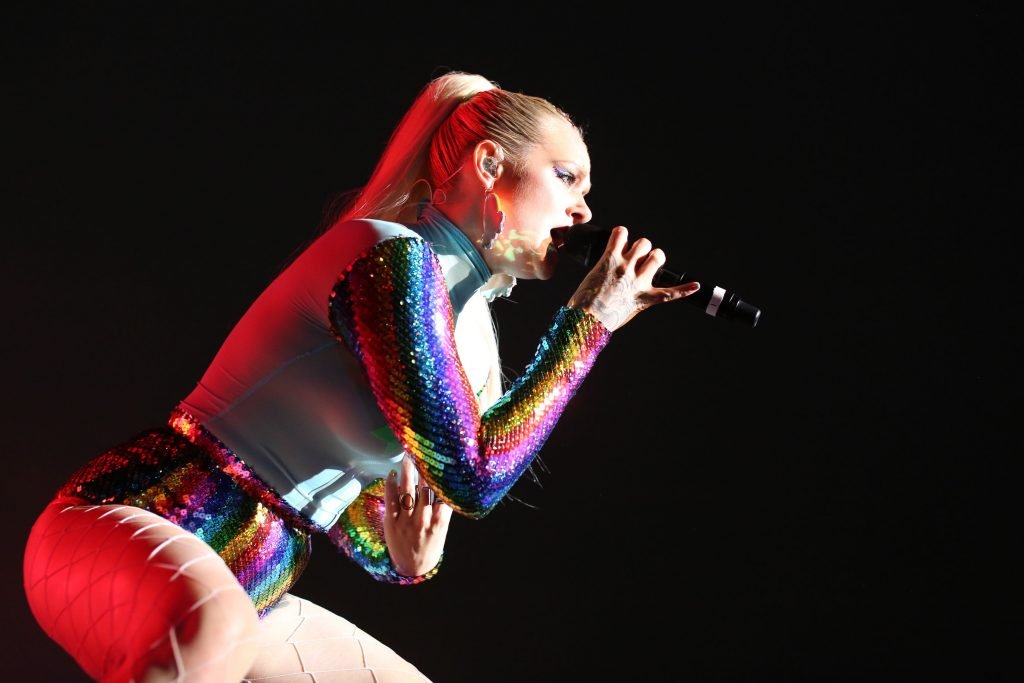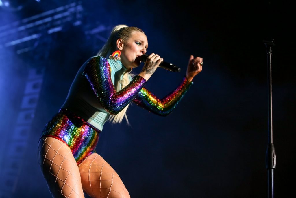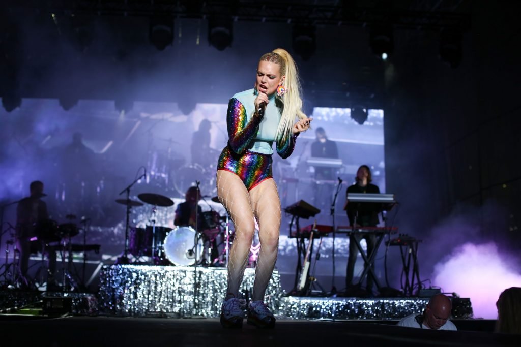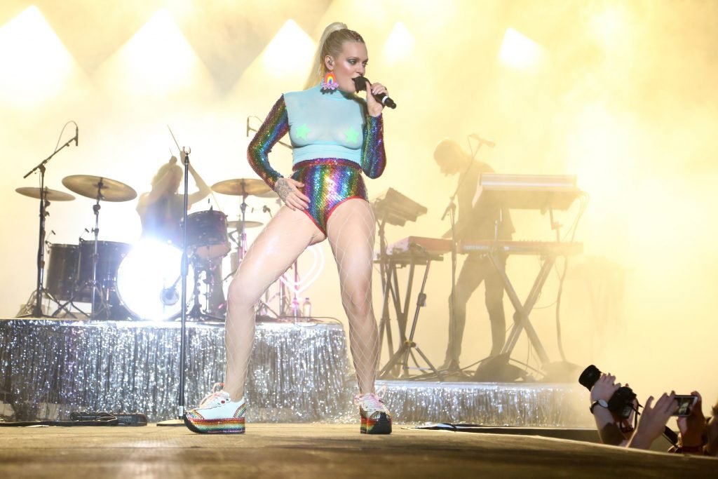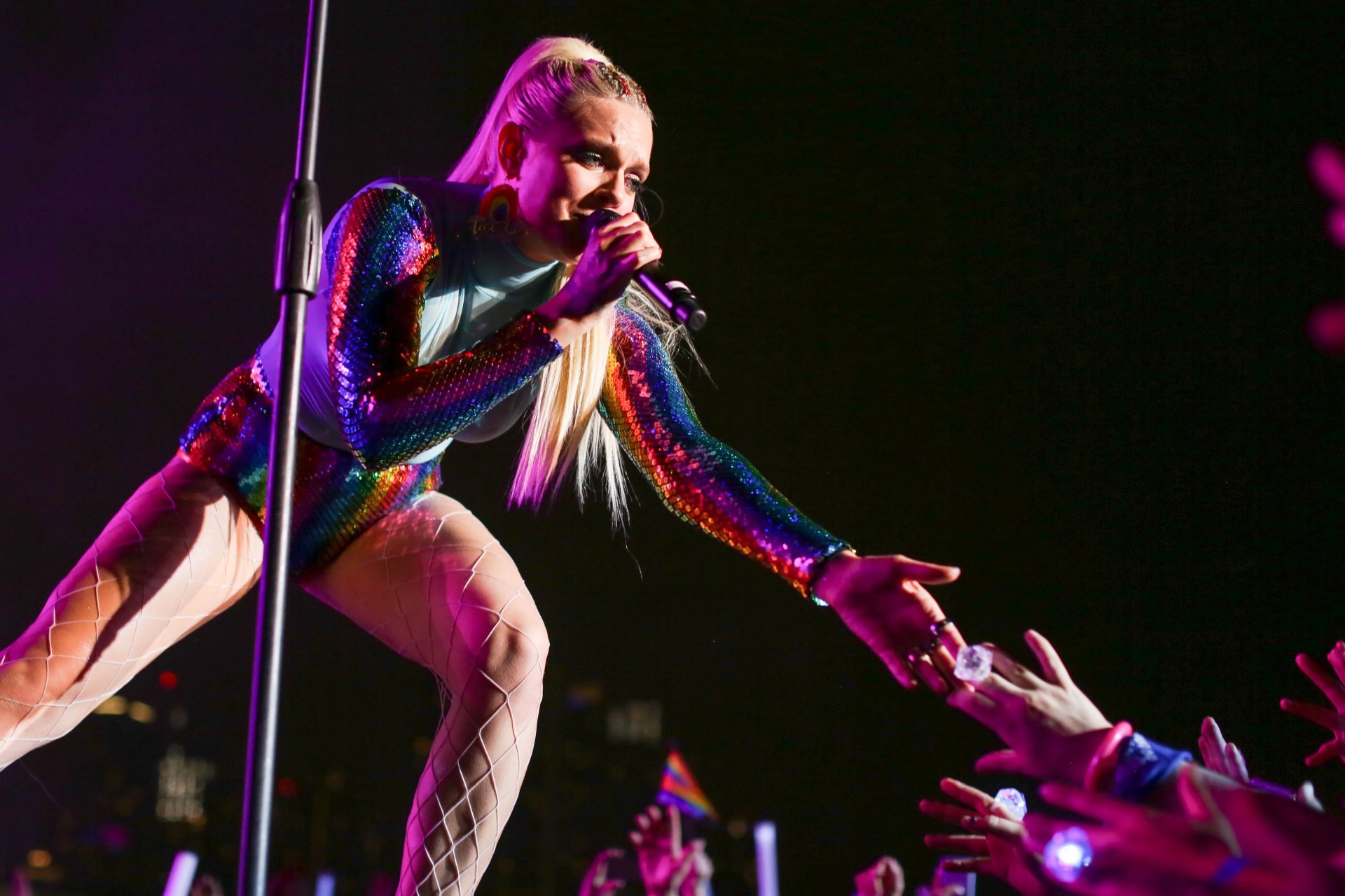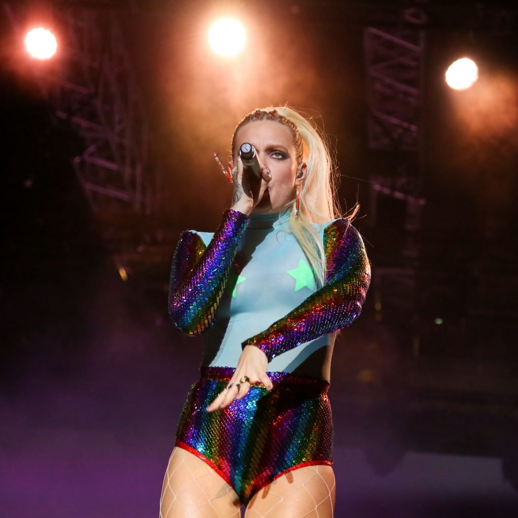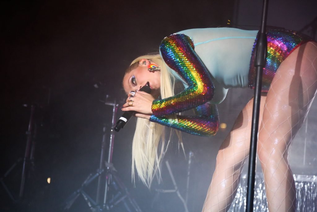 Tove Lo actúa en el escenario en Pride Island en Nueva York, 23/06/2018. La cantante sueca de 30 años llevaba una blusa de malla azul con pasties, a veces mostrando su delgado trasero.