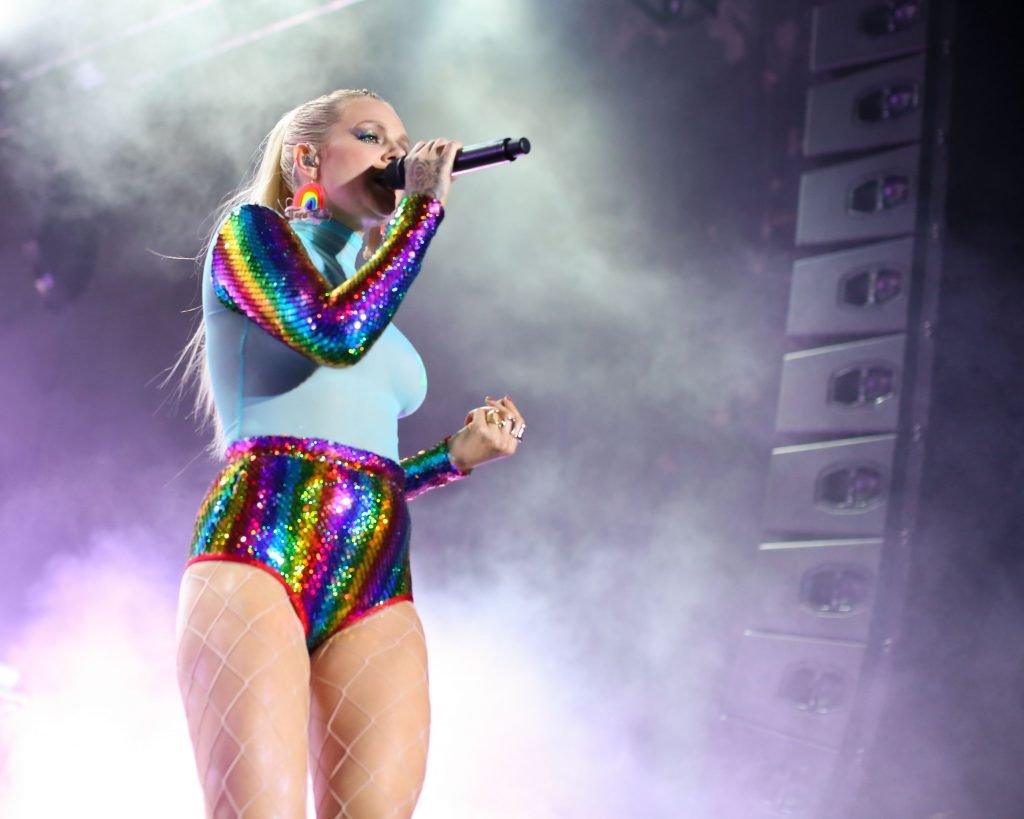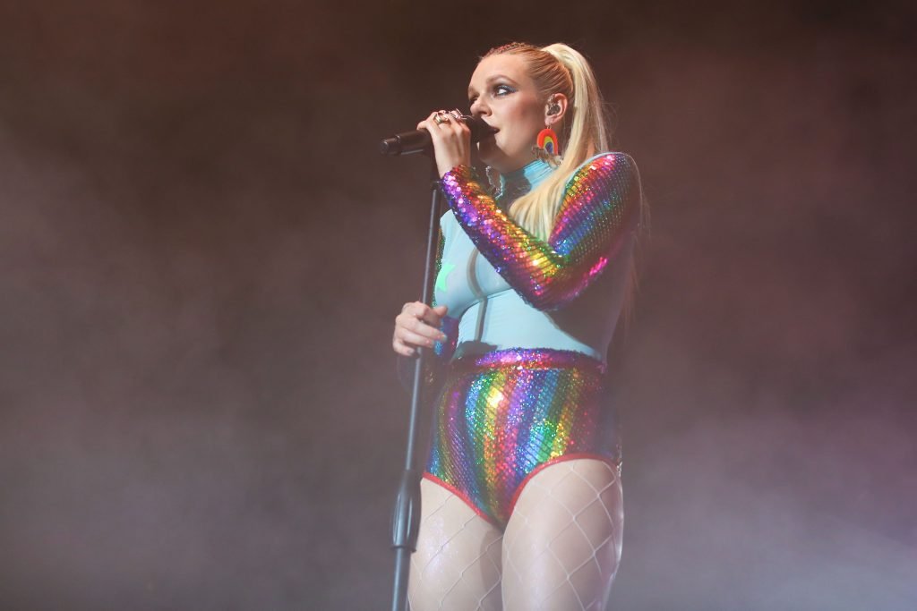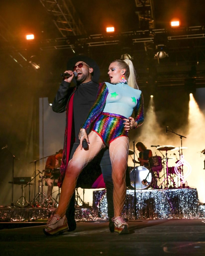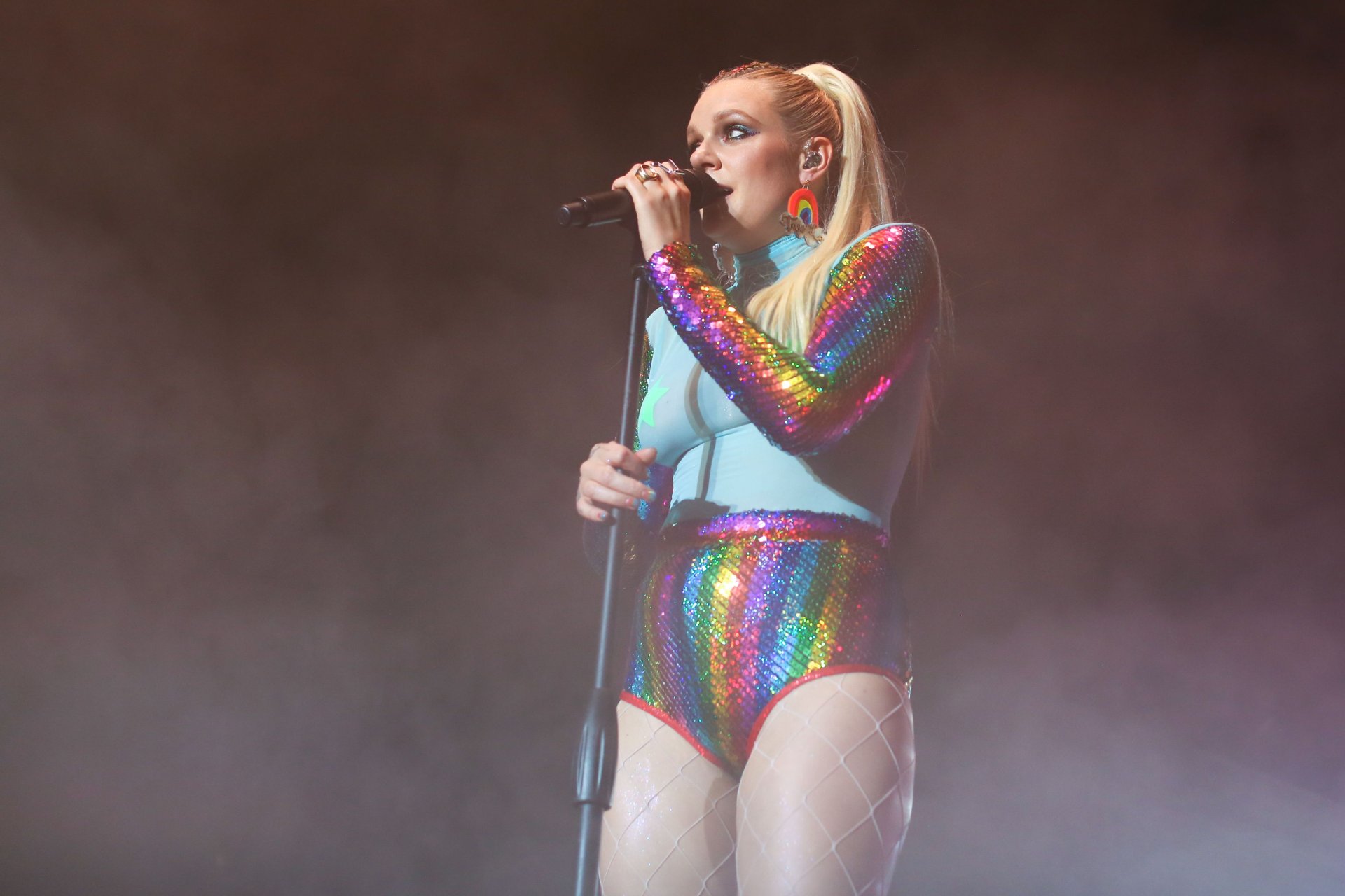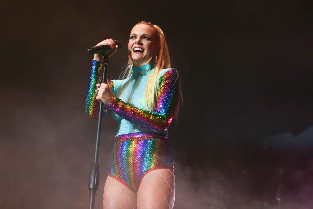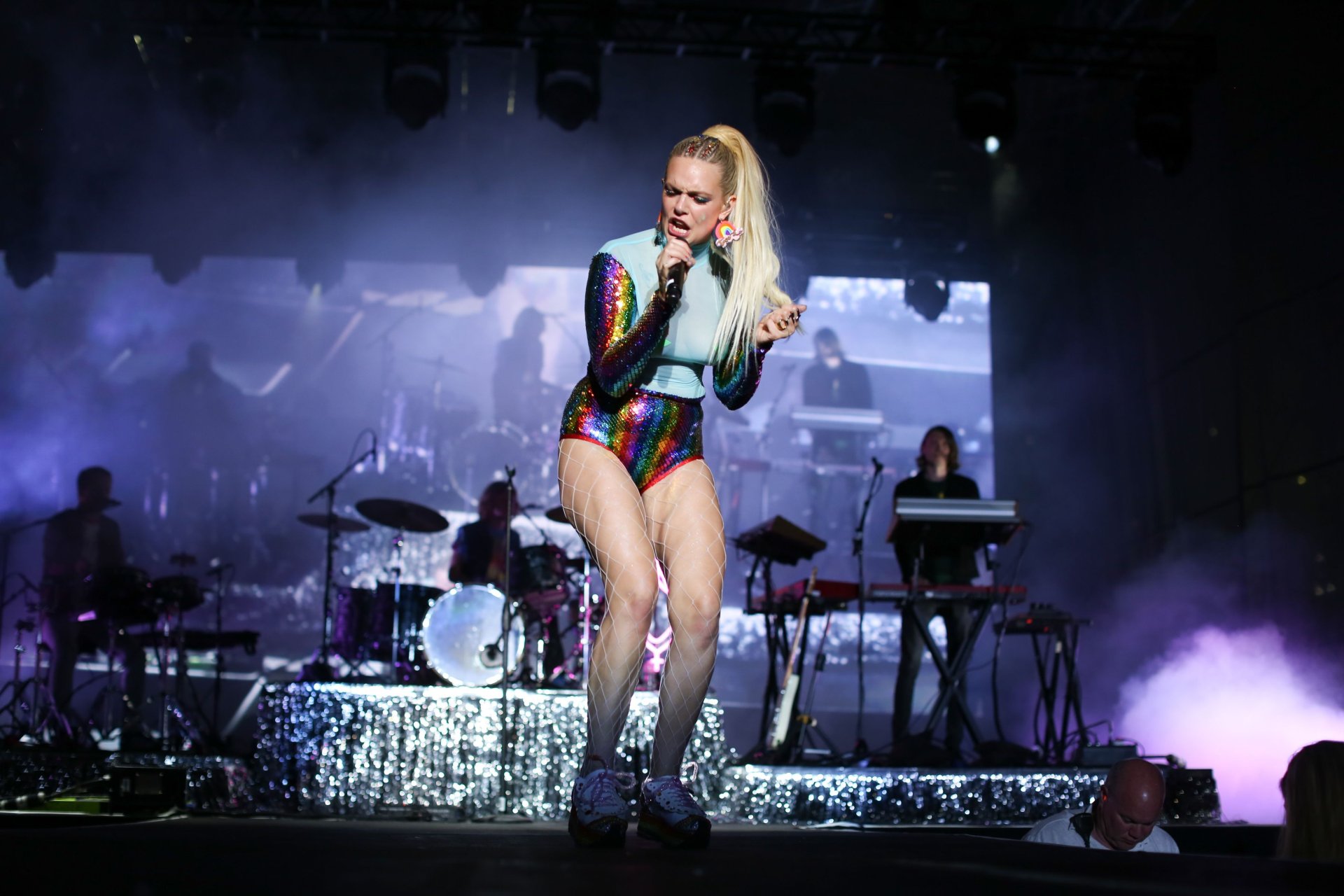Tove Lo actúa en el escenario en Pride Island en Nueva York, 23/06/2018. La cantante sueca de 30 años llevaba una blusa de malla azul con pasties, a veces mostrando su delgado trasero.