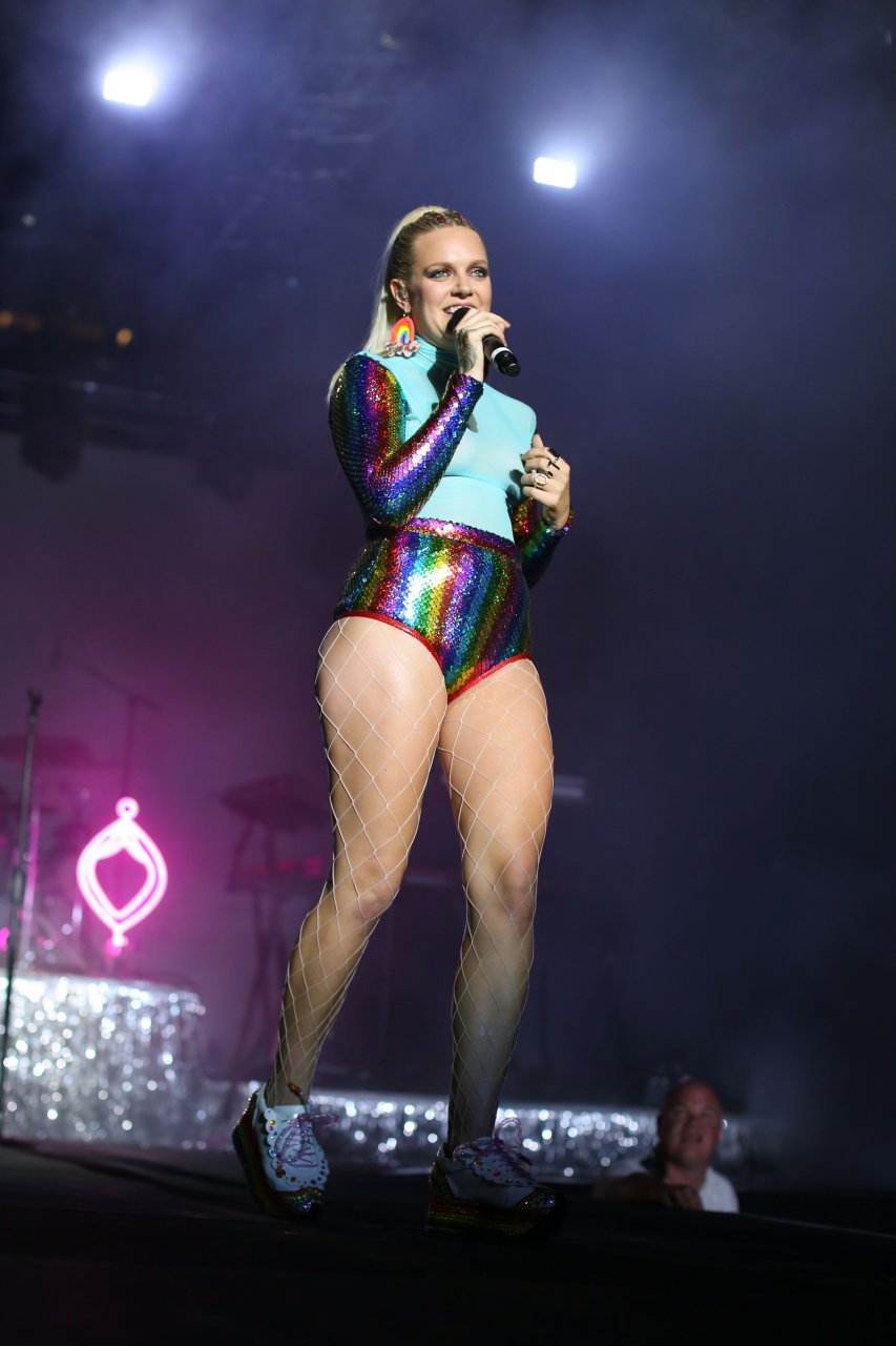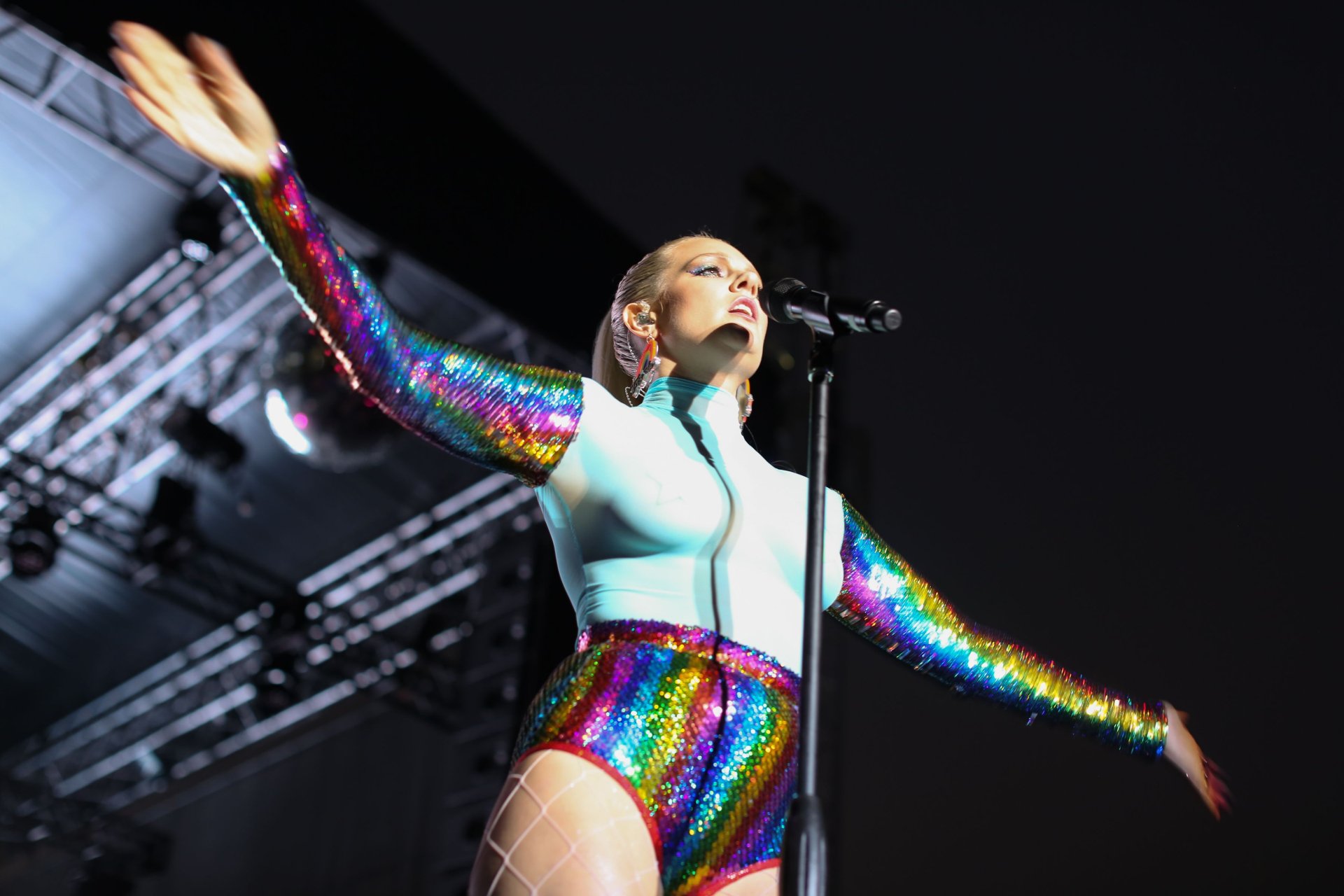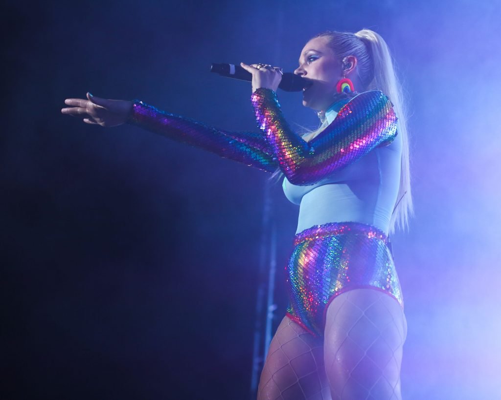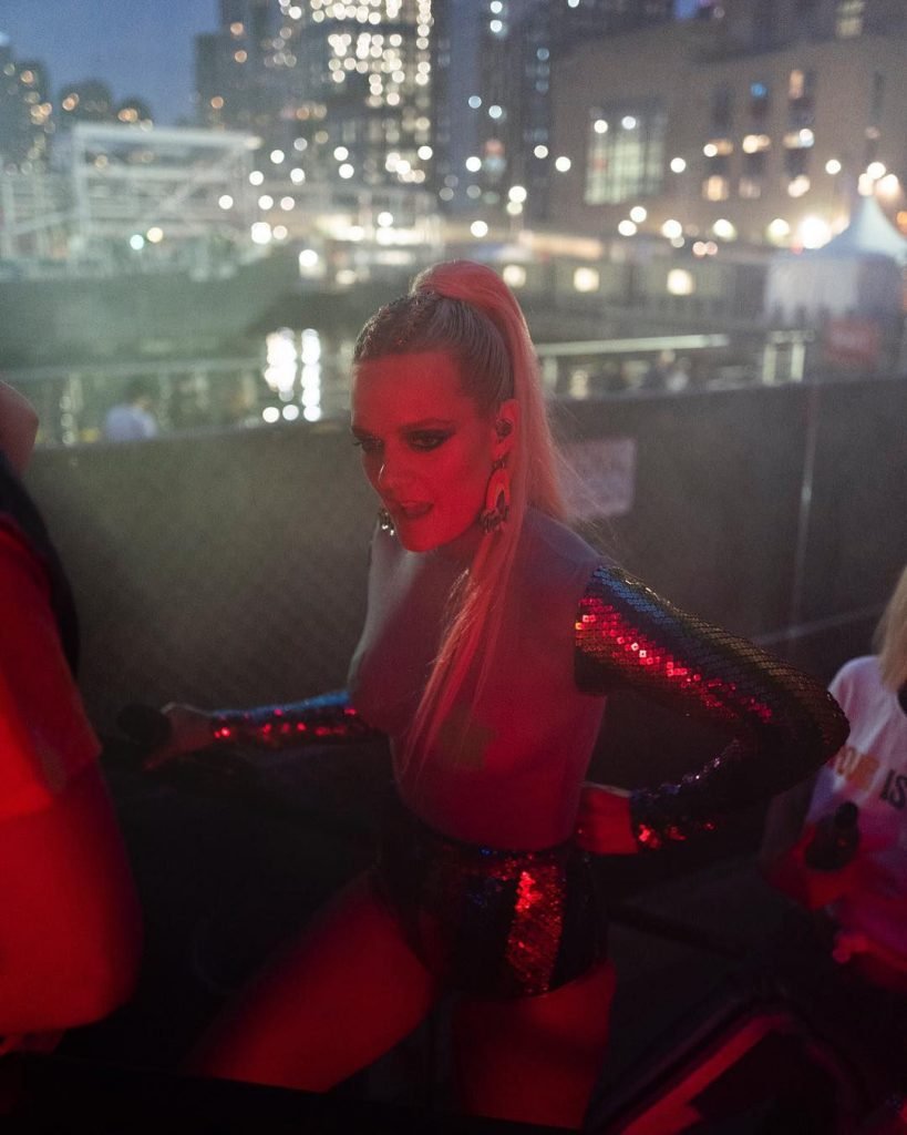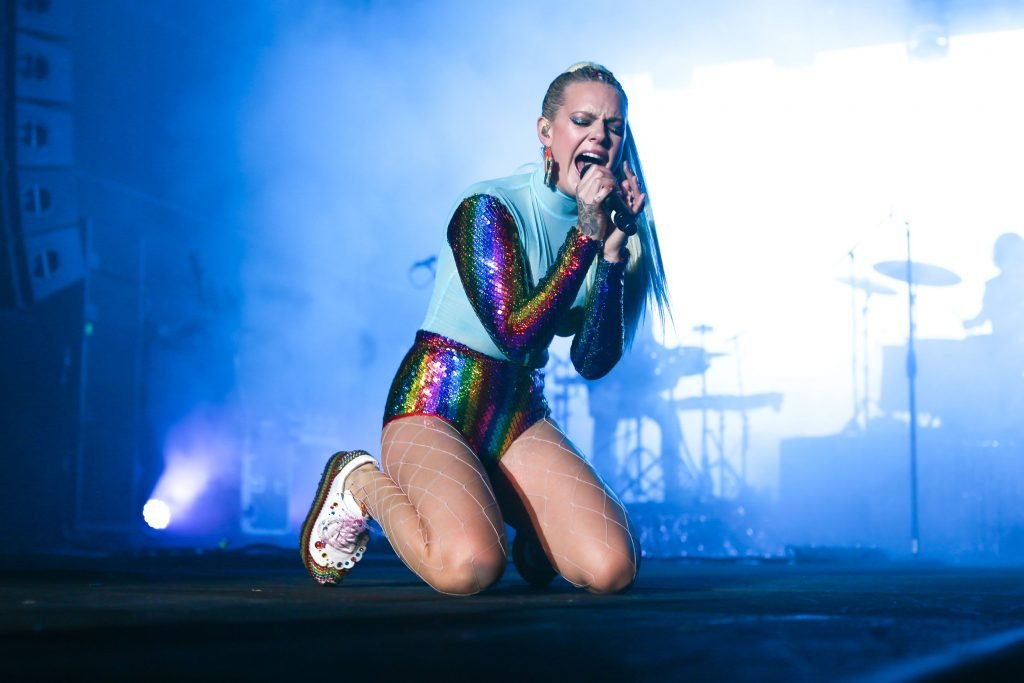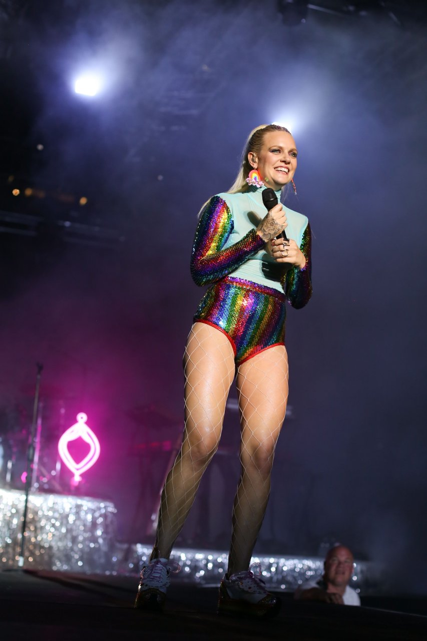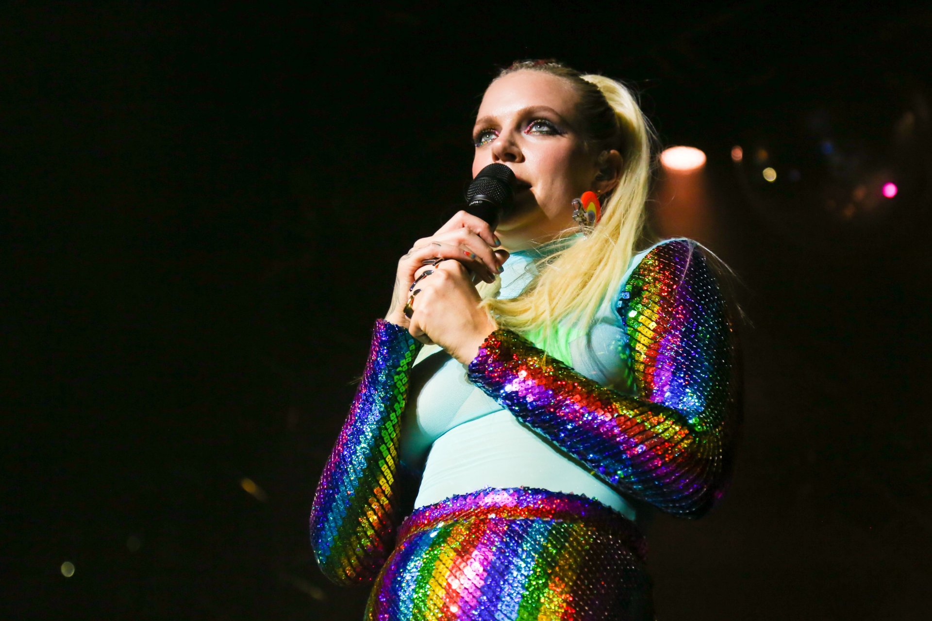 Tove Lo actúa en el escenario en Pride Island en Nueva York, 23/06/2018. La cantante sueca de 30 años llevaba una blusa de malla azul con pasties, a veces mostrando su delgado trasero.