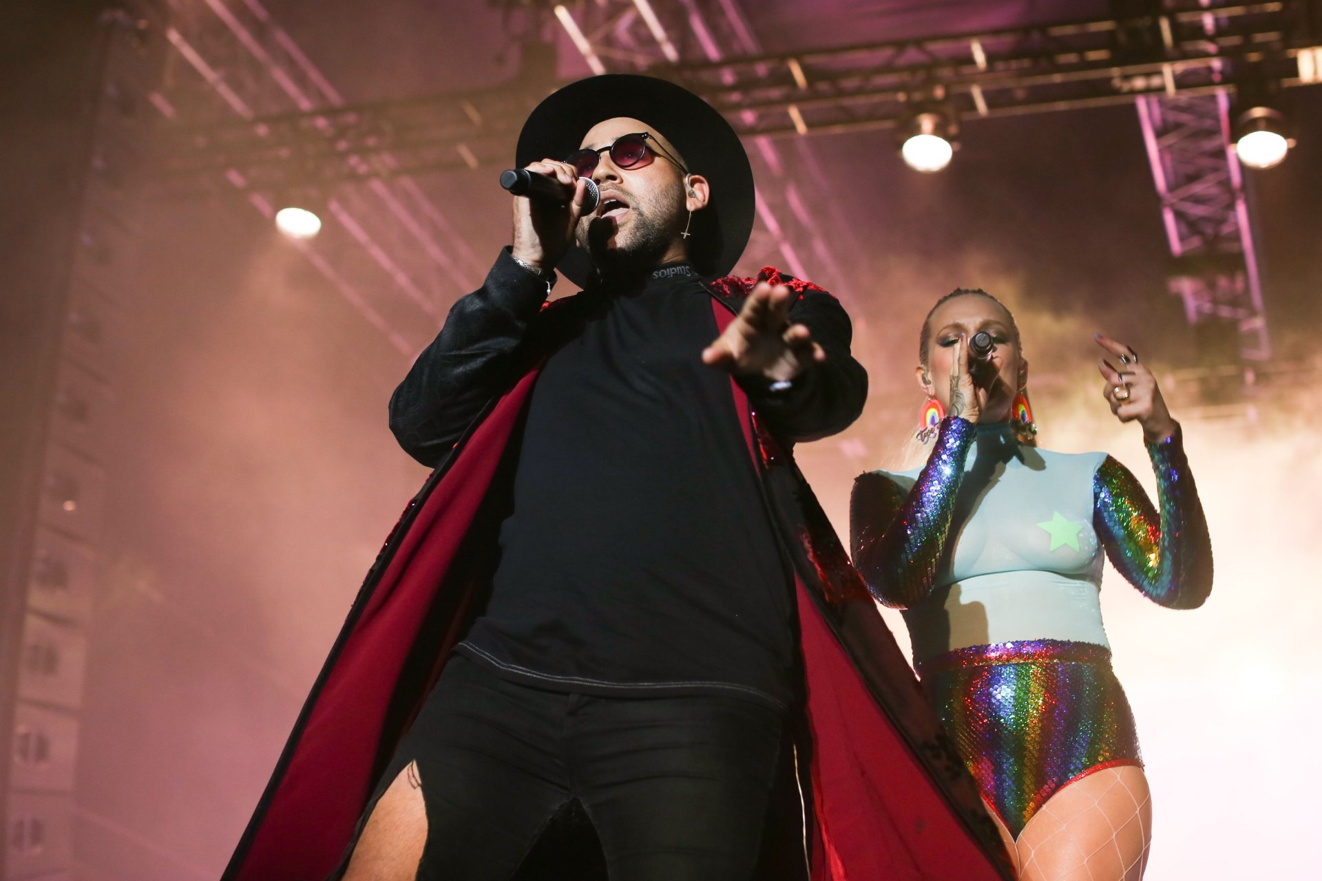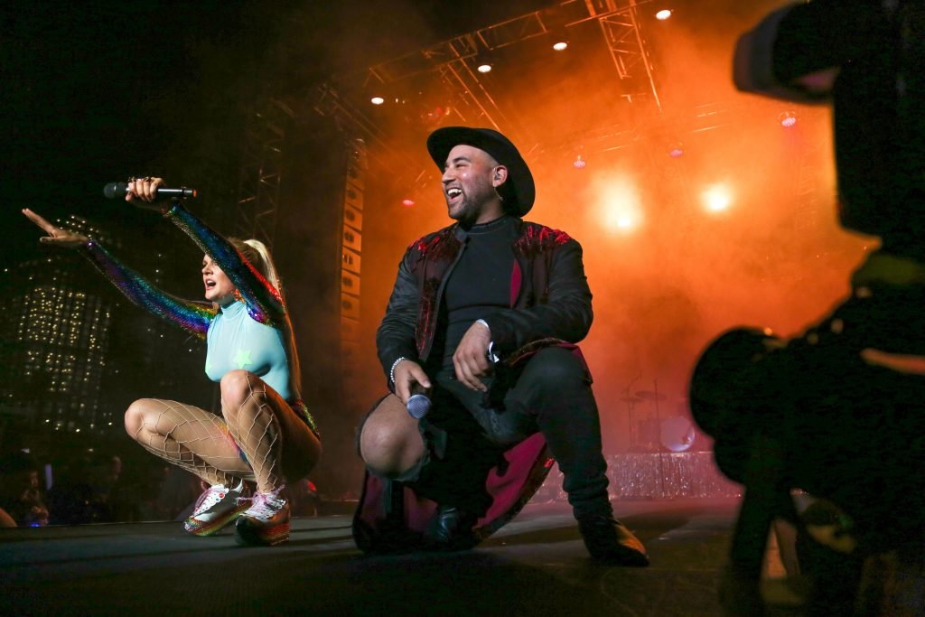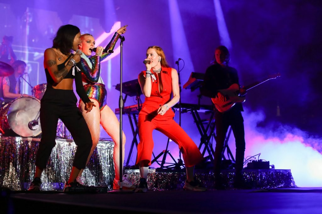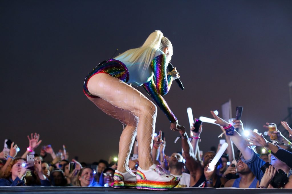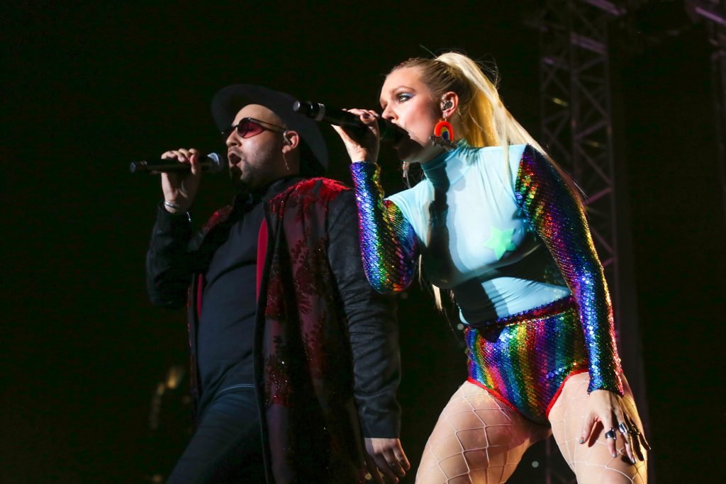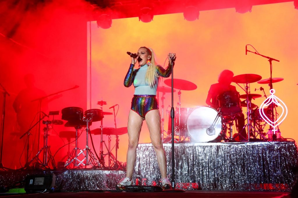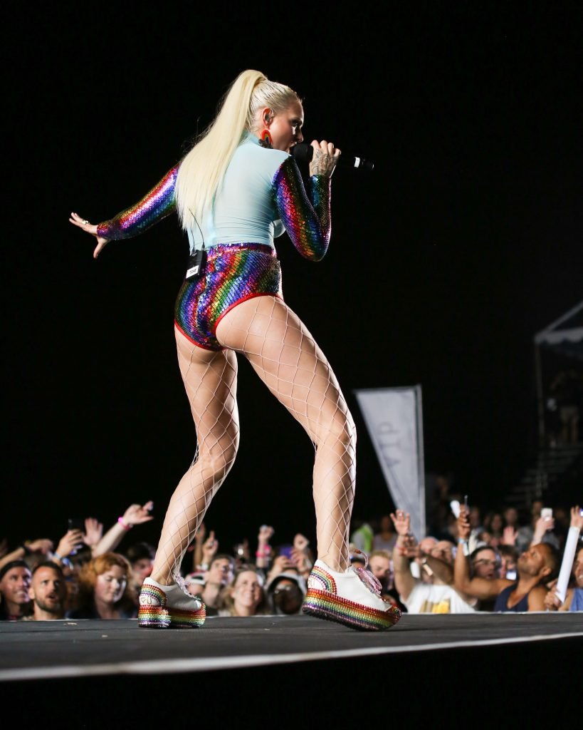 Tove Lo actúa en el escenario en Pride Island en Nueva York, 23/06/2018. La cantante sueca de 30 años llevaba una blusa de malla azul con pasties, a veces mostrando su delgado trasero.