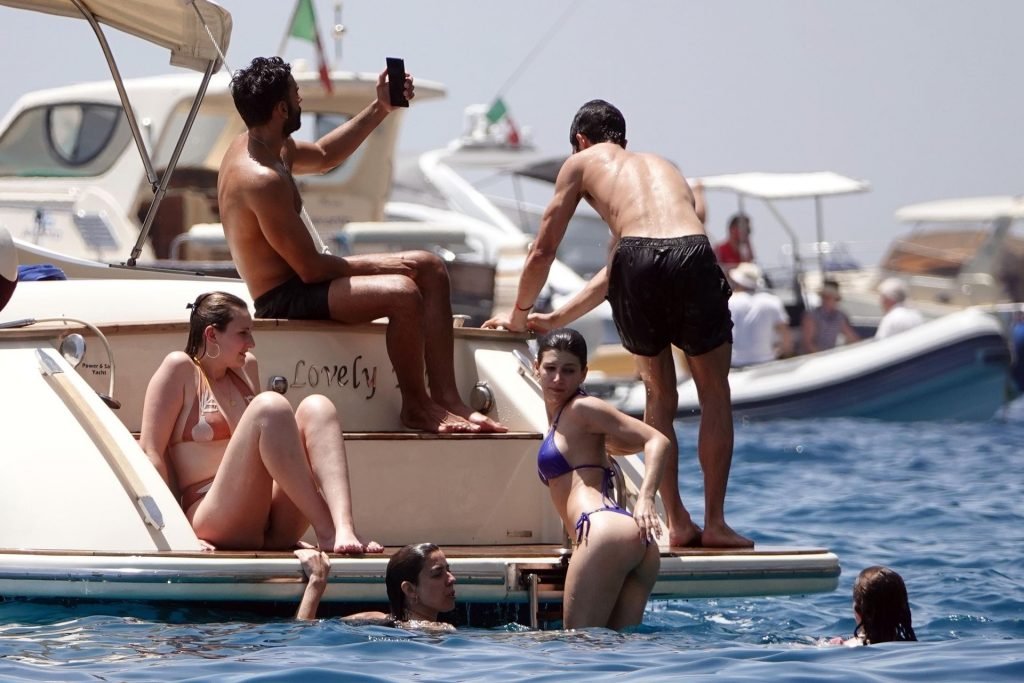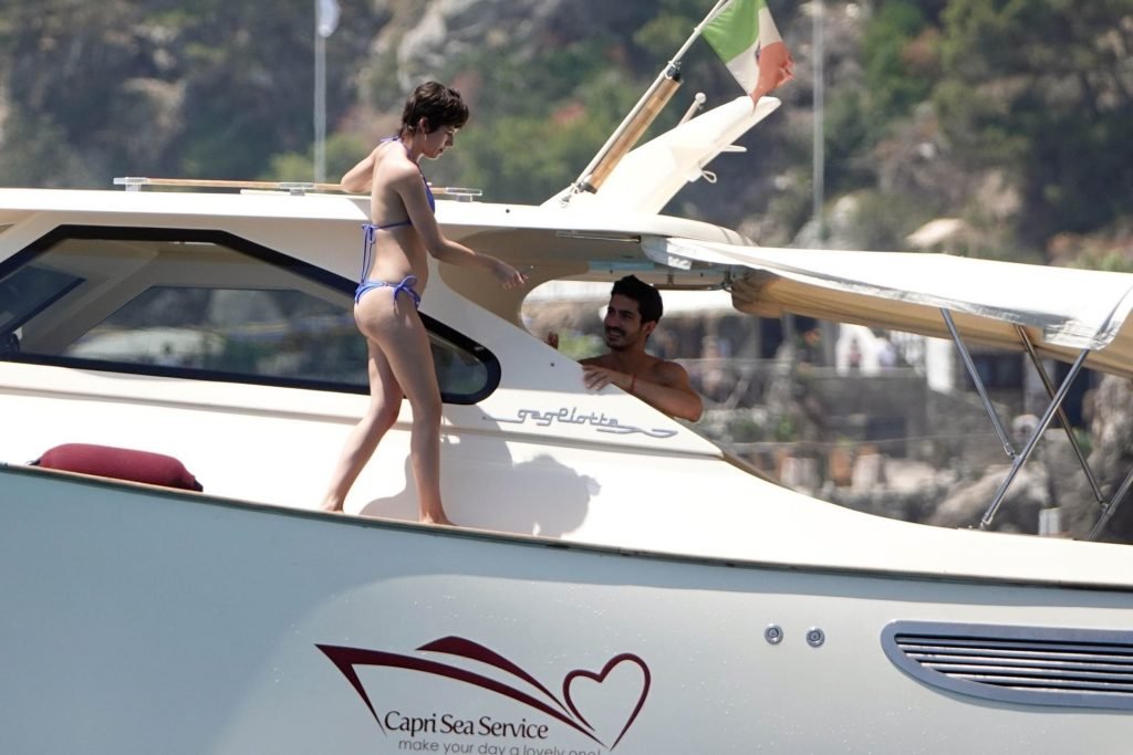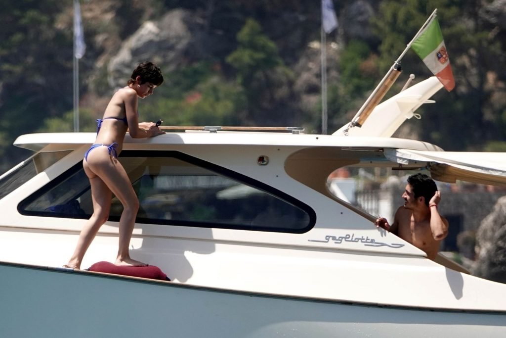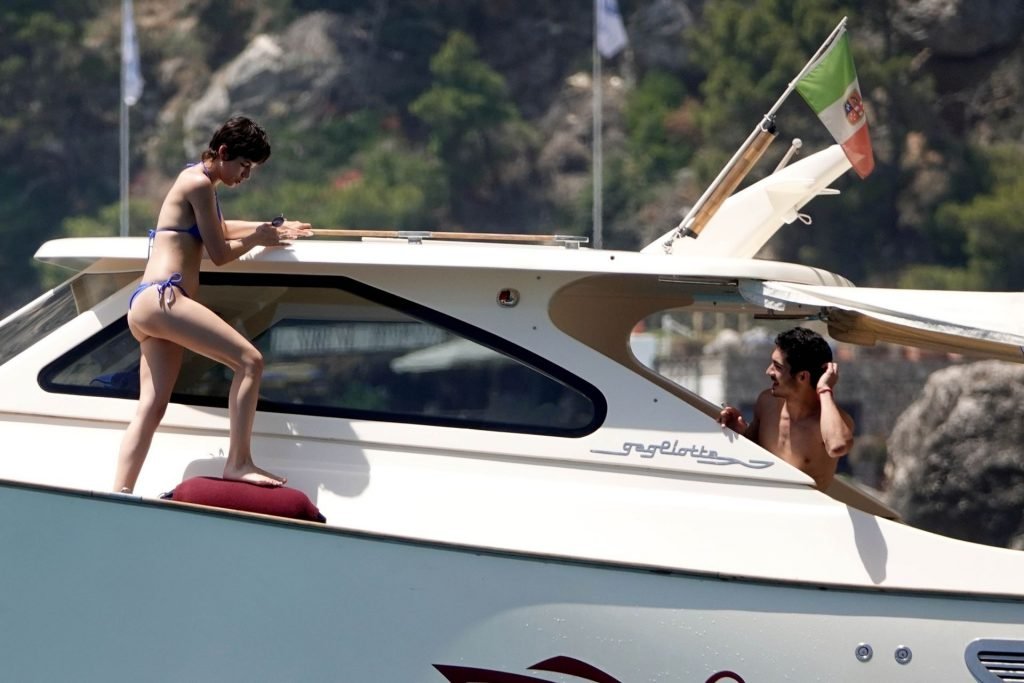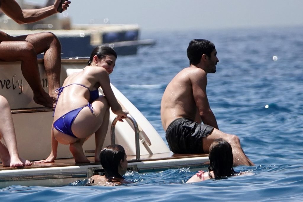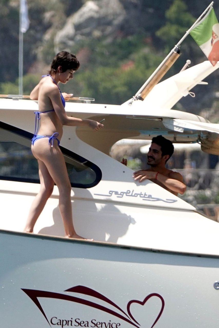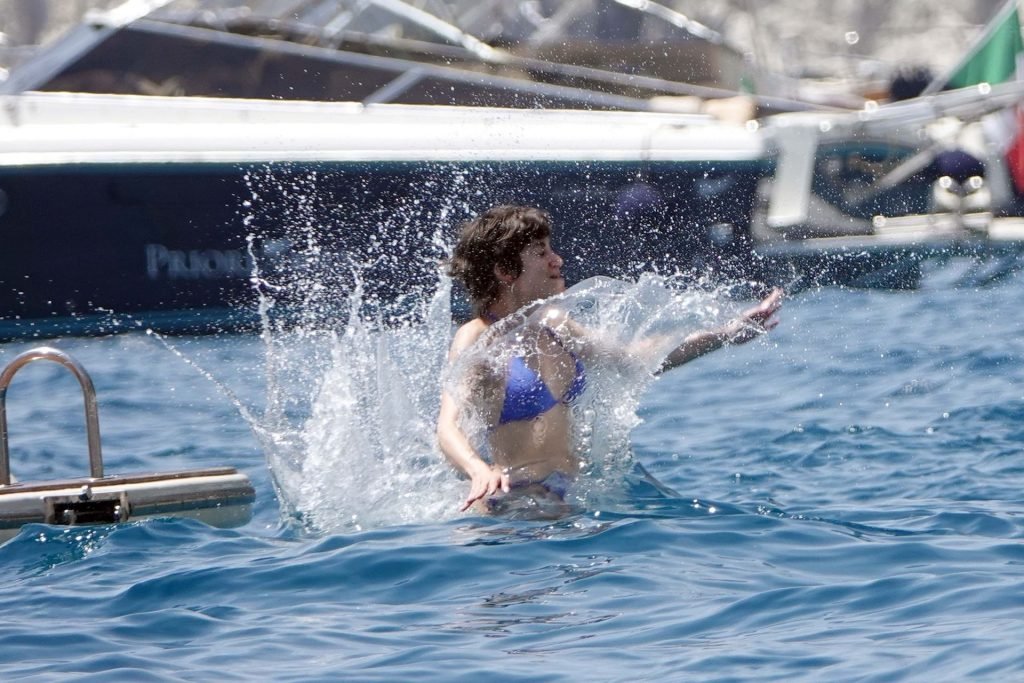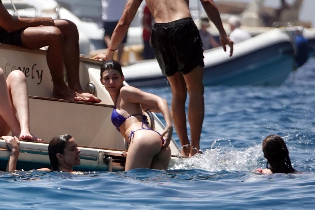 La actriz española Úrsula Corberó fue vista mientras causaba sensación con un bikini azul junto a su pareja Chino Darín y amigos de vacaciones en la isla de Capri, 14/06/2019.
