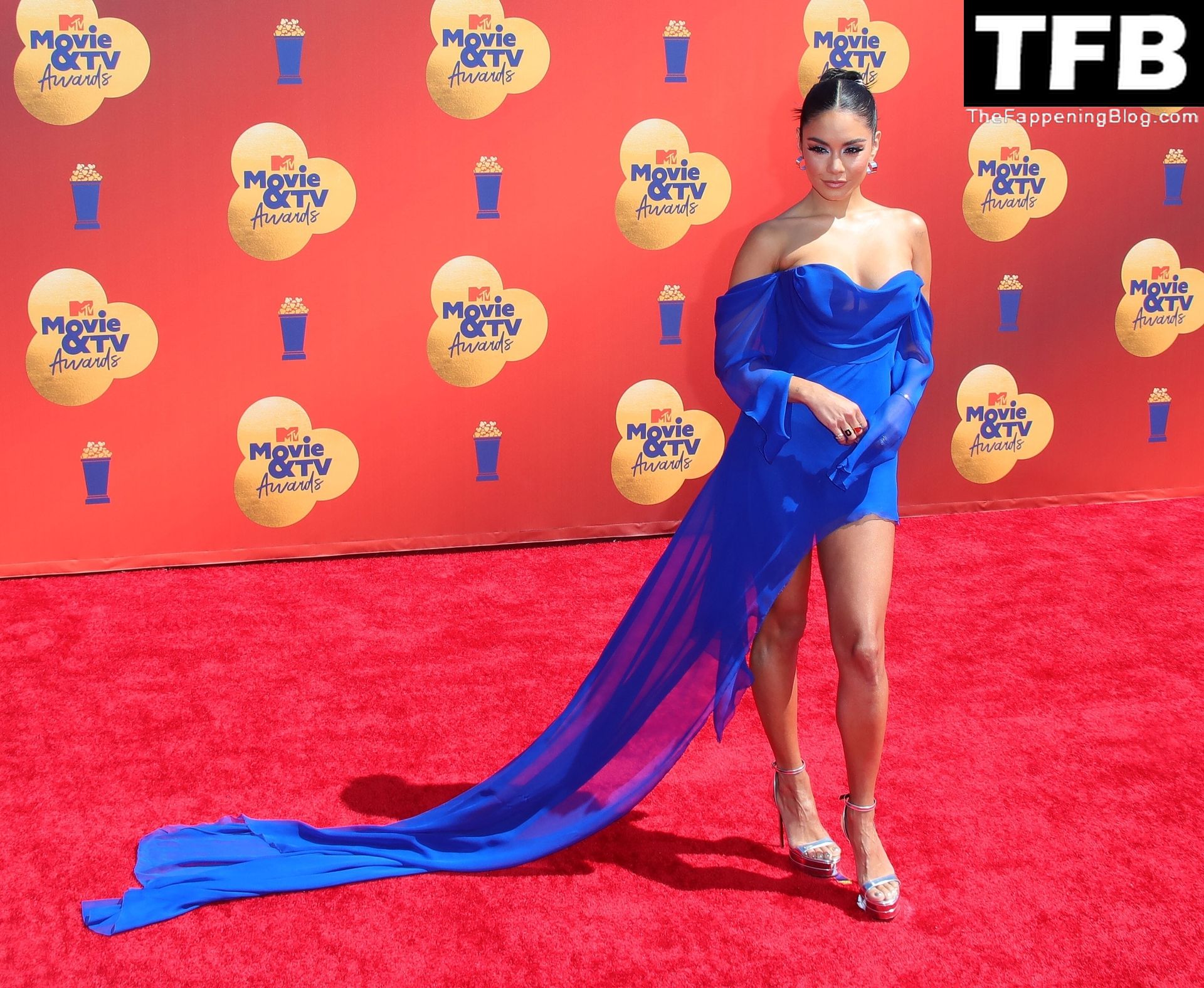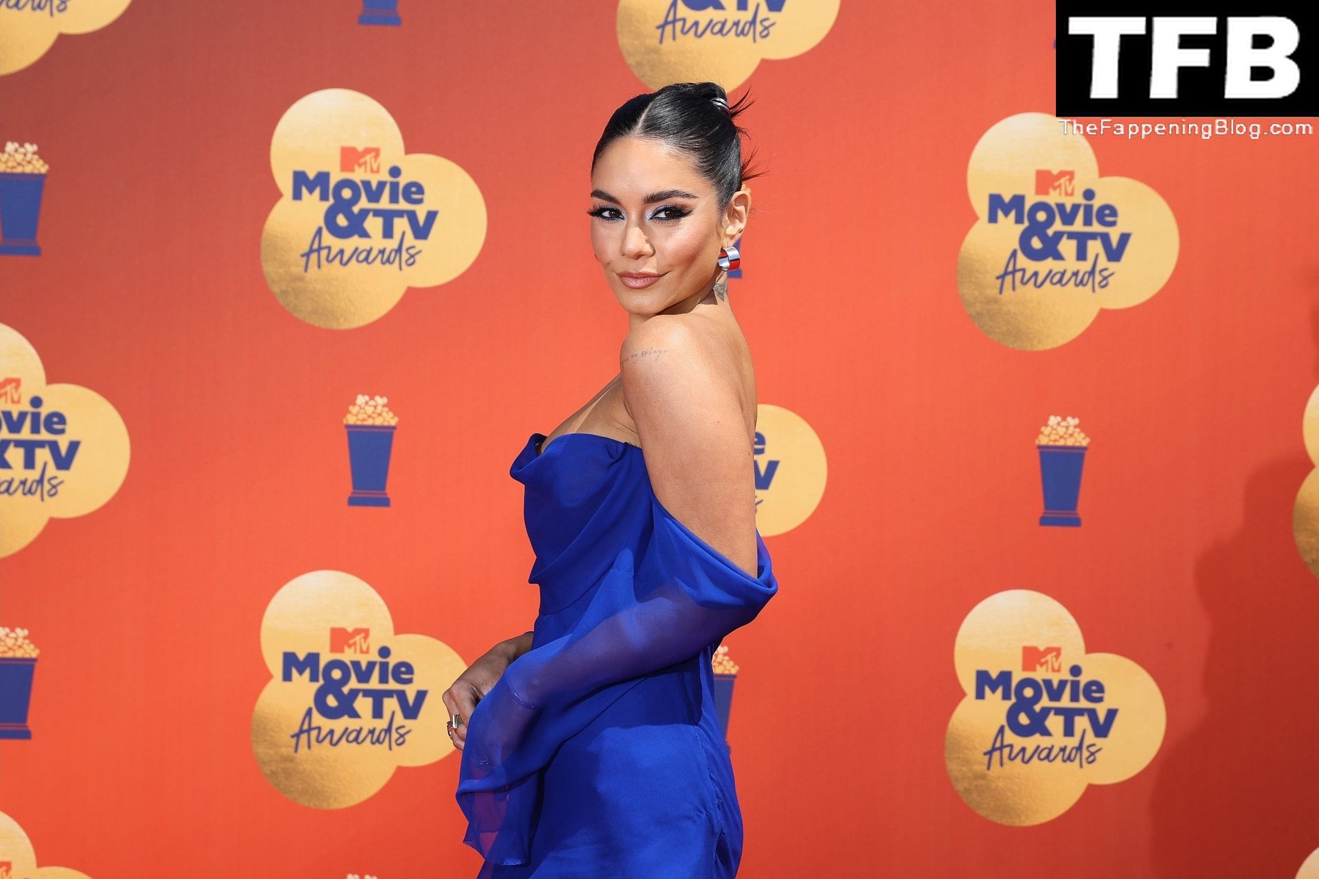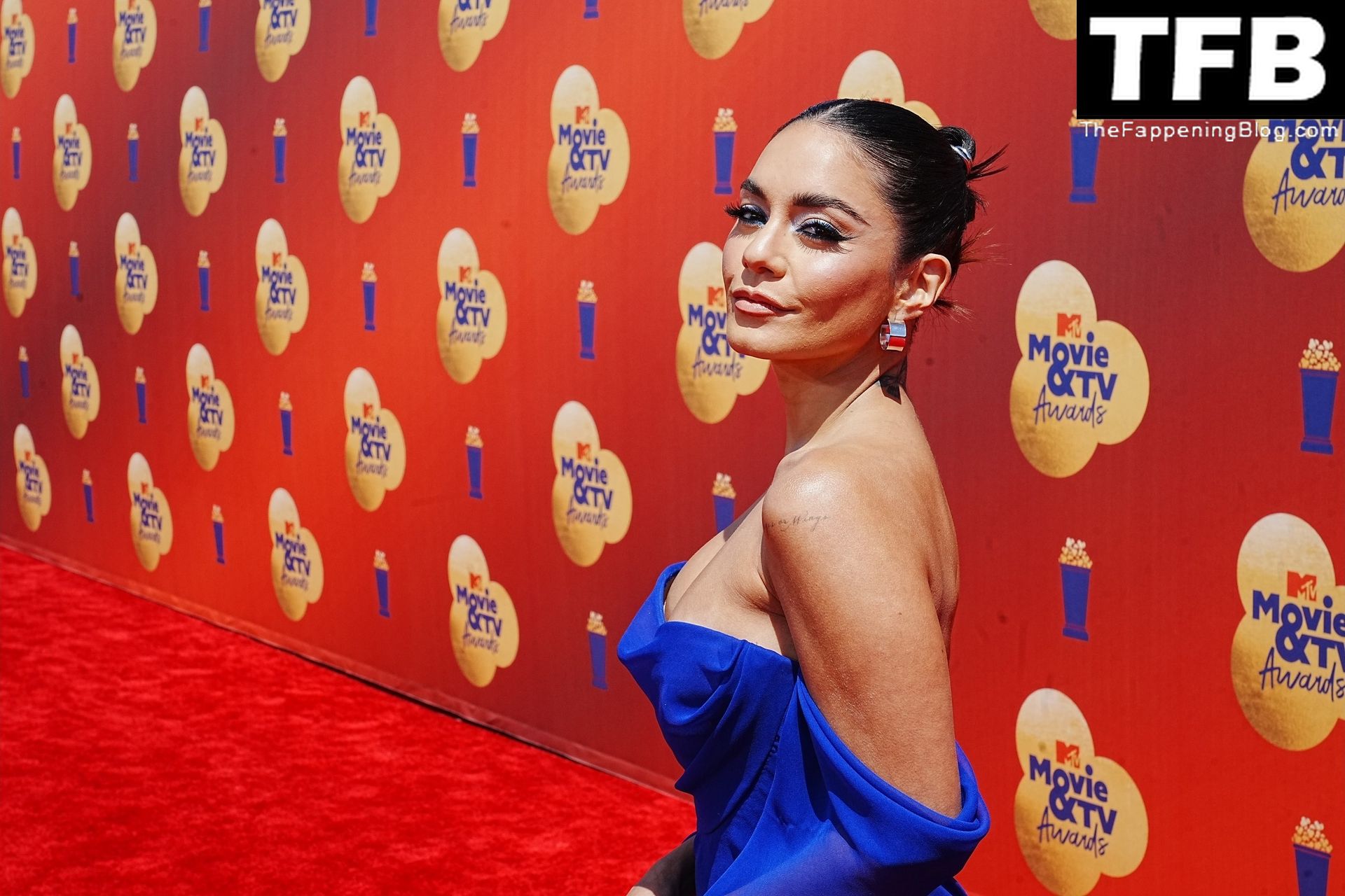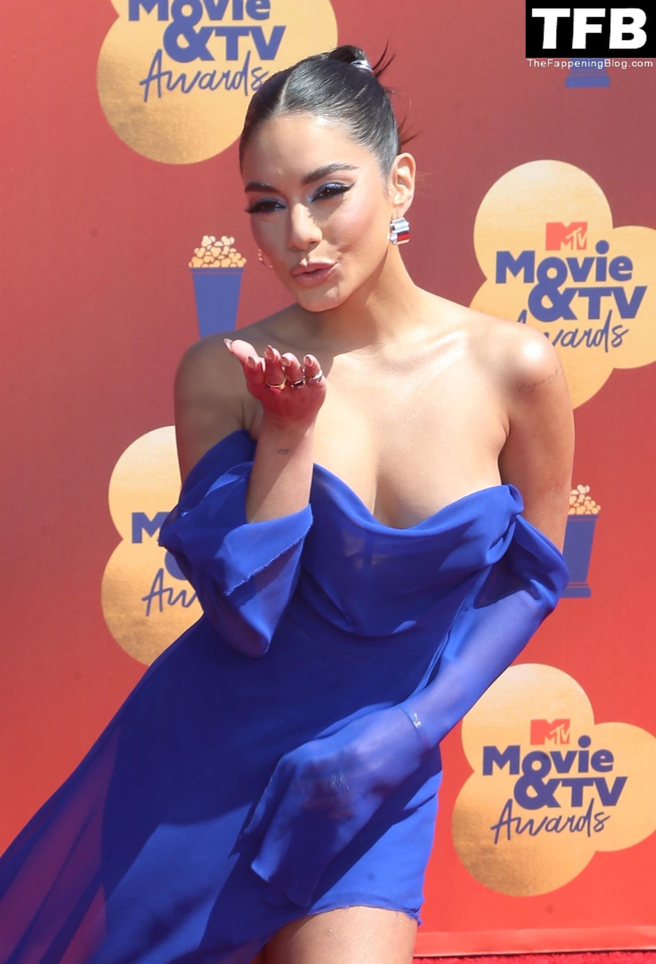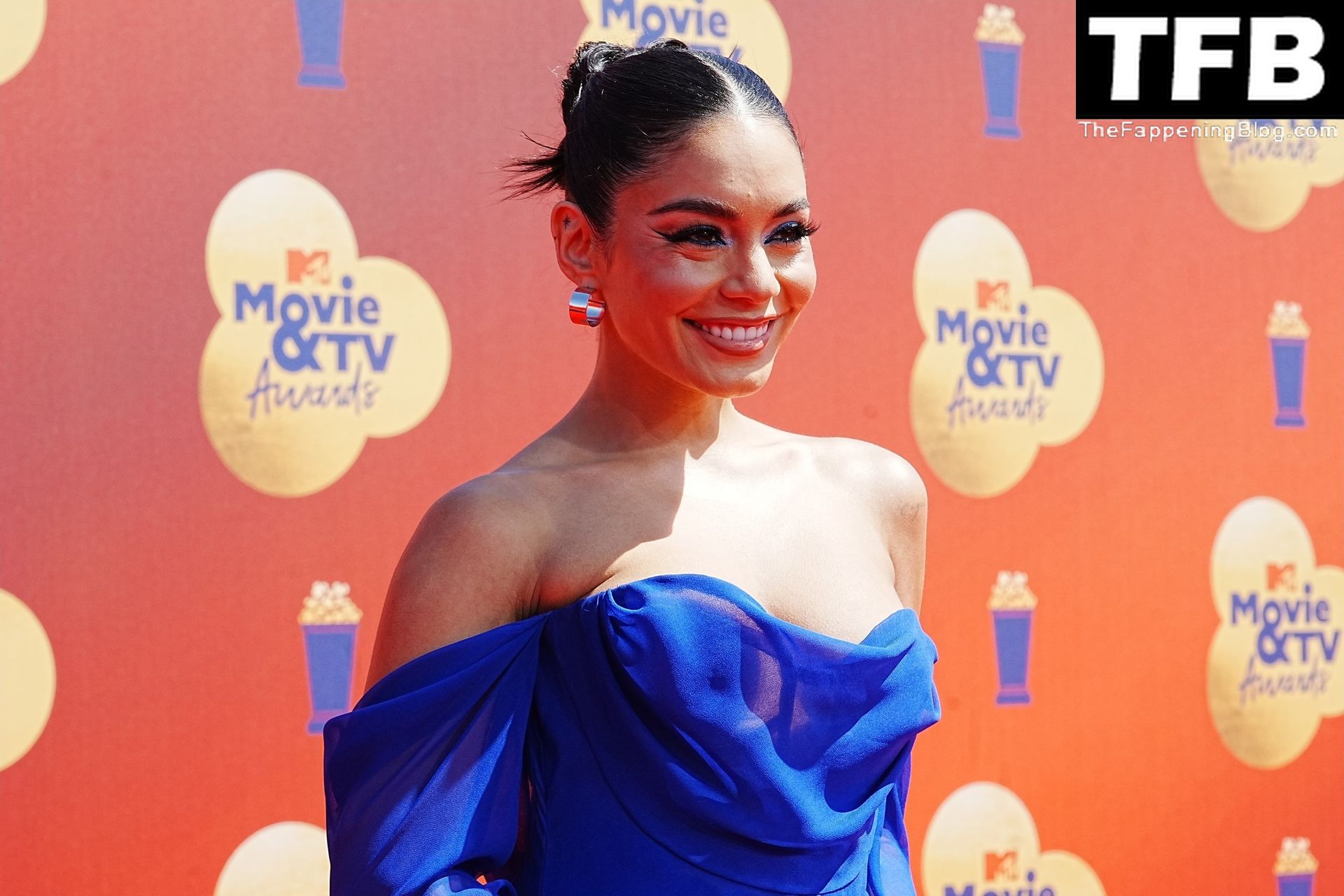 La estrella de The Fappening Vanessa Hudgens posa con un vestido azul en la alfombra roja de los MTV Movie & TV Awards en The Barker Hangar en Santa Mónica, 05/06/2022.