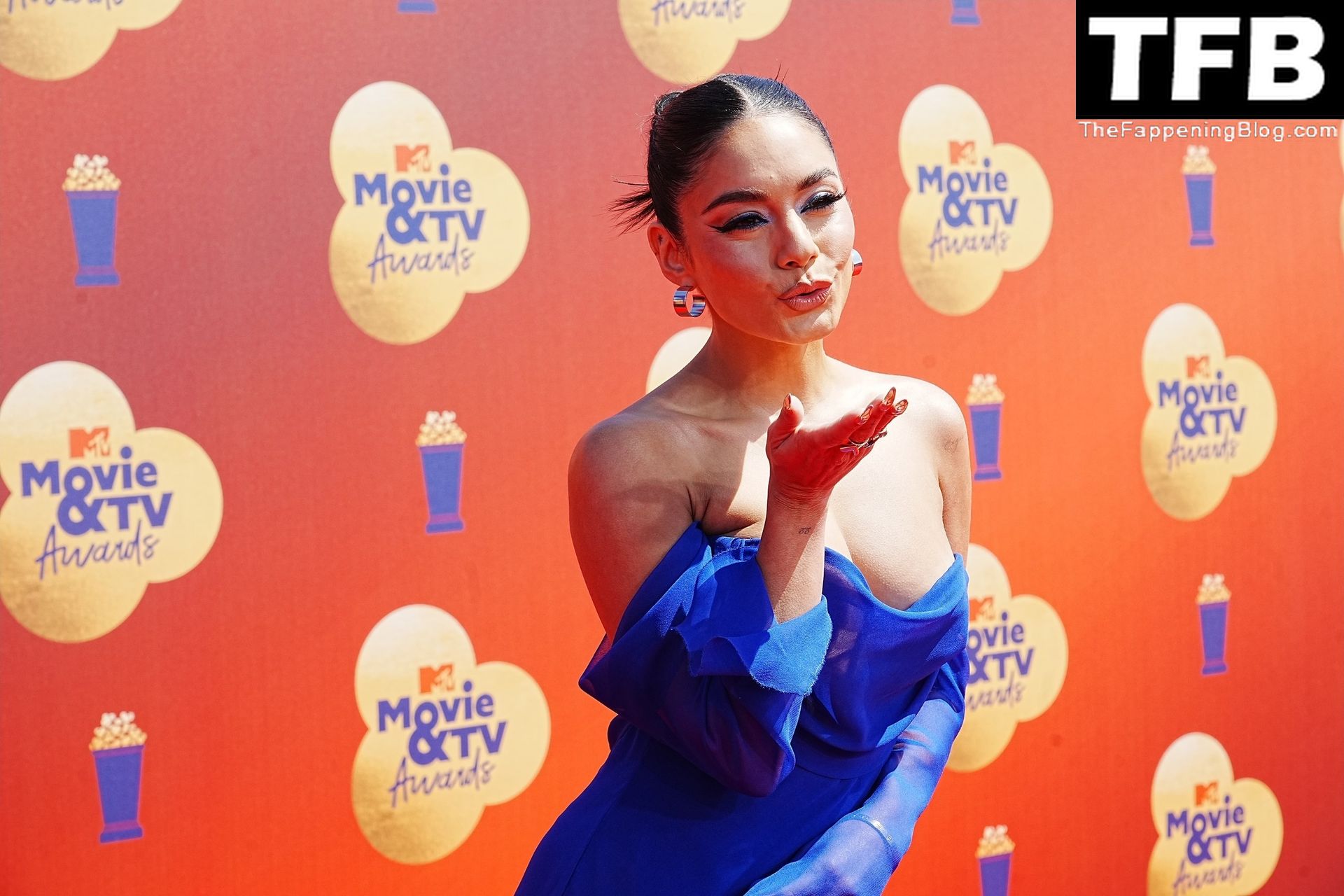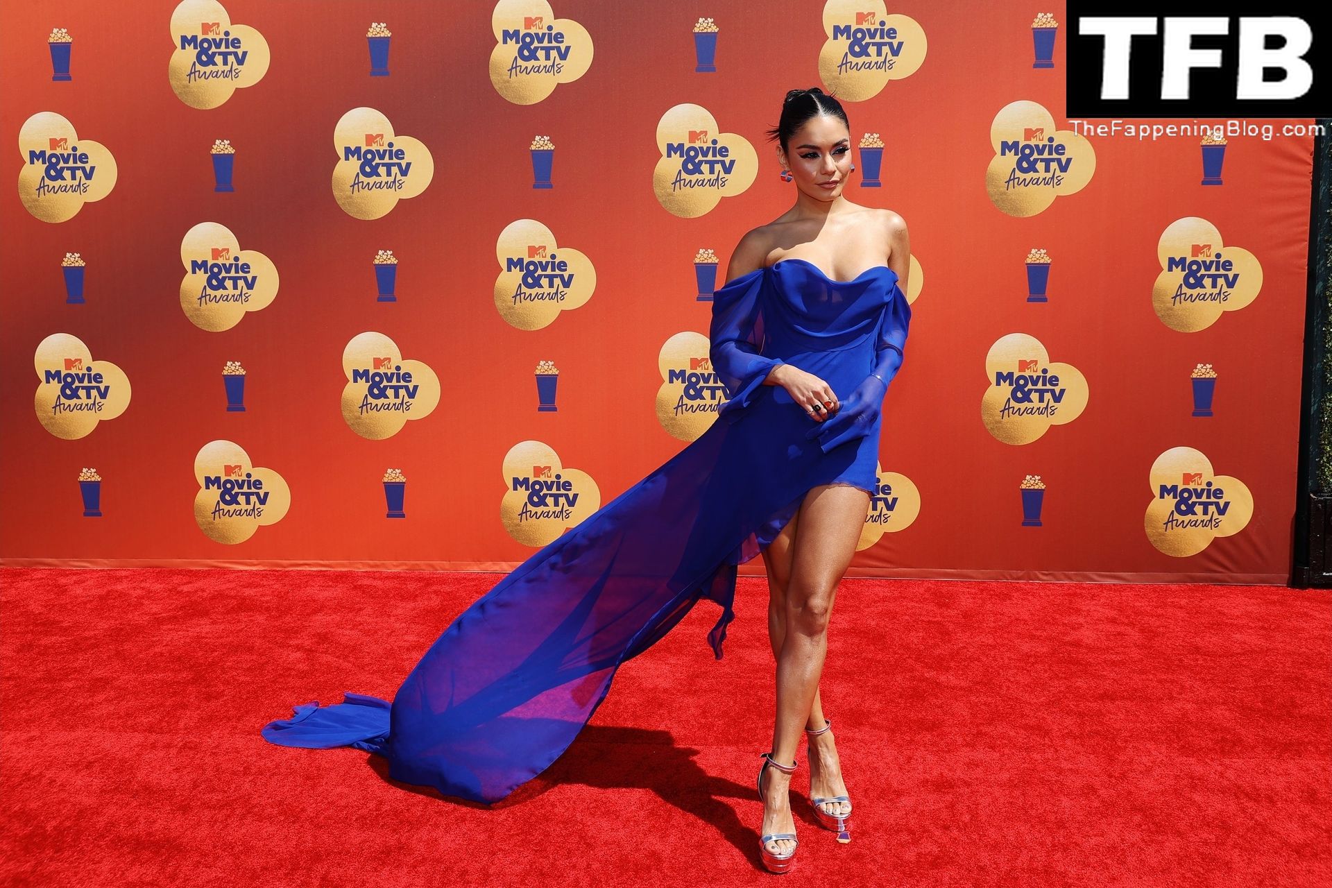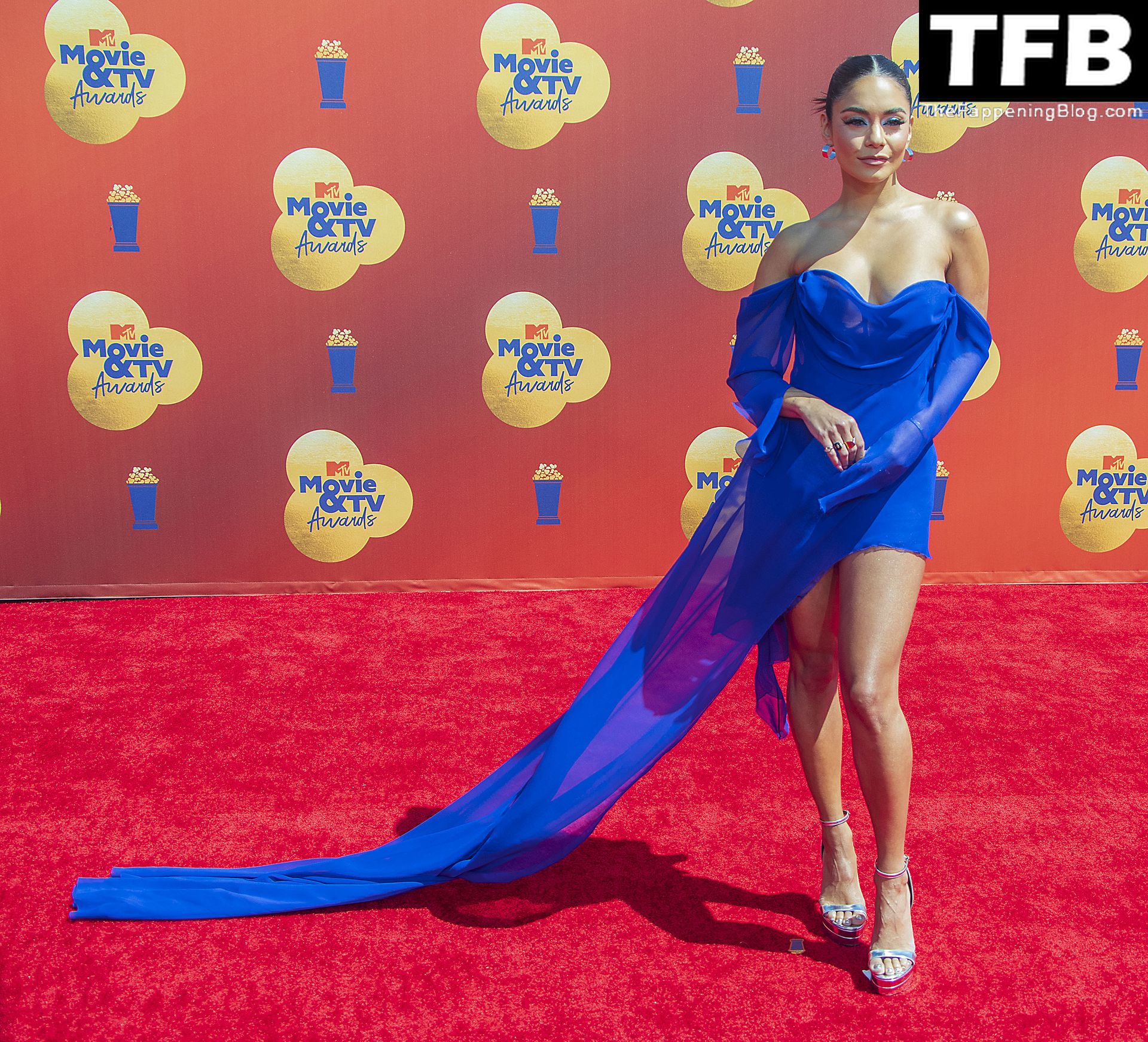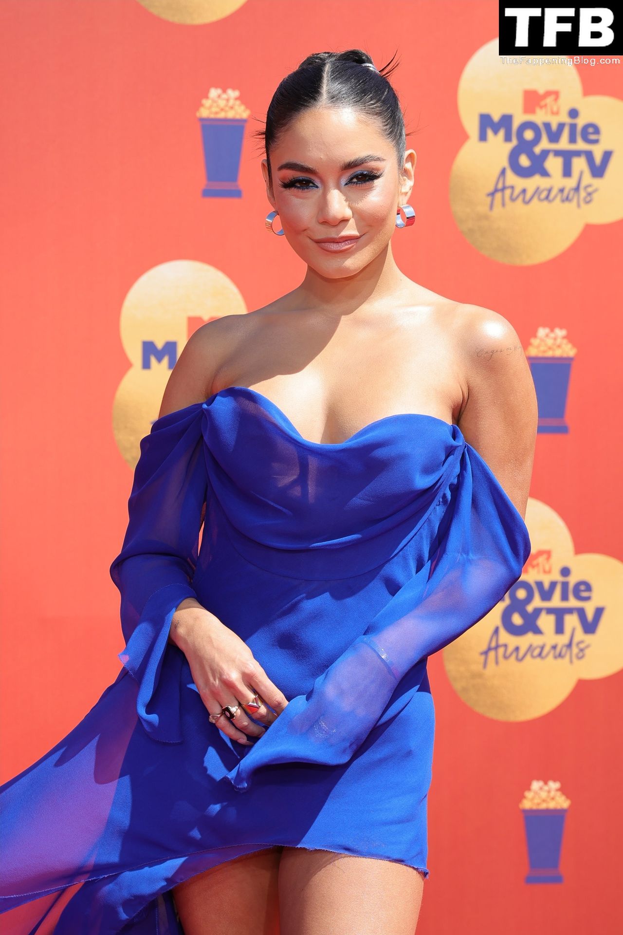 La estrella de The Fappening Vanessa Hudgens posa con un vestido azul en la alfombra roja de los MTV Movie & TV Awards en The Barker Hangar en Santa Mónica, 05/06/2022.