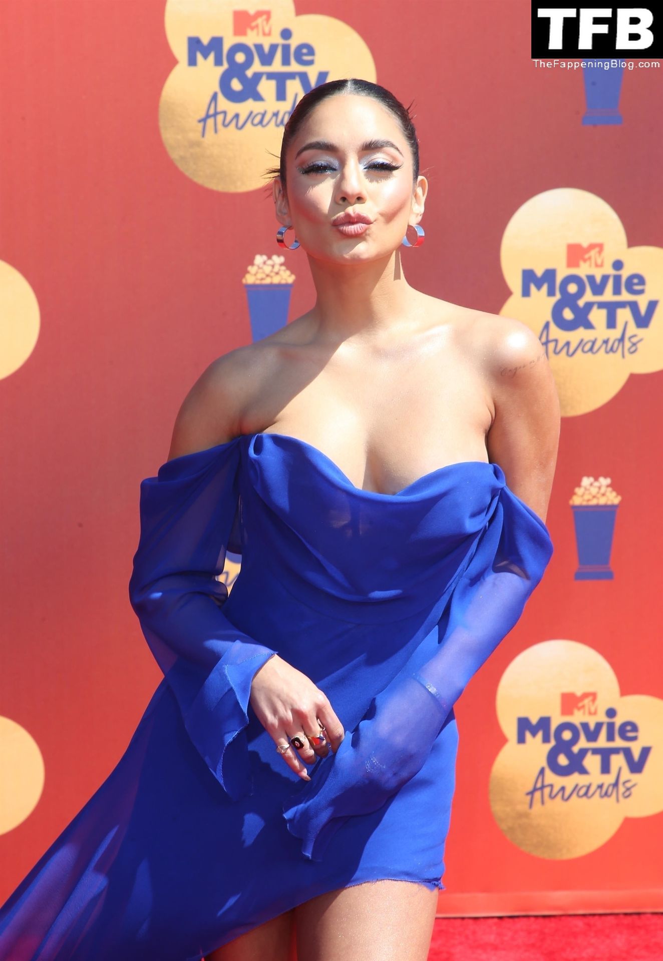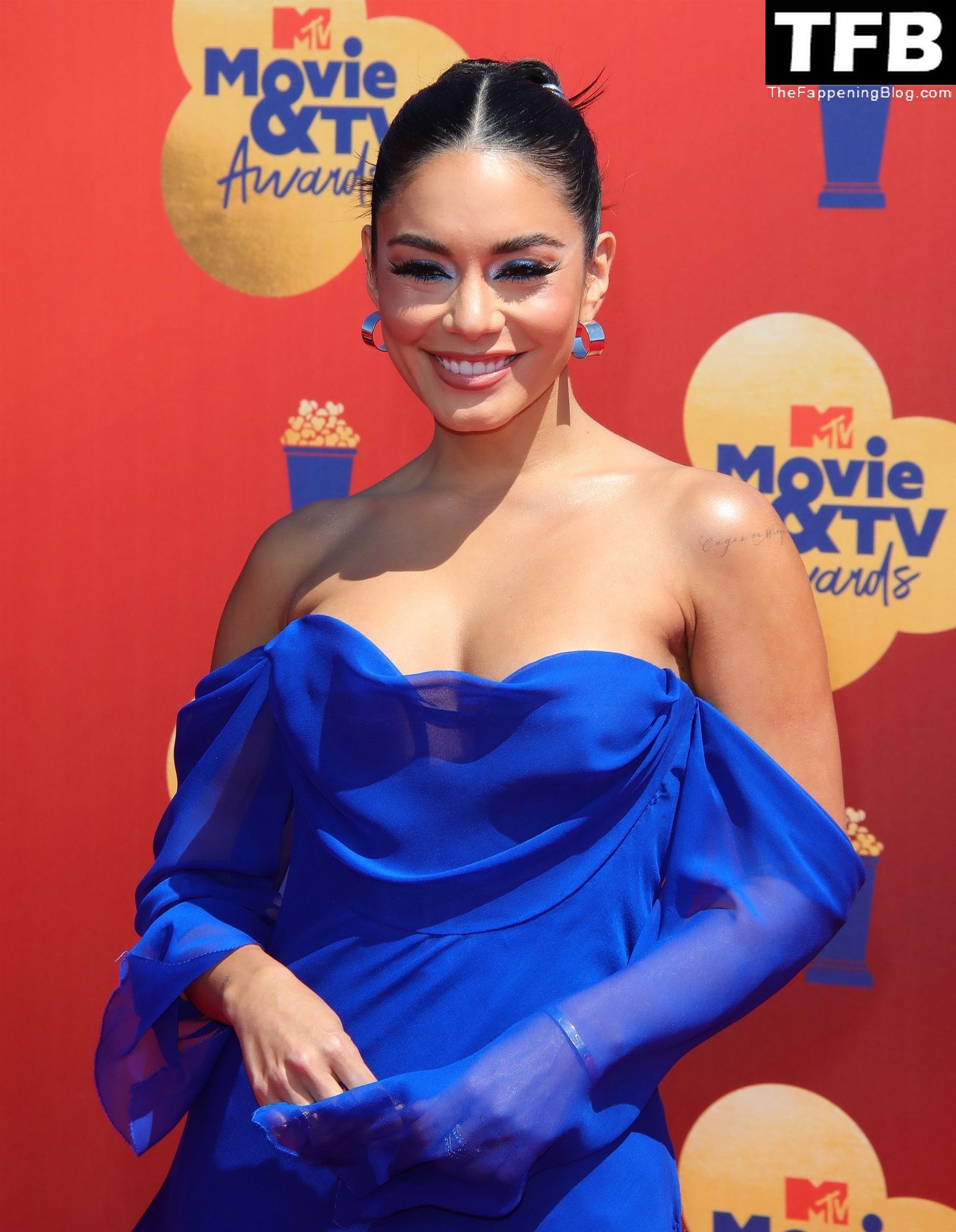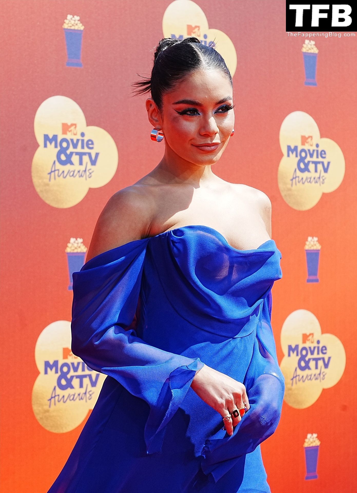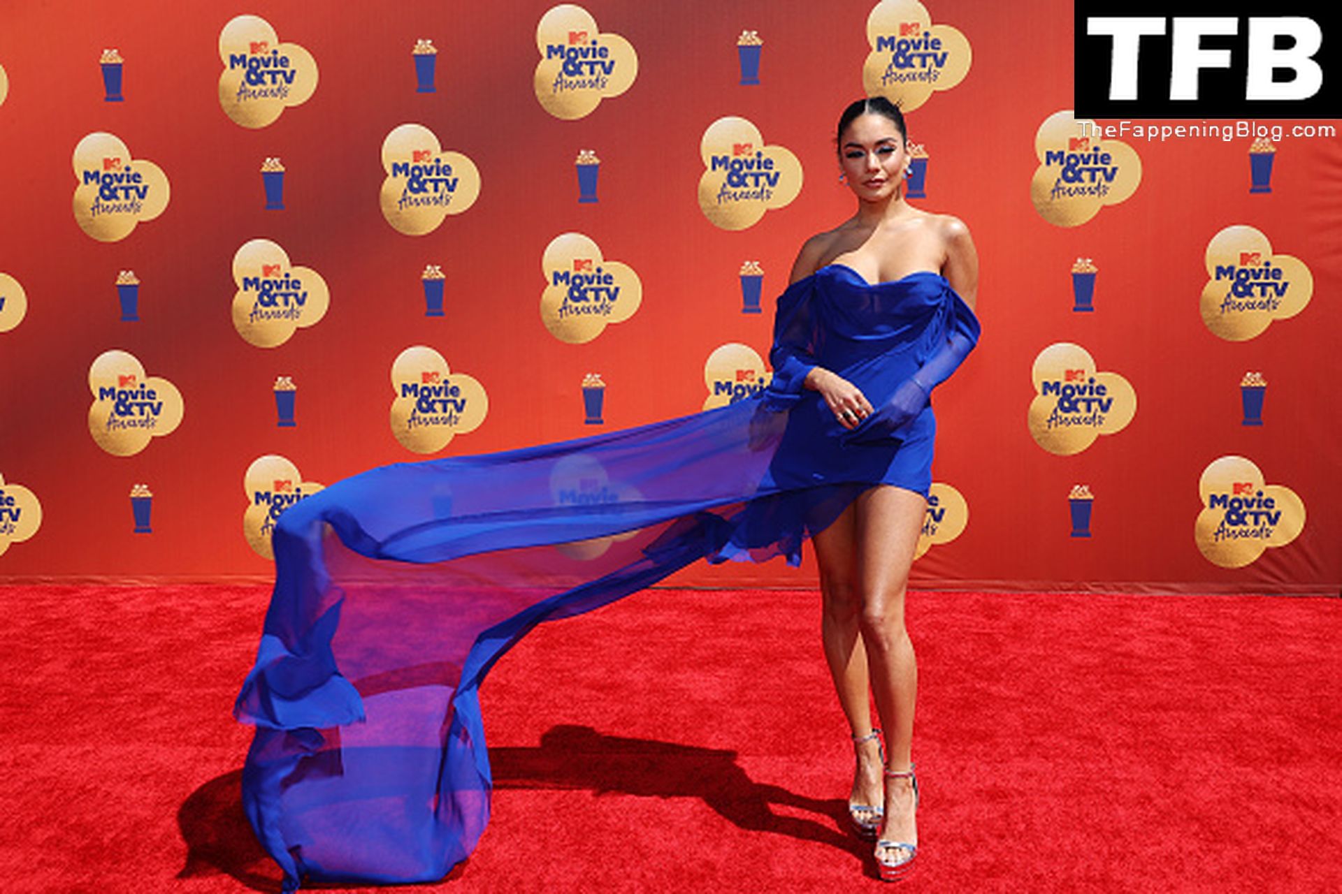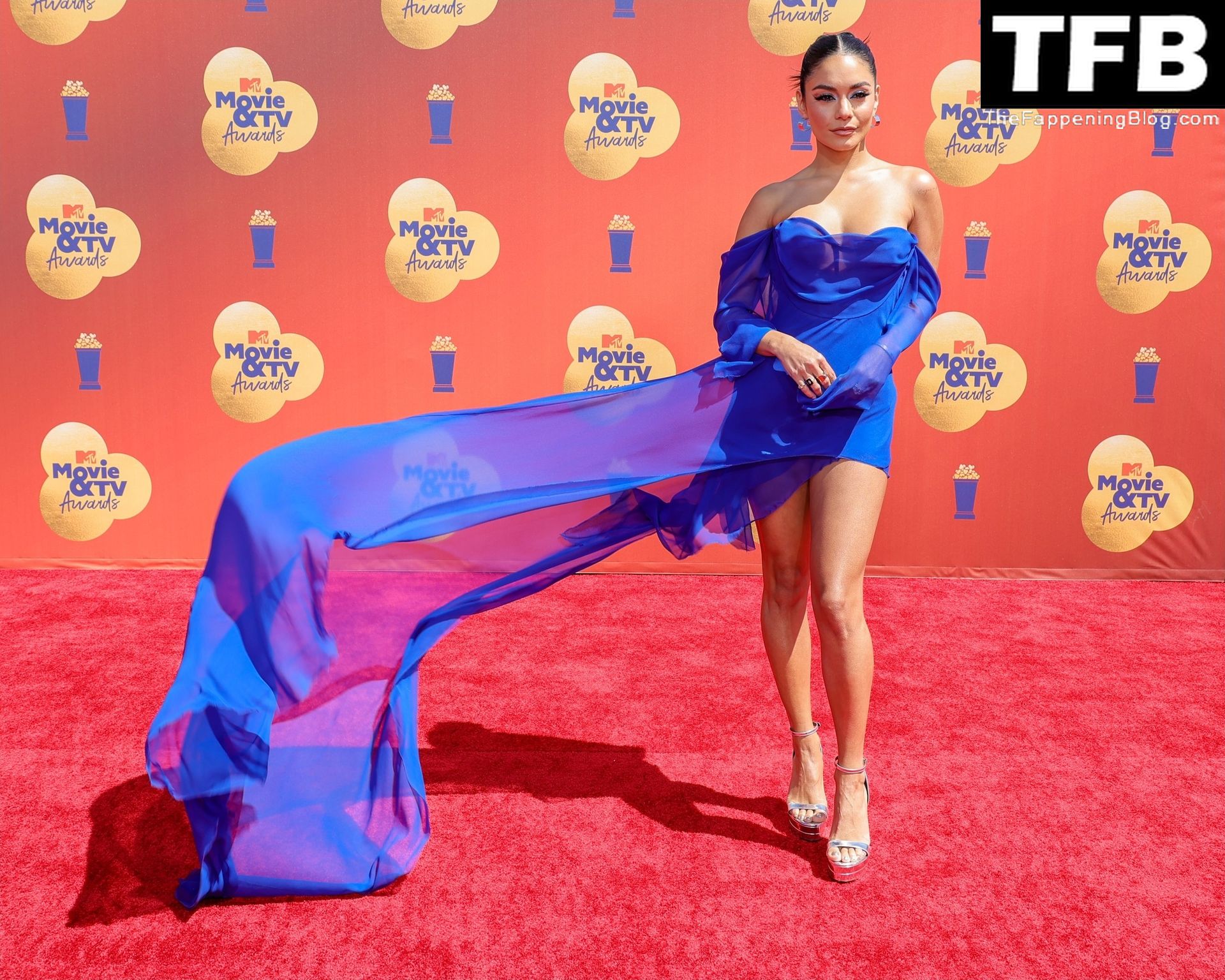 La estrella de The Fappening Vanessa Hudgens posa con un vestido azul en la alfombra roja de los MTV Movie & TV Awards en The Barker Hangar en Santa Mónica, 05/06/2022.