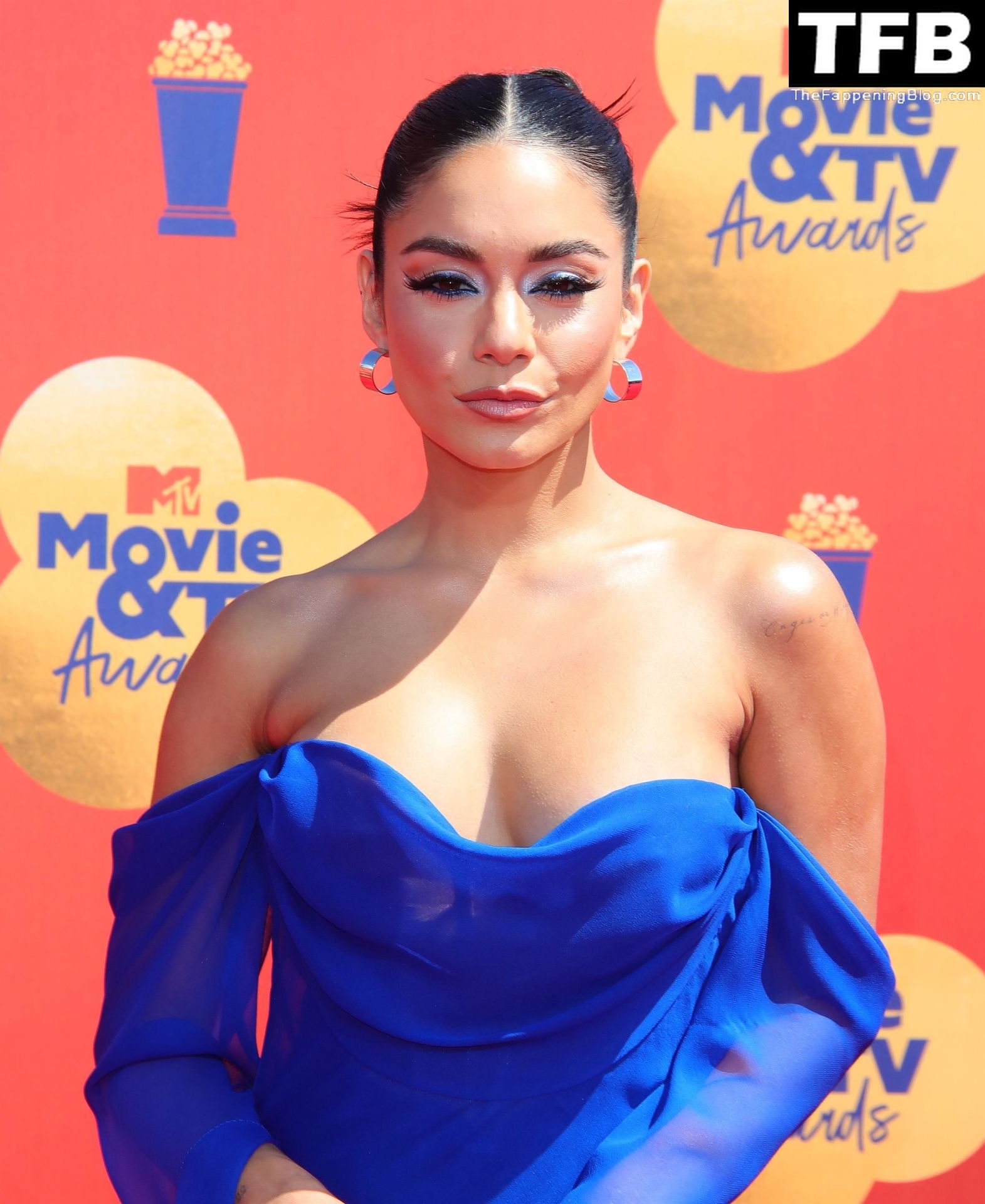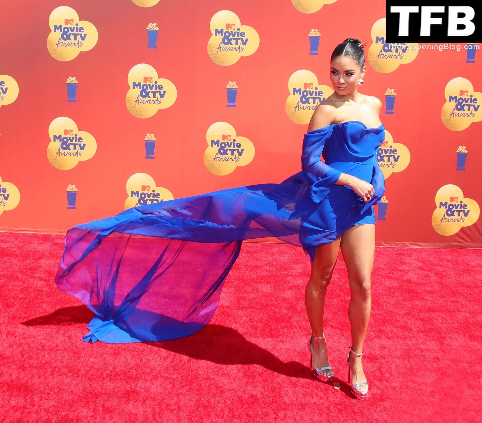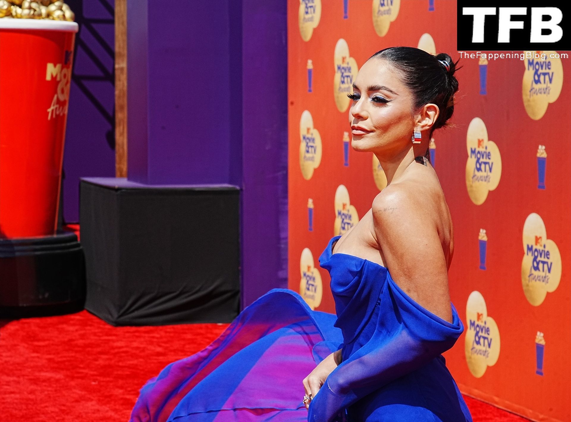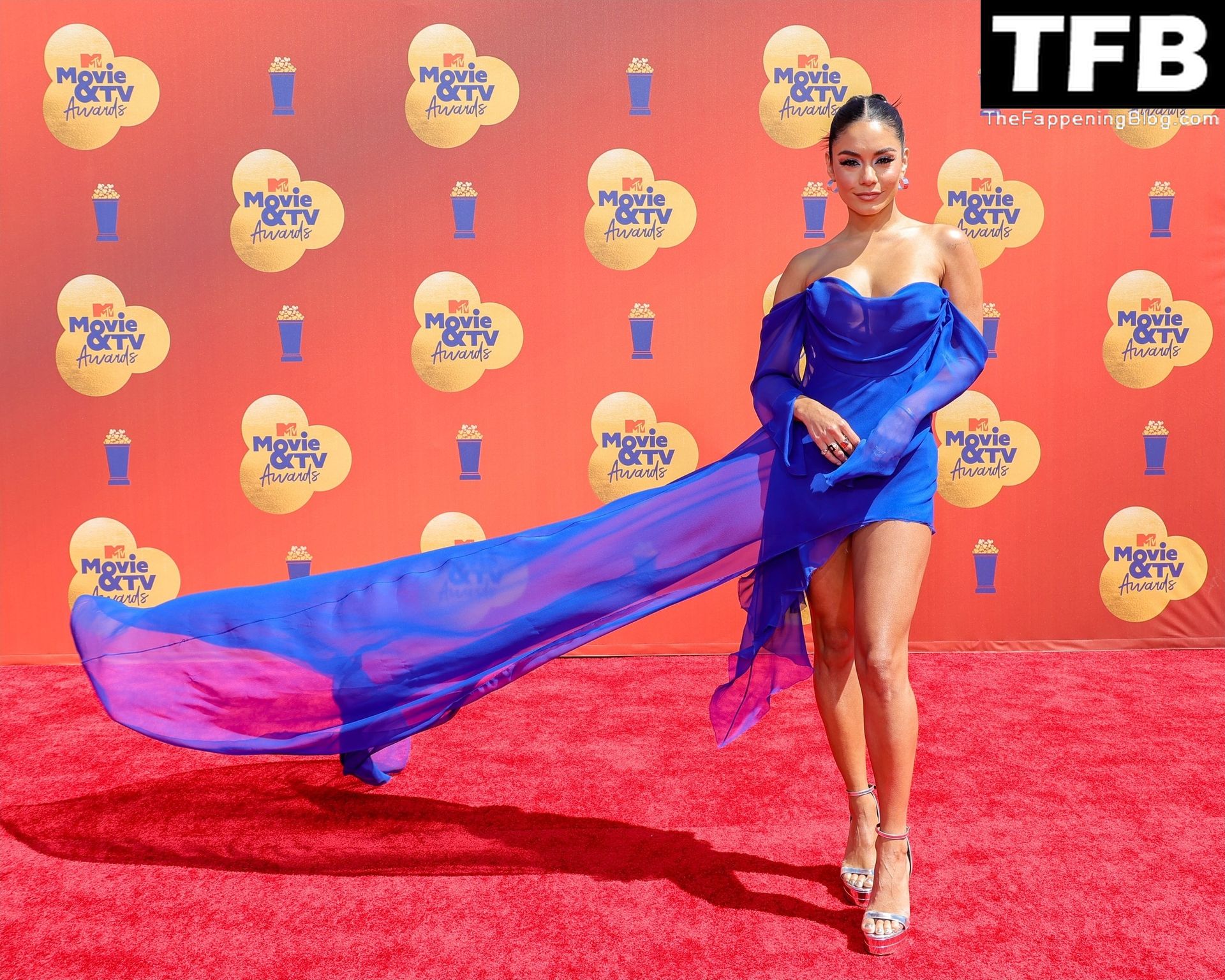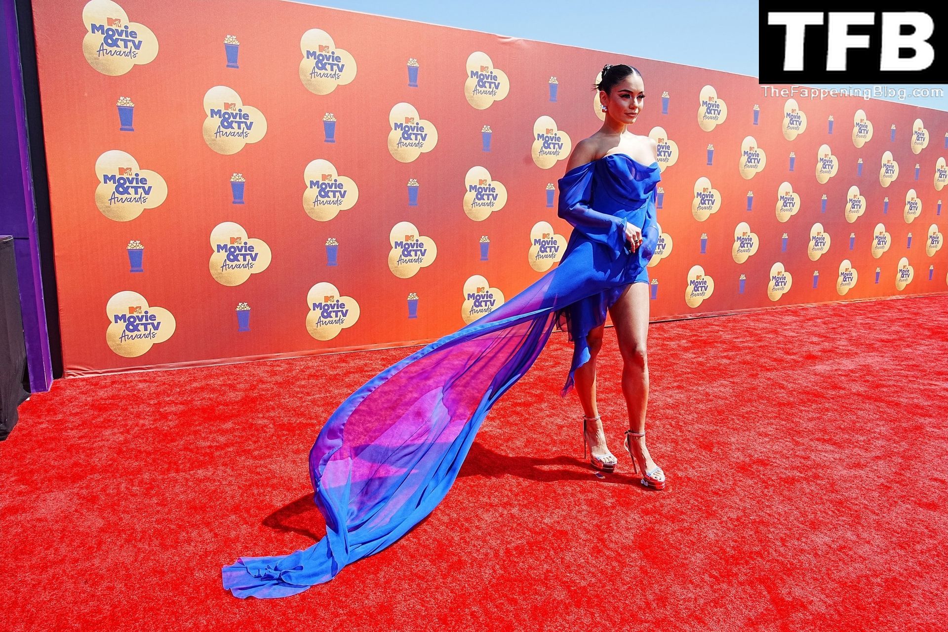 La estrella de The Fappening Vanessa Hudgens posa con un vestido azul en la alfombra roja de los MTV Movie & TV Awards en The Barker Hangar en Santa Mónica, 05/06/2022.