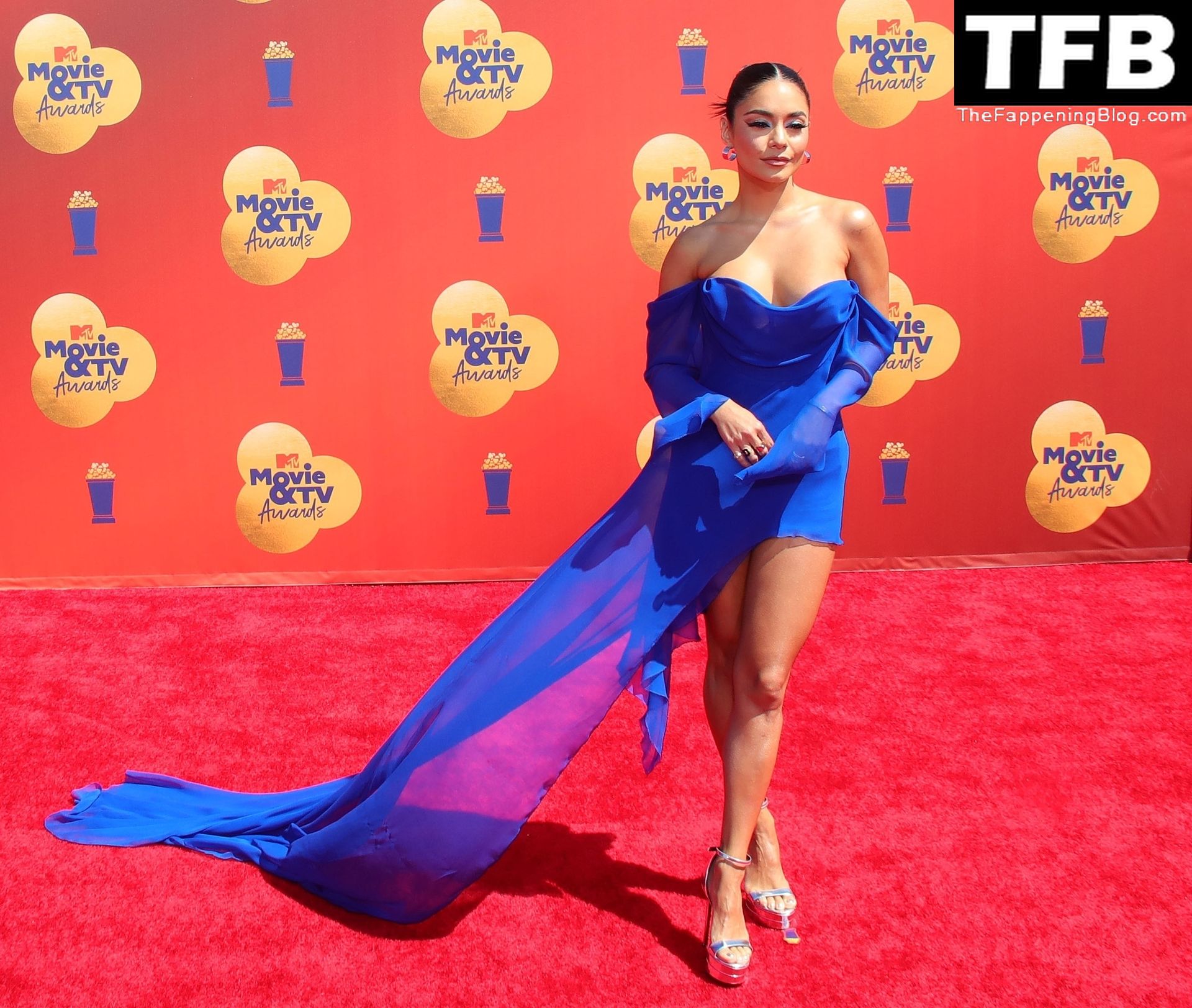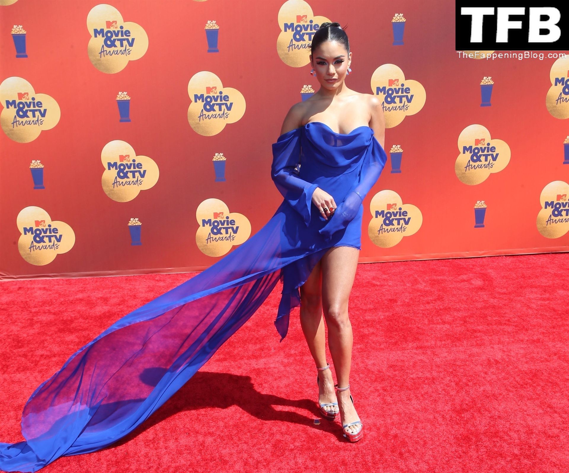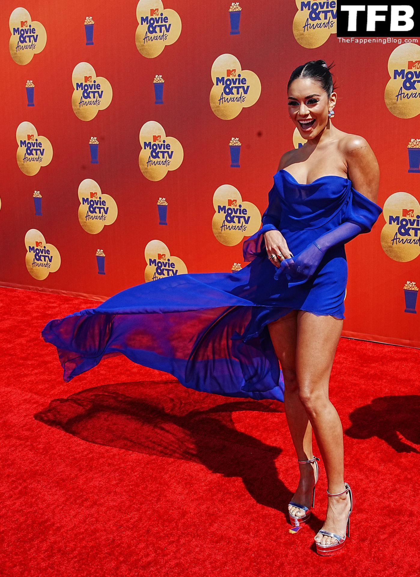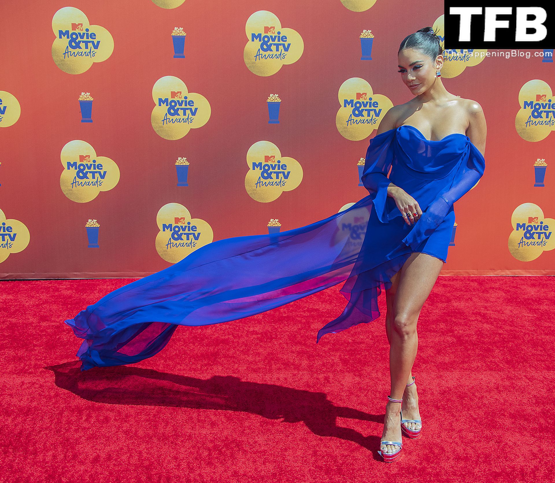 La estrella de The Fappening Vanessa Hudgens posa con un vestido azul en la alfombra roja de los MTV Movie & TV Awards en The Barker Hangar en Santa Mónica, 05/06/2022.