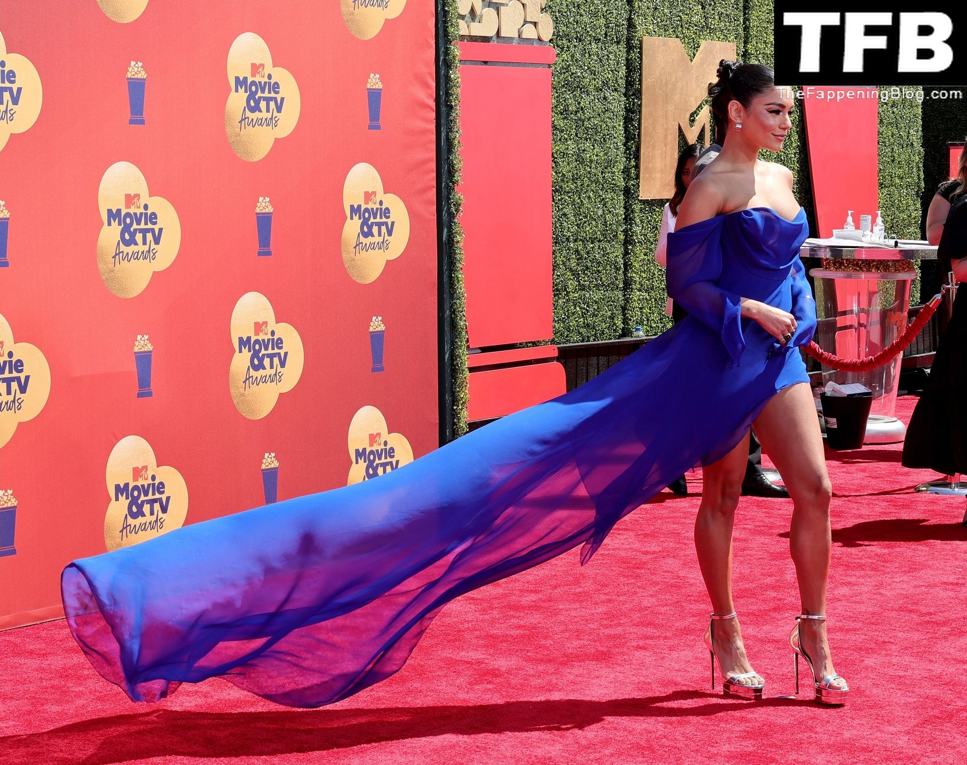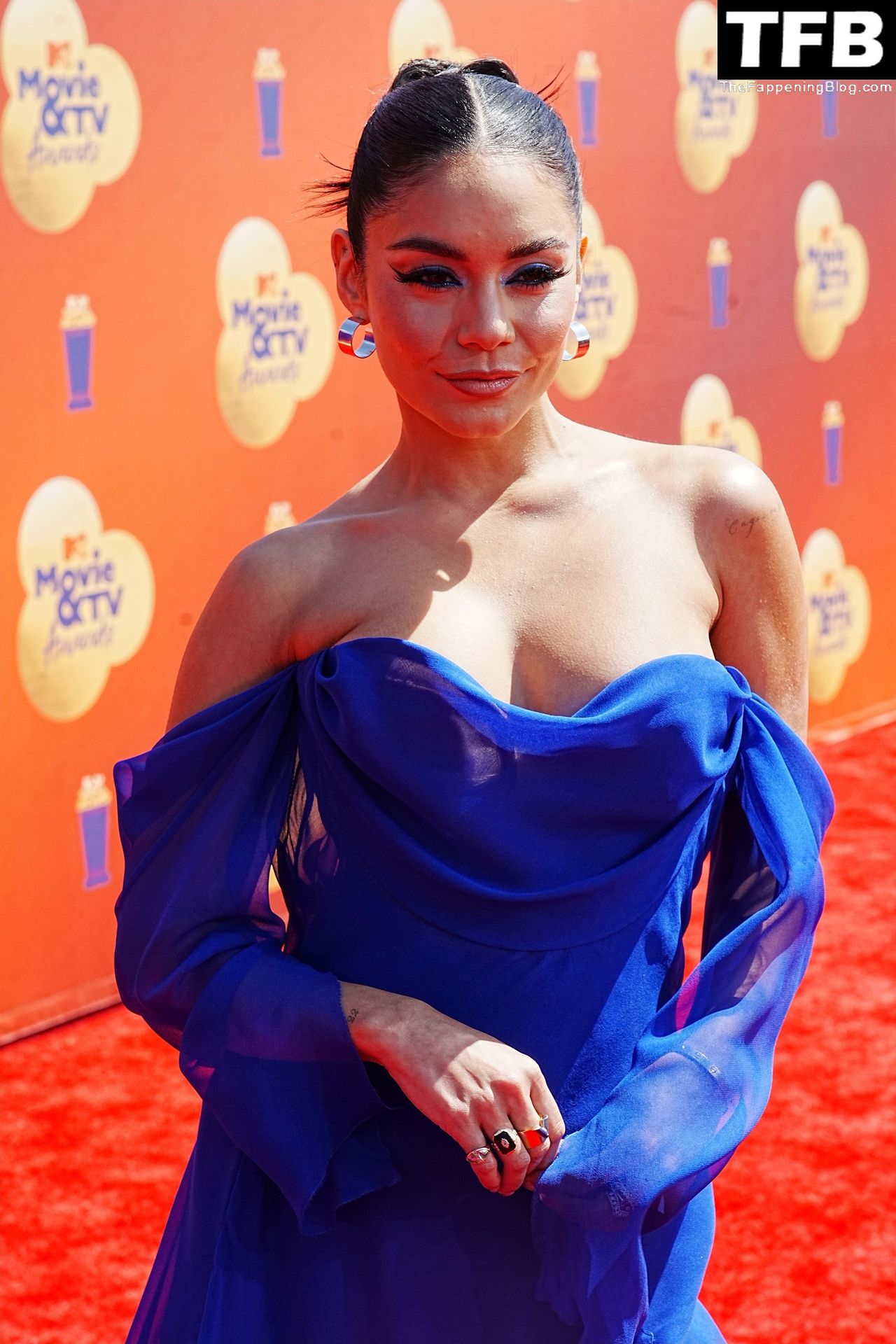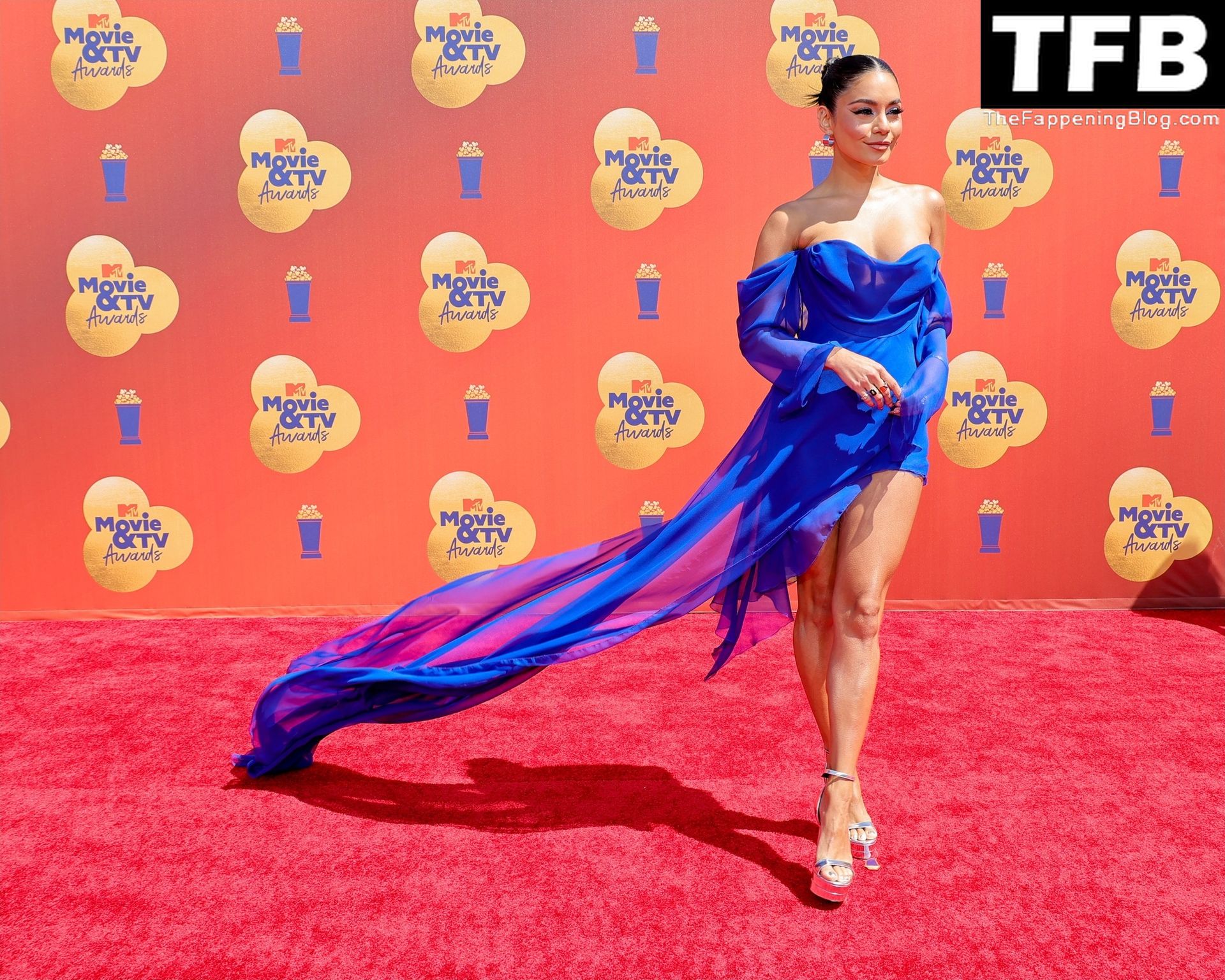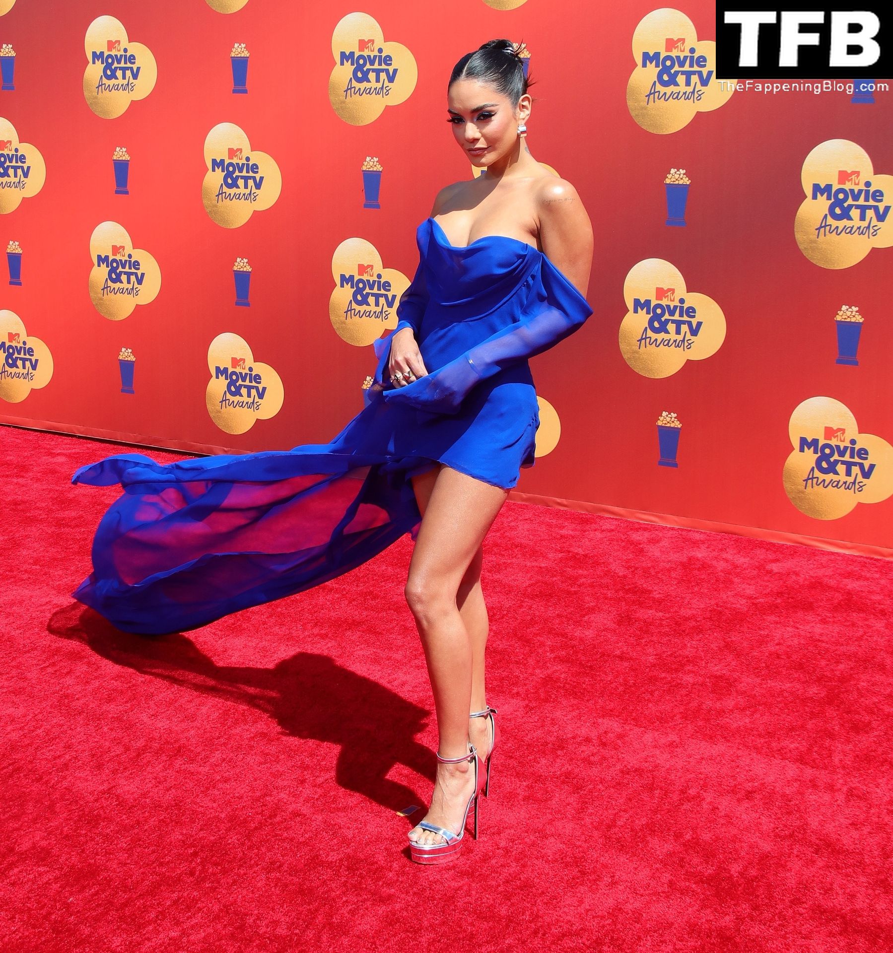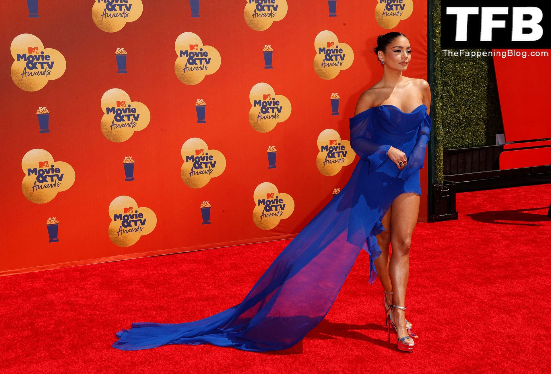 La estrella de The Fappening Vanessa Hudgens posa con un vestido azul en la alfombra roja de los MTV Movie & TV Awards en The Barker Hangar en Santa Mónica, 05/06/2022.